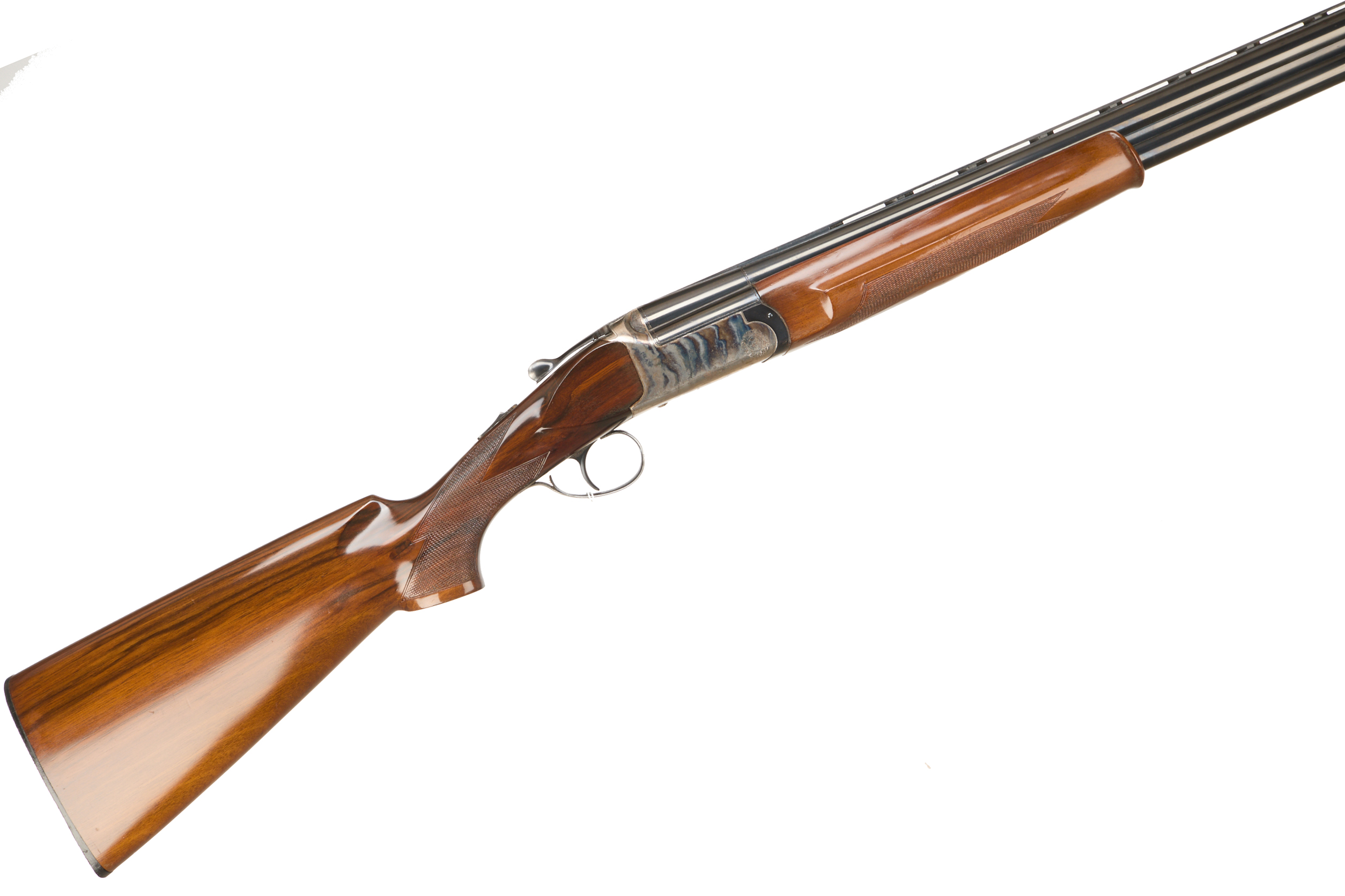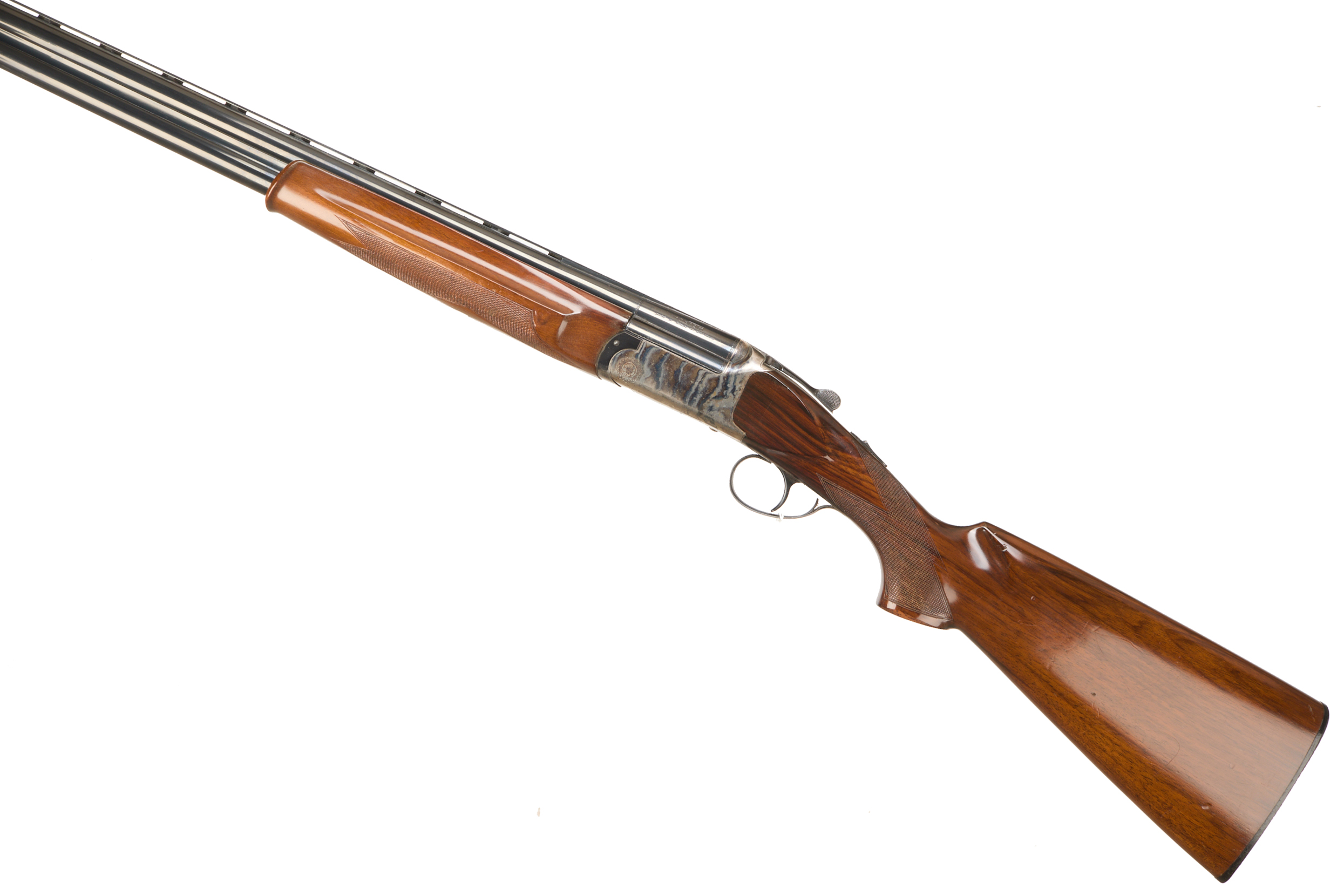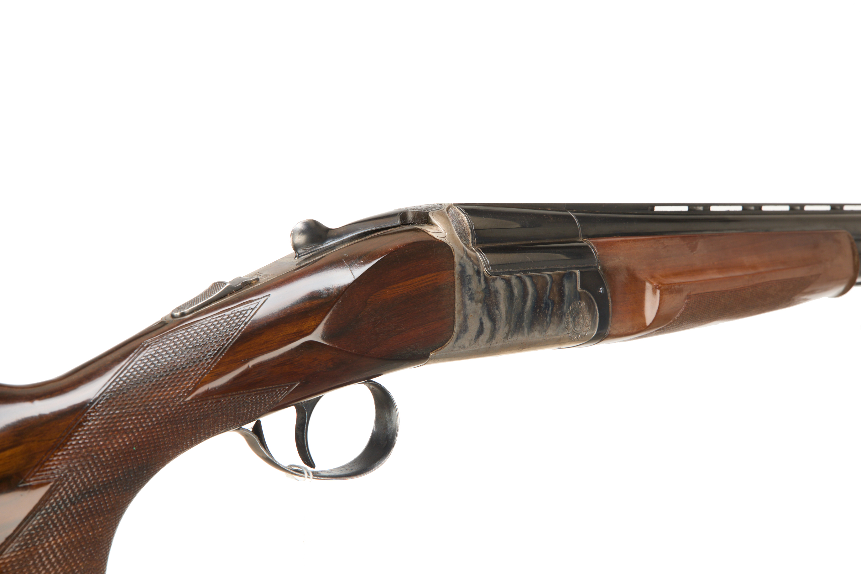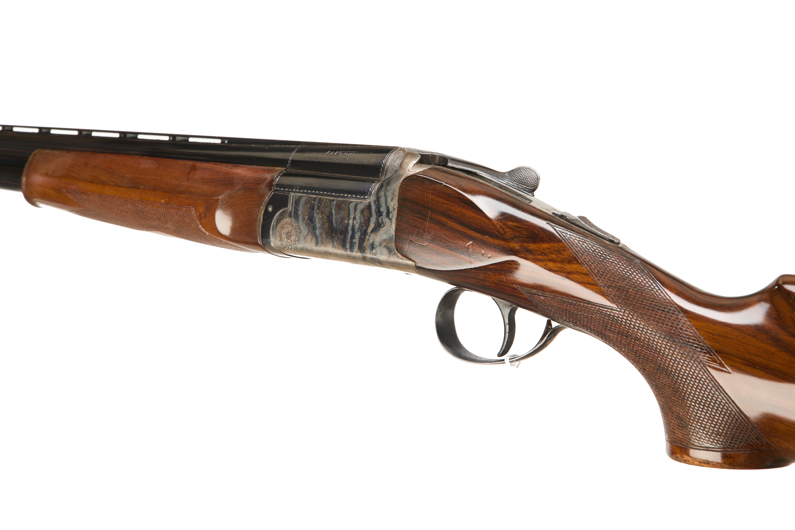 Ebonite butt pad, chequered full-pistol grip and forend, ventilated top rib. Singular floral engraving to action. Integrated barrel selector (selective single trigger) and safety.