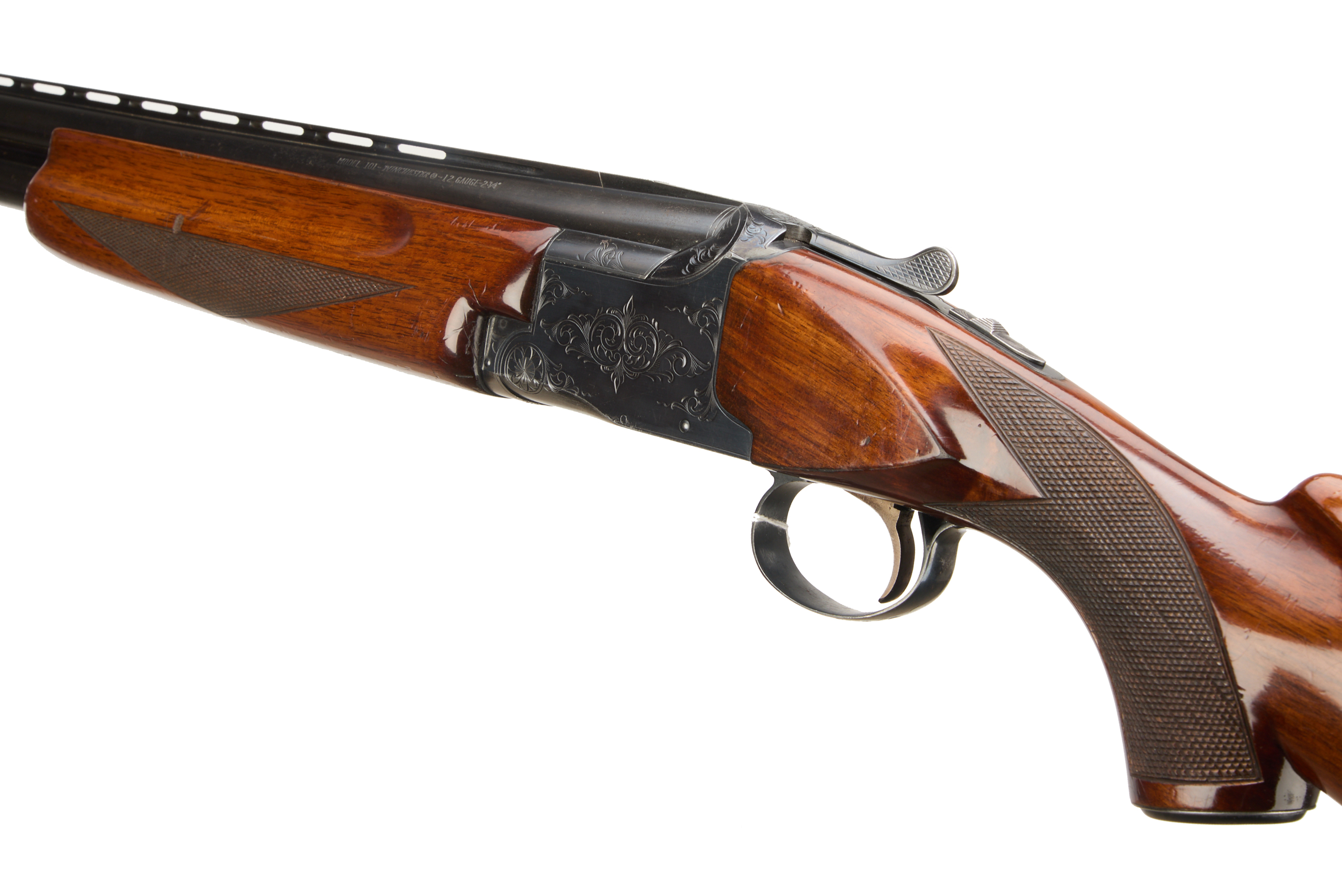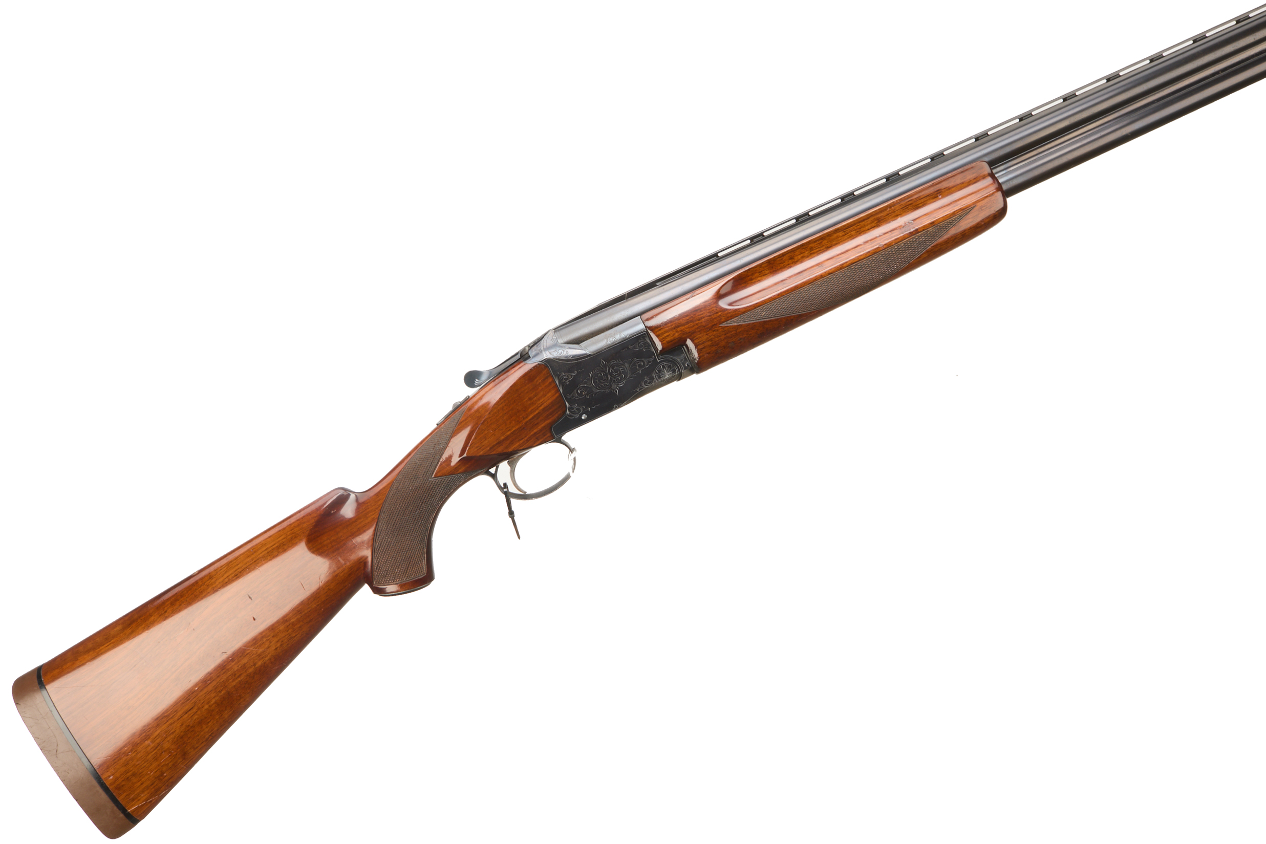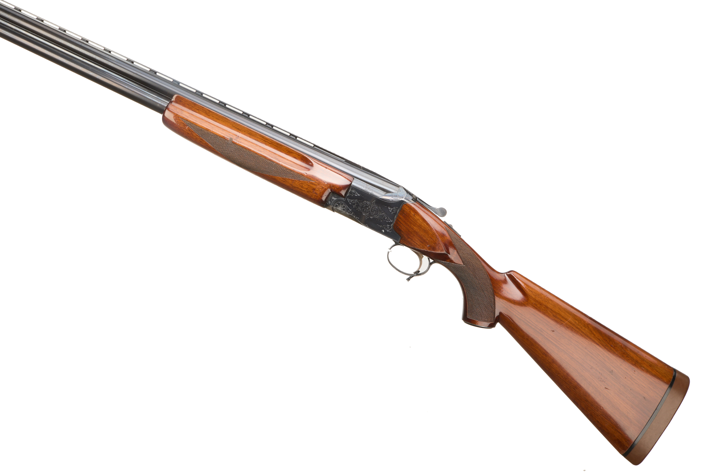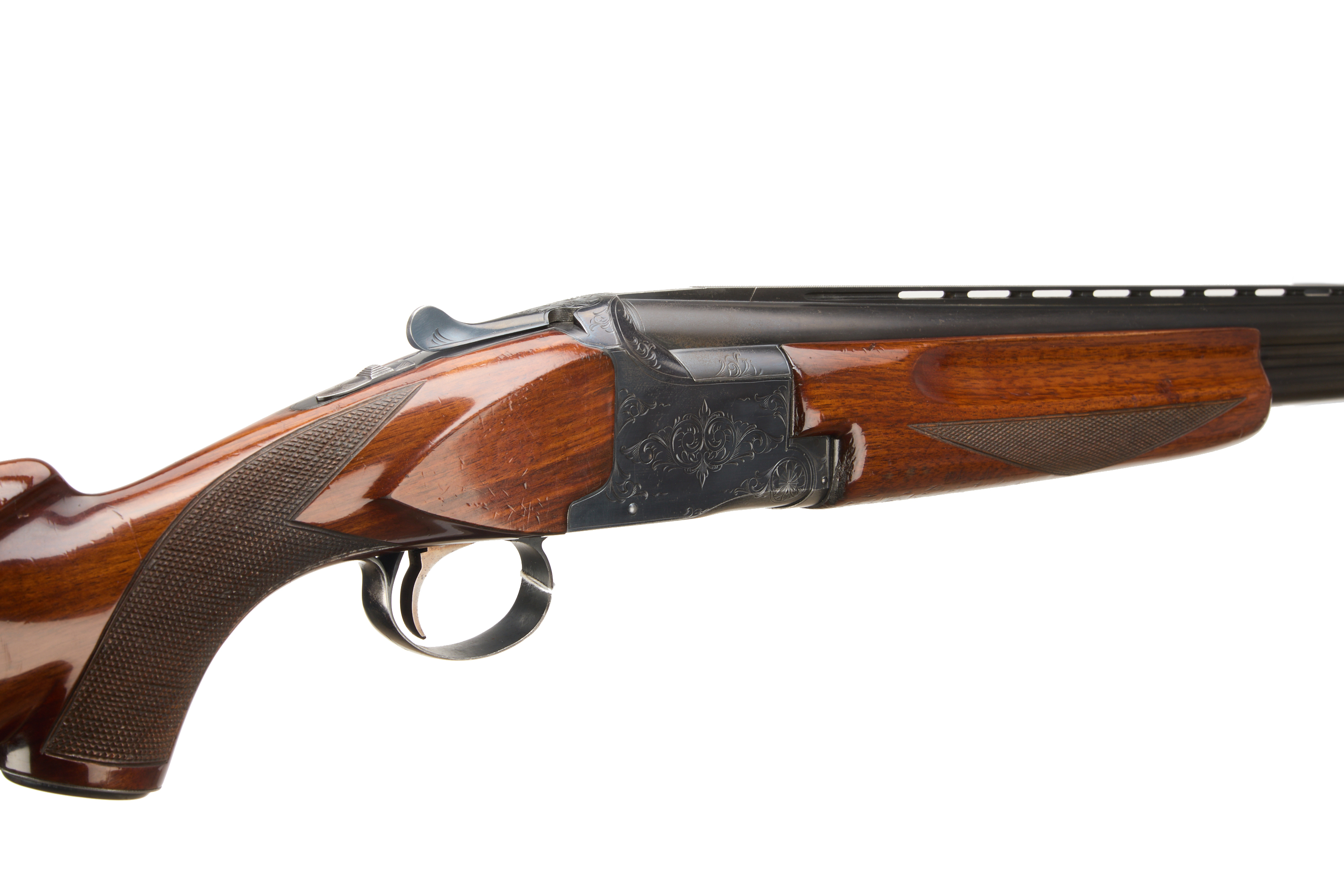 Cushioned rubber butt pad, chequered full-pistol grip and forend, ventilated top rib. Swirling acanthus scrolls and motifs to action. Gold wash trigger, integrated barrel selector (selective single trigger) and safety.