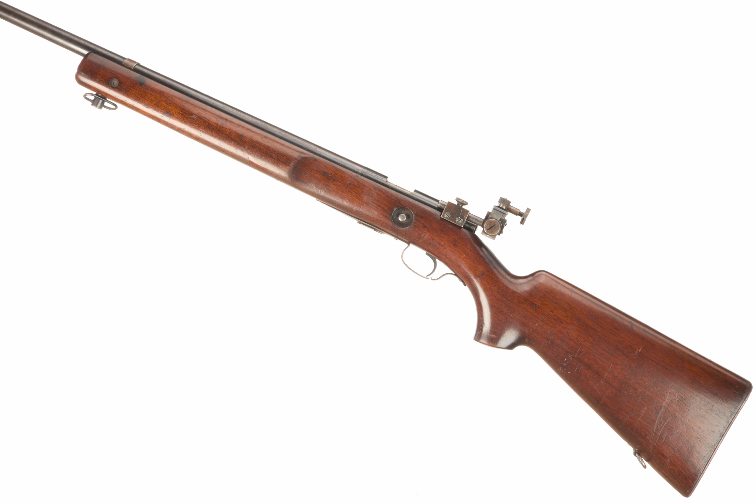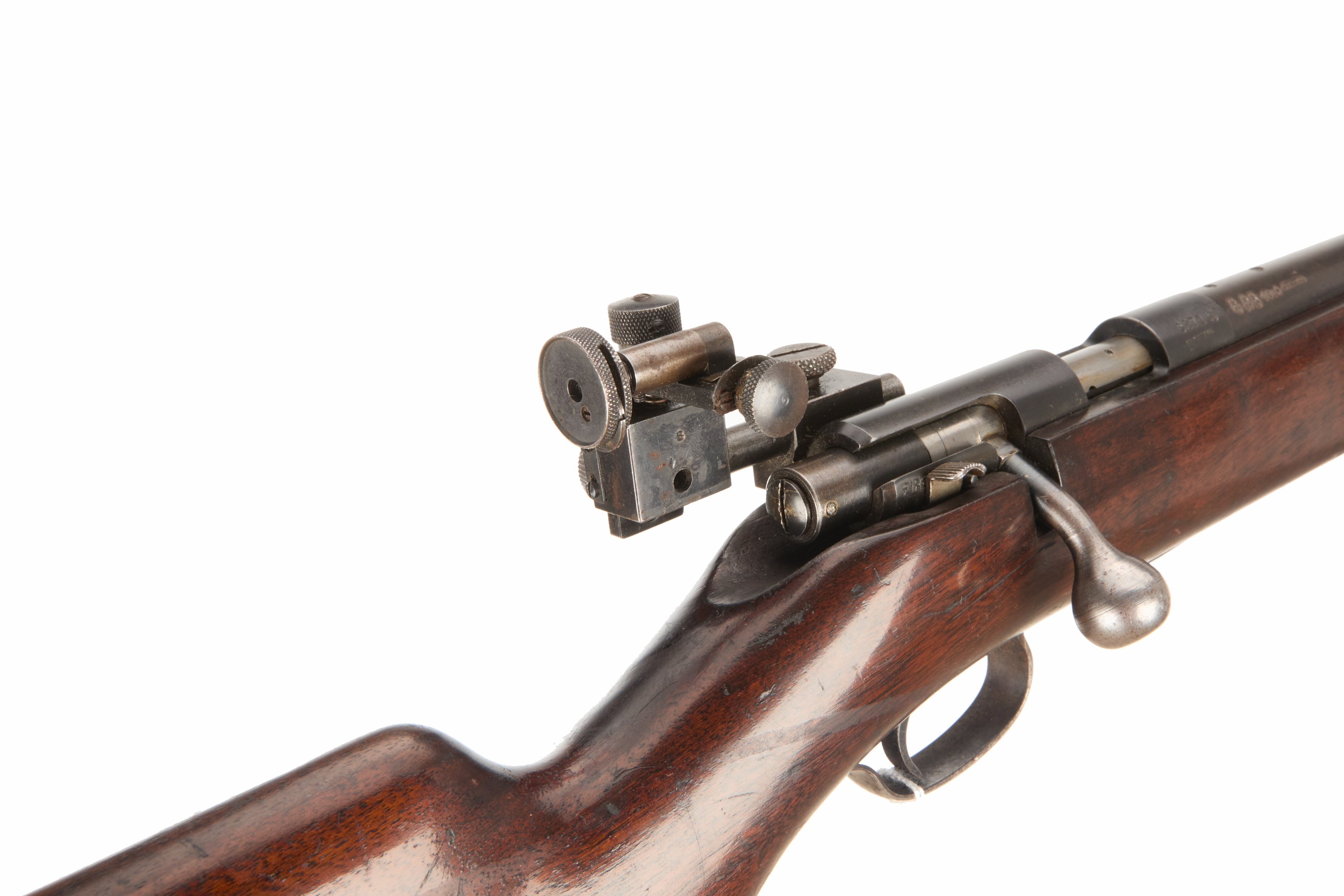 Chequered steel buttplate, smooth walnut stock with front and rear sling loops. Hooded notch front sight and side mounted rear sight. Manual safety. CW detachable 5-round box magazine.
