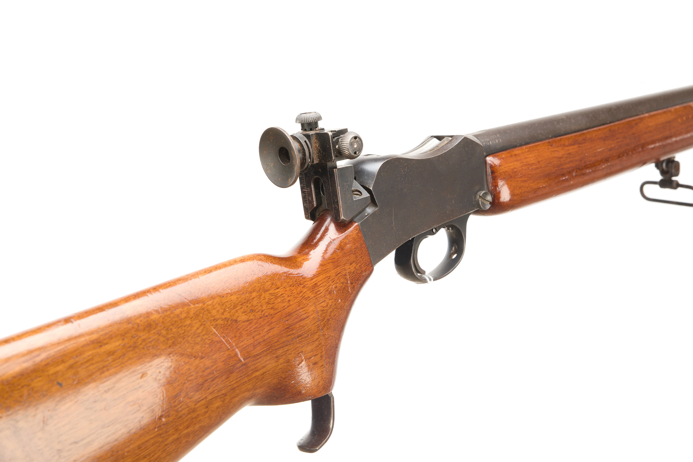 Ebonite butt plate, raised cheek piece, semi-pistol grip, sling hook, tunnel foresight, dioptre rearsight, side safety.