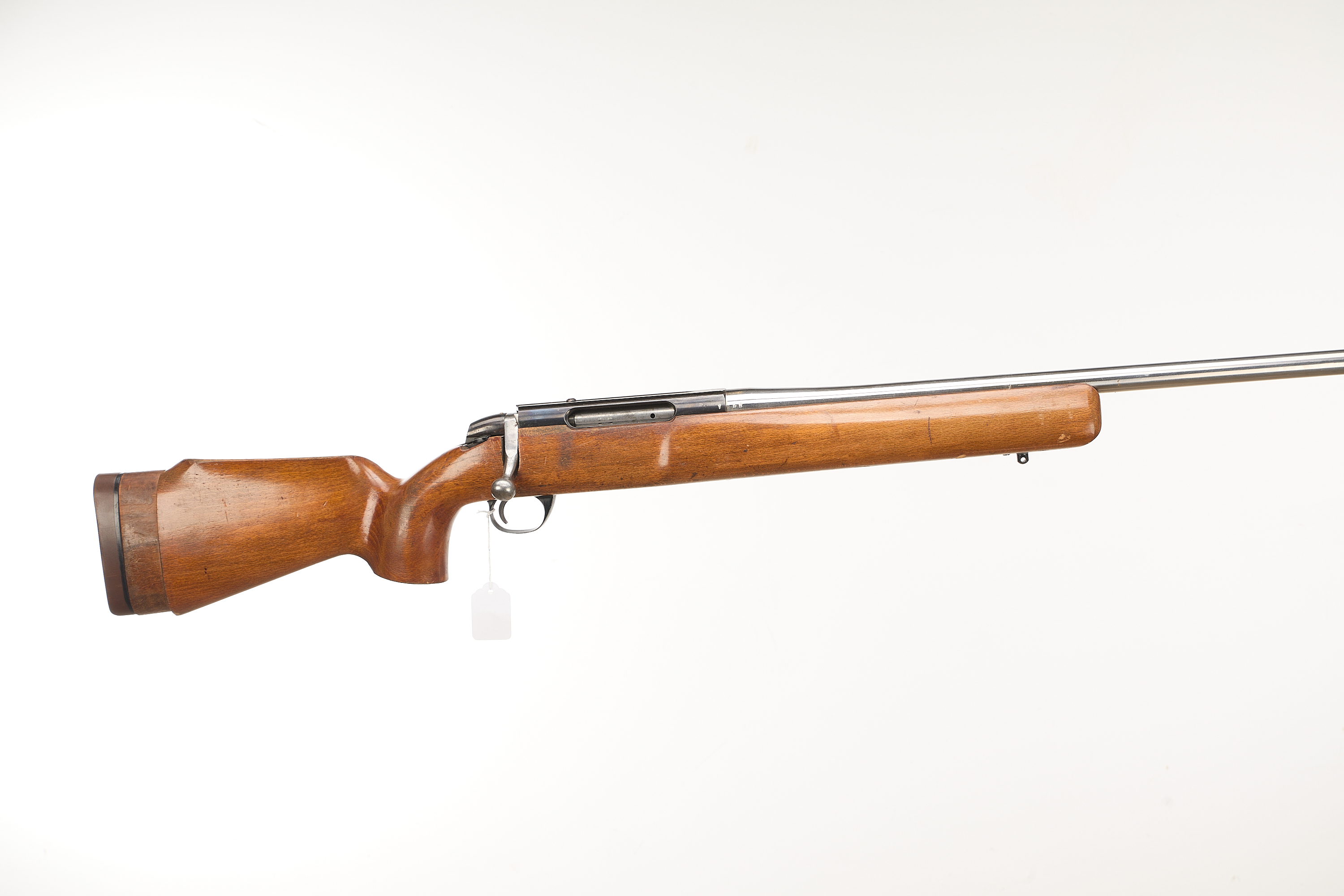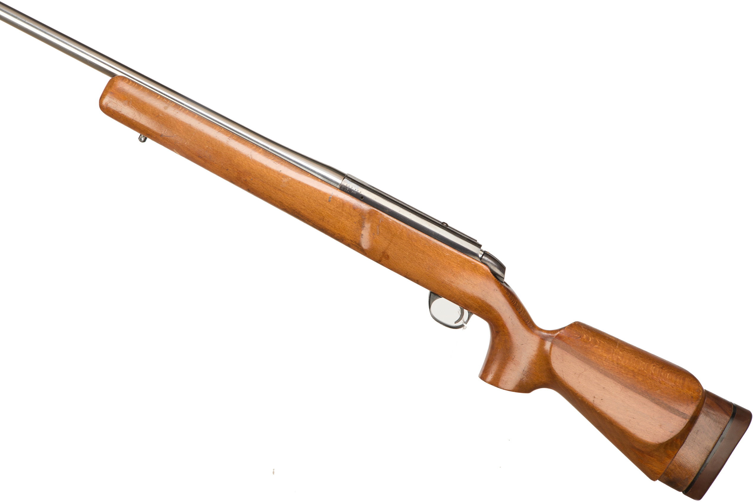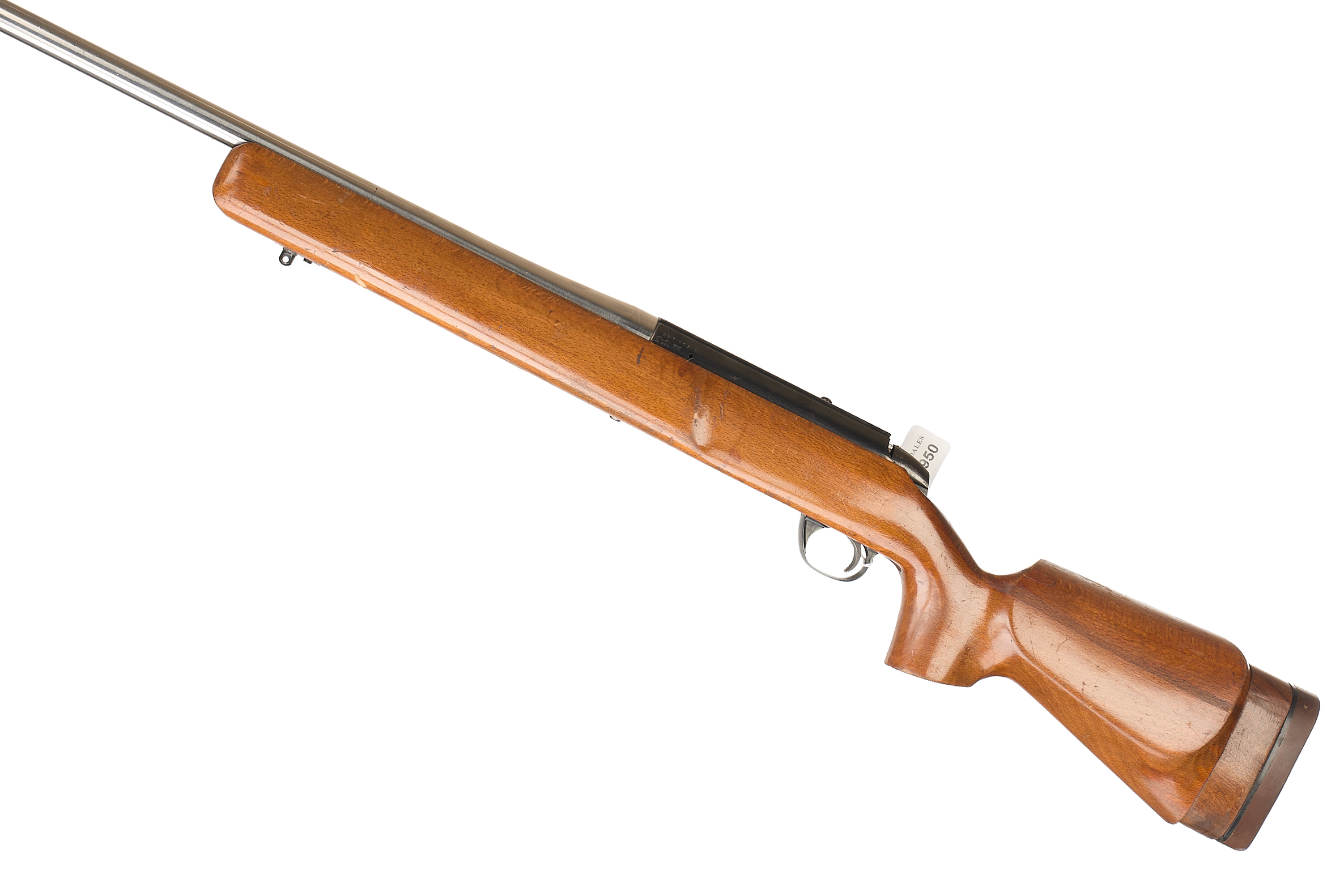 Plain target stock with raised cheek piece with full pistol grip, aluminium rail and hand stop, rear and fore scope mount.