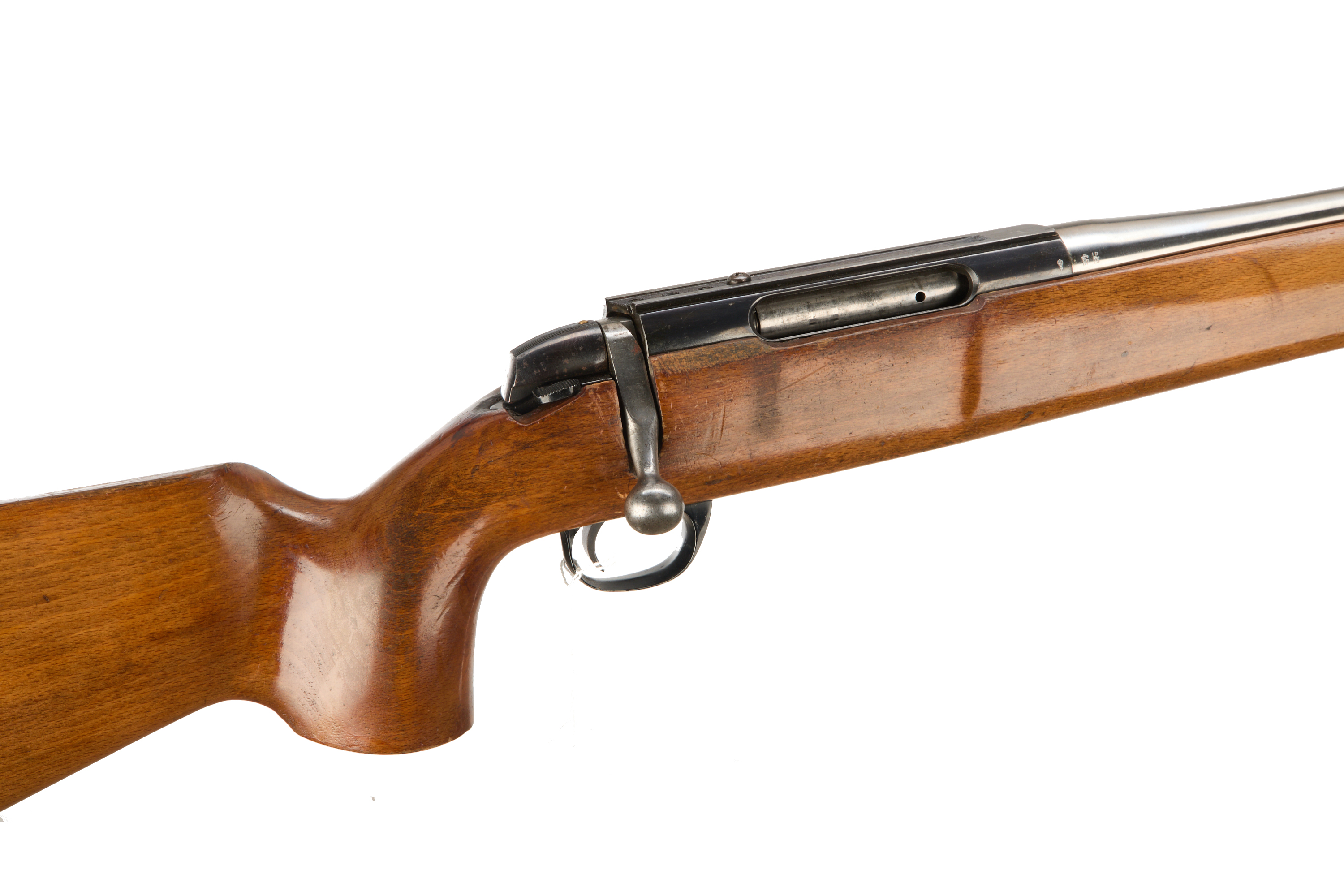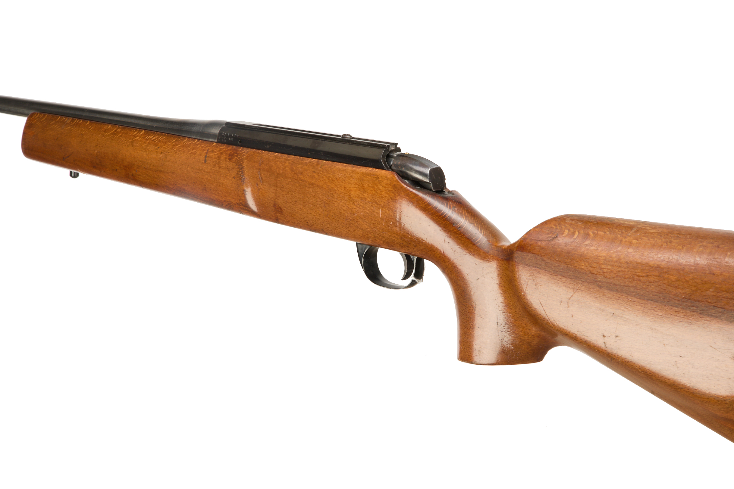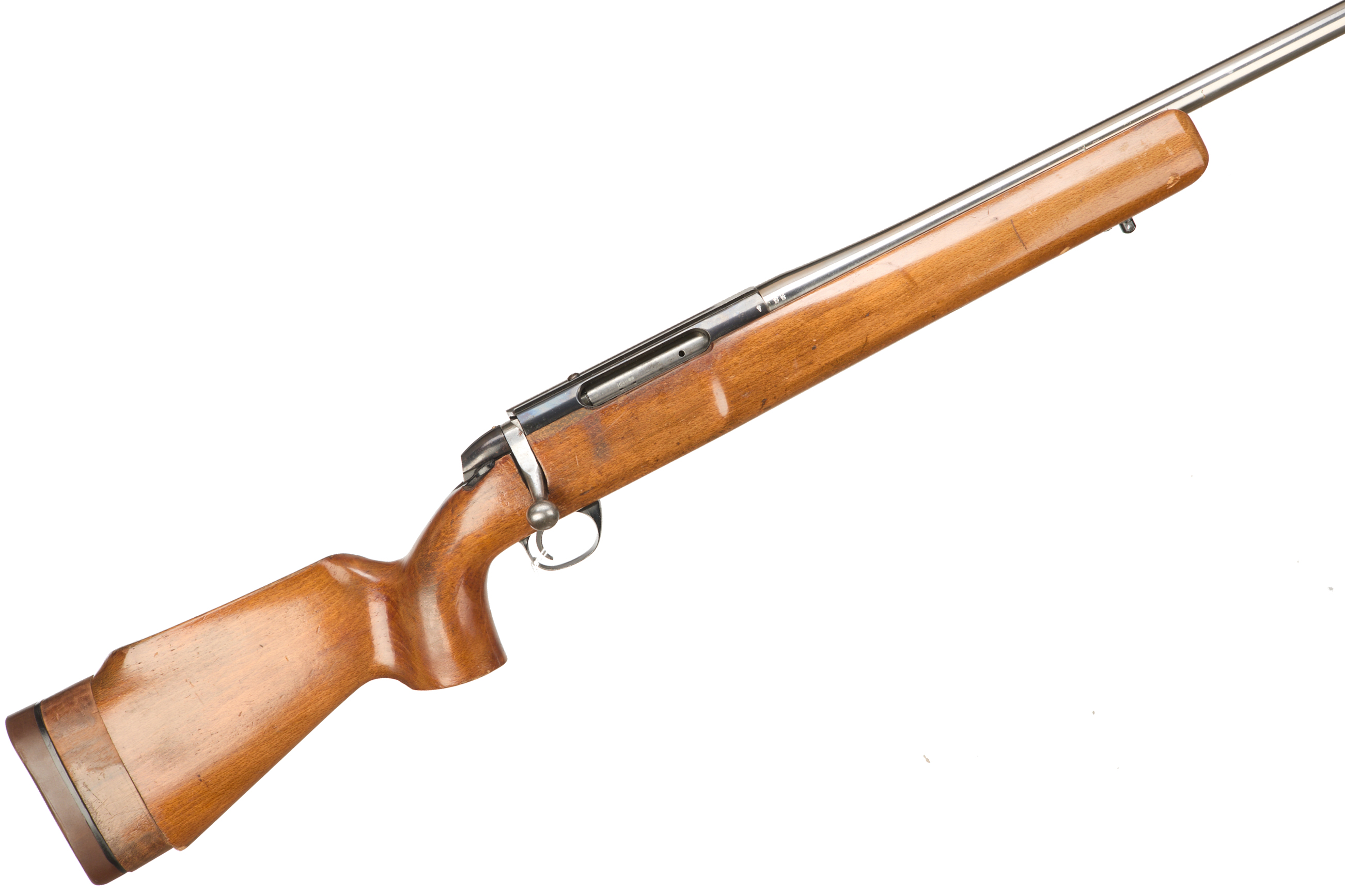 Plain target stock with raised cheek piece with full pistol grip, aluminium rail and hand stop, rear and fore scope mount.