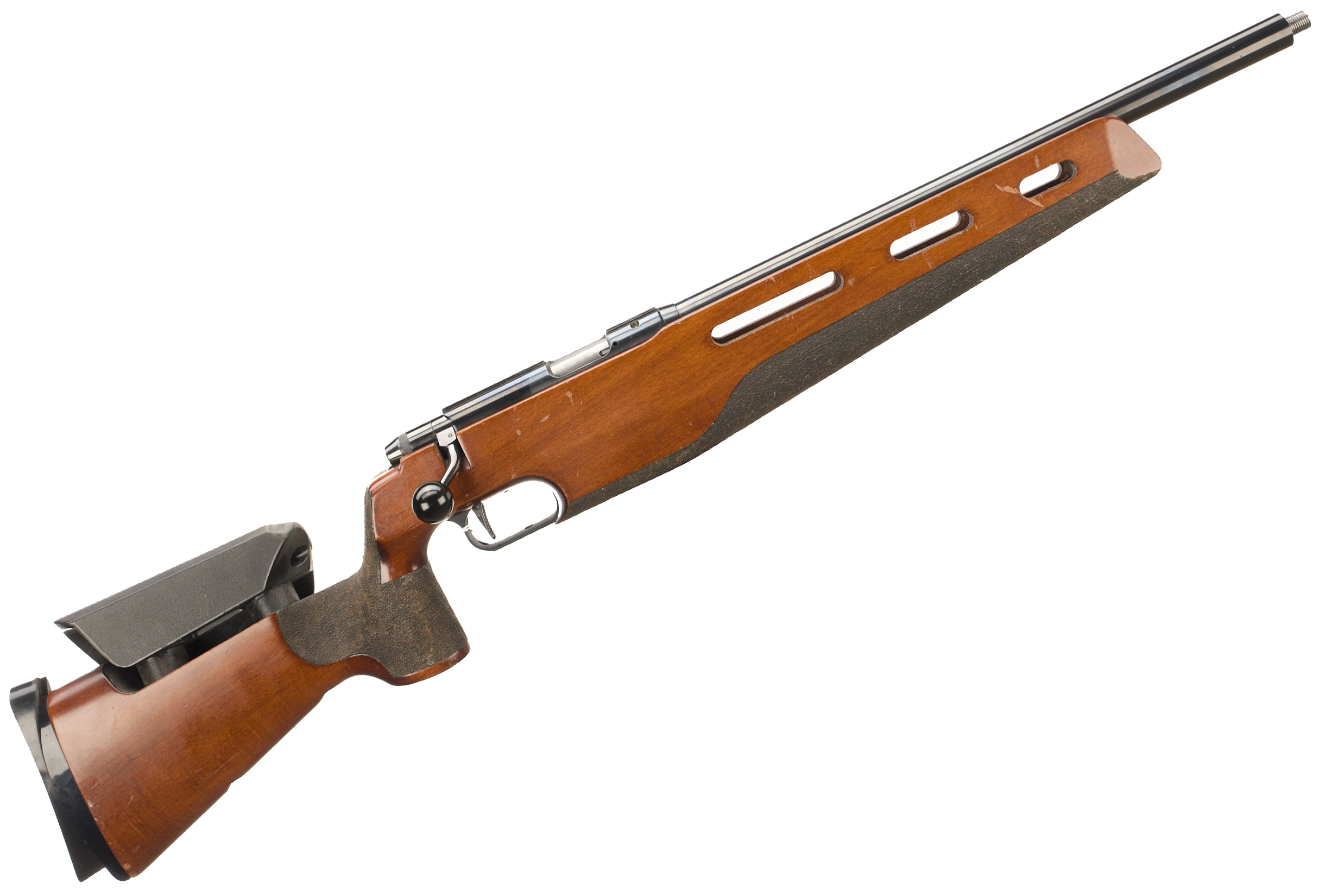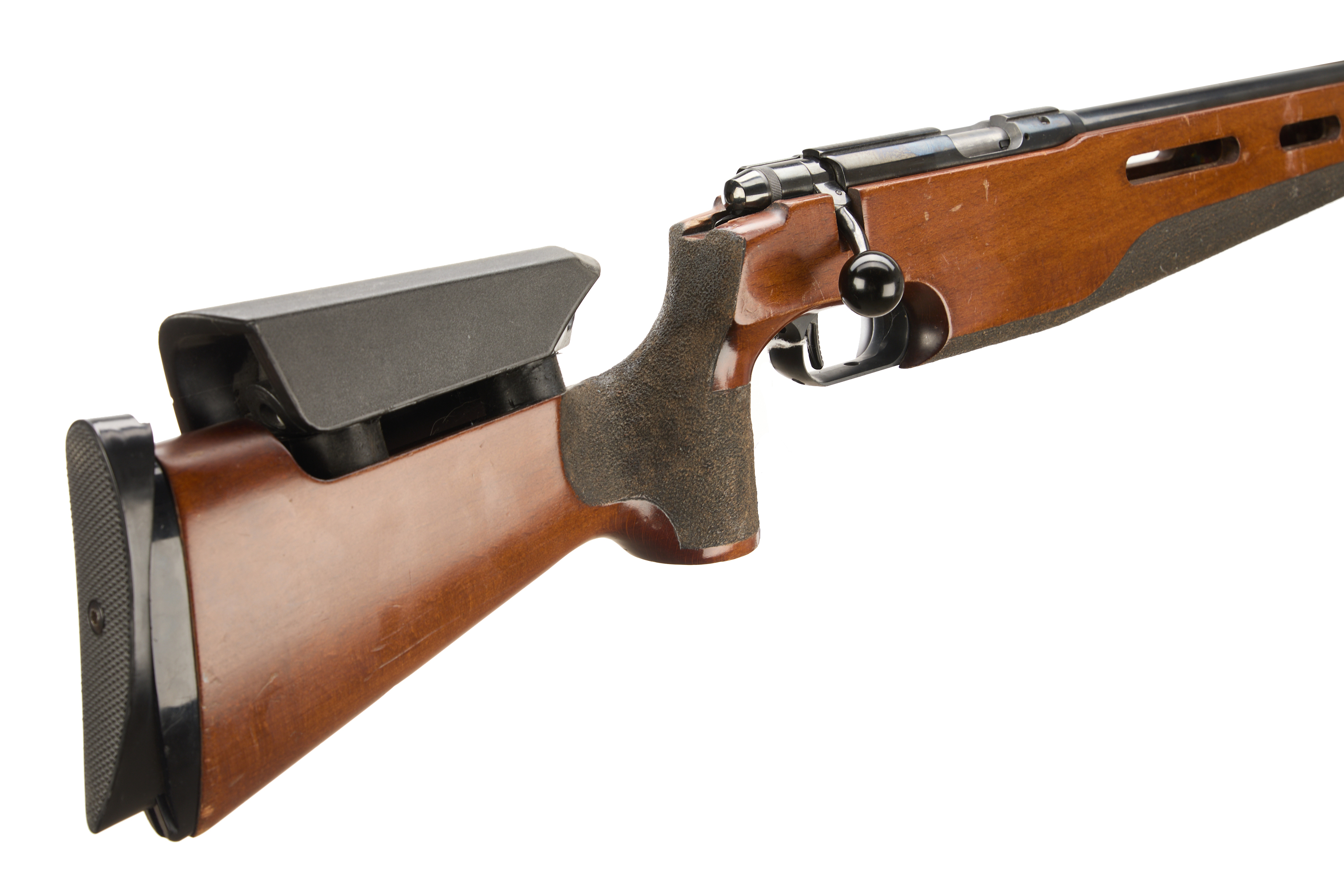 Adjustable butt and cheekpiece. Fully figured stock. Screwcut. Accessory rail to underside. Side safety, large cocking knob.