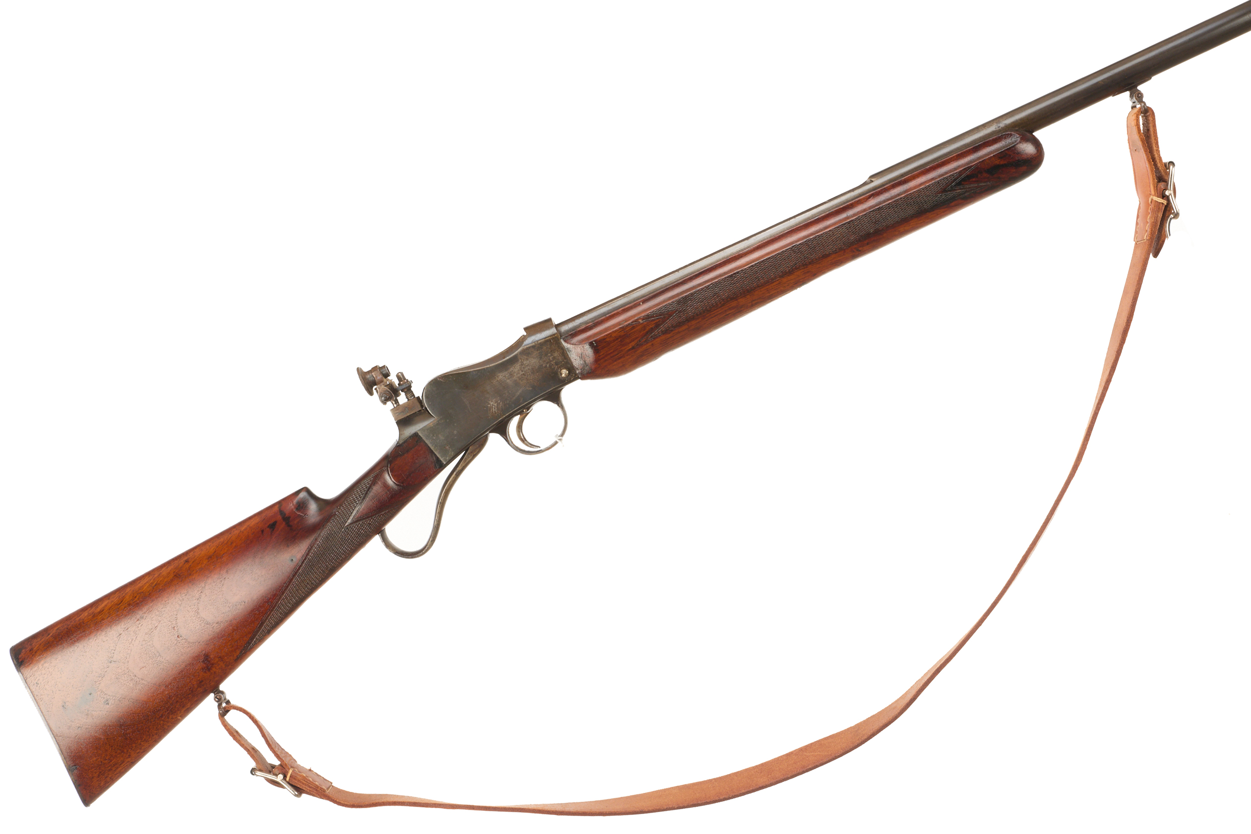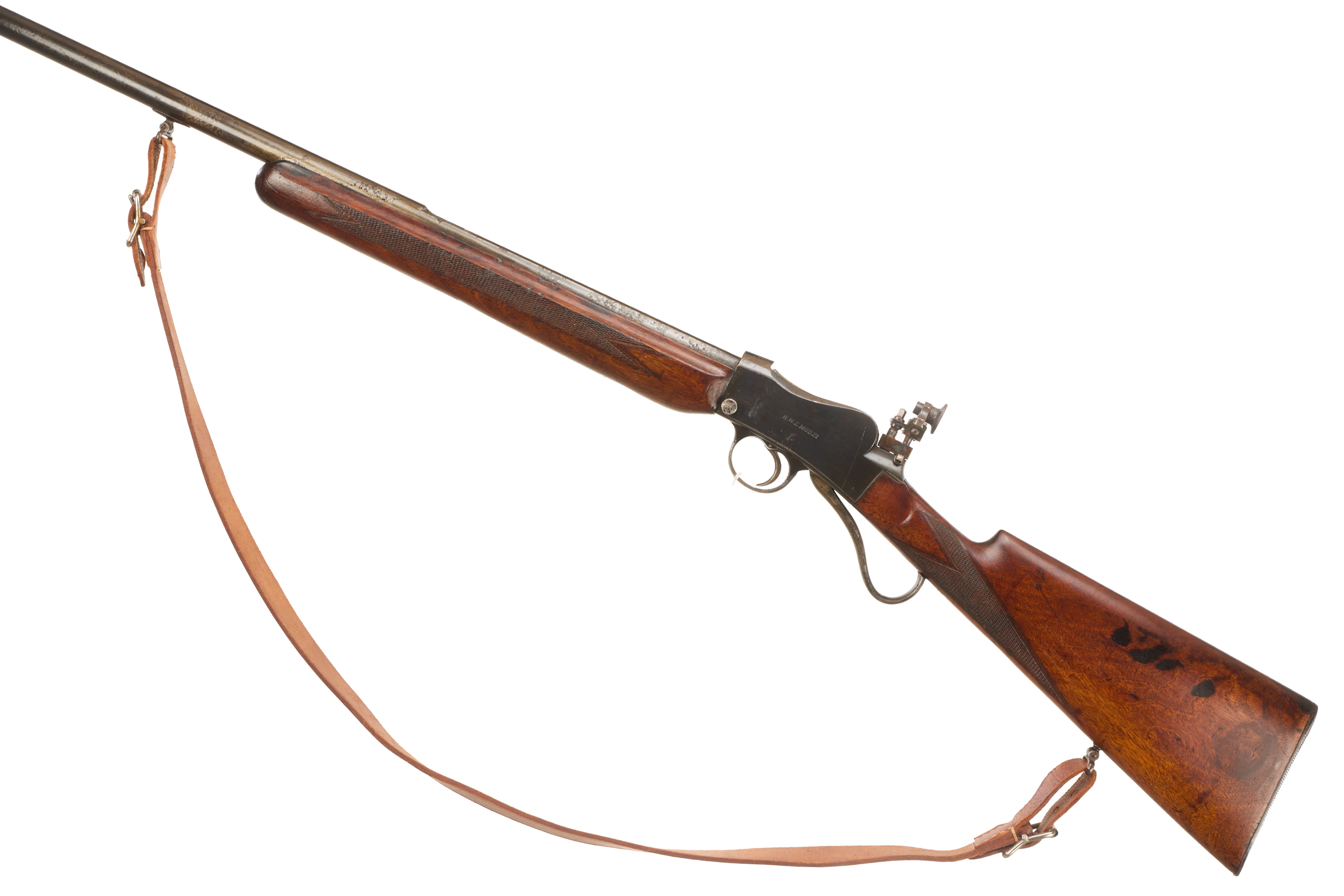 Steel buttplate, walnut stock with chequered grip and forend. Front and rear sling mounts and leather sling. Protected post front sight and diopter rear sight. Barrel with integral dovetail scope rail. CW rear sight removal key.