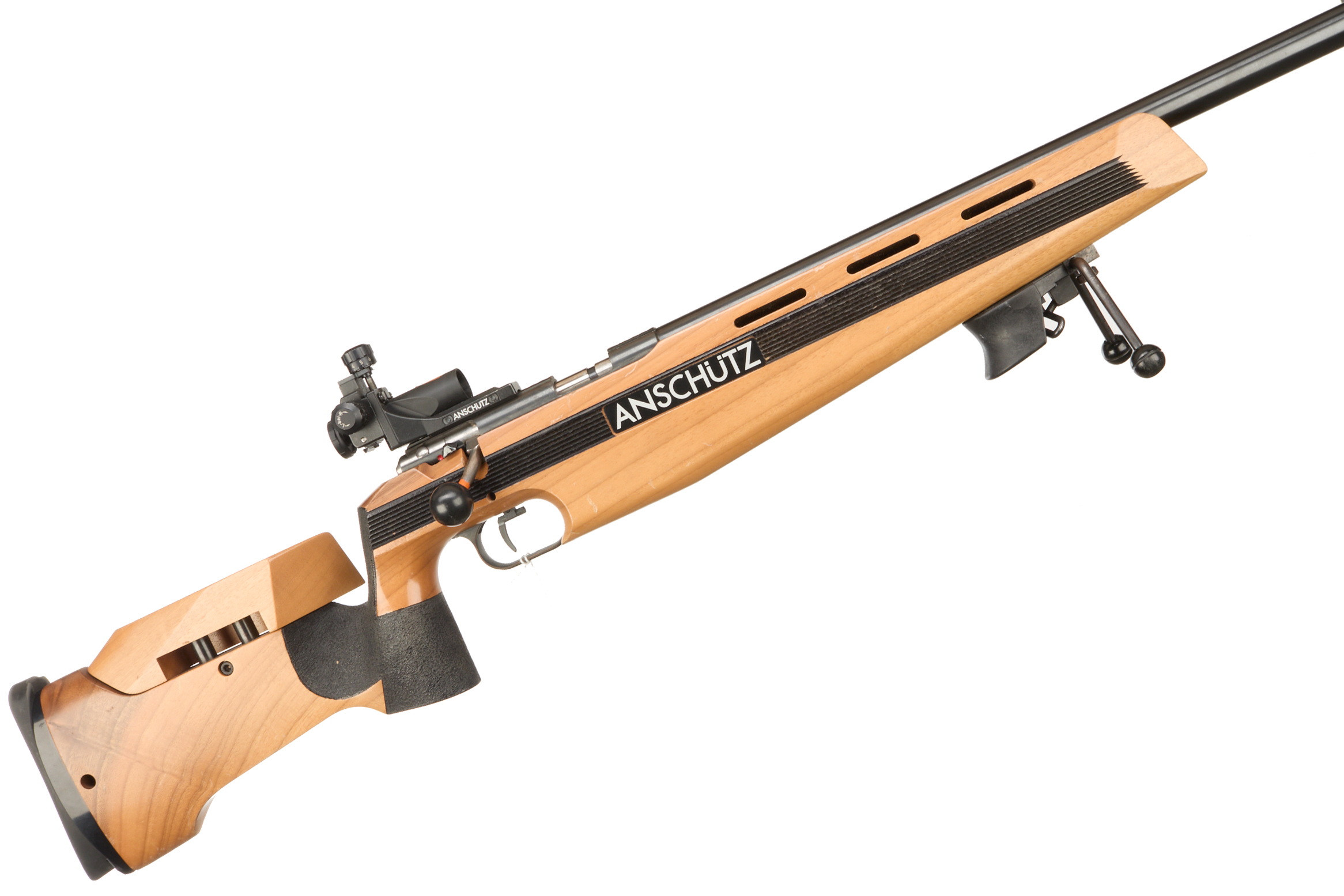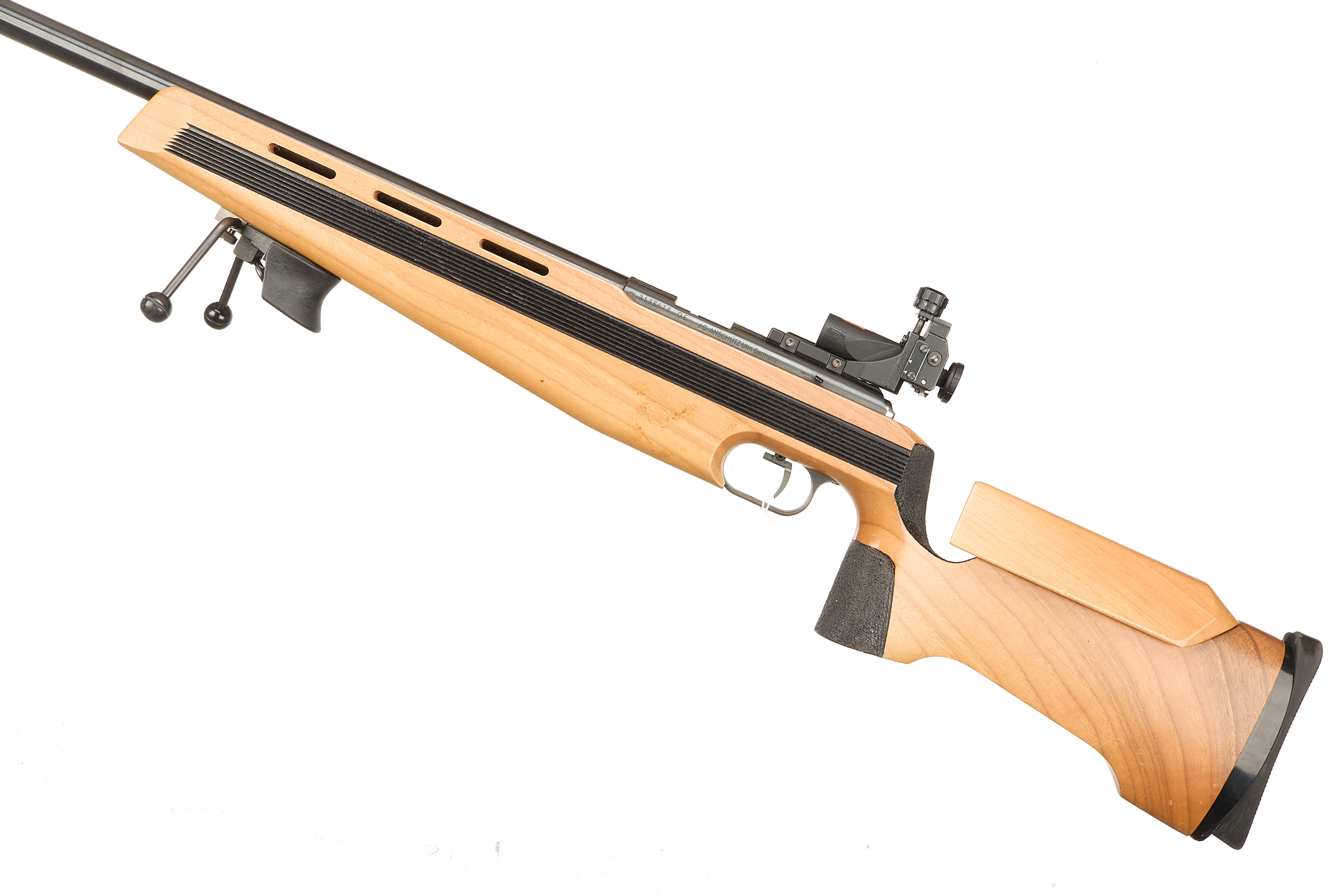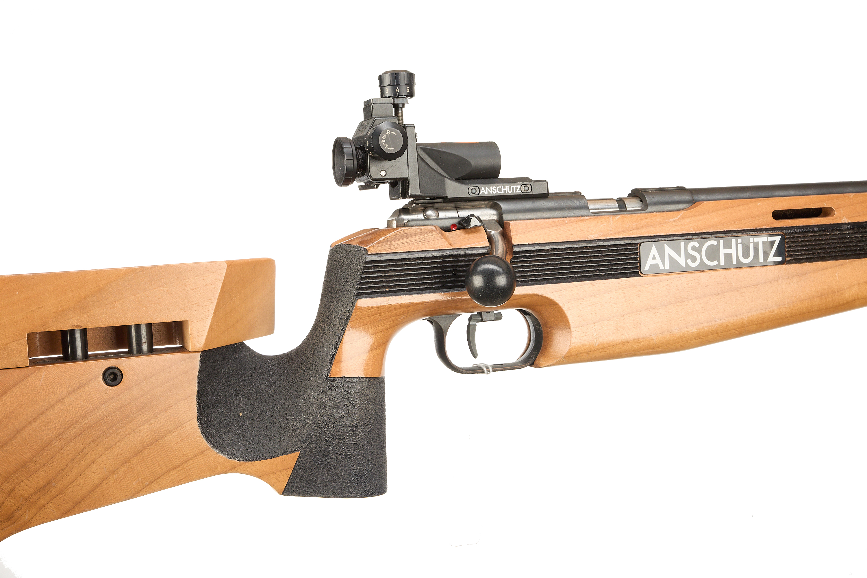 Adjustable butt pad and cheek piece, fully-figured target stock with full pistol grip, aluminium rail and hand stop, sling hook, tunnel foresight, dioptre rearsight, side safety.