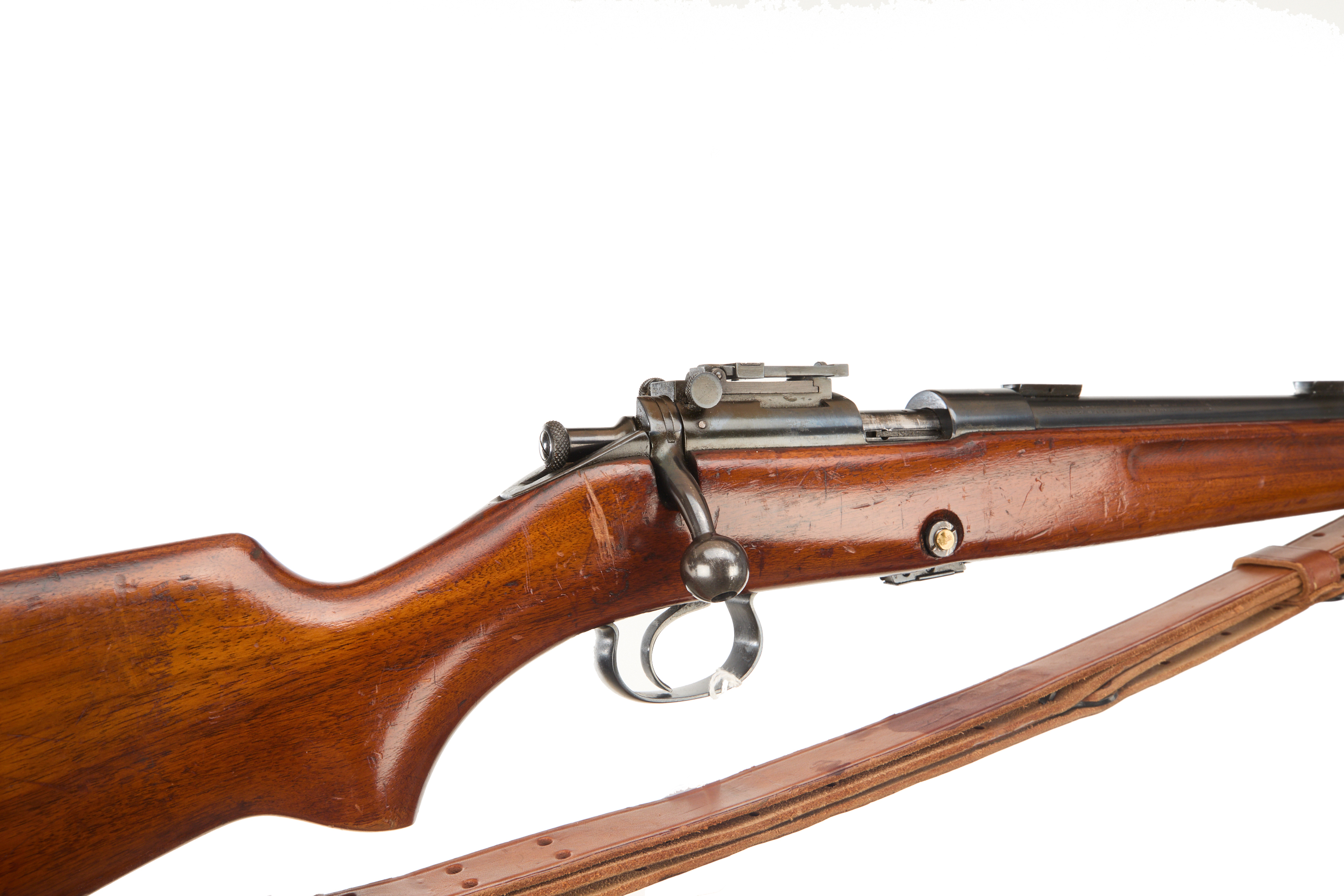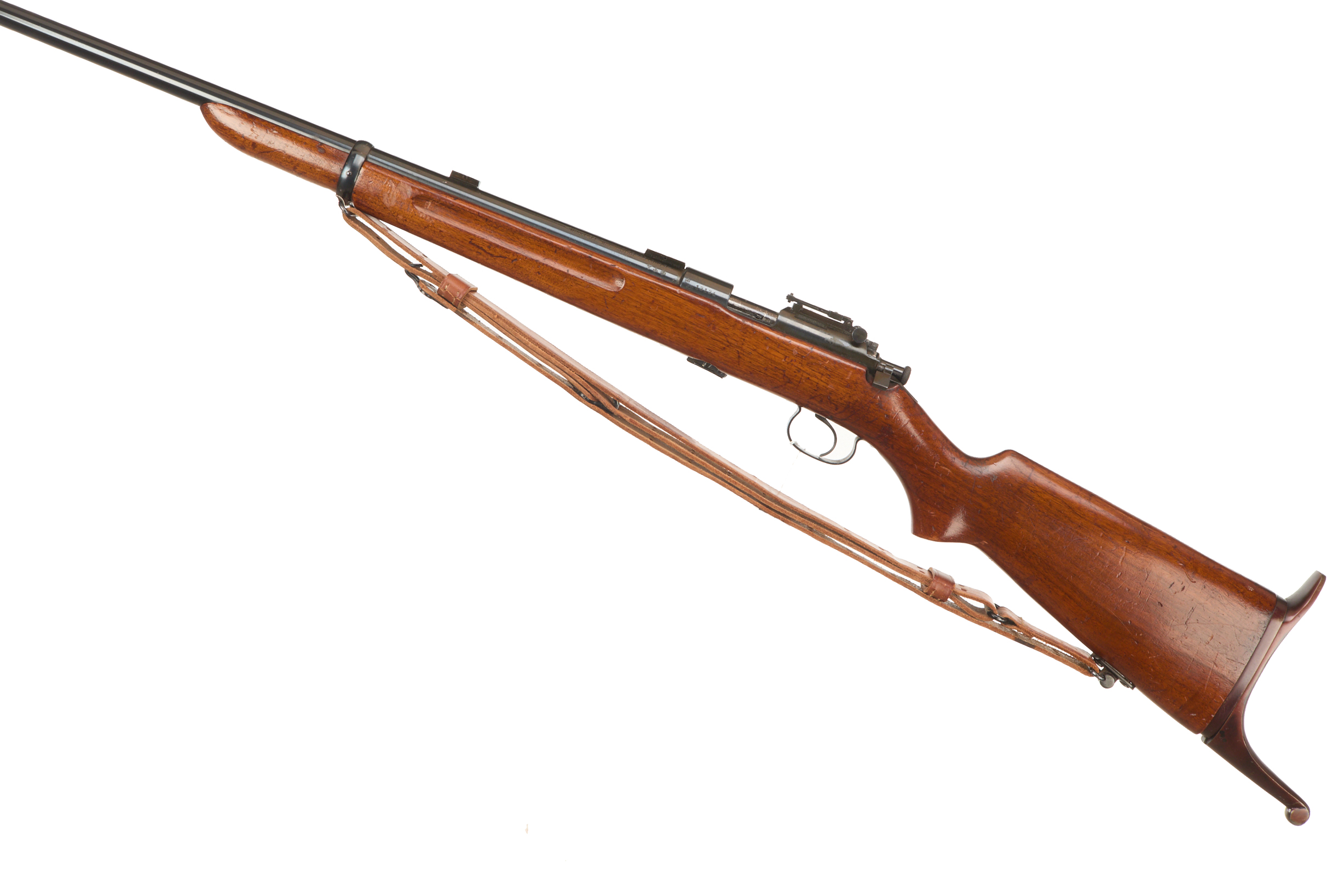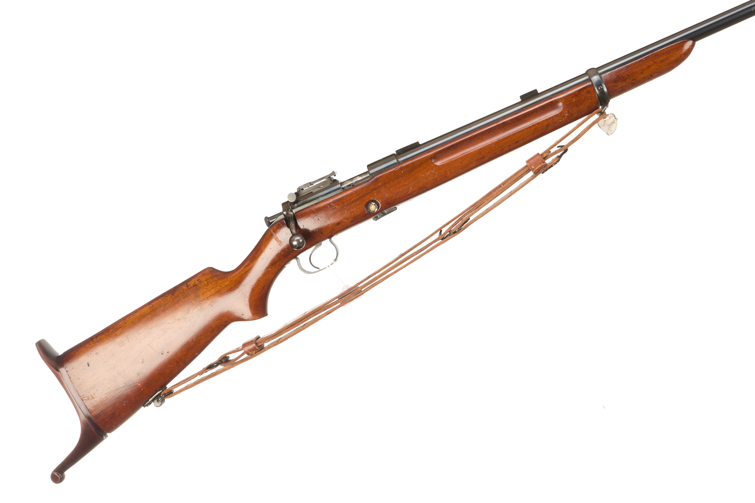 Steel buttplate with underarm hook, semi-pistol grip, rounded forend. Sling attachments on front barrel band and stock. CW leather sling. Manual safety. Diopter front sight, folding ladder rear sight. Barrel tapped and fitted with dovetail scope mounts. CW detachable 5 round box magazine.