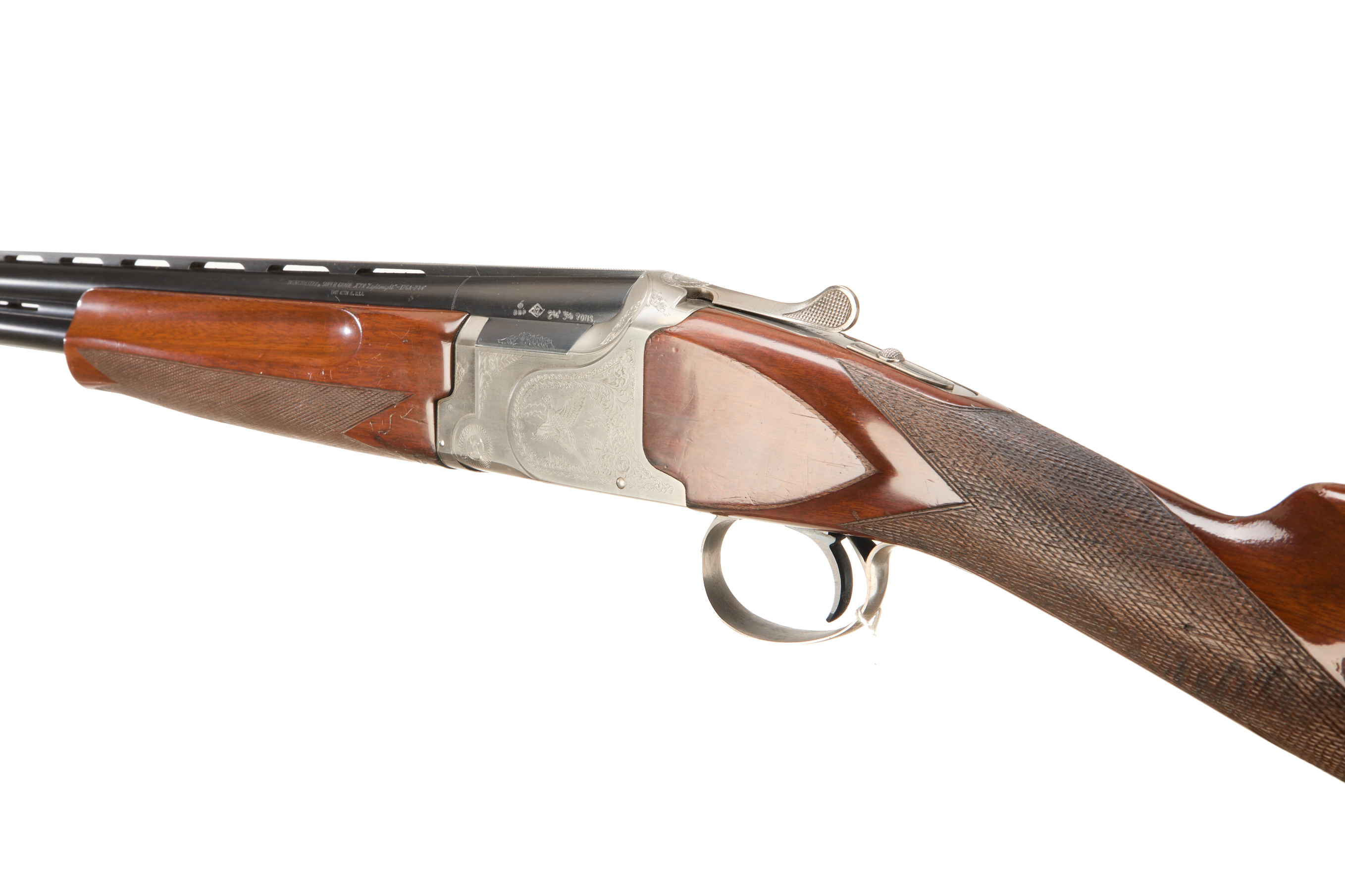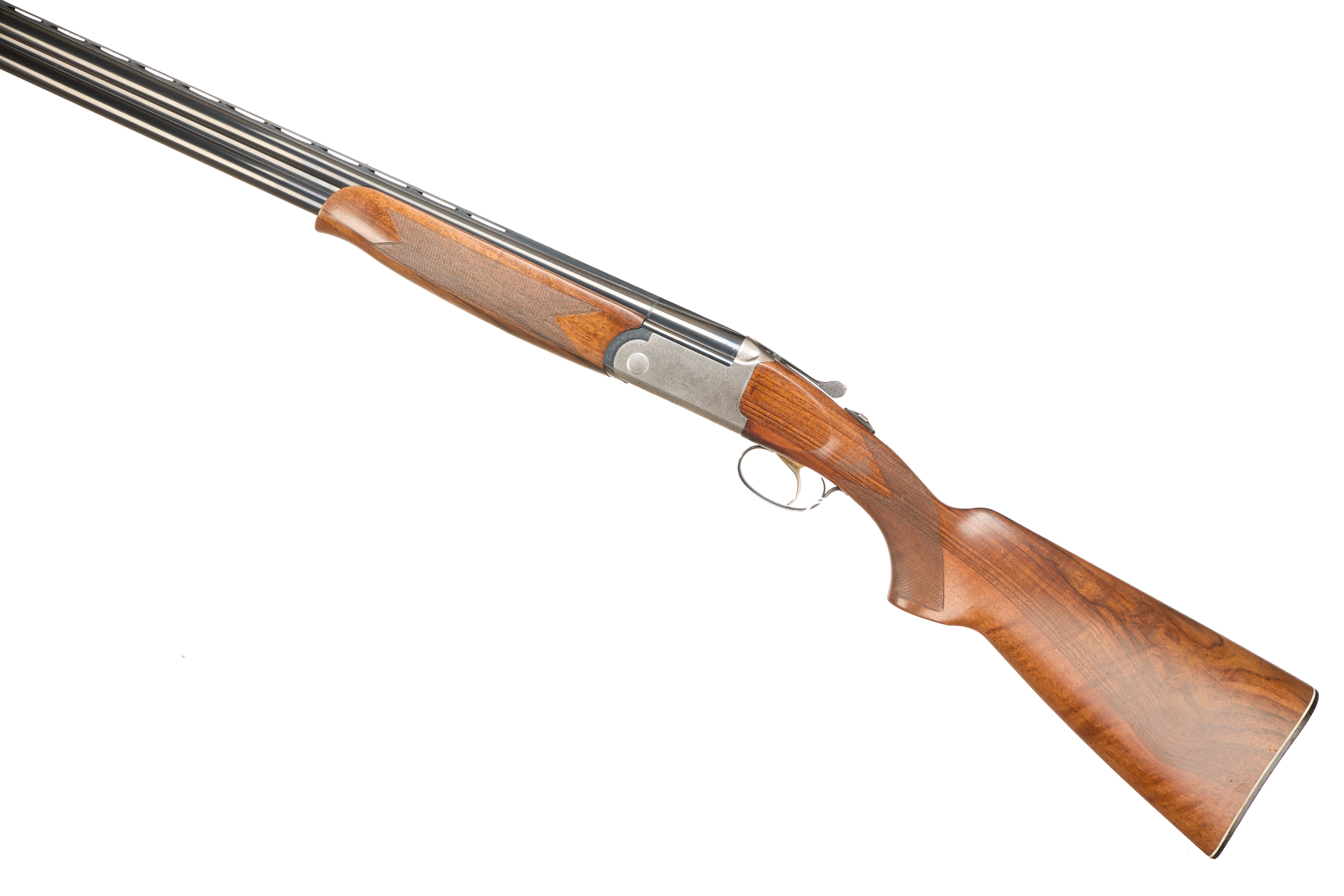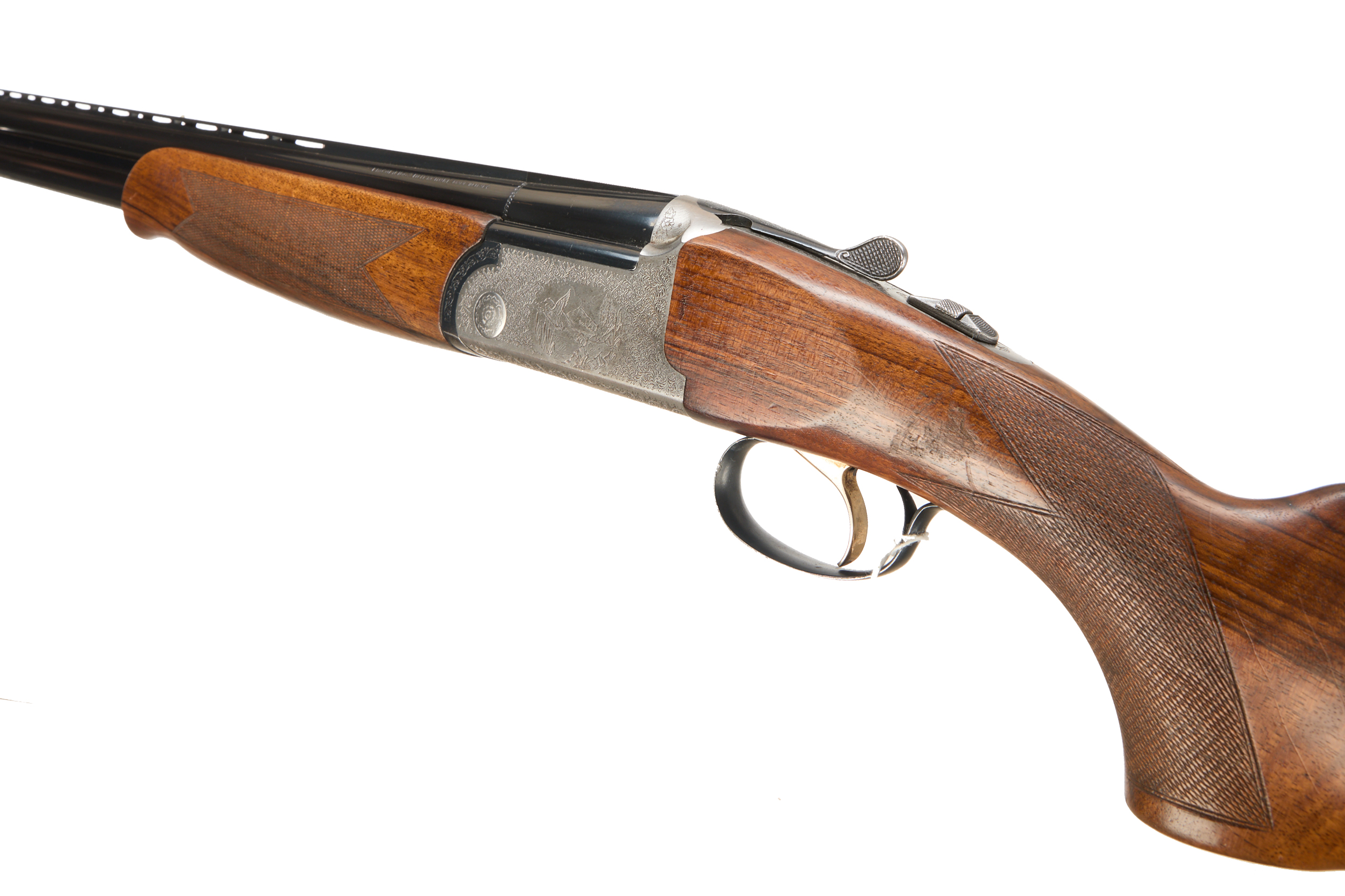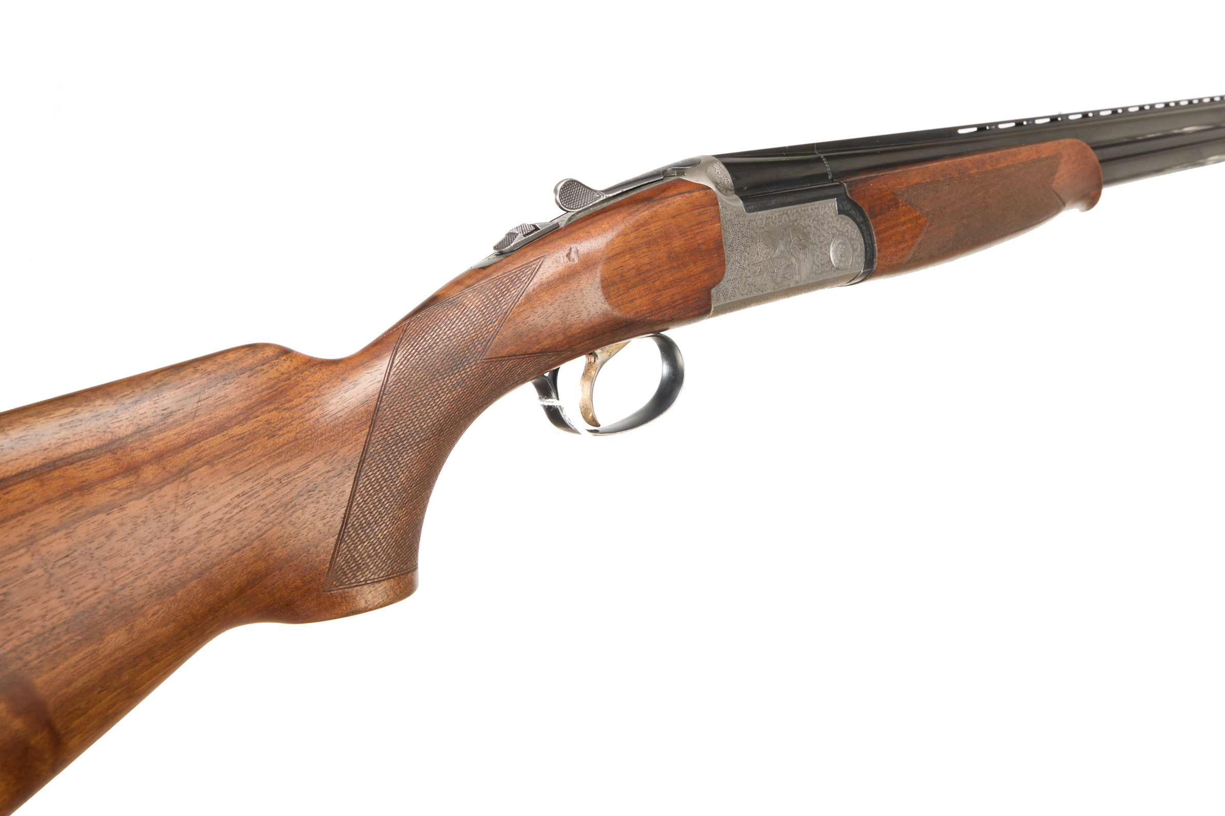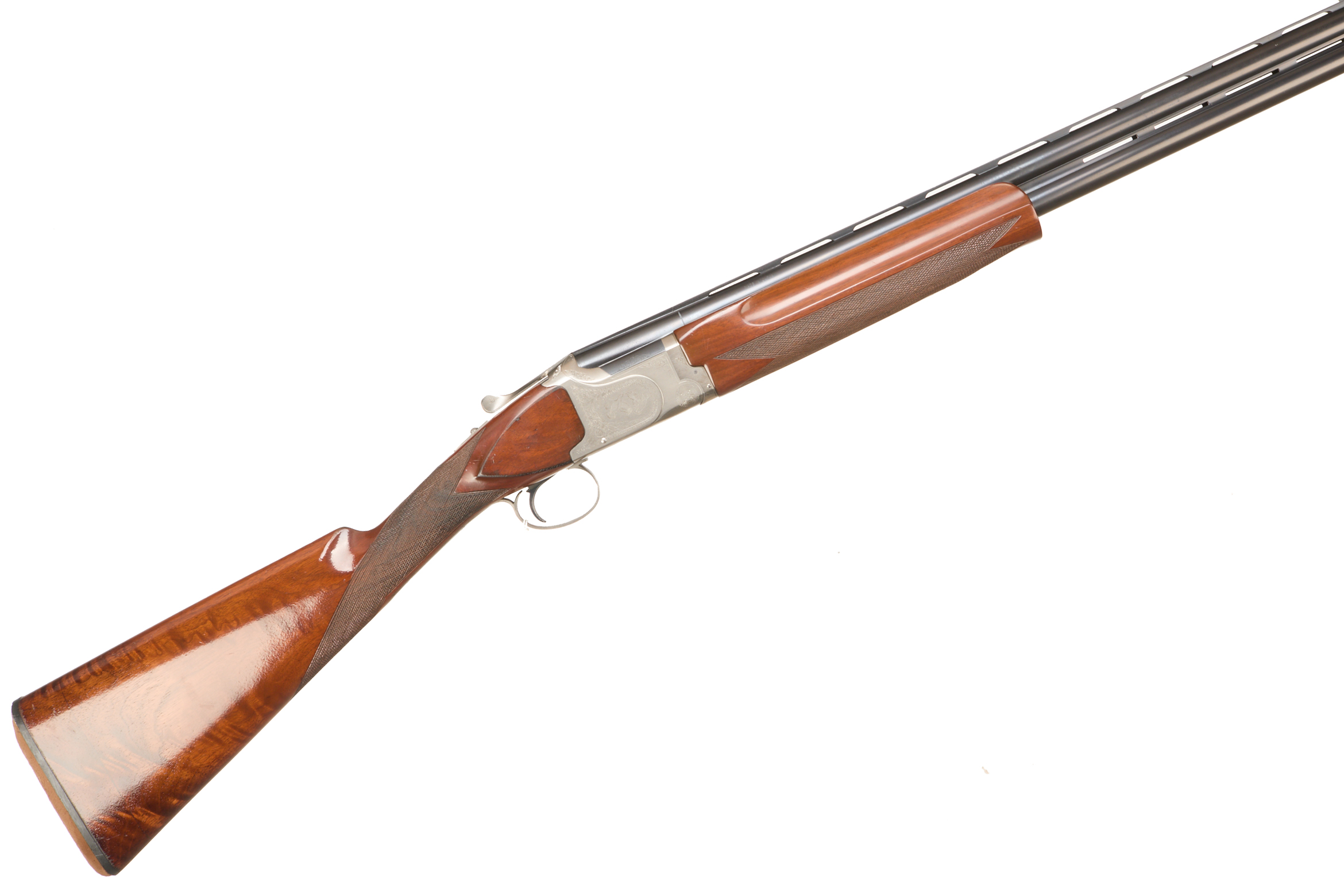 Cushioned butt pad, chequered straight grip and forend, ventilated top and mid rib. Game birds engraved surrounded by acanthus scrolls to action. Integrated barrel selector (selective single trigger) and safety.