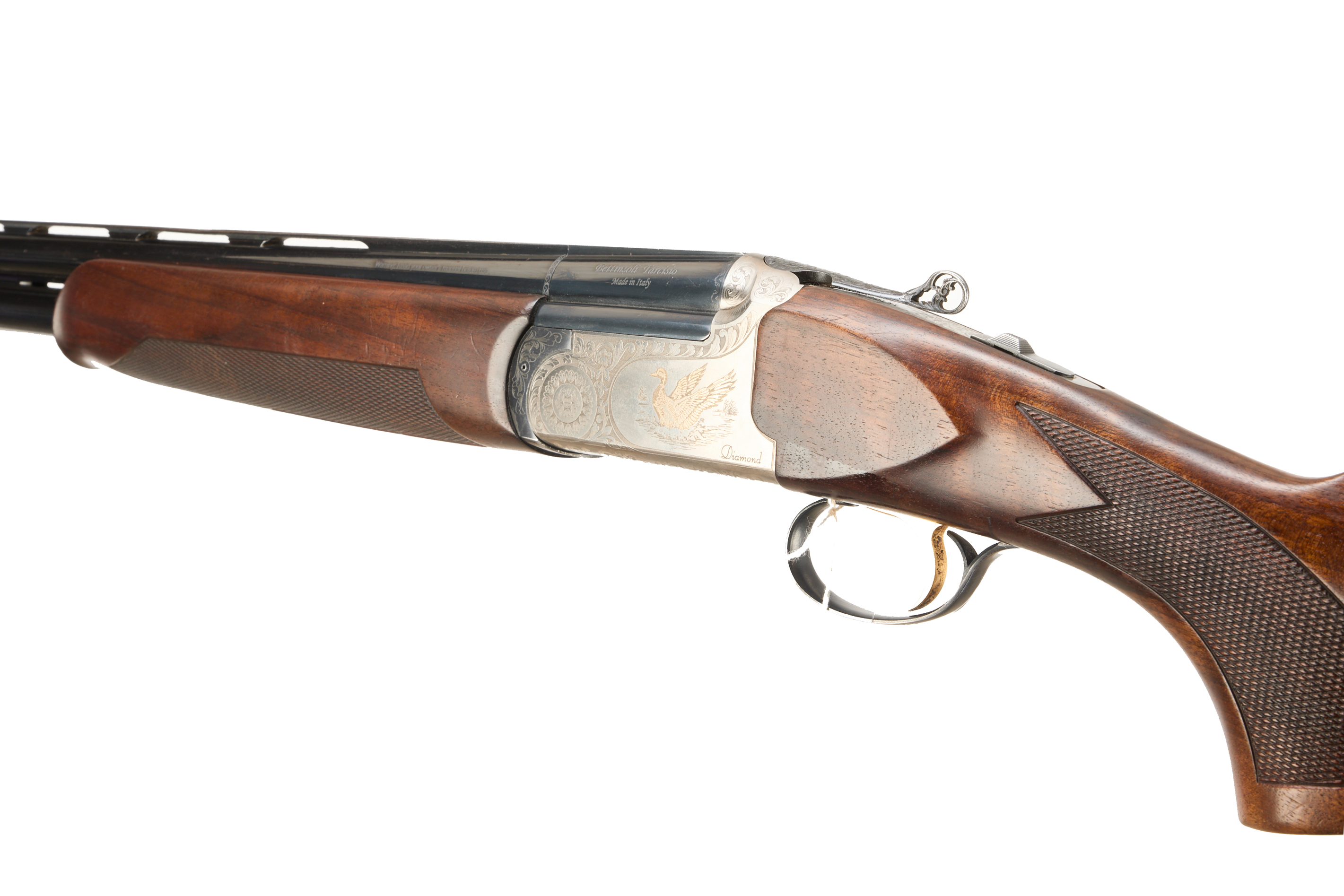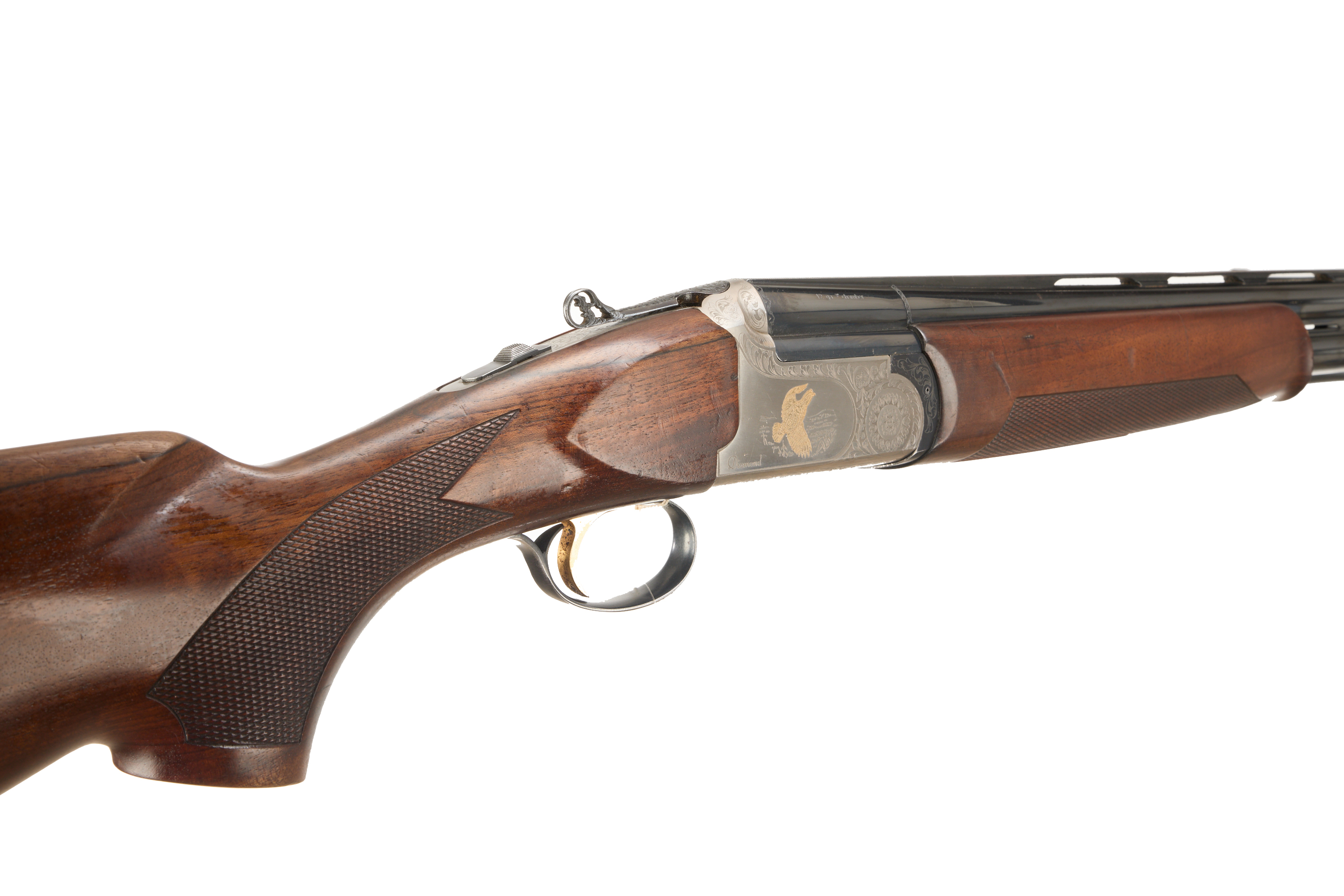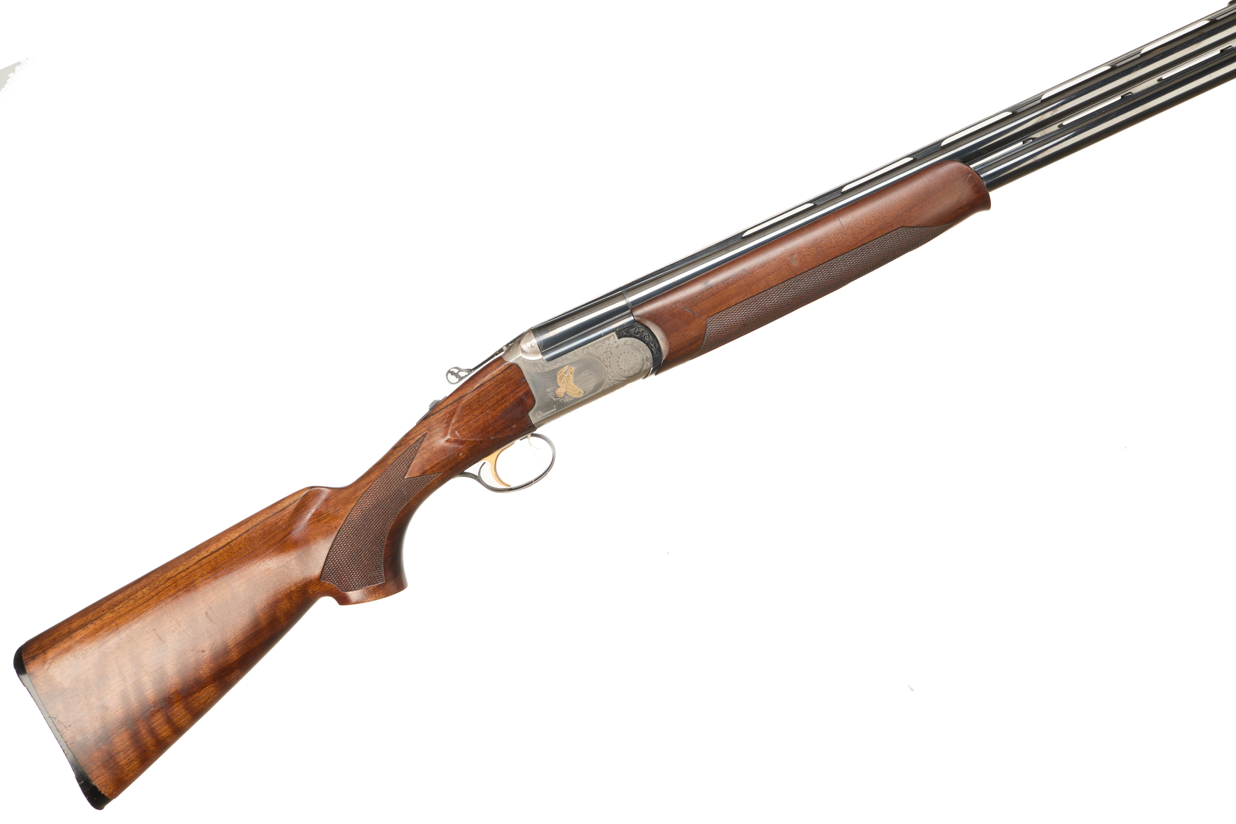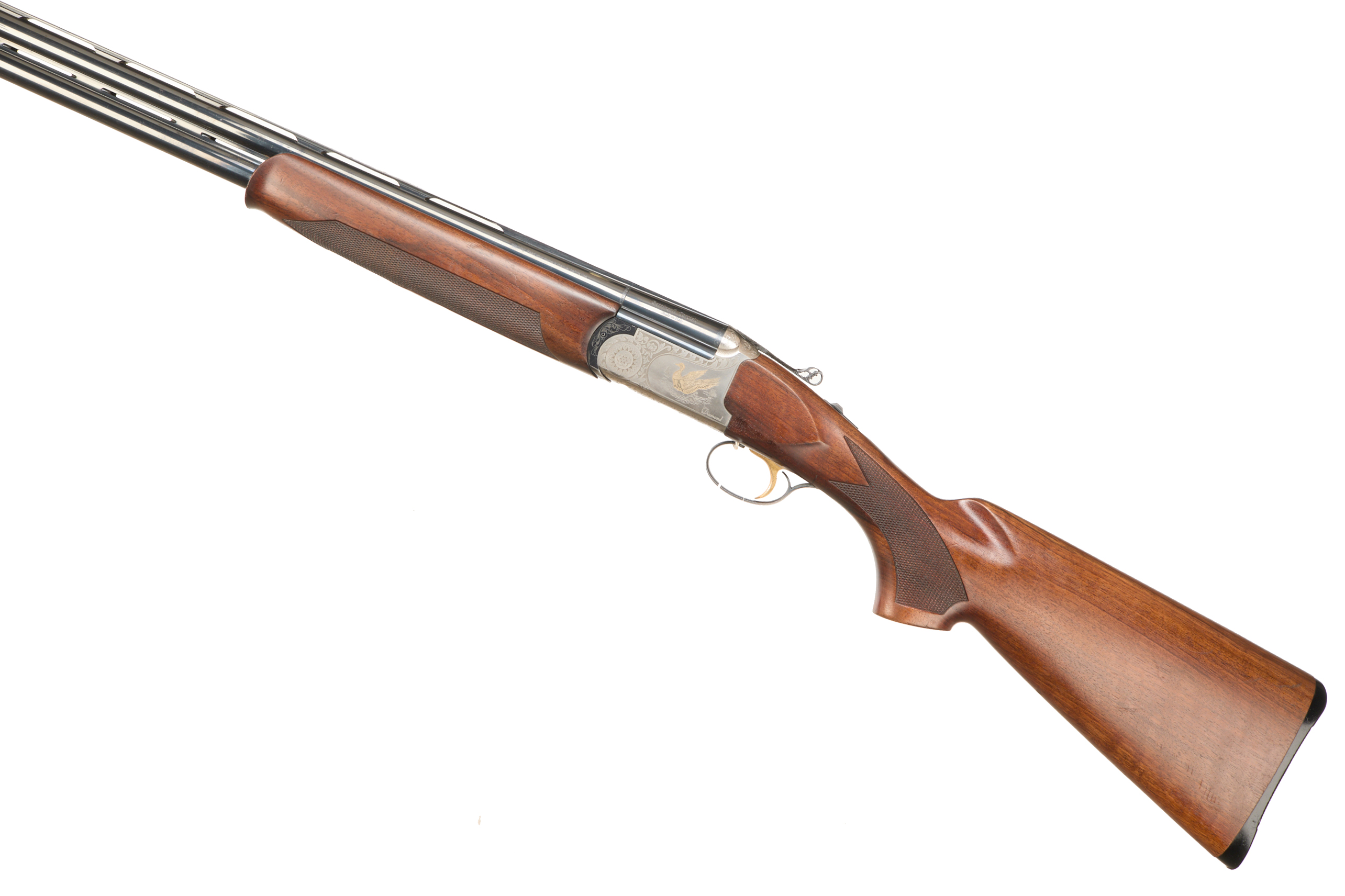 Ebonite butt pad, chequered semi-pistol grip and forend, straight grip, ventilated top and mid rib. Game bird engraved in gold and acanthus scrolls to action. Carved acanthus action release. Gold wash trigger, integrated barrel selector (selective single trigger) and safety. For 2003.