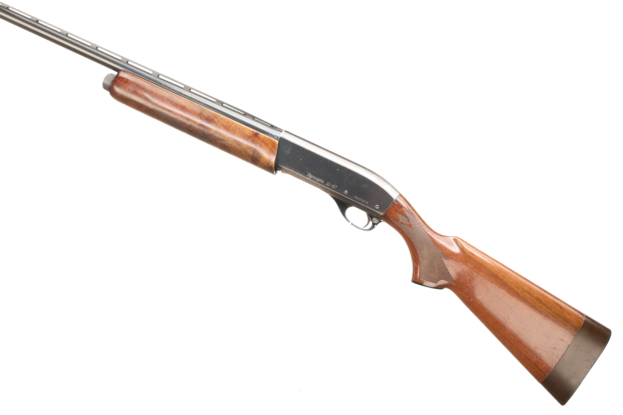 Hard, rubber butt pad, chequered pistol grip stock and forend. Ventilated top rib, plain action with ‘REMINGTON 11-87’ engraved.