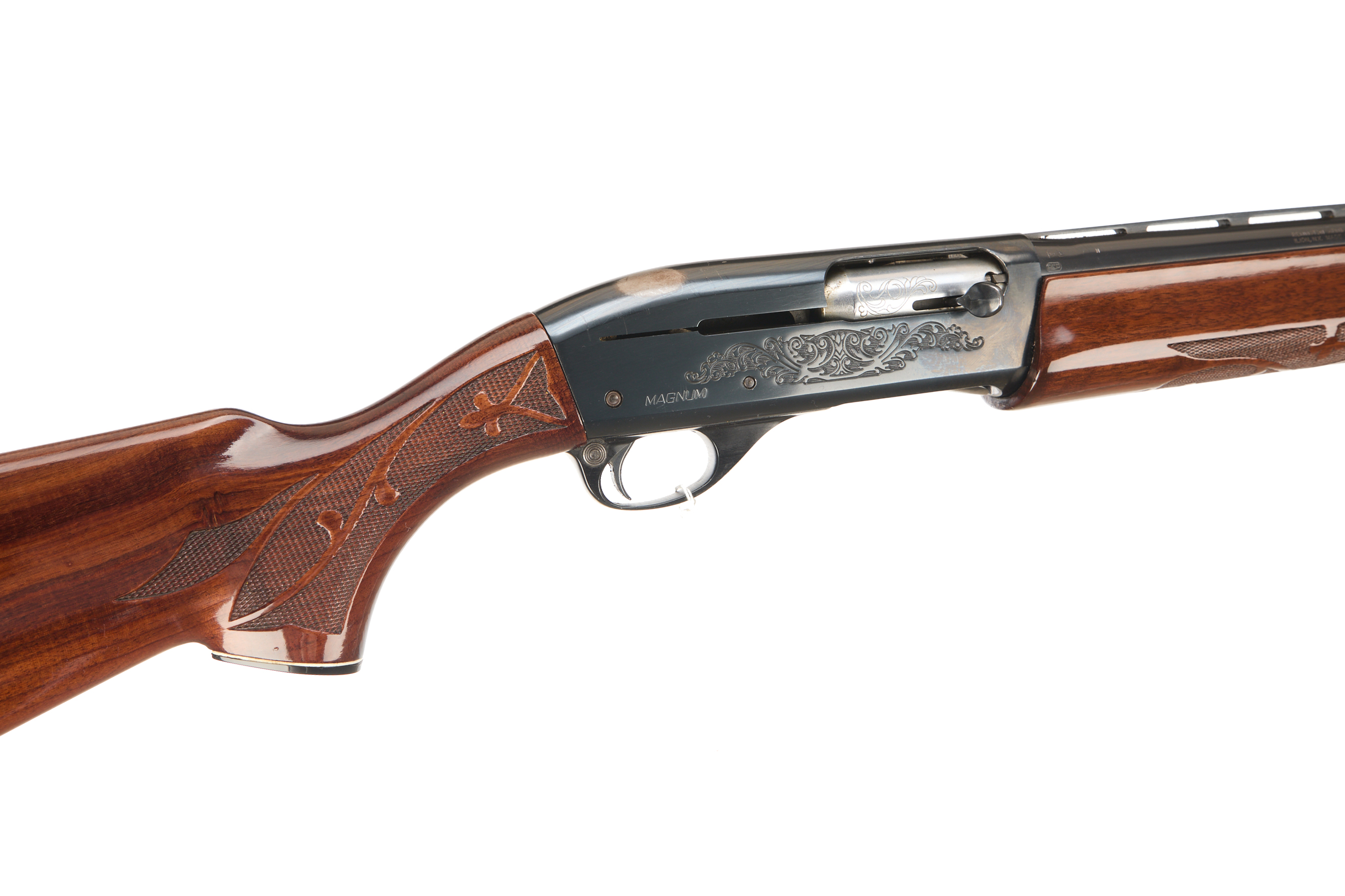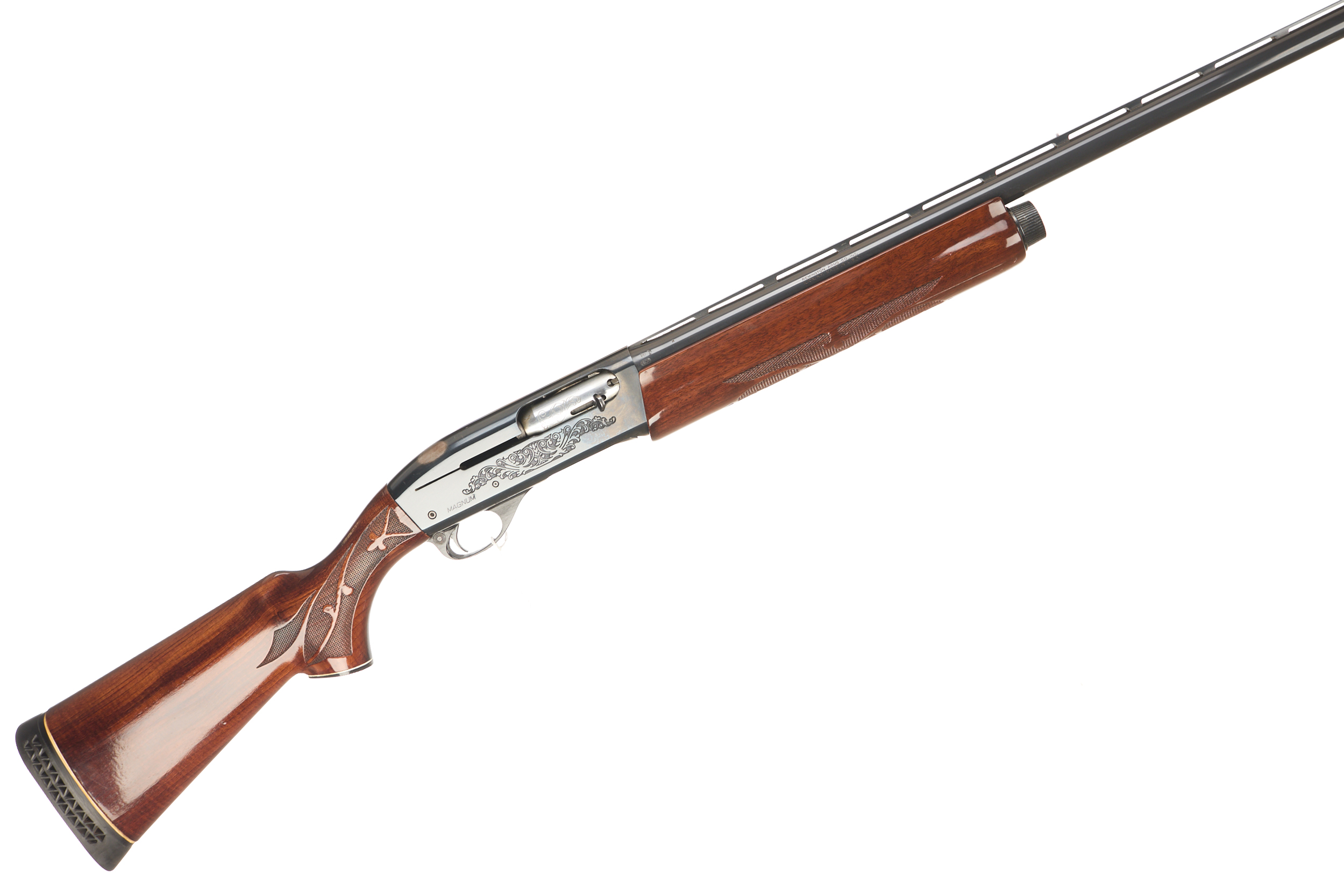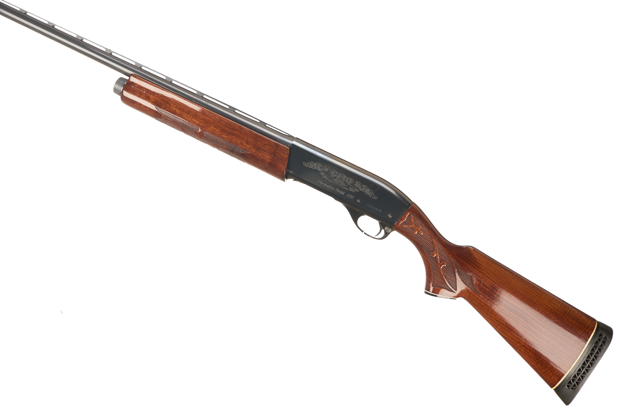 Ventilated butt pad, chequered pistol grip stock and forend. Ventilated machine-finished top rib, acanthus scrolls with ‘REMINGTON MODEL 1100’ engraved to action.