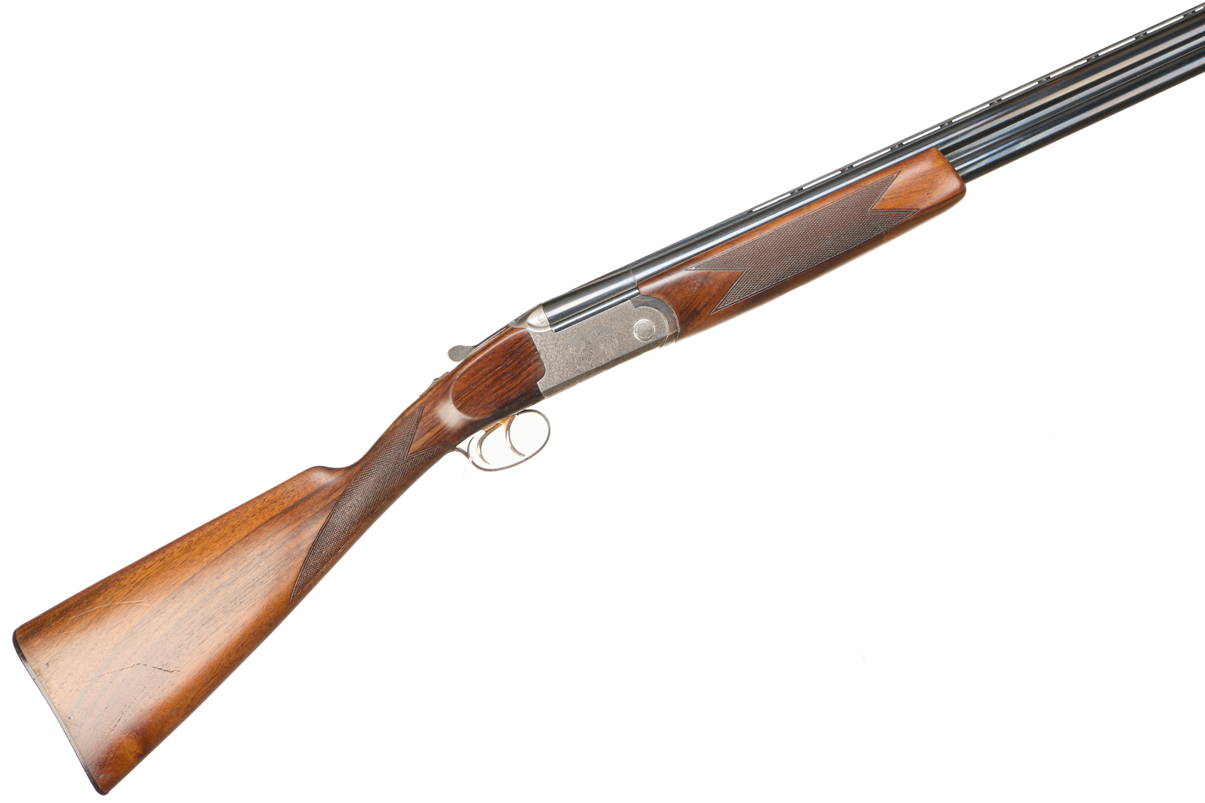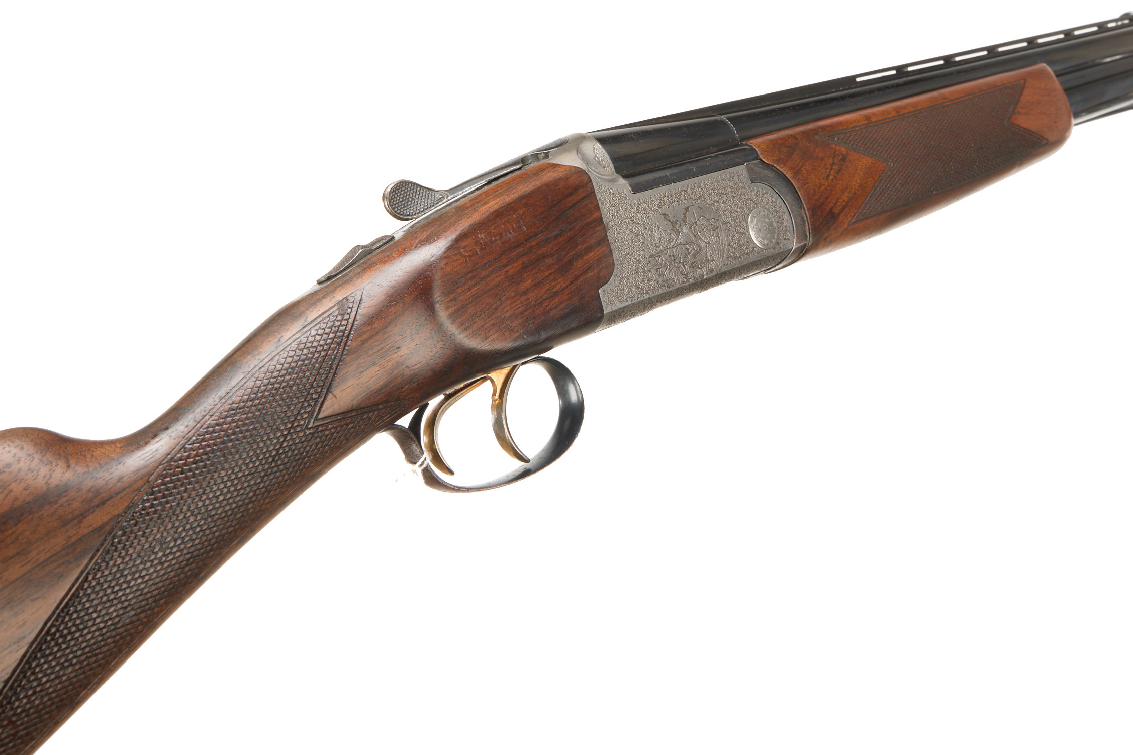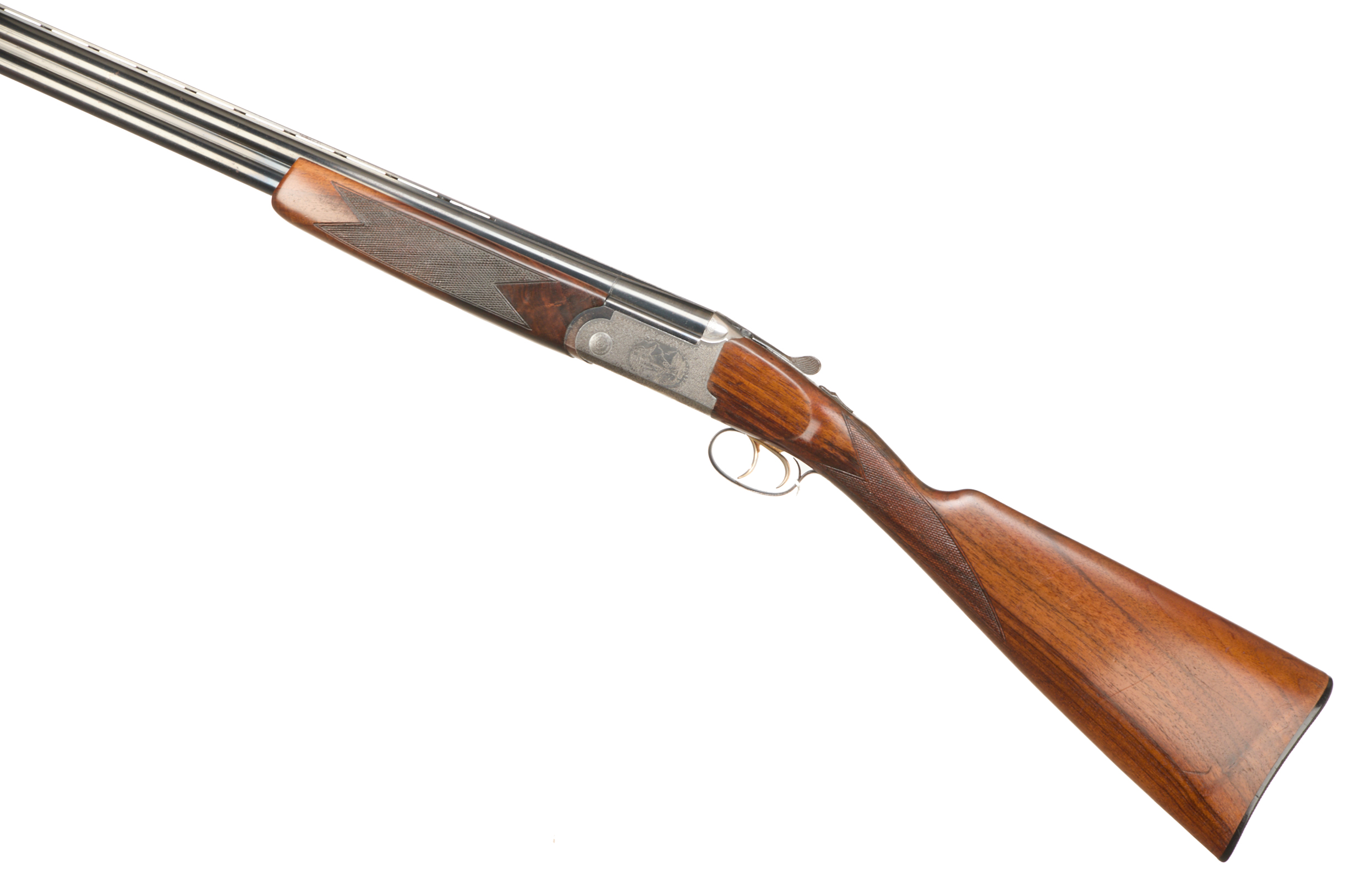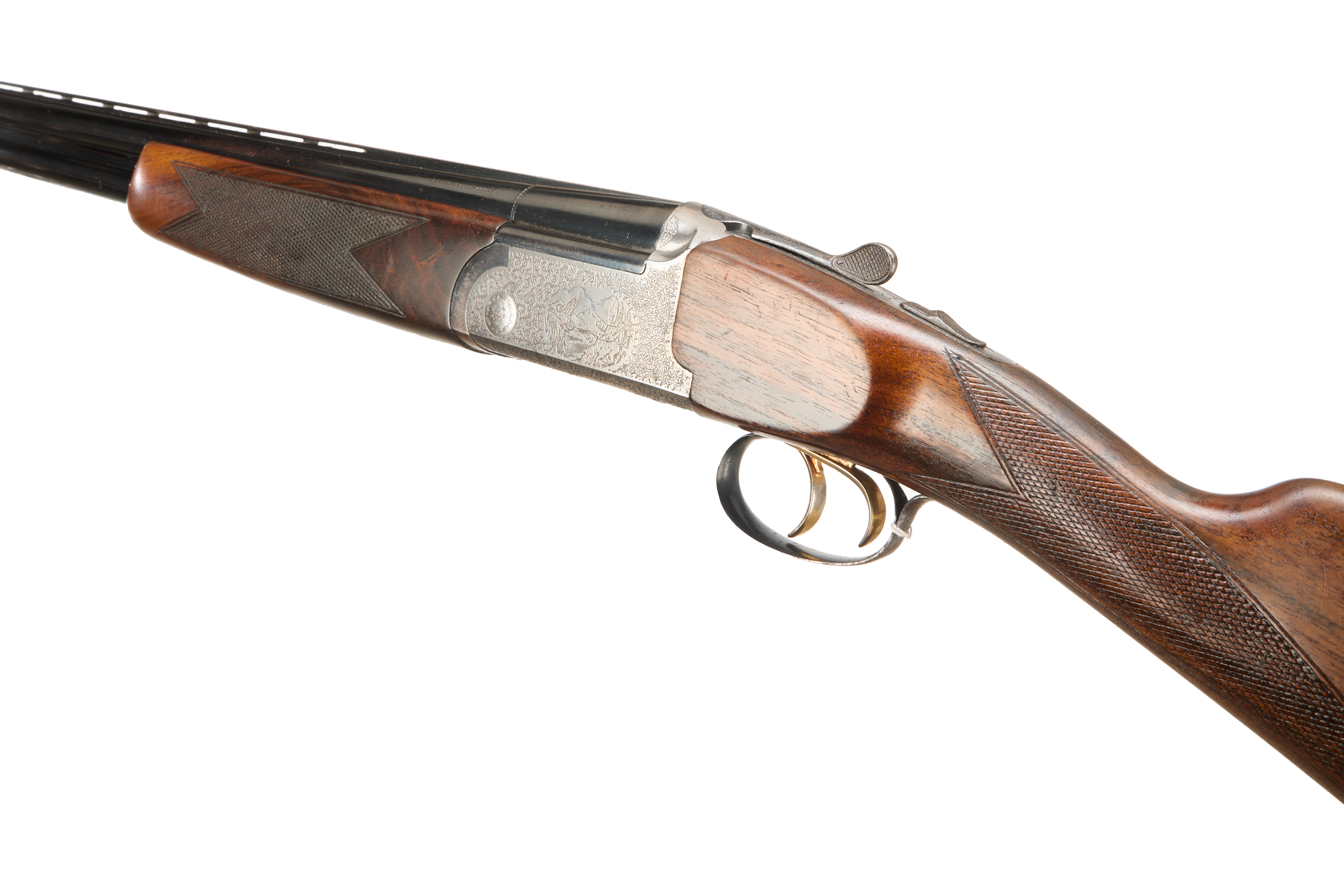 Hard plastic butt pad, chequered straight grip and forend, ventilated top rib. Aquatic game scene and swirling patterns engraved to action. Gold wash trigger, safety.
