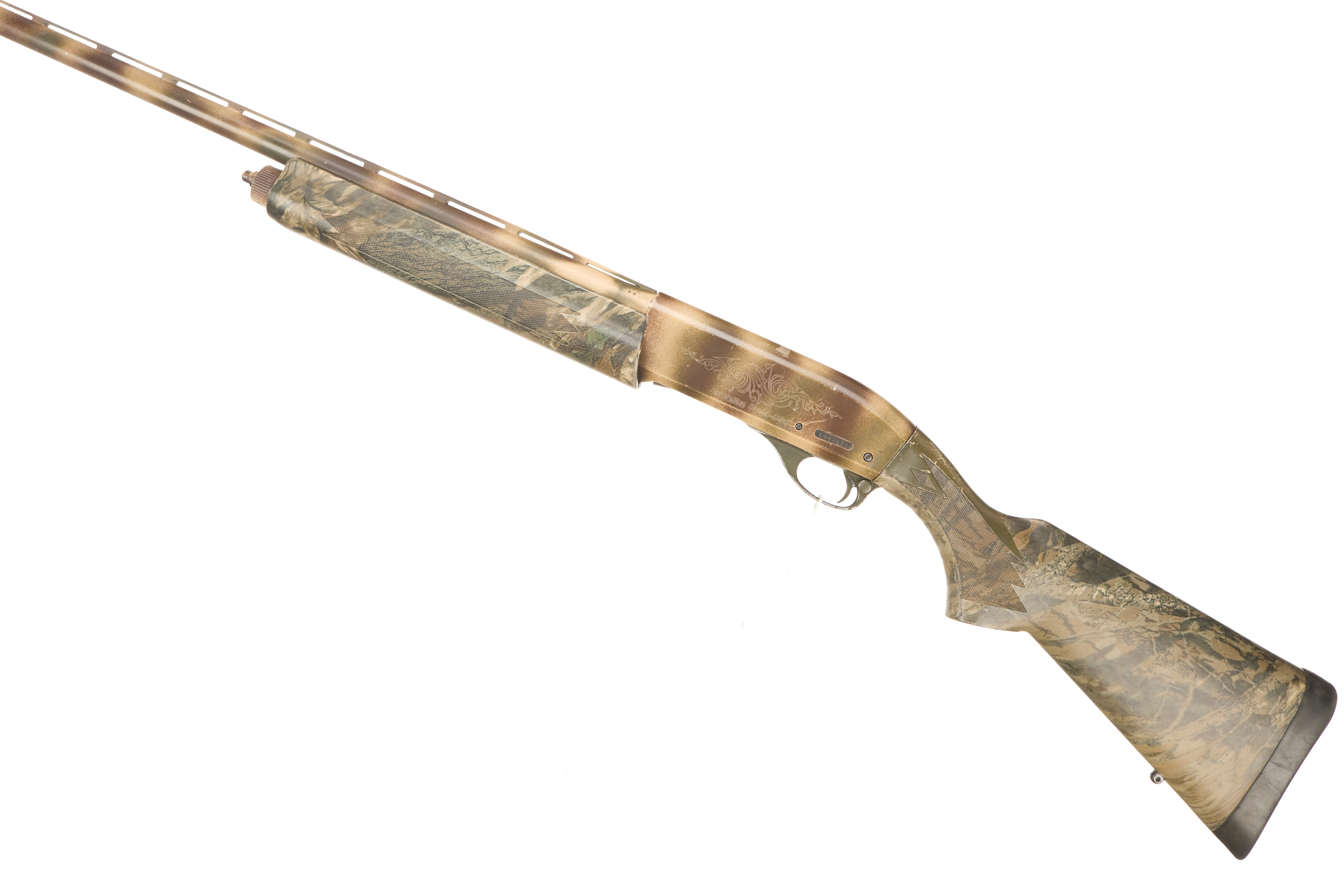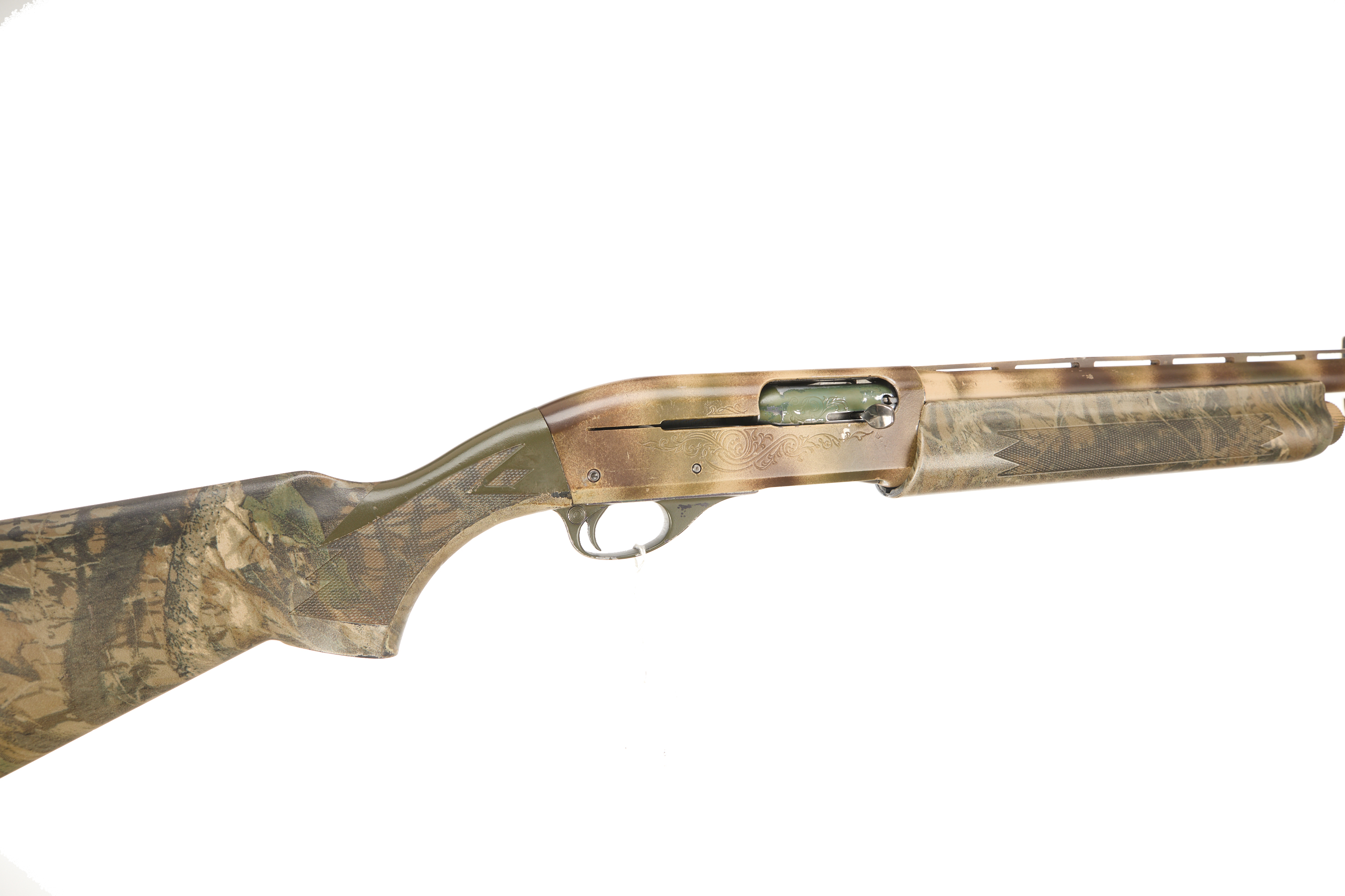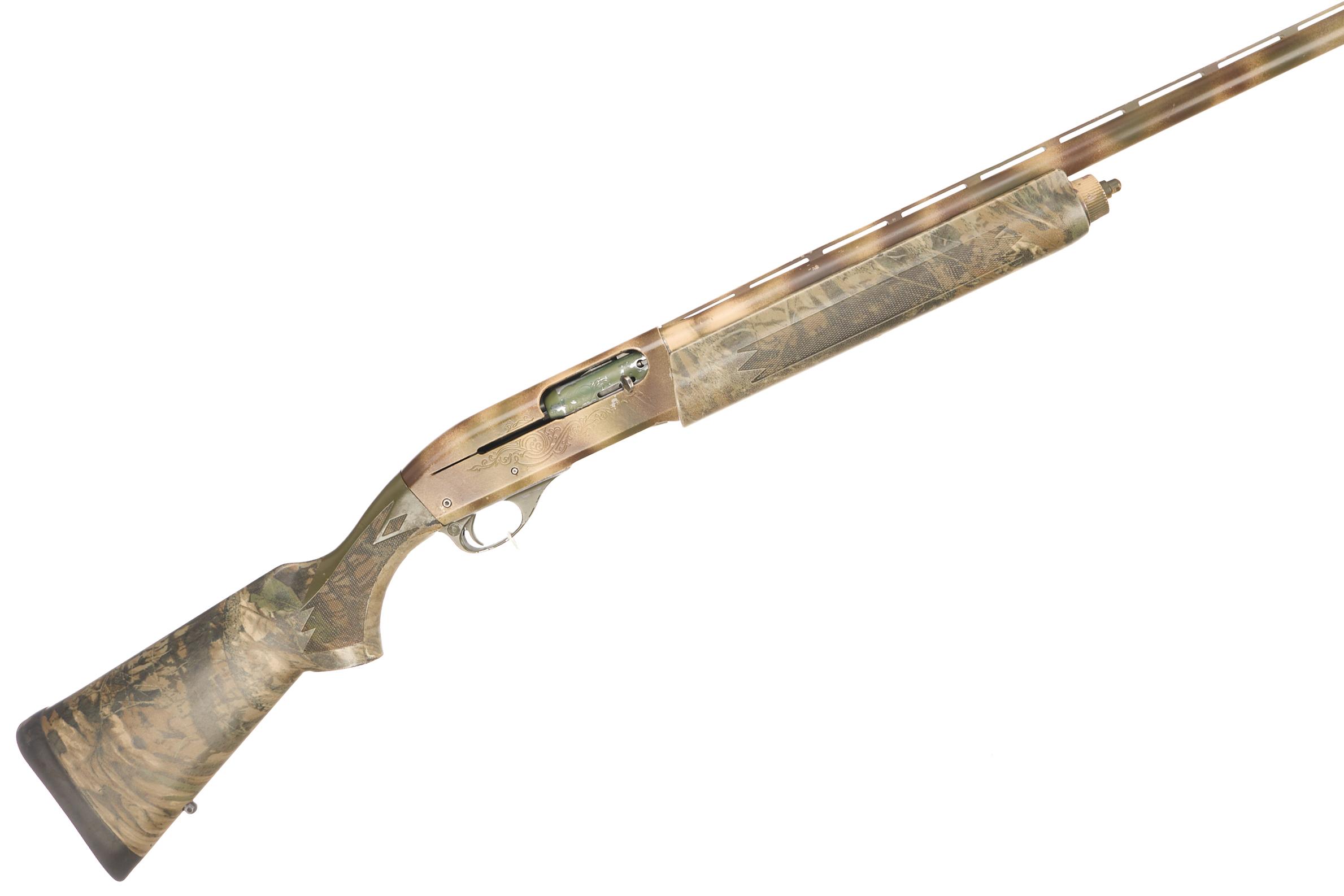 Cushioned rubber butt pad, chequered pistol grip stock and forend. Ventilated top rib, painted action.