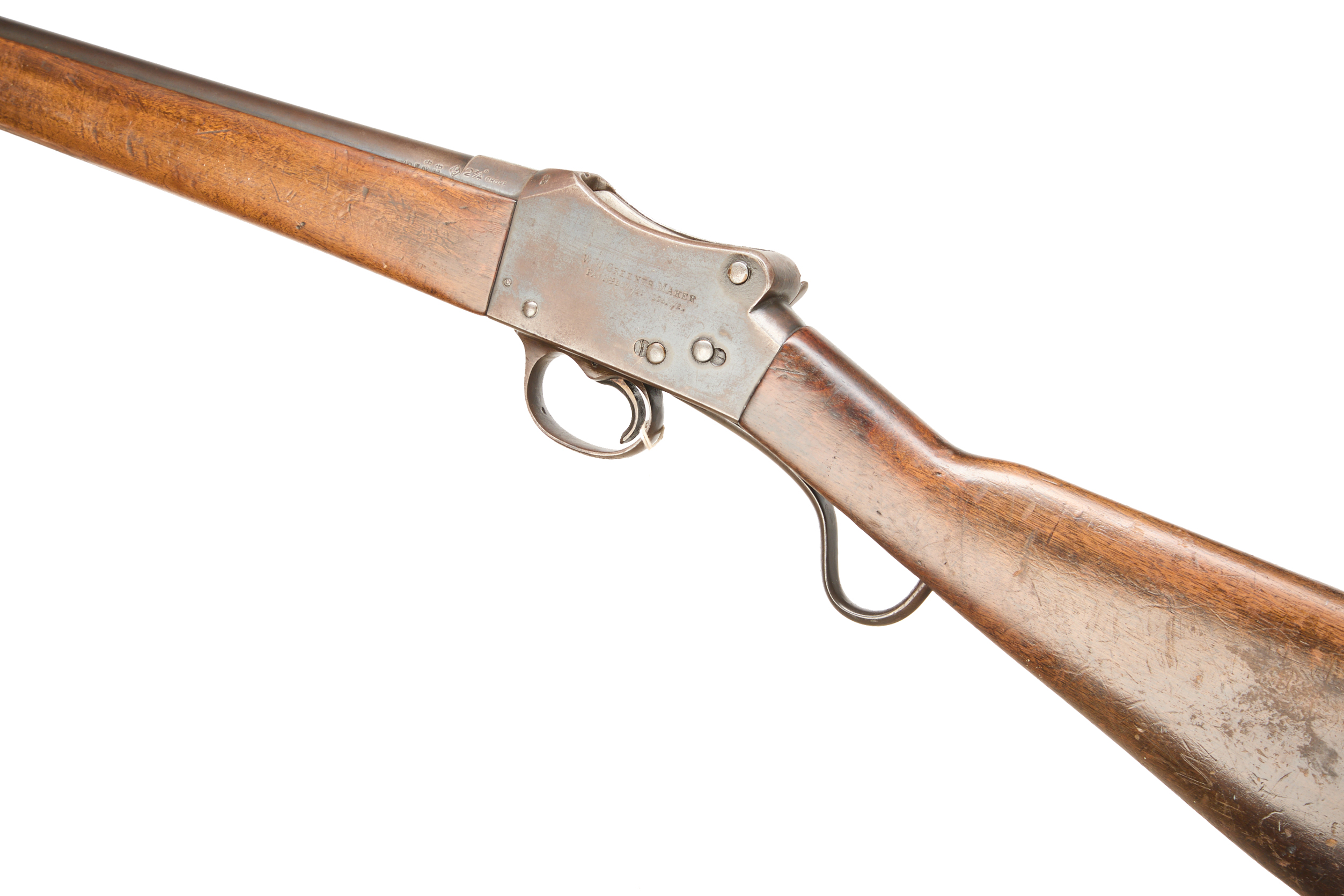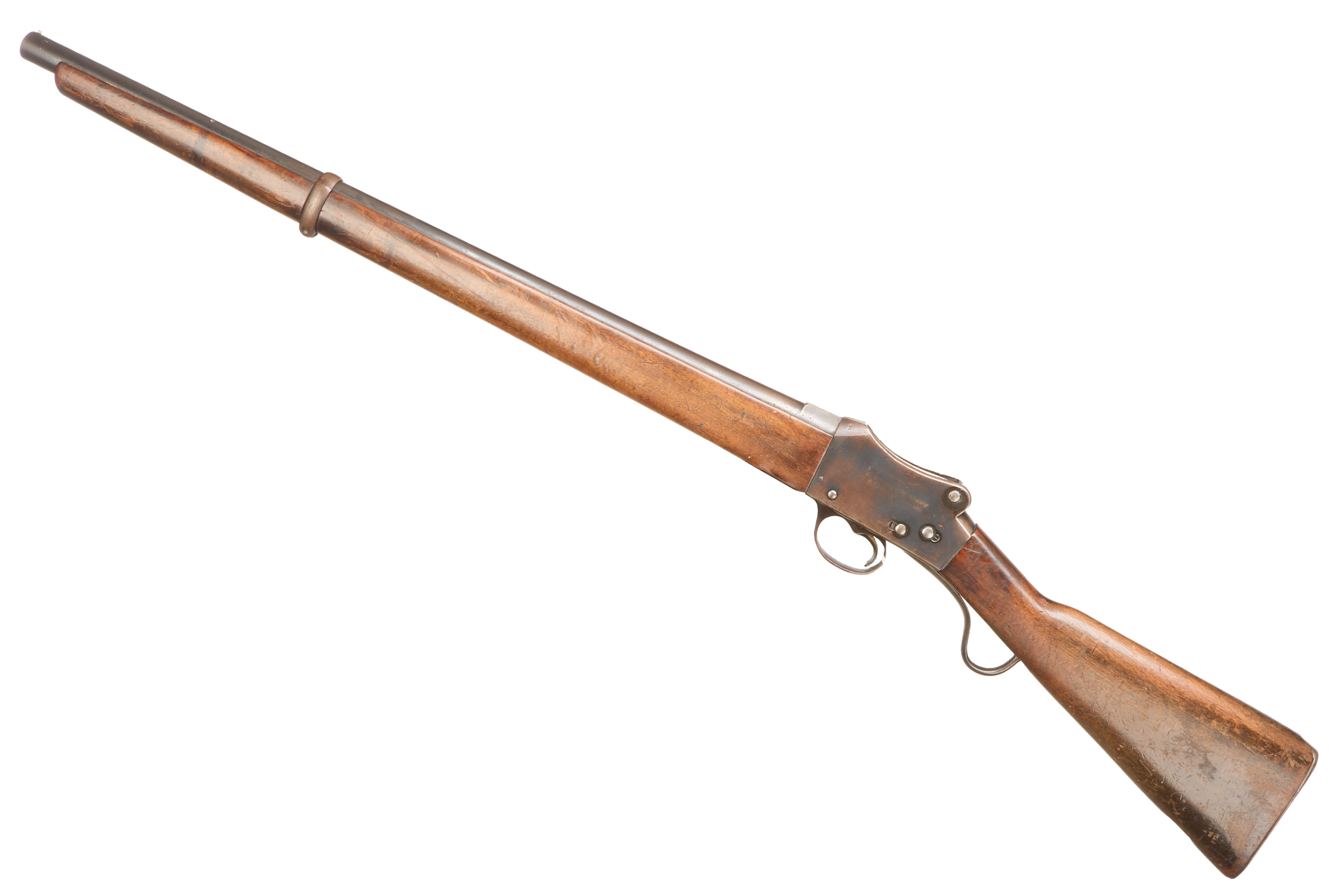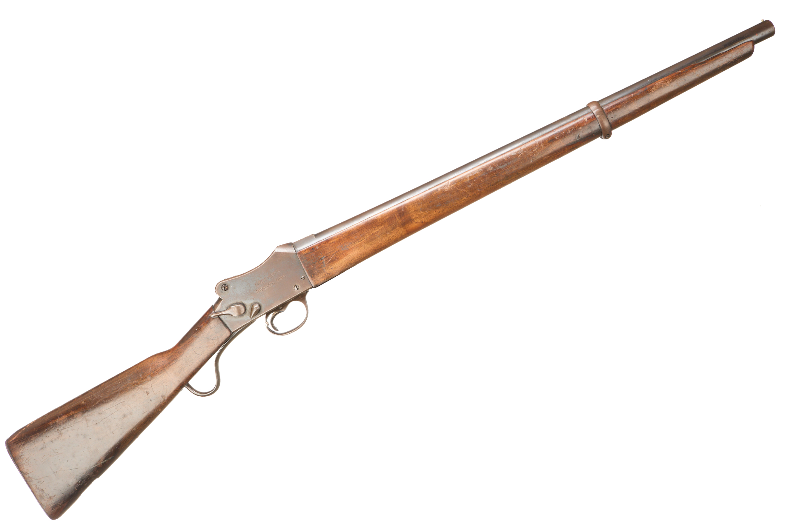 Metal buttplate with compartment cover, plain, straight grip full length stock, barrel band. The action engraved ‘GREENER’S POLICE GUN etc’. Automatic safety, cocking indicator.