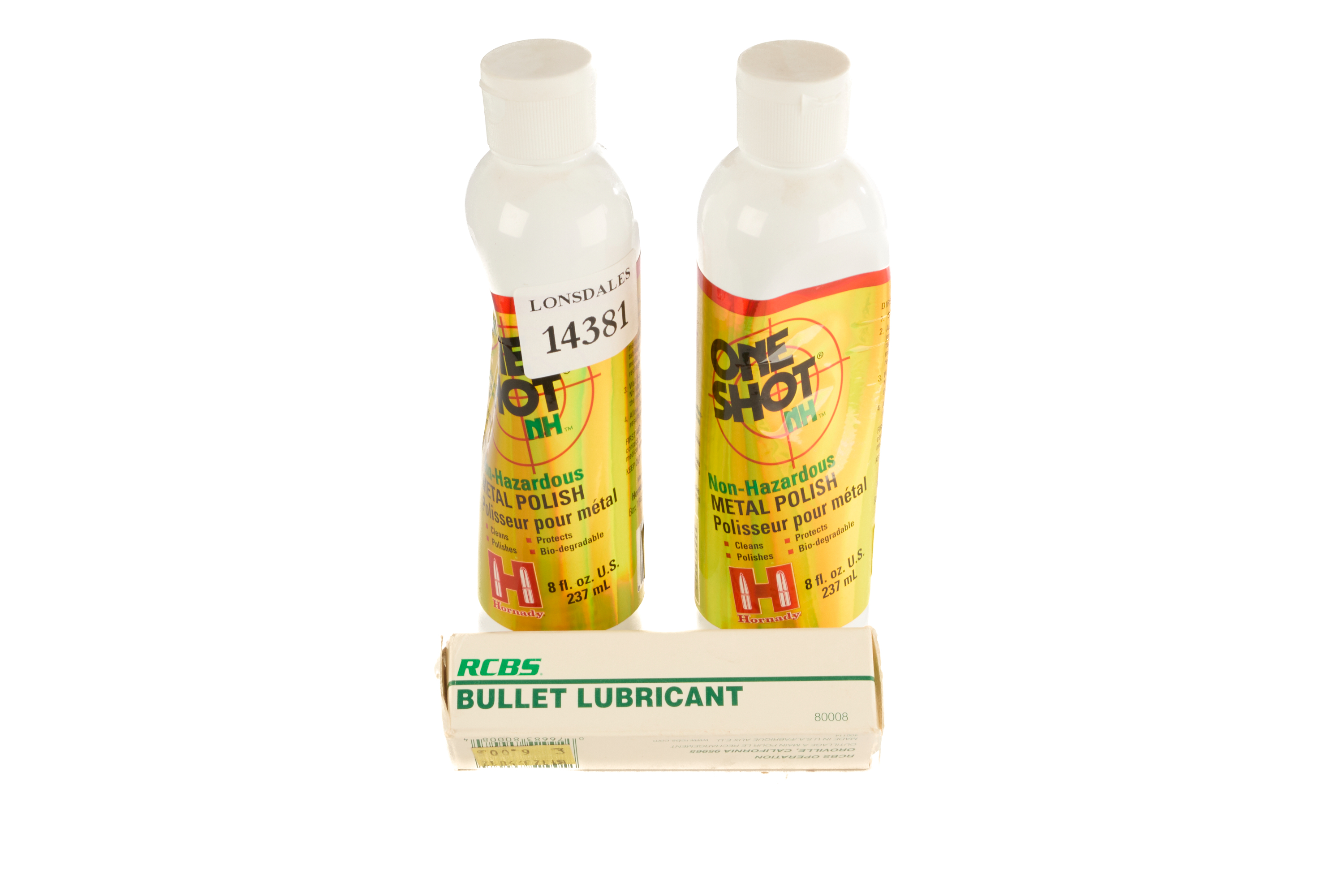 Lot 92: HORNADY ONE-SHOT METAL POLISH, 8fl.oz, 237ml, 2 OF & RCBS BULLET LUBRICANT