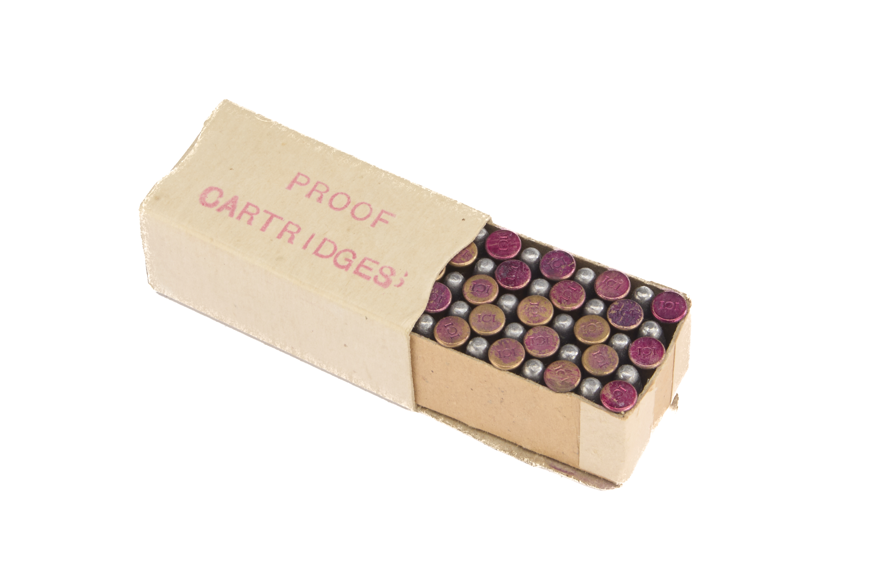 Lot 134: .22LR PEARCE PROOF CARTRIDGES IN THE "JOHN BULL" PRINTED CARTON OF 50RDS, 50 OF