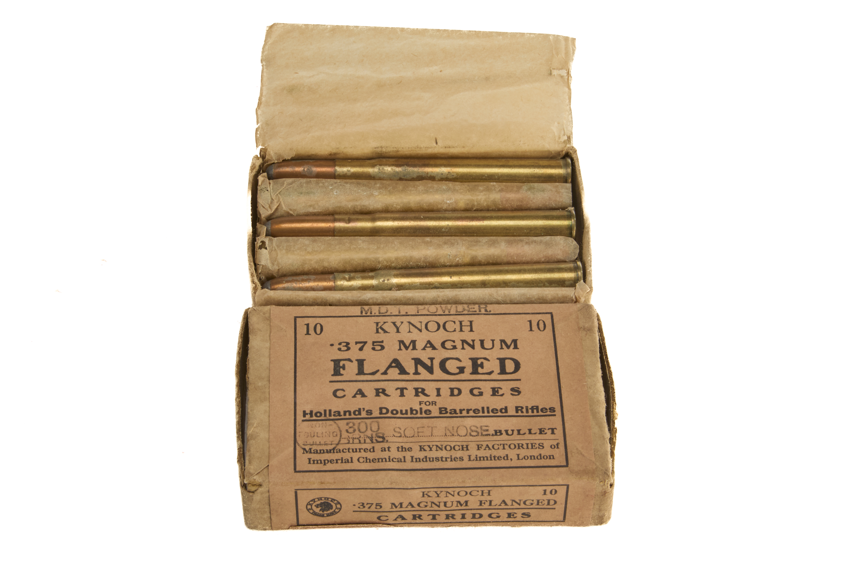 Lot 188: KYNOCH .375 MAGNUM FLANGED CARTRIDGES FOR HOLLAND'S DOUBLE BARRELLED RIFLES 300gr SOFT-NOSED, 10 OF