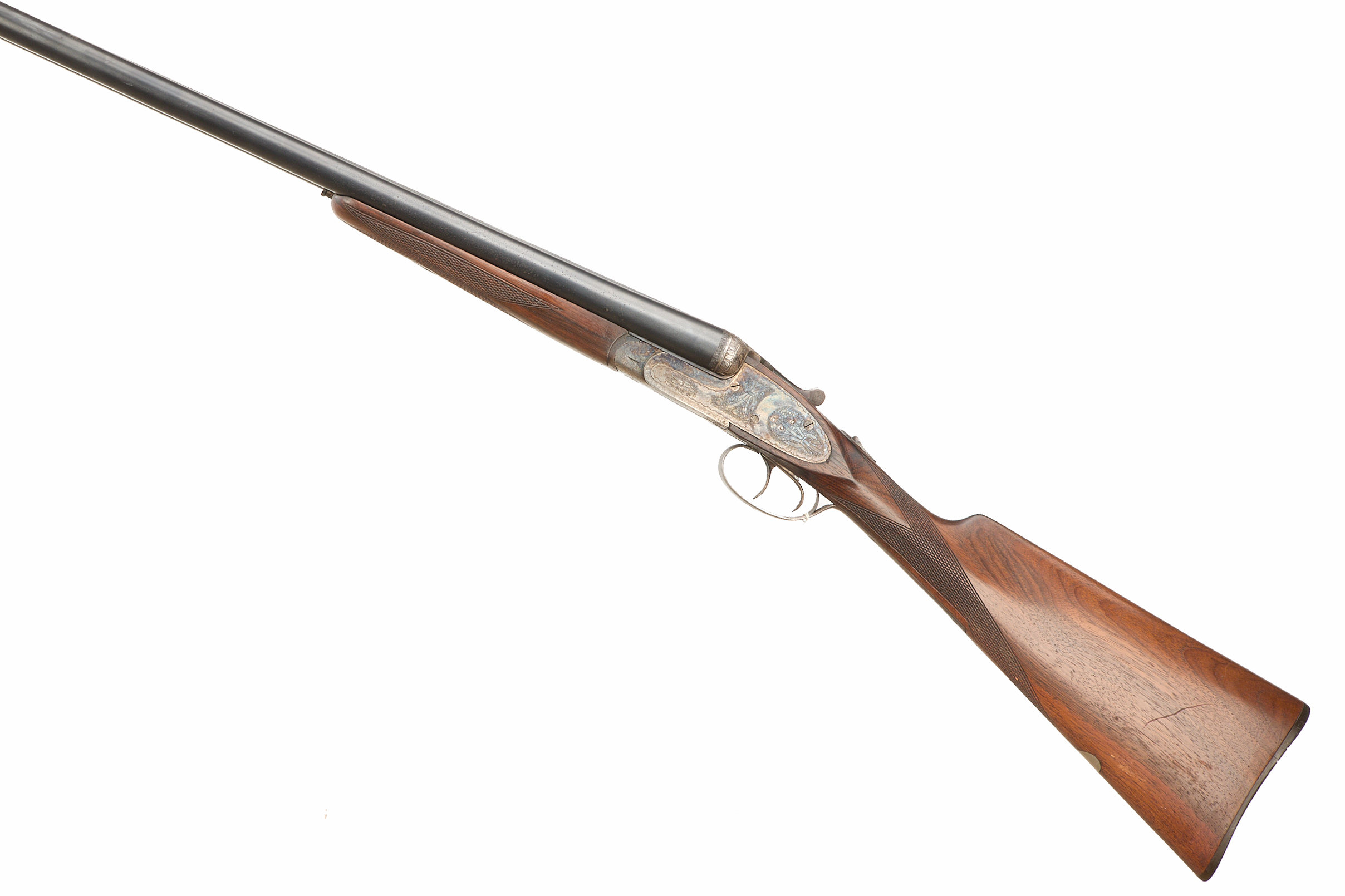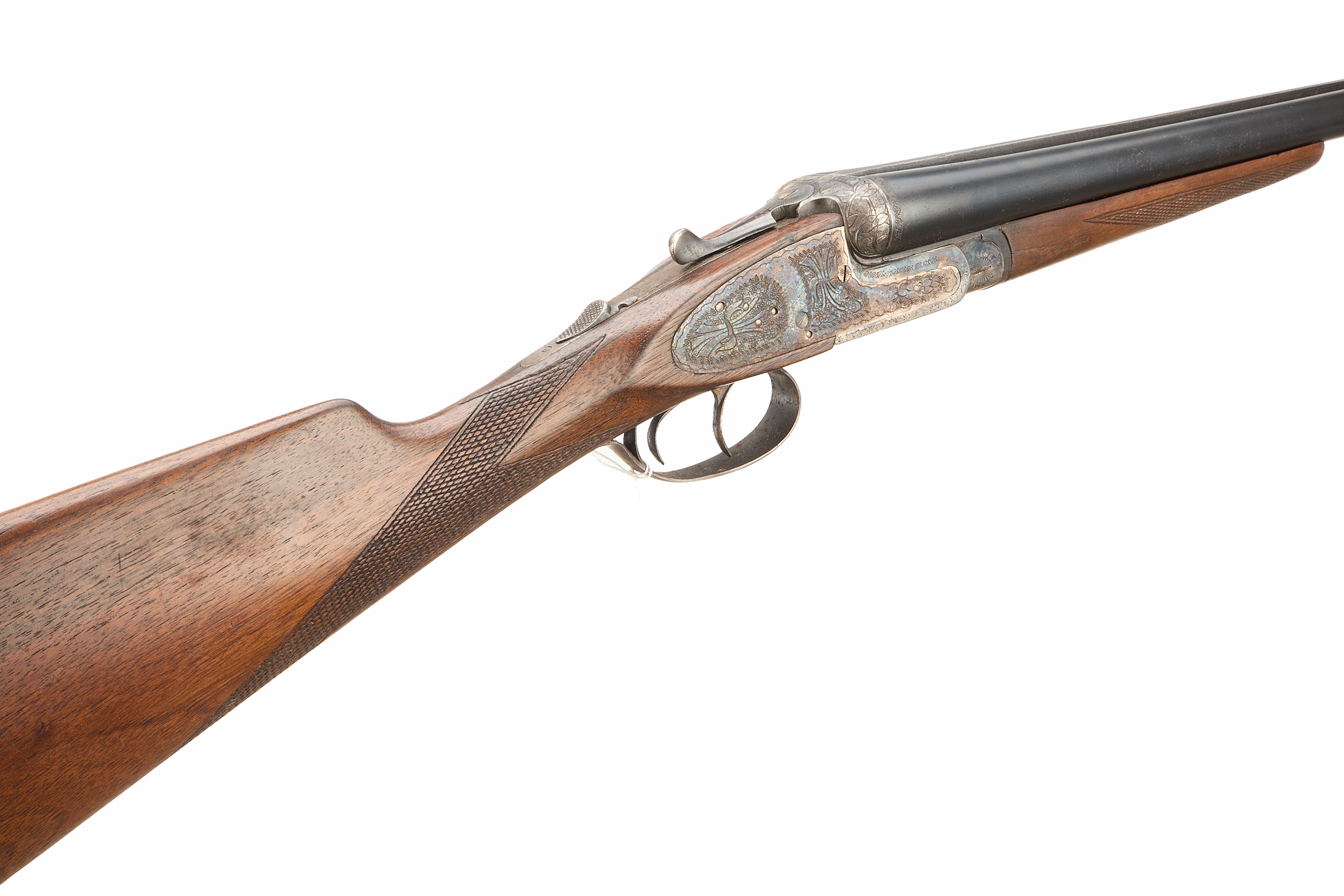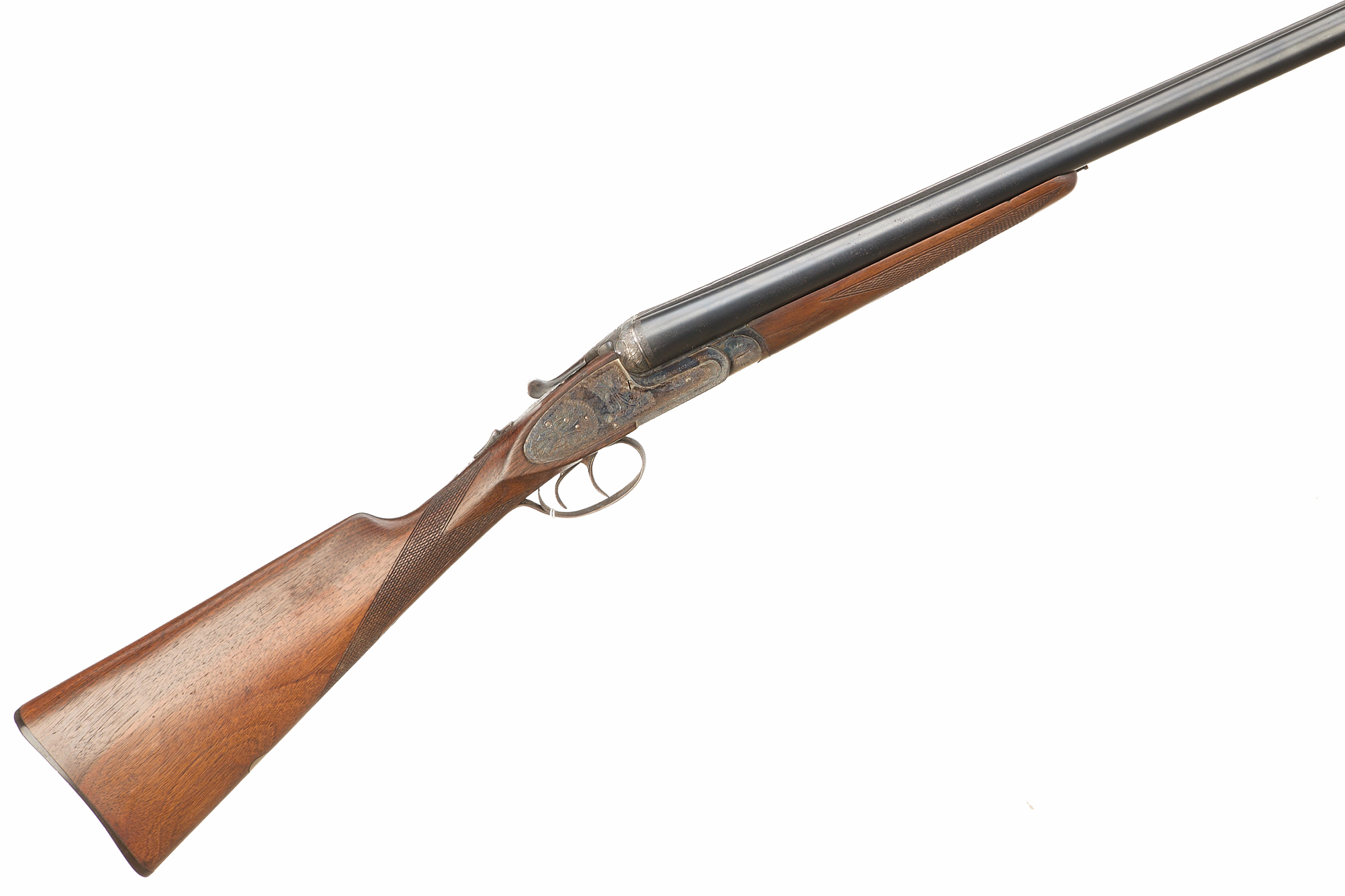 Hard rubber butt, chequered straight grip and forend. Treble grip action, hold open top lever, automatic safety. The action engraved with bouquets and extensive acanthus scrolling.
