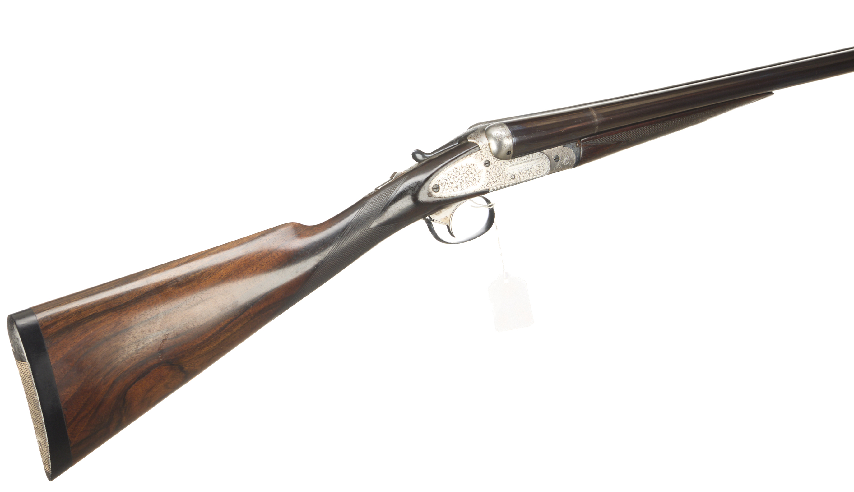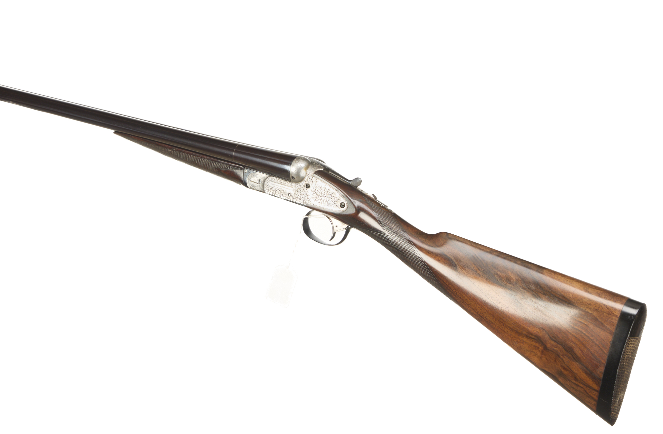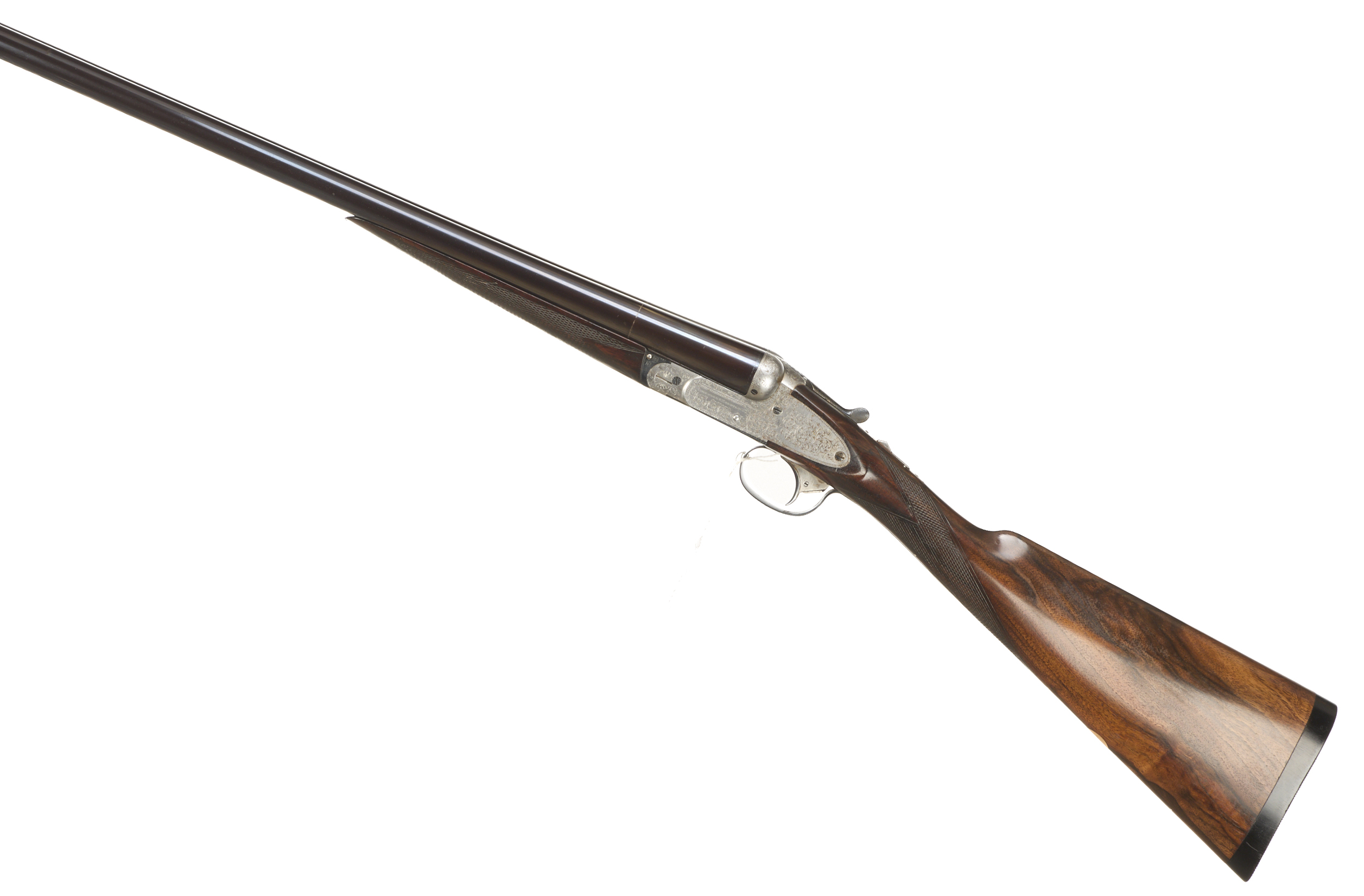 Chequered, ebonite butt, straight grip and forend. Concave, tapered, rib, concealed third bite, top lever, automatic safety engraved ‘1’. The action engraved with very pleasant broader, acanthus scrolling. For 1897. Sleeved 1974.