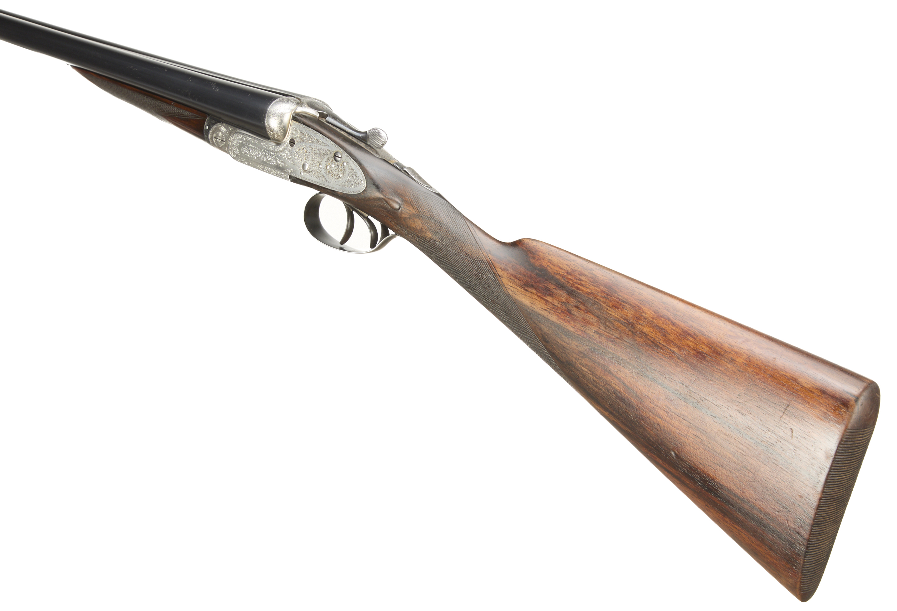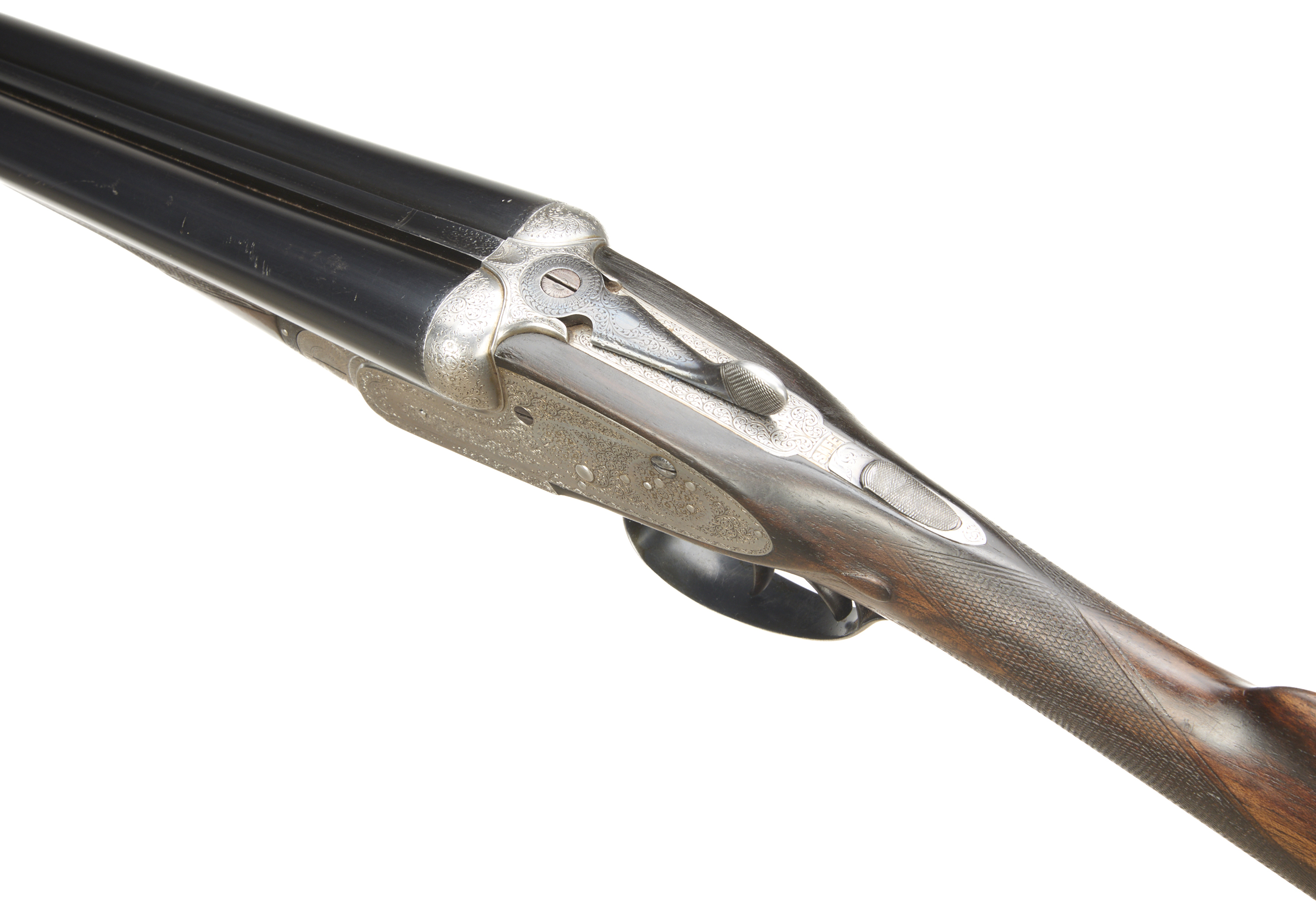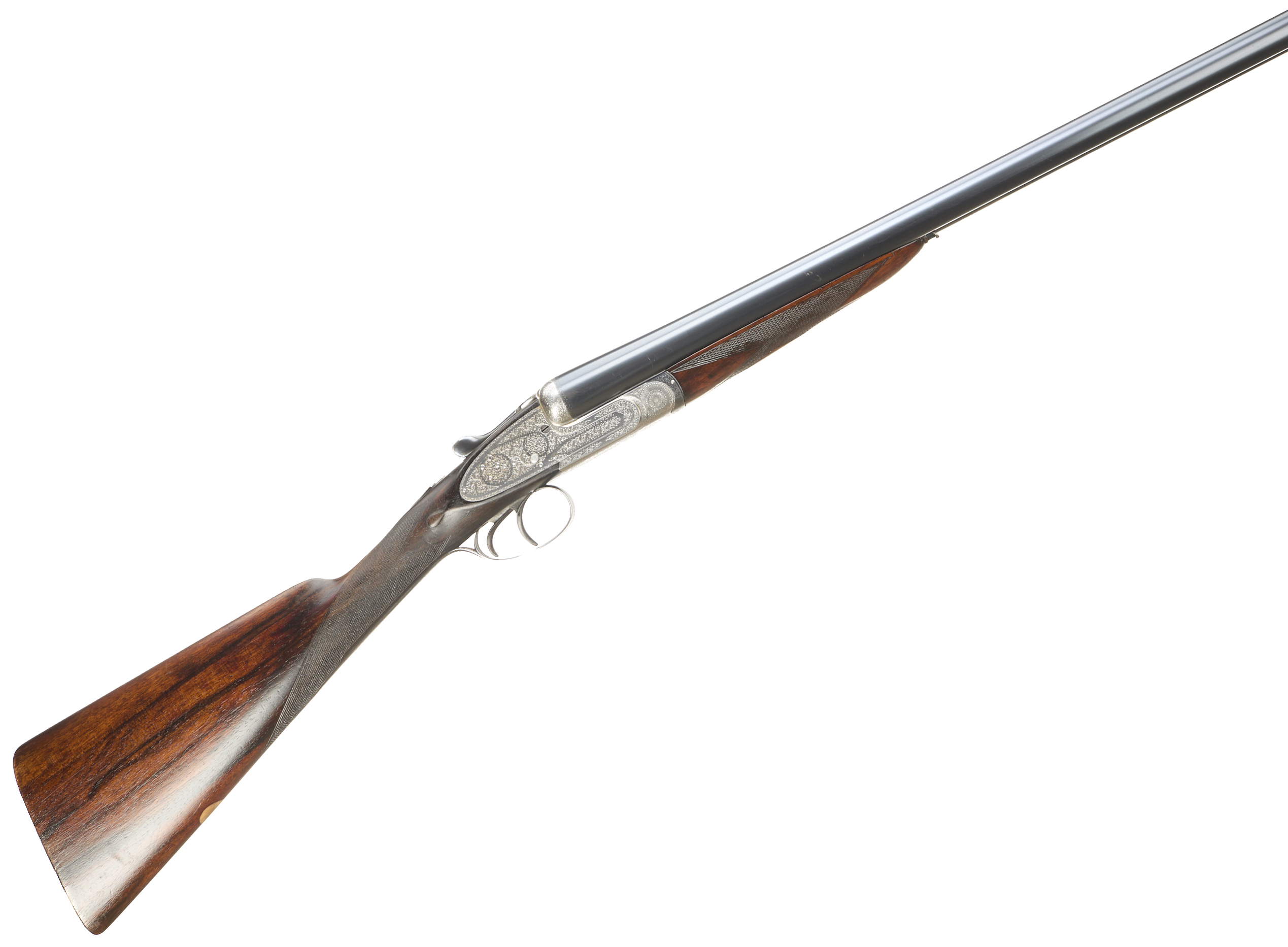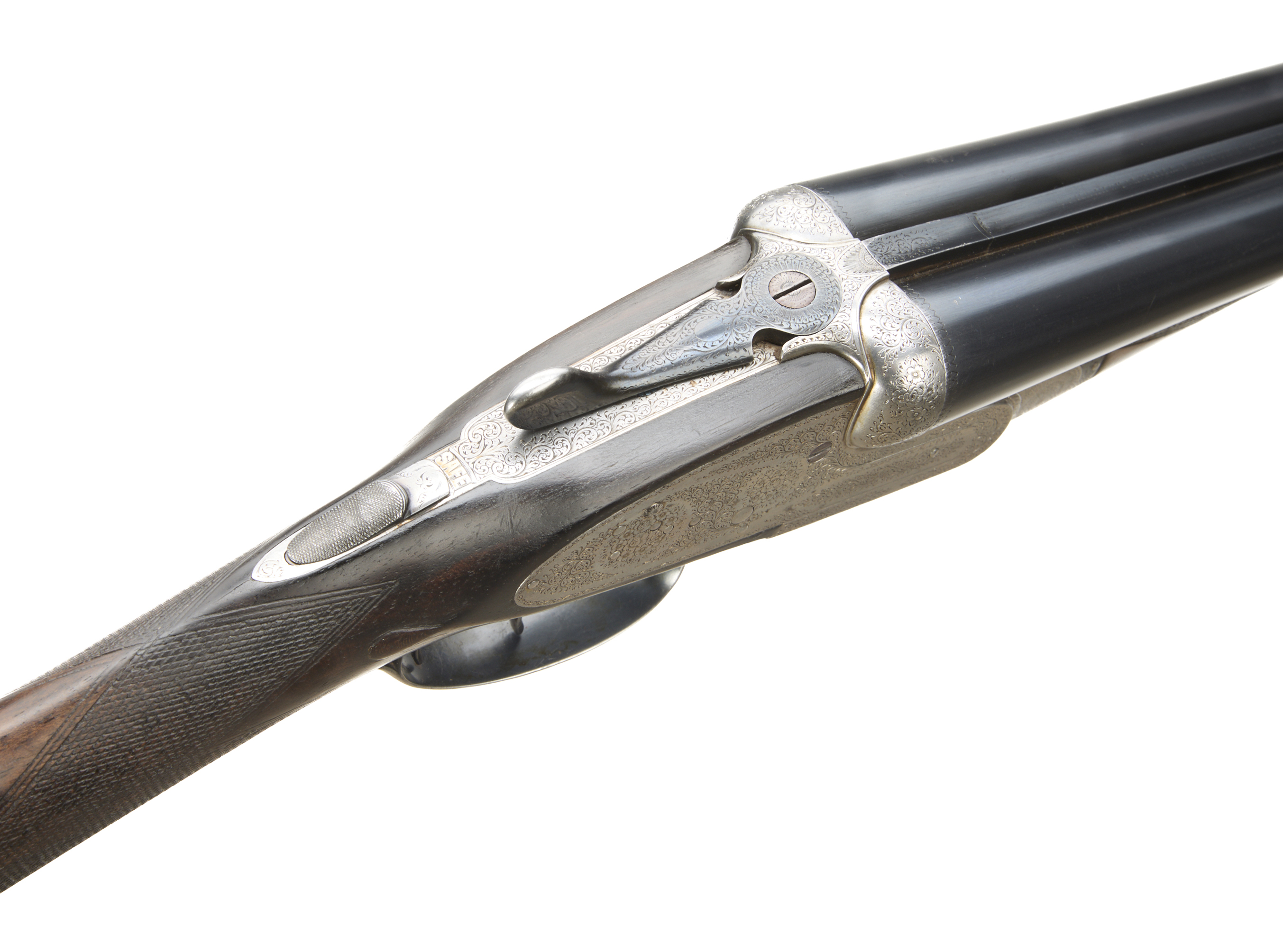 Ribbed butt, chequered straight grip and forend. Concave rib engraved ‘W. J. JEFFERY etc (worn)’. Top lever, automatic safety with ‘SAFE’ inlaid in gold. The action engraved with bouquets and extensive acanthus scrolling. Ca 1930s. Sleeved 1974.