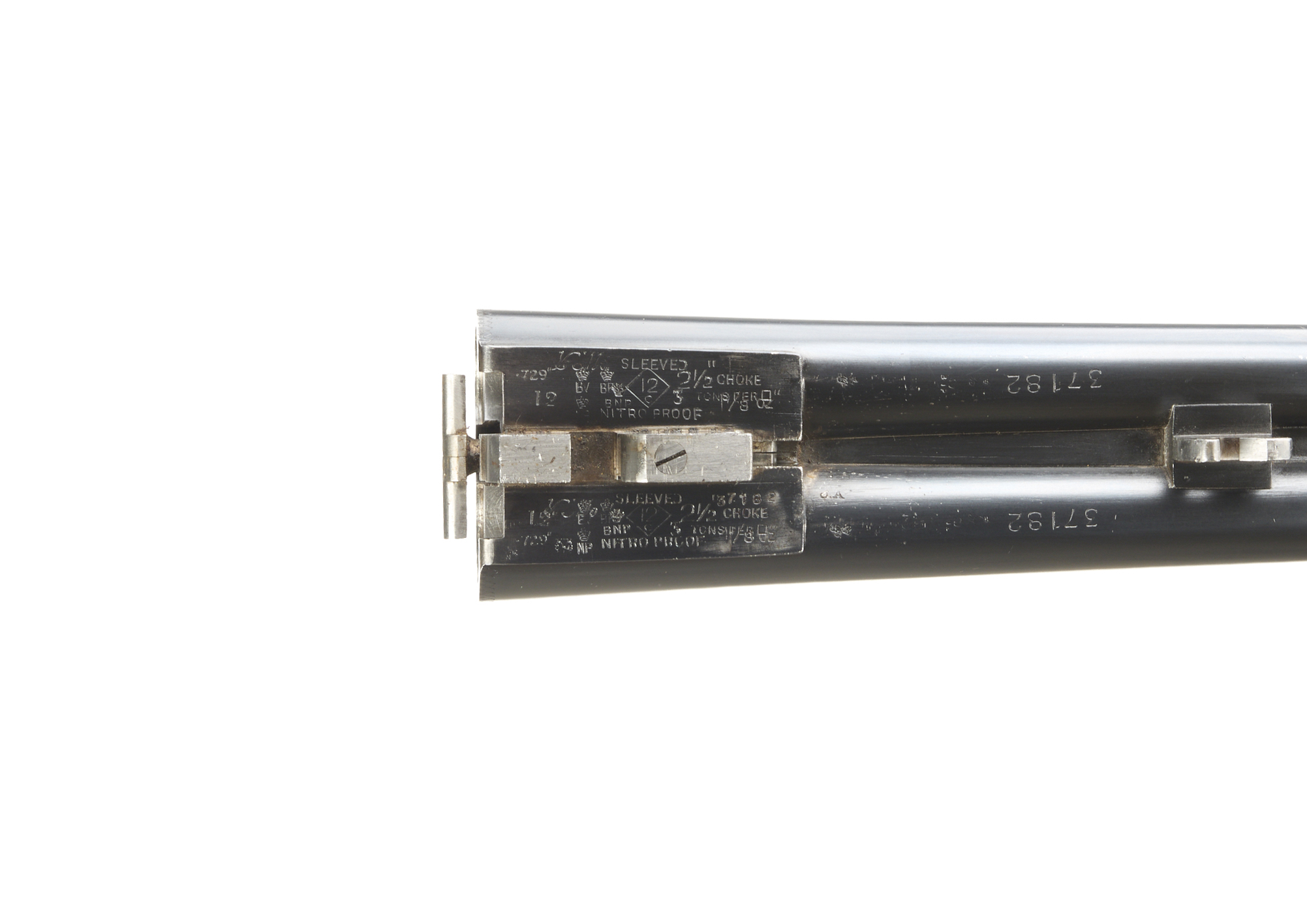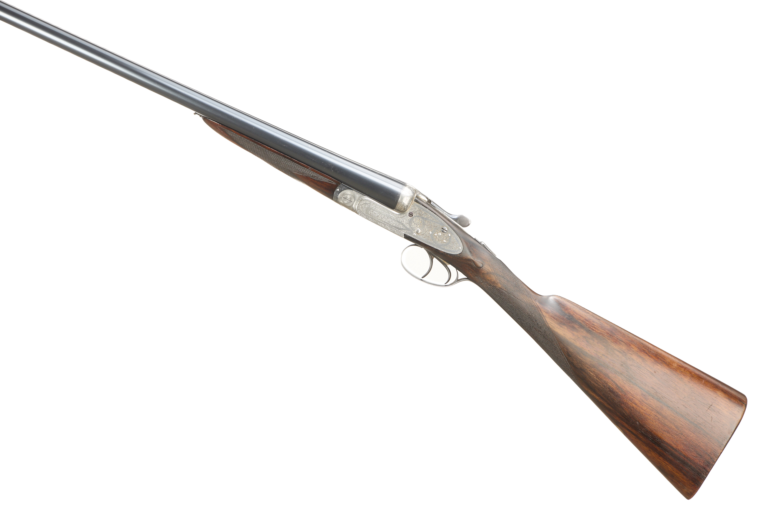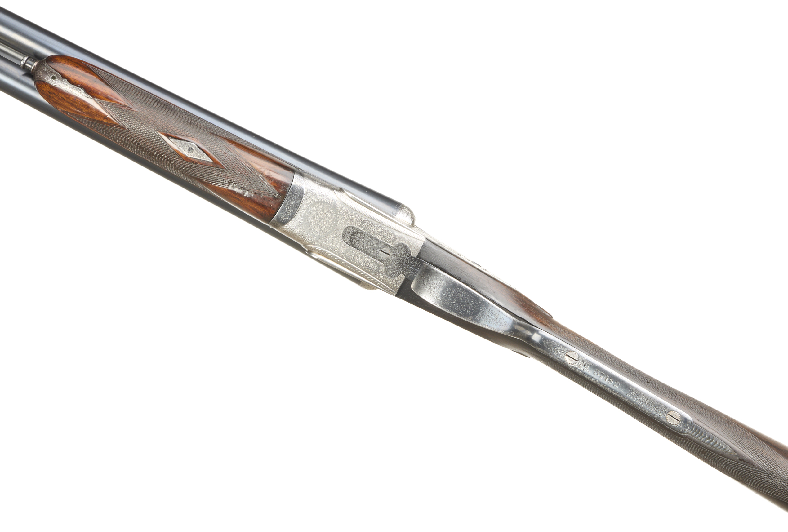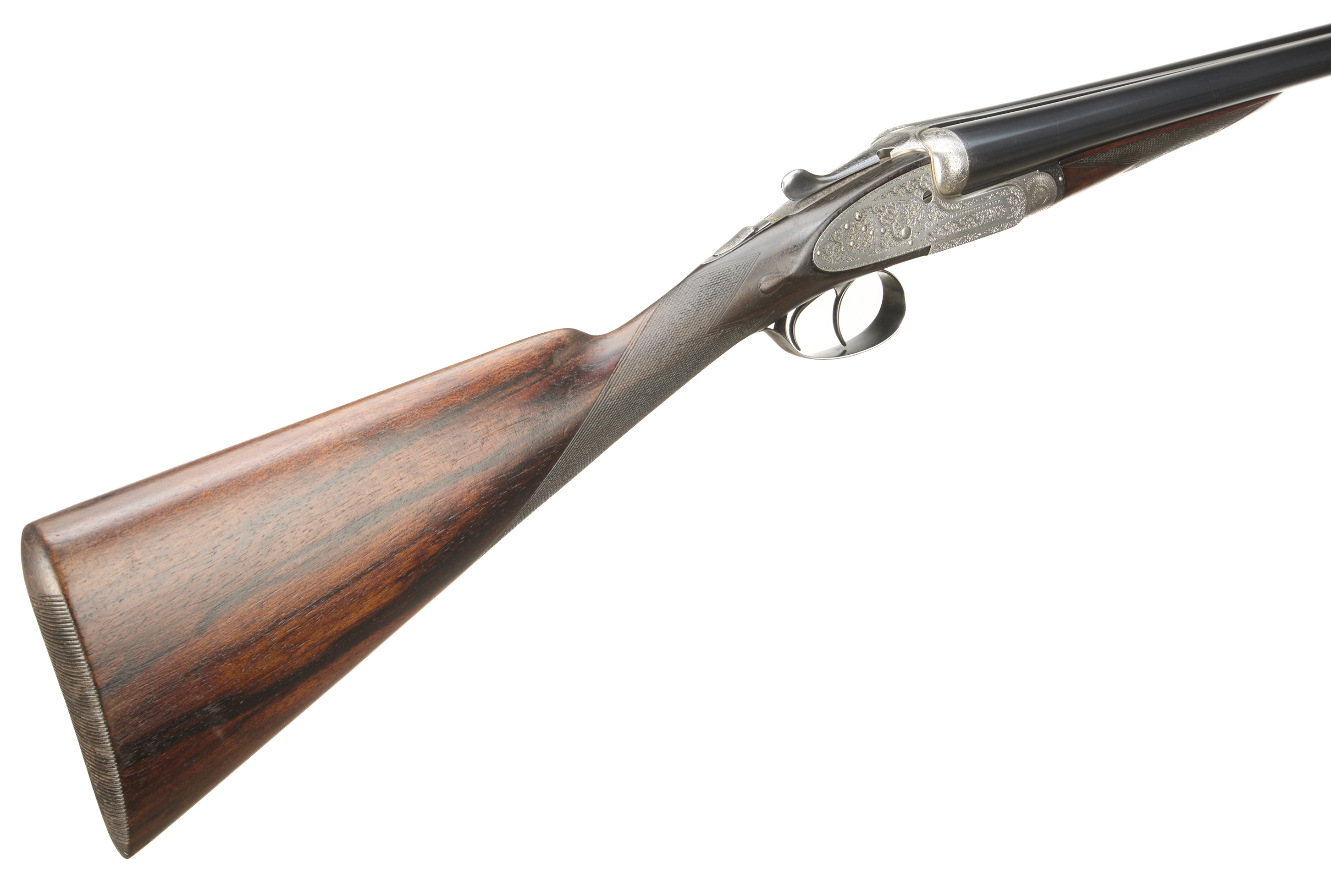 Ribbed butt, chequered straight grip and forend. Concave rib engraved ‘W. J. JEFFERY etc (worn)’. Top lever, automatic safety with ‘SAFE’ inlaid in gold. The action engraved with bouquets and extensive acanthus scrolling. Ca 1930s. Sleeved 1974.