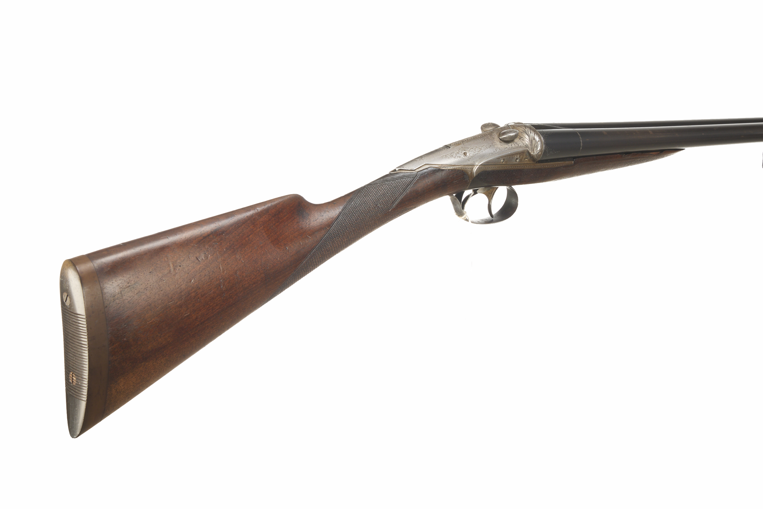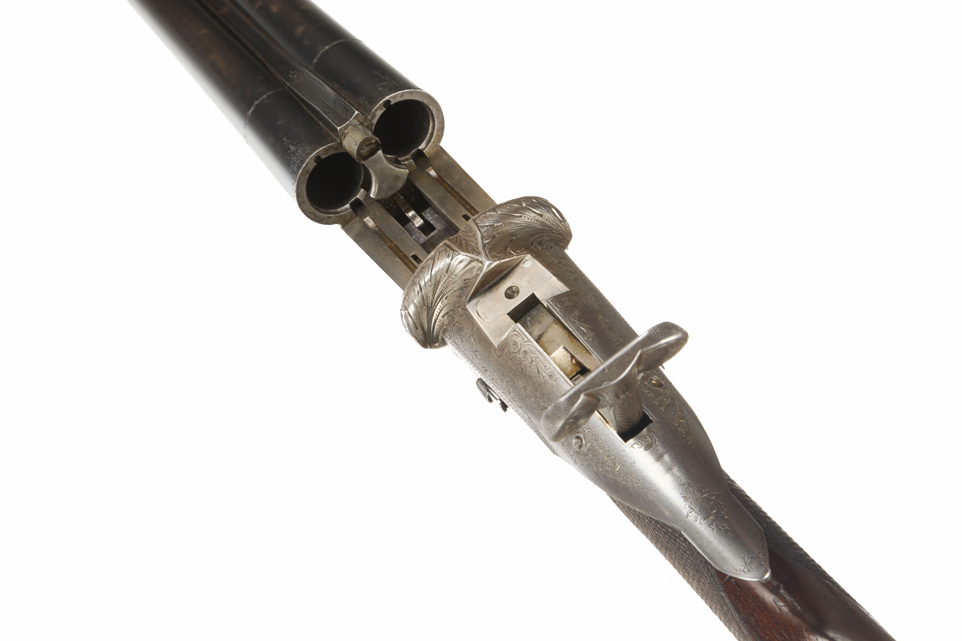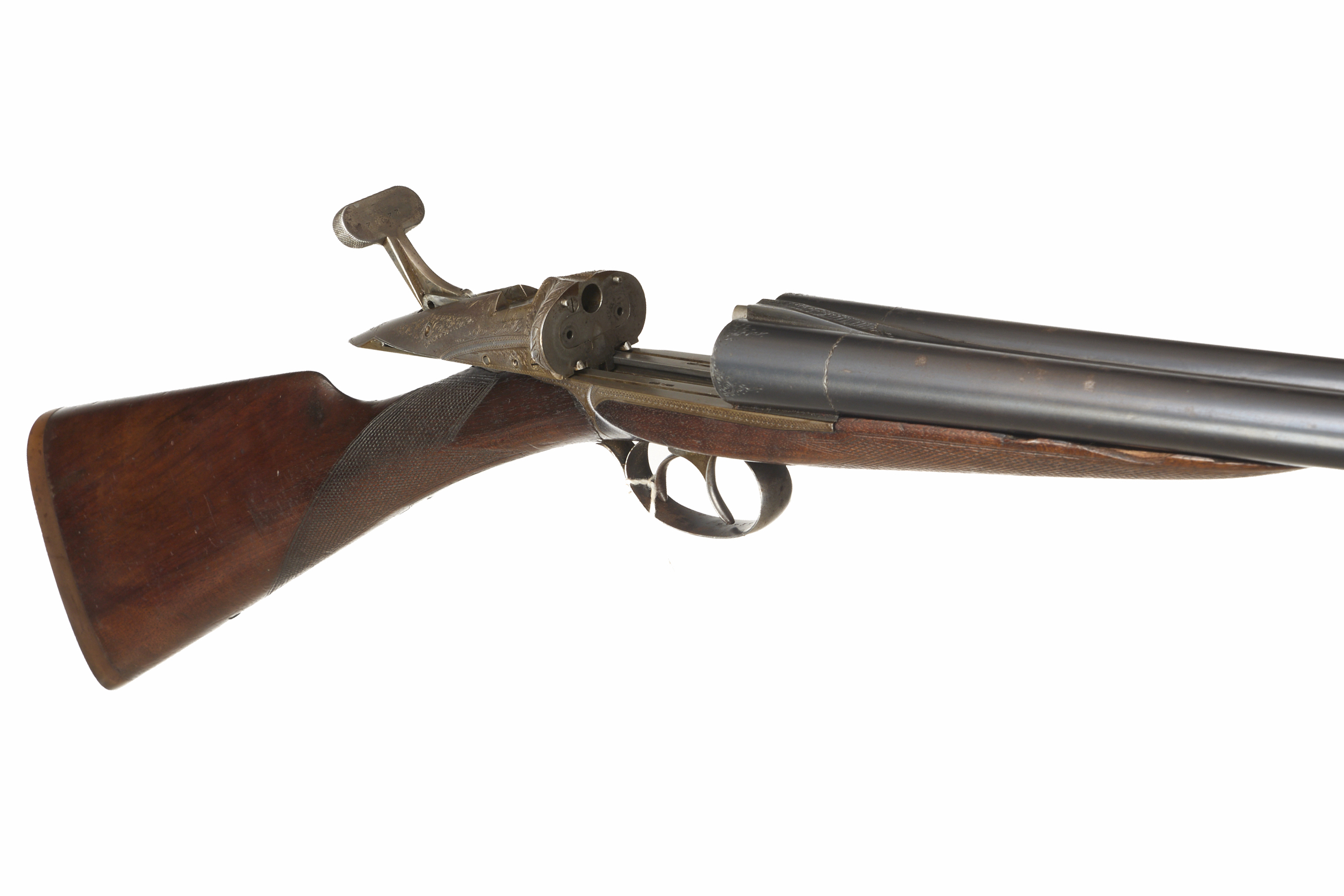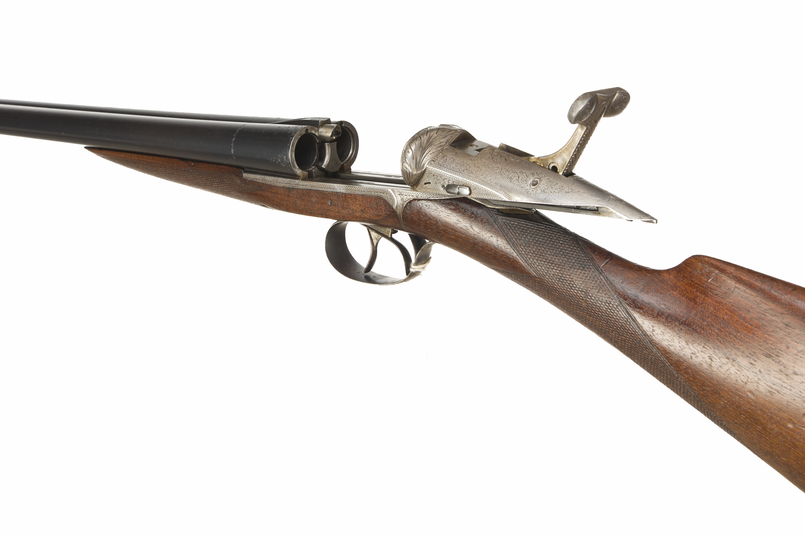 Ribbed ebonite butt, single piece stock, chequered straight grip and forend. Sling attachment to barrels, sunken, concave rib. Sliding breech, side safety. Deep, wonderfully carved acanthus leaves to fences, acanthus scrolling to lever and action.