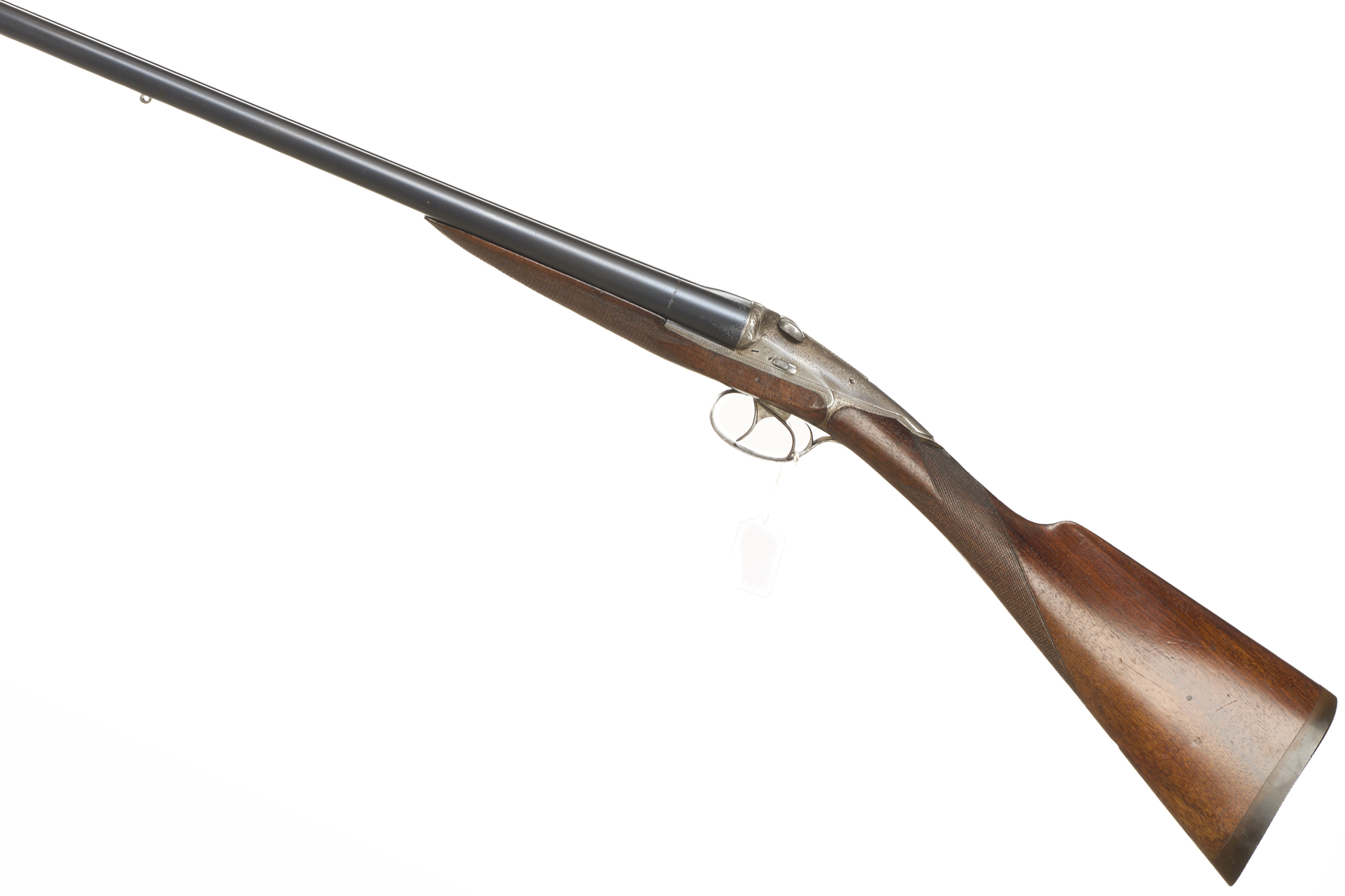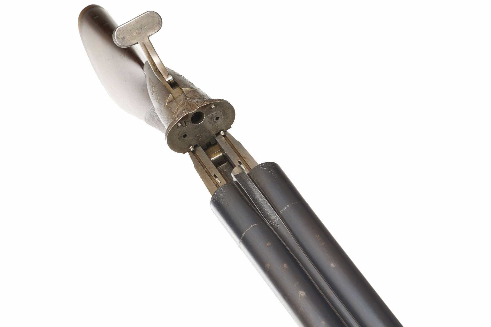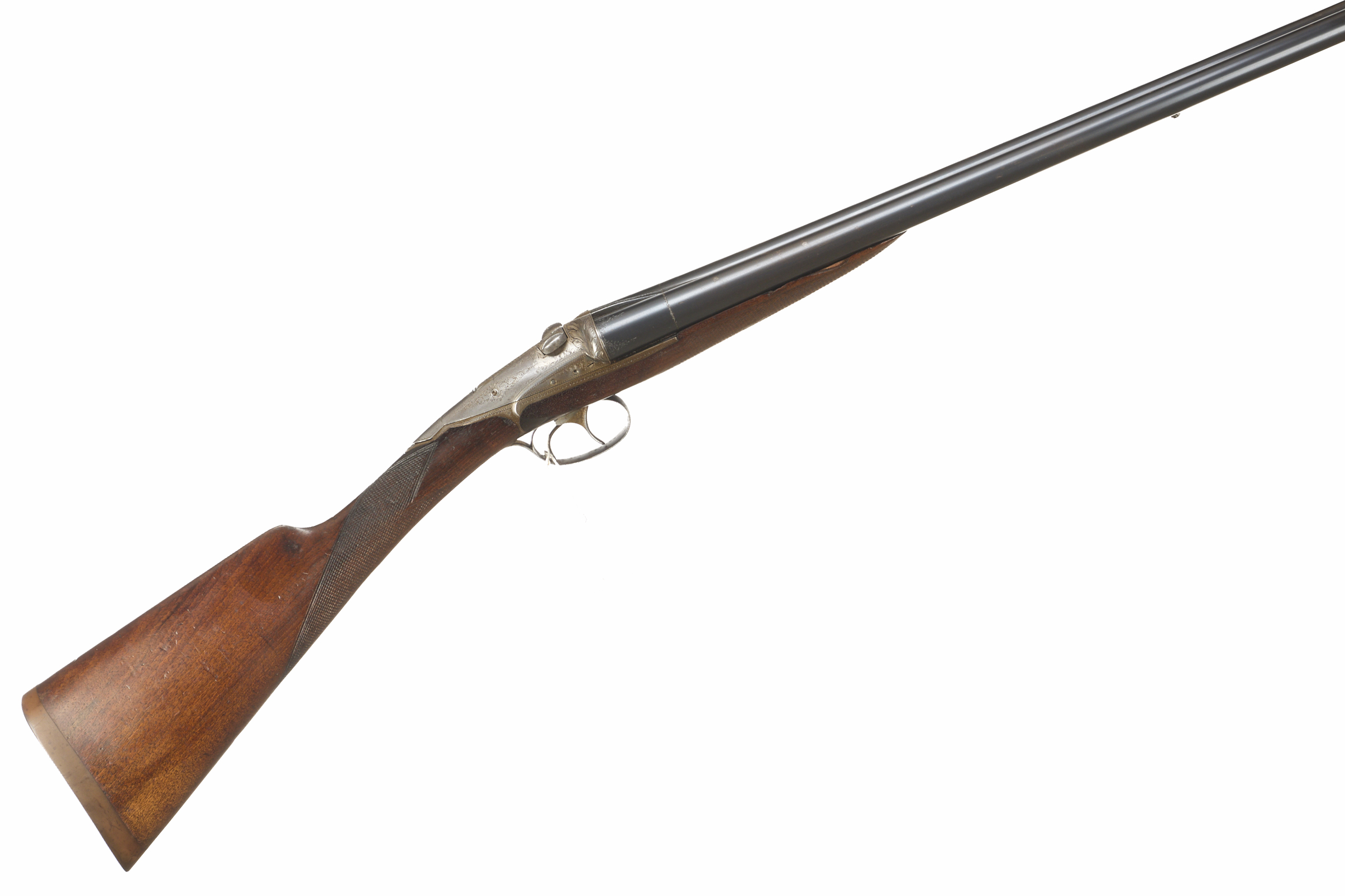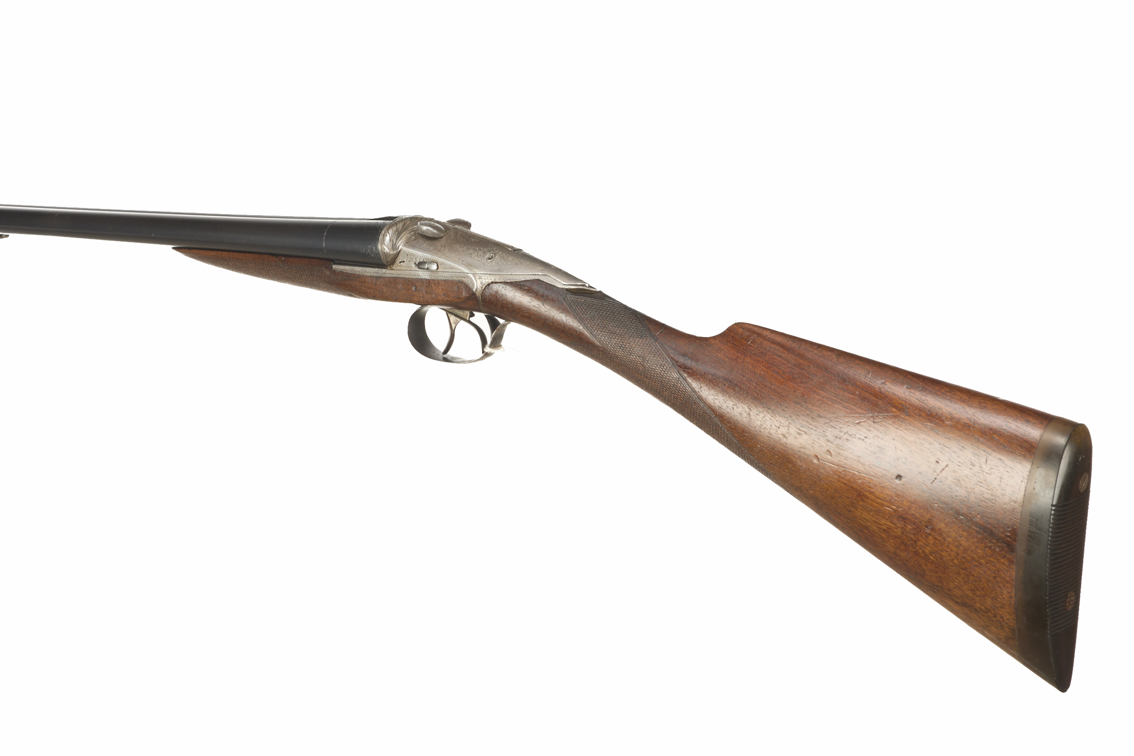 Ribbed ebonite butt, single piece stock, chequered straight grip and forend. Sling attachment to barrels, sunken, concave rib. Sliding breech, side safety. Deep, wonderfully carved acanthus leaves to fences, acanthus scrolling to lever and action.