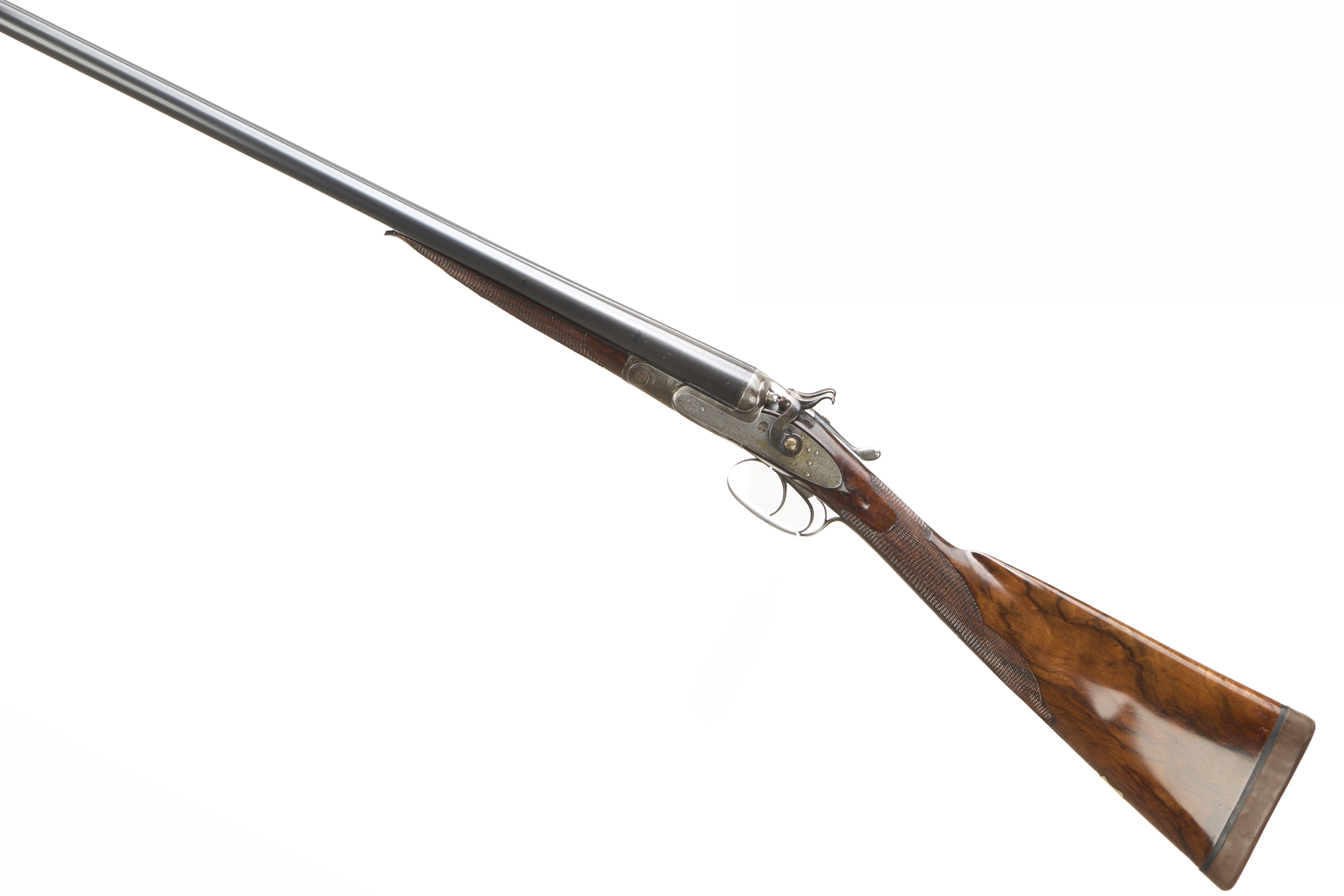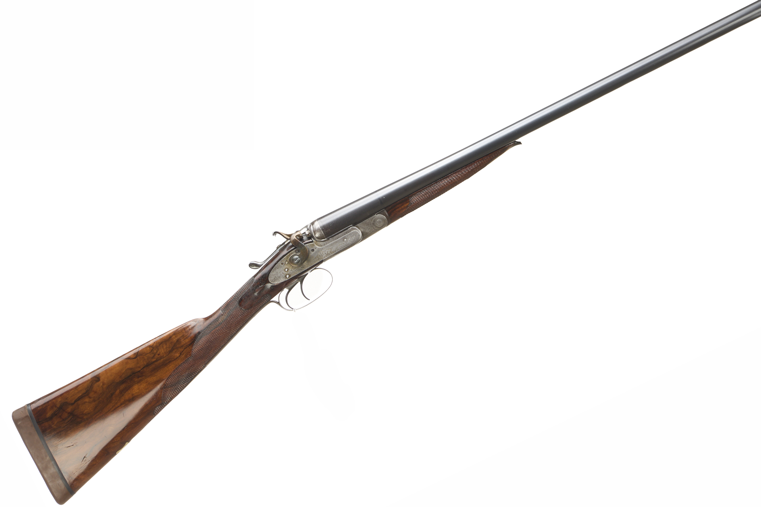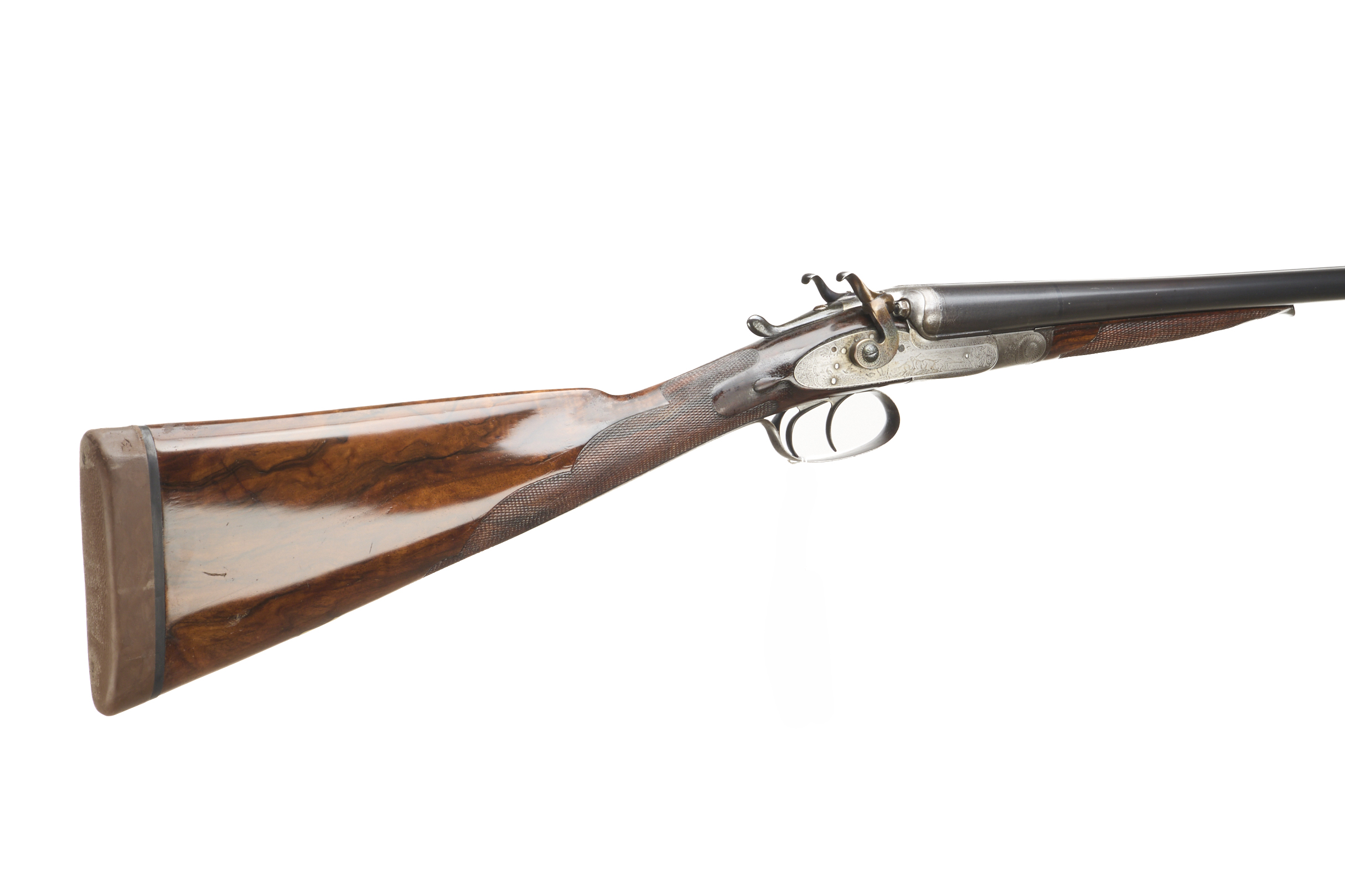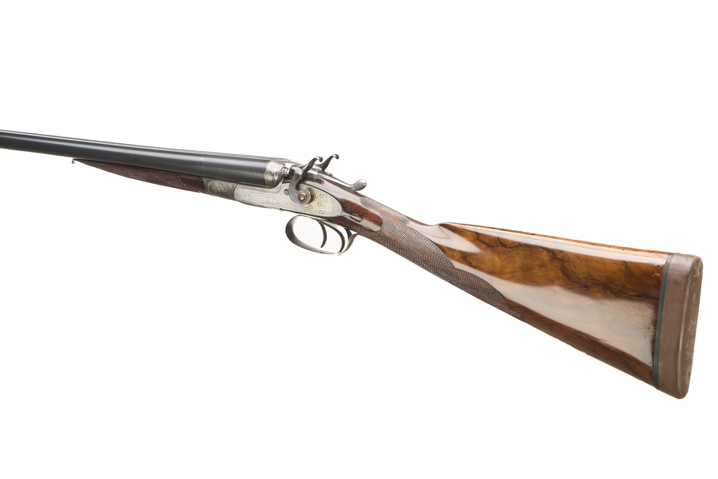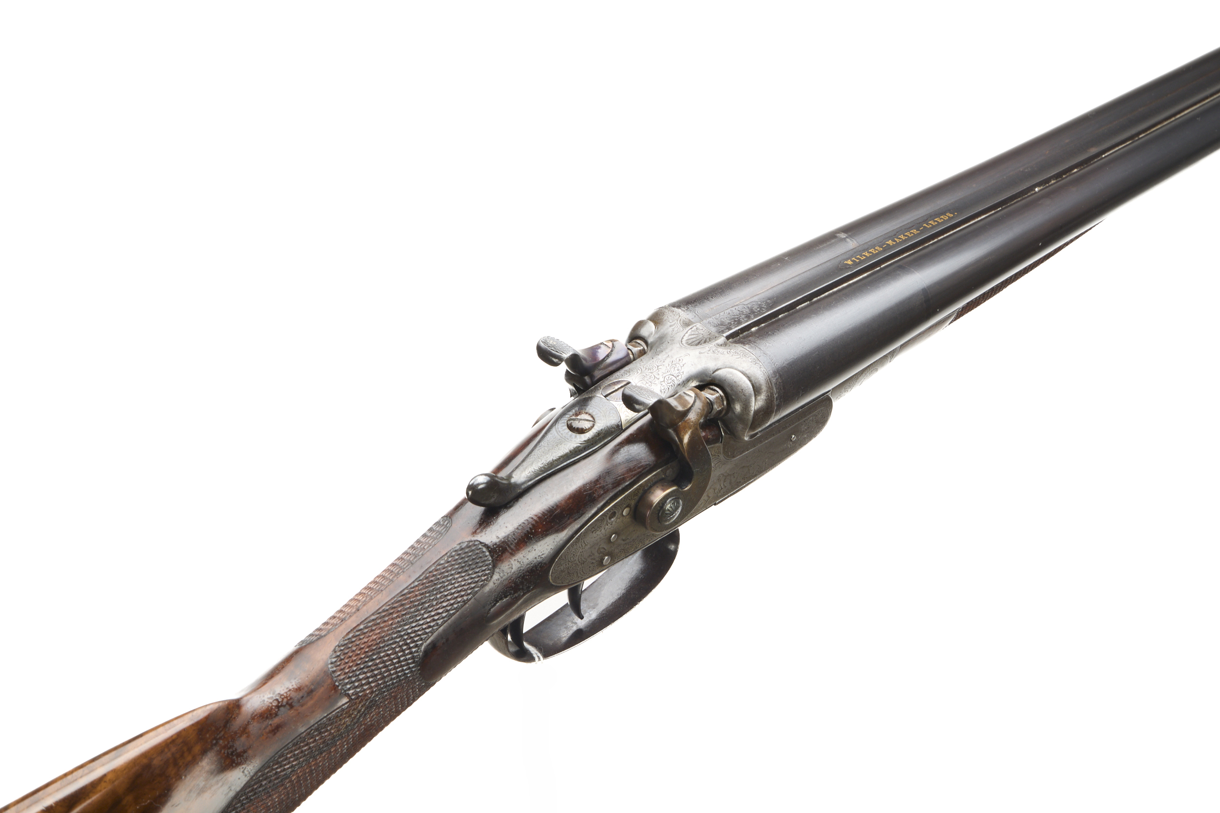 Cushioned rubber butt pad, chequered straight grip and forend. The rib engraved and inlaid "WILKES – MAKER – LEEDS". Hackett-type snap-on splinter forend with horn finial, non-rebounding hares’ ears hammers, top lever. The action delicately adorned with hunting scenes and acanthus highlights. Pre 1895 (early records lost).