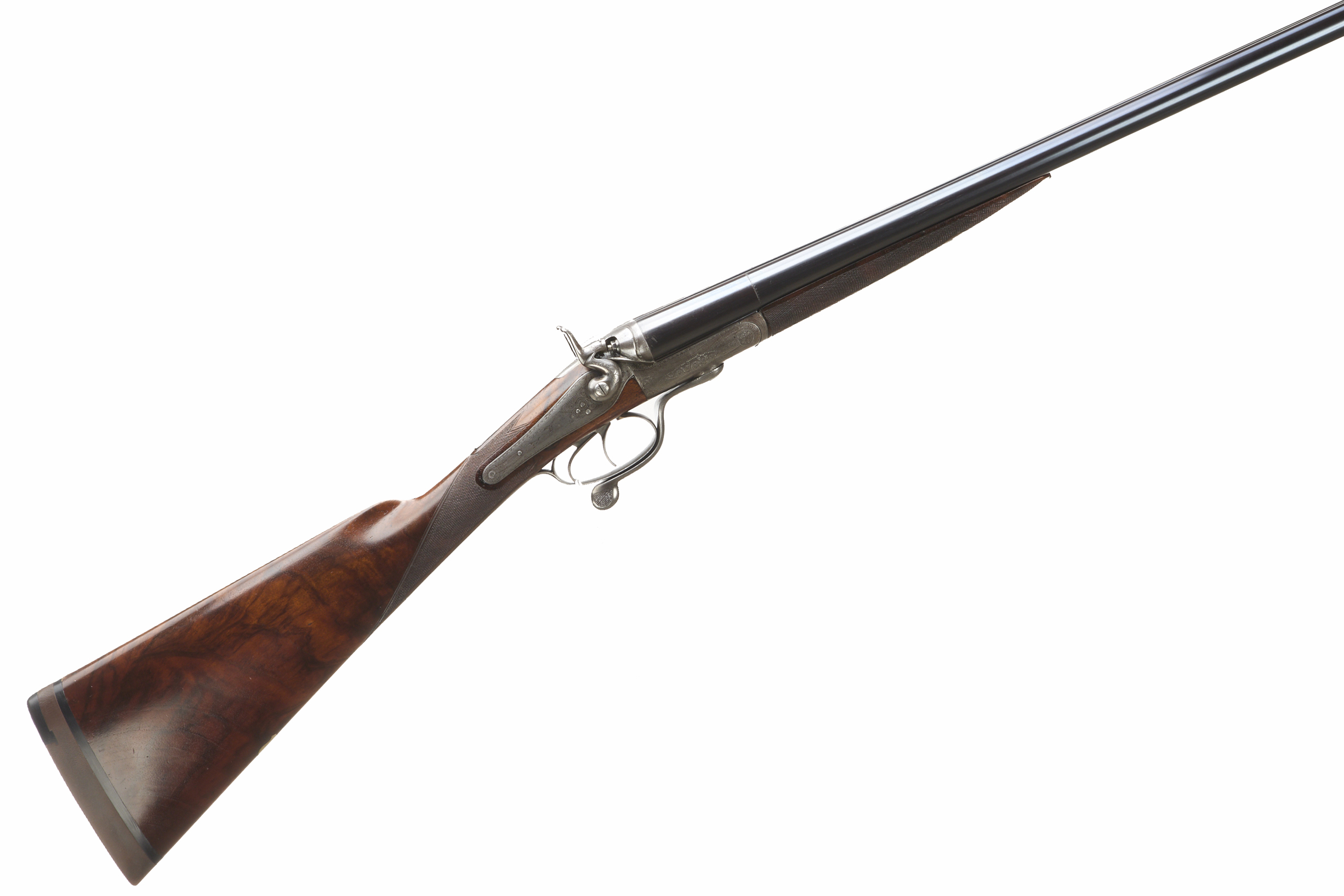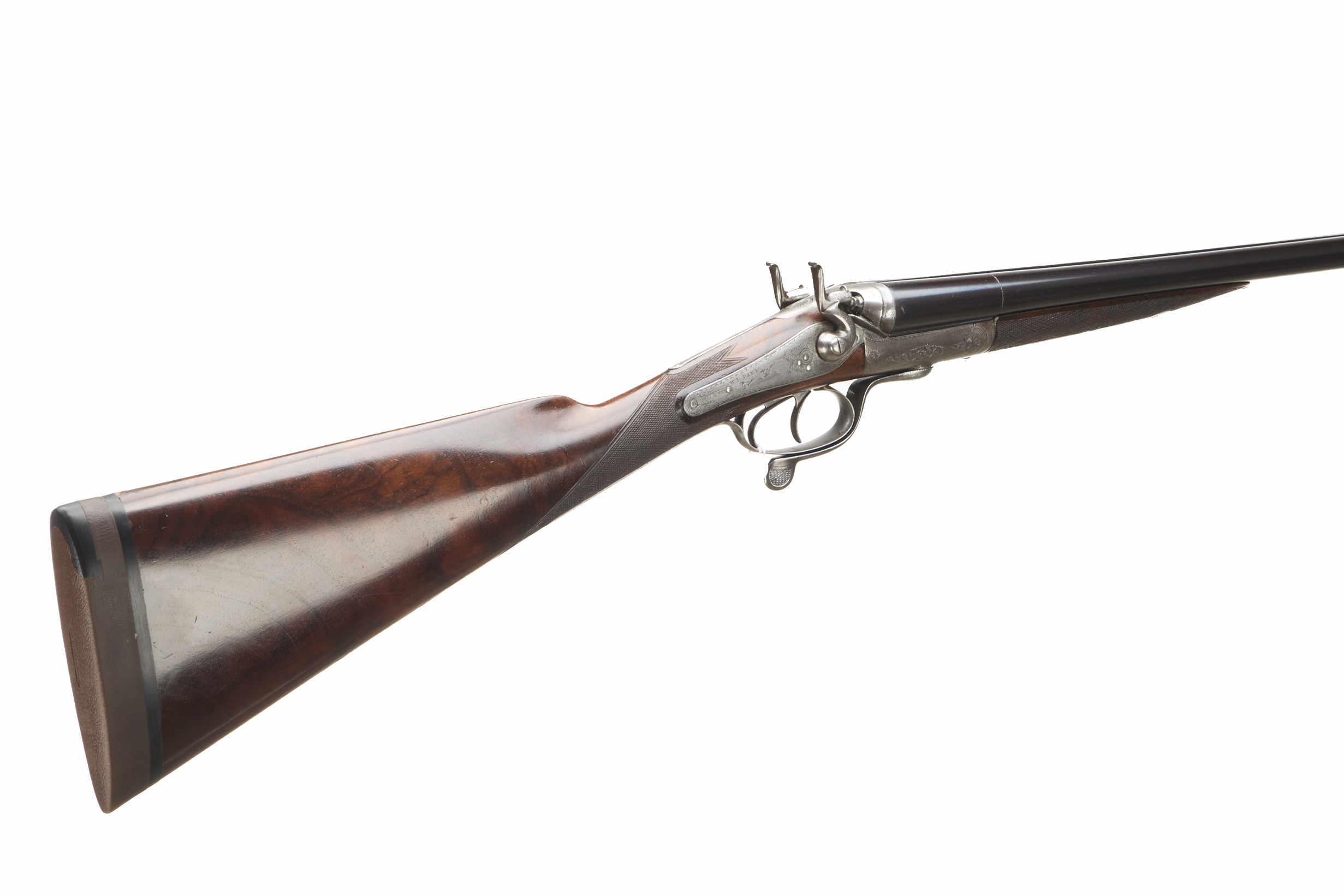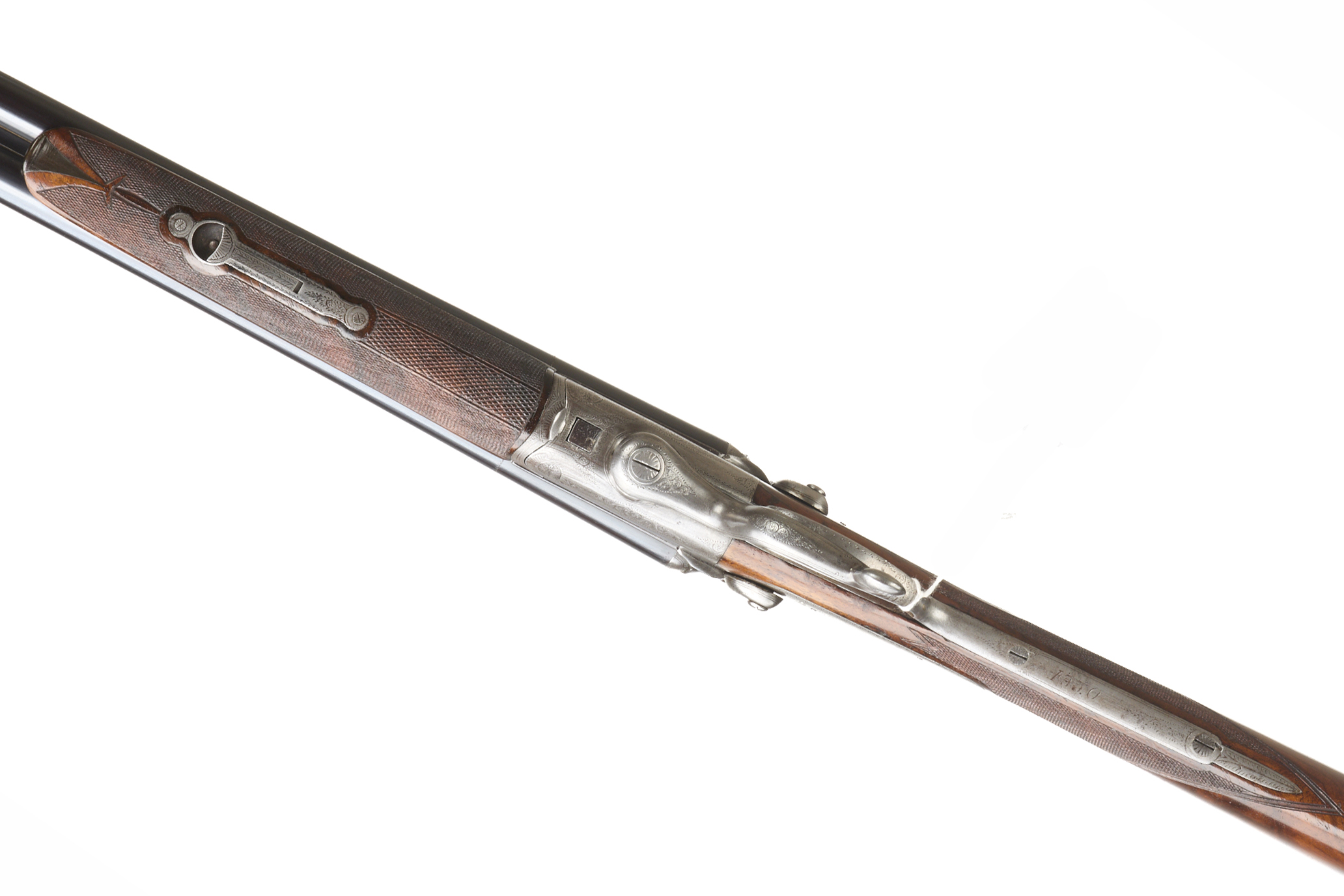 Cushioned rubber butt pad, chequered straight grip and forend. The rib engraved and inlaid ‘WR PAPE. NEWCASTLE ON TYNE. INVENTOR OF THE CHOKE BORE’. Hackett-type snap-on splinter forend with horn finial, Jones’ rotary underlever, back action, non-rebounding hares’ ears hammers, top lever. The action delicately adorned with hunting scenes, acanthus highlights and scroll border. For 1887. Sleeved 1978 & 2010.