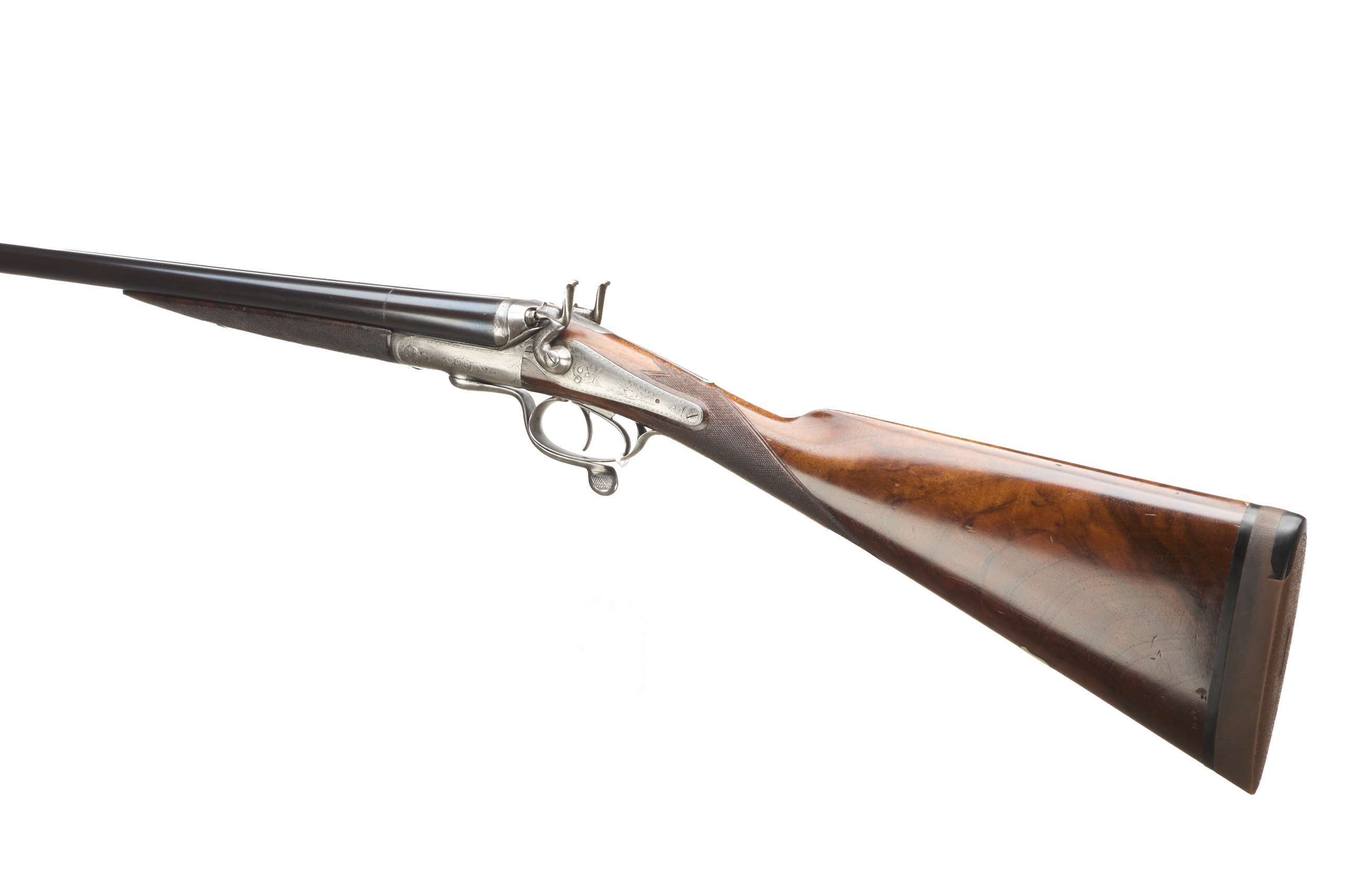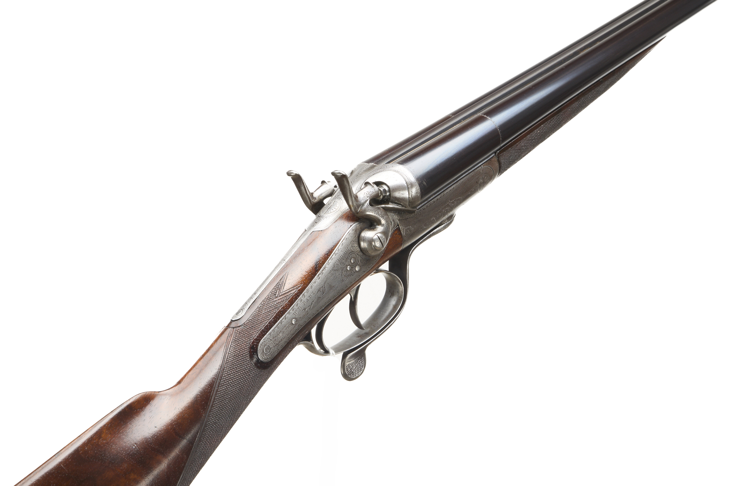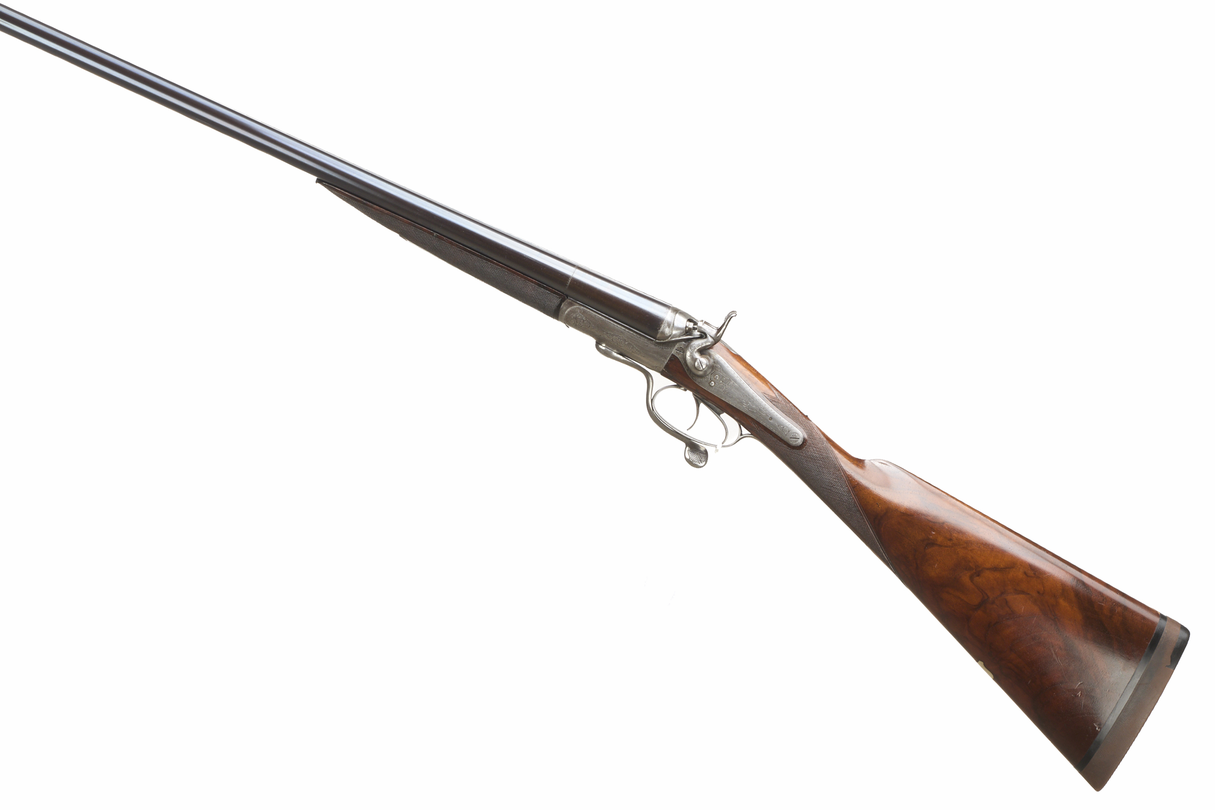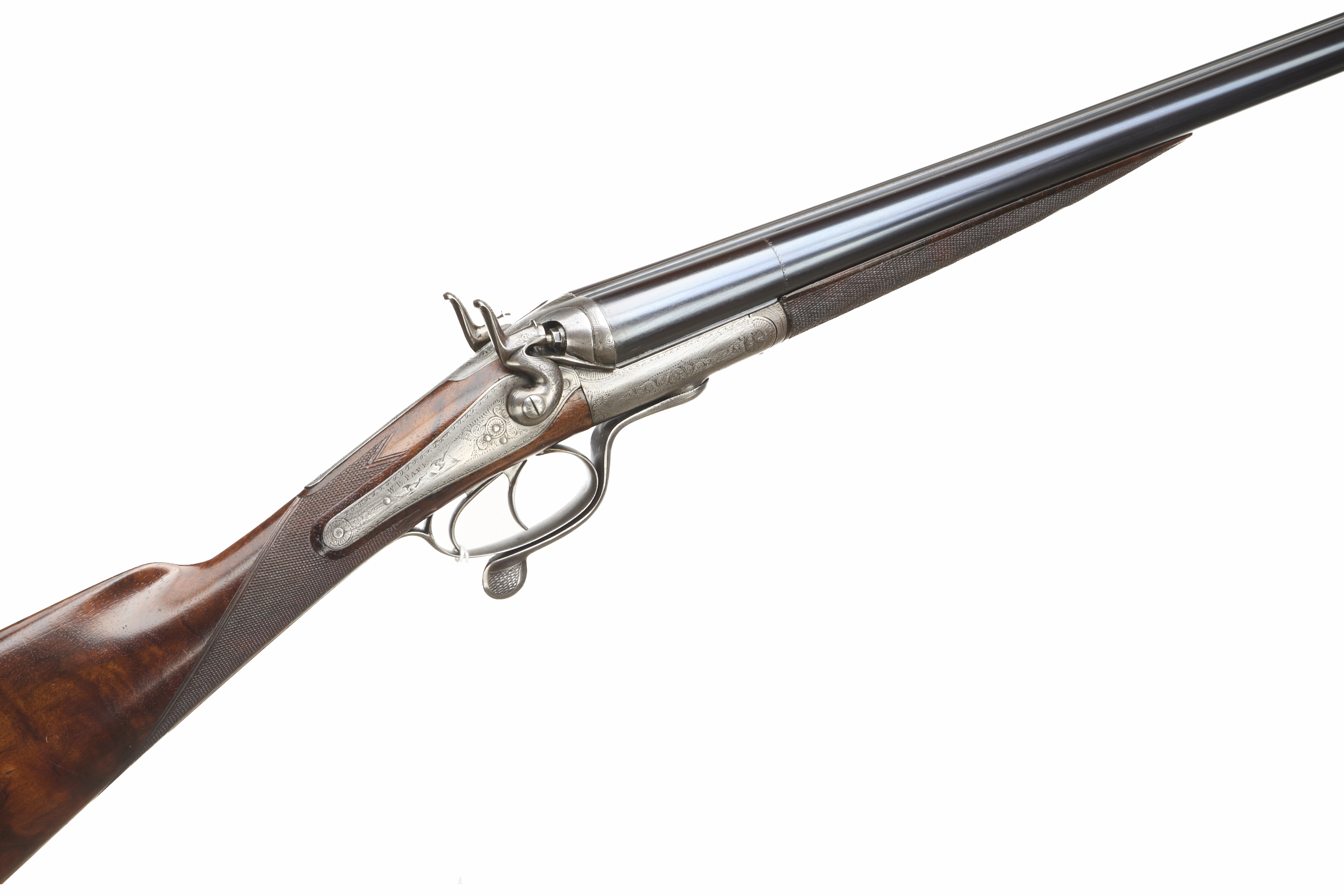 Cushioned rubber butt pad, chequered straight grip and forend. The rib engraved and inlaid ‘WR PAPE. NEWCASTLE ON TYNE. INVENTOR OF THE CHOKE BORE’. Hackett-type snap-on splinter forend with horn finial, Jones’ rotary underlever, back action, non-rebounding hares’ ears hammers, top lever. The action delicately adorned with hunting scenes, acanthus highlights and scroll border. For 1887. Sleeved 1978 & 2010.