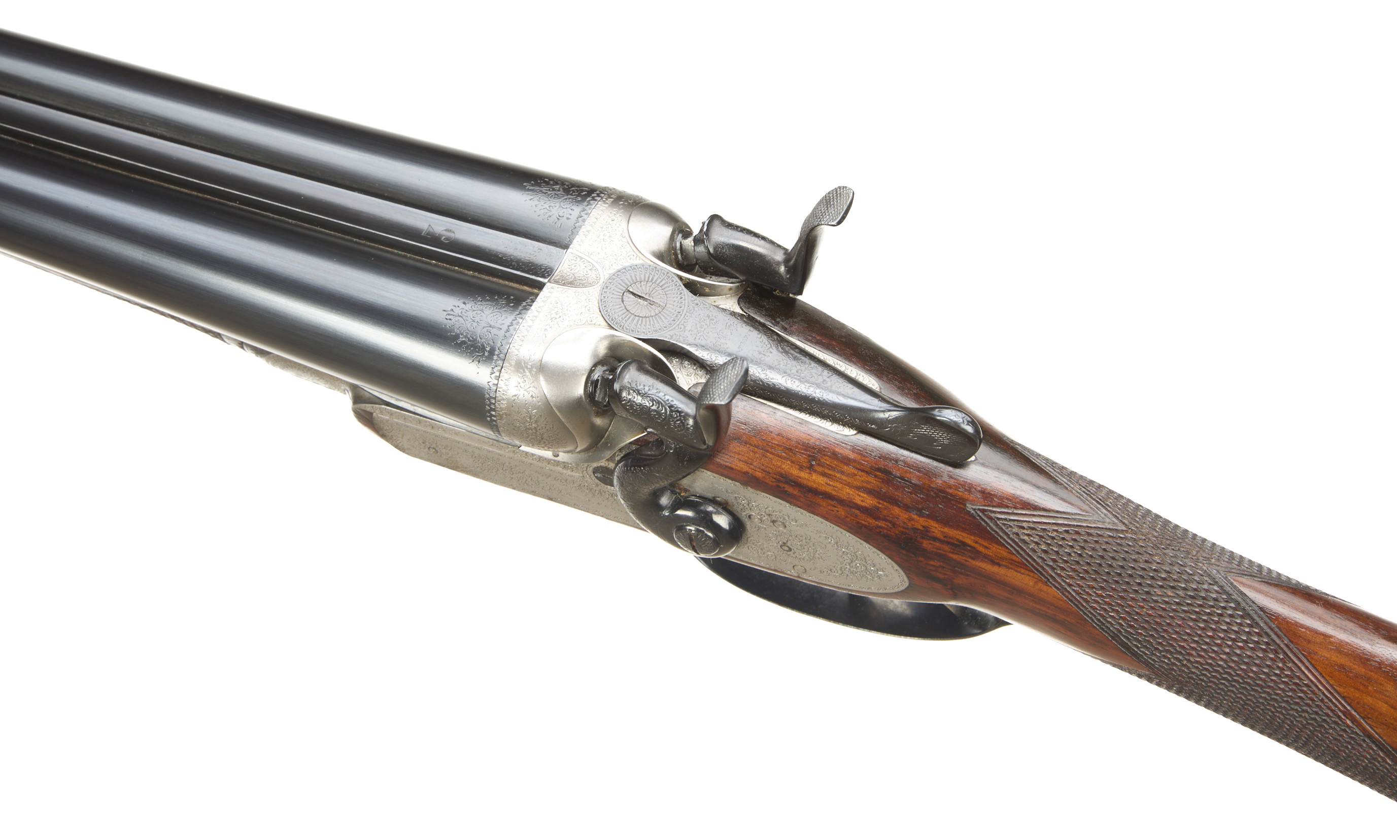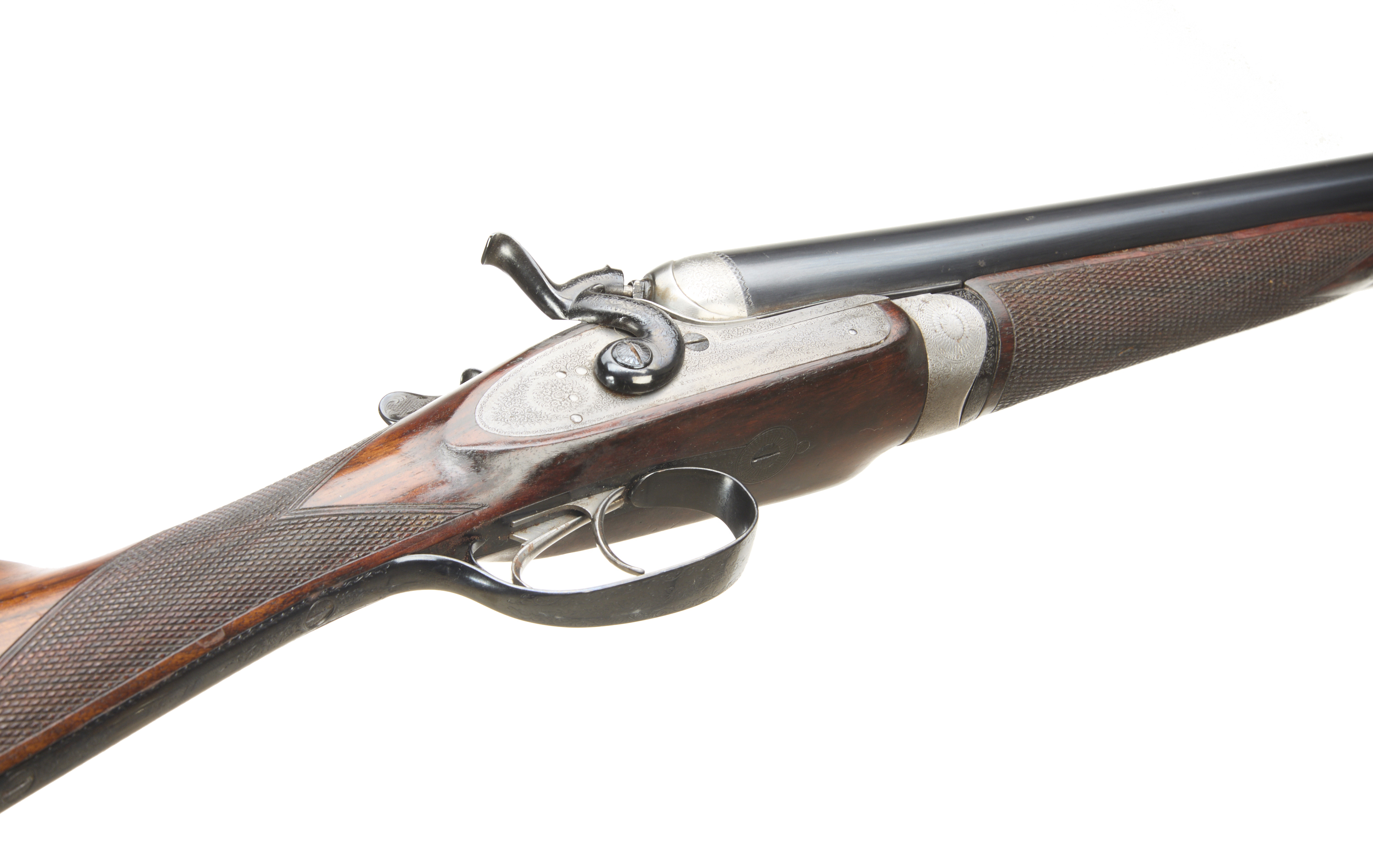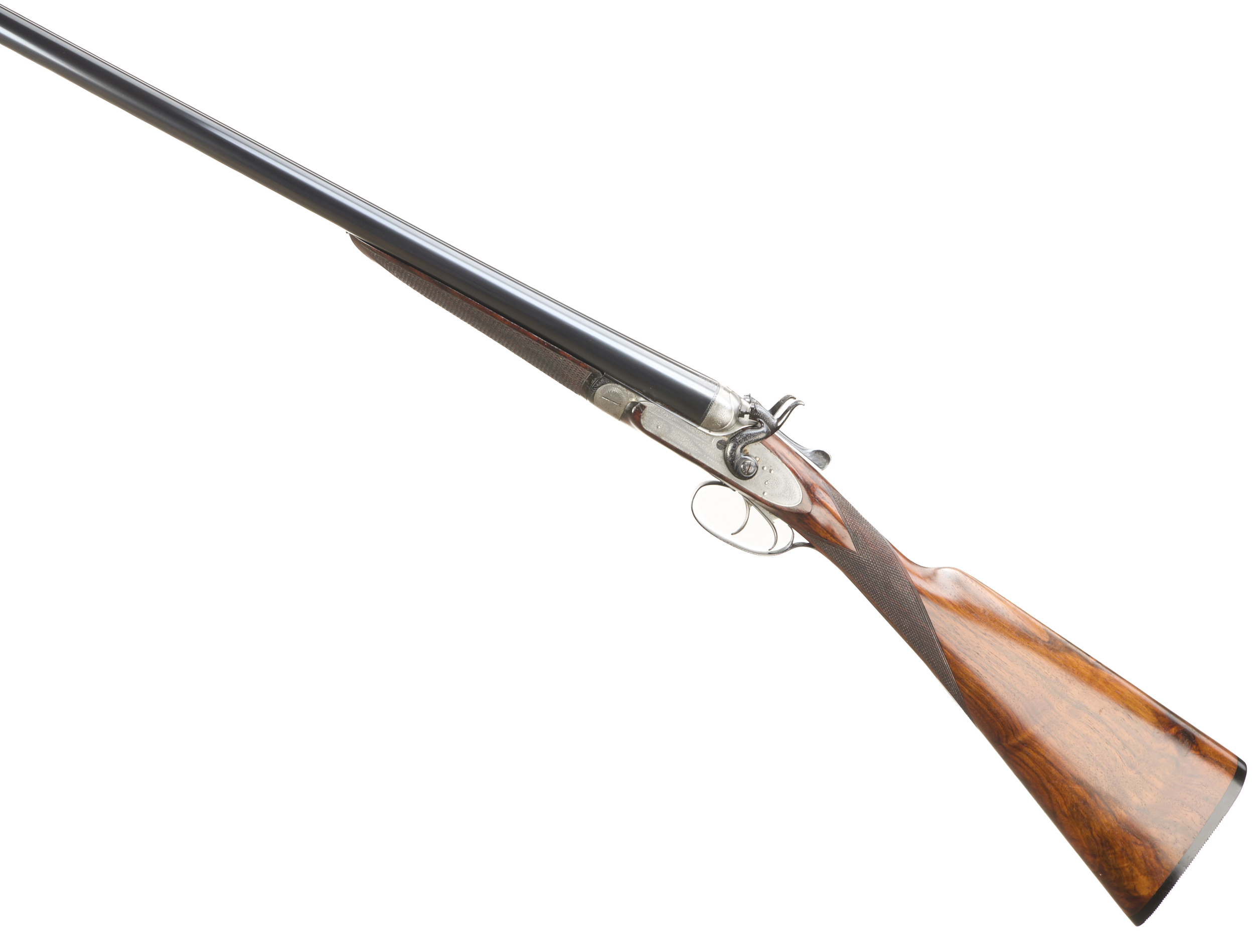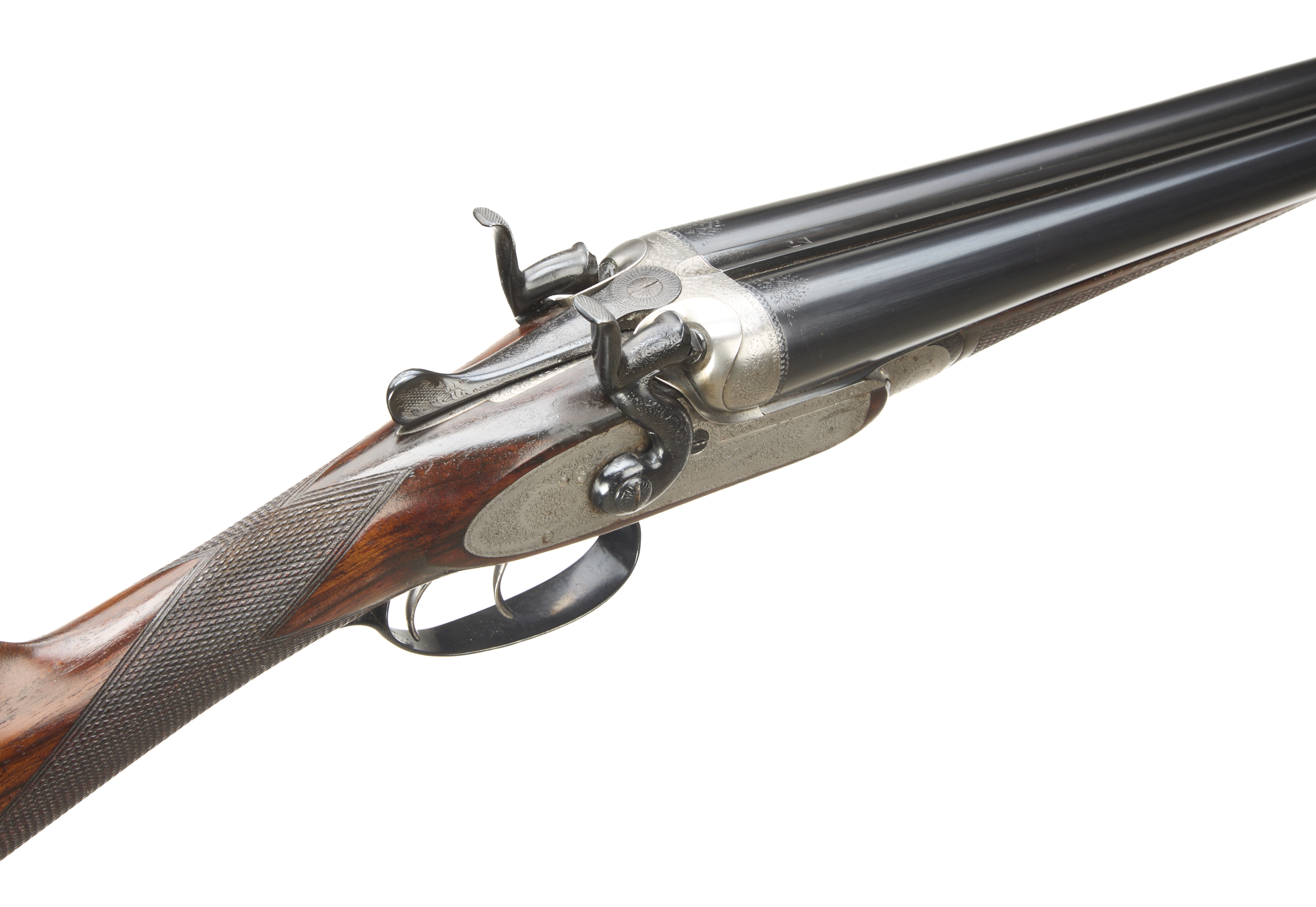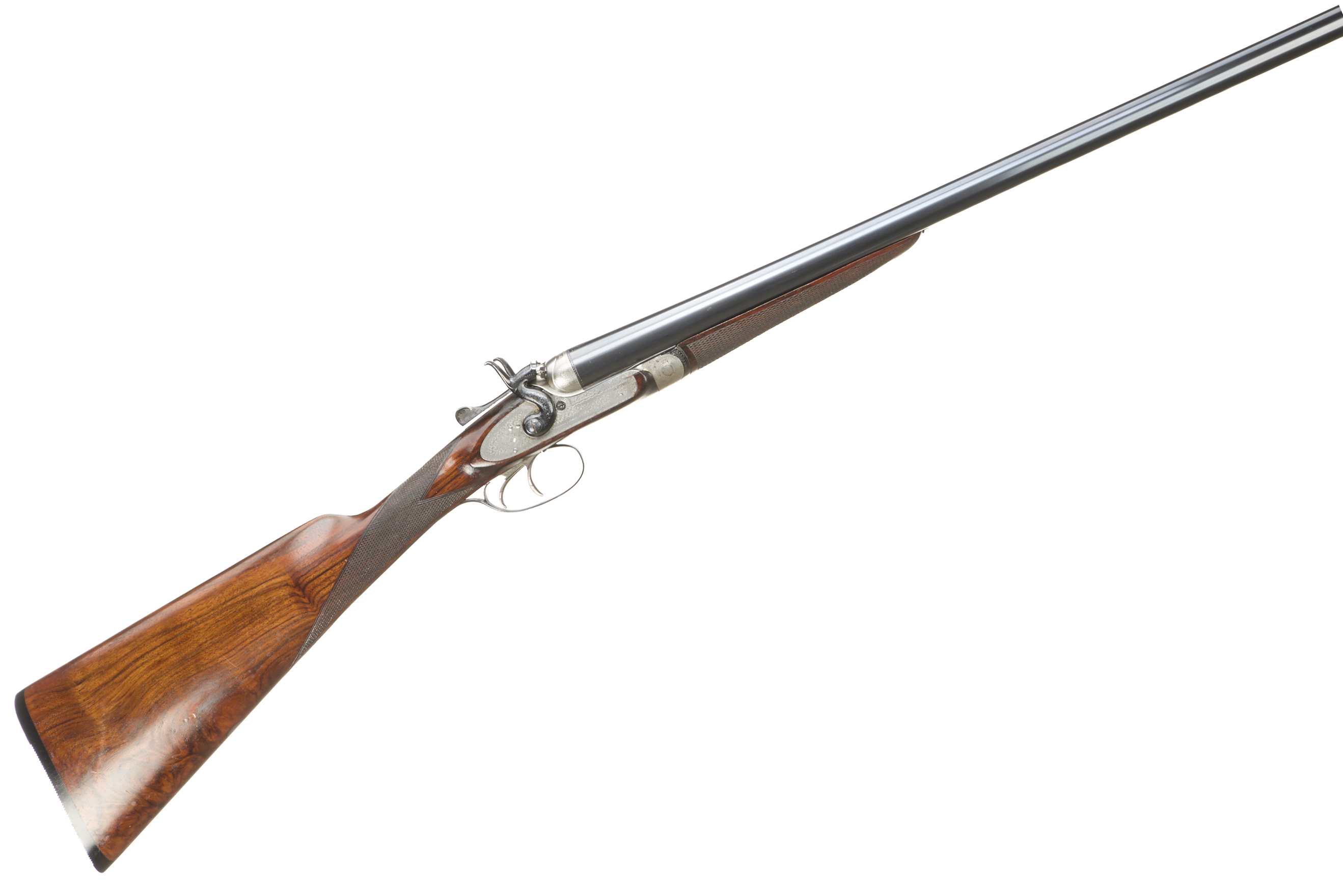 Ribbed, ebonite butt pad, chequered straight grip and forend. Cast off approx 3/8". The rib engraved ‘3’ with floral embellishments to the breech ends. Treble-grip action, lightly carved percussion fences, rebounding hares ears hammers, top lever. Fine border and acanthus scroll engraving with floral bouquets. Sleeved 1978. For 1883.