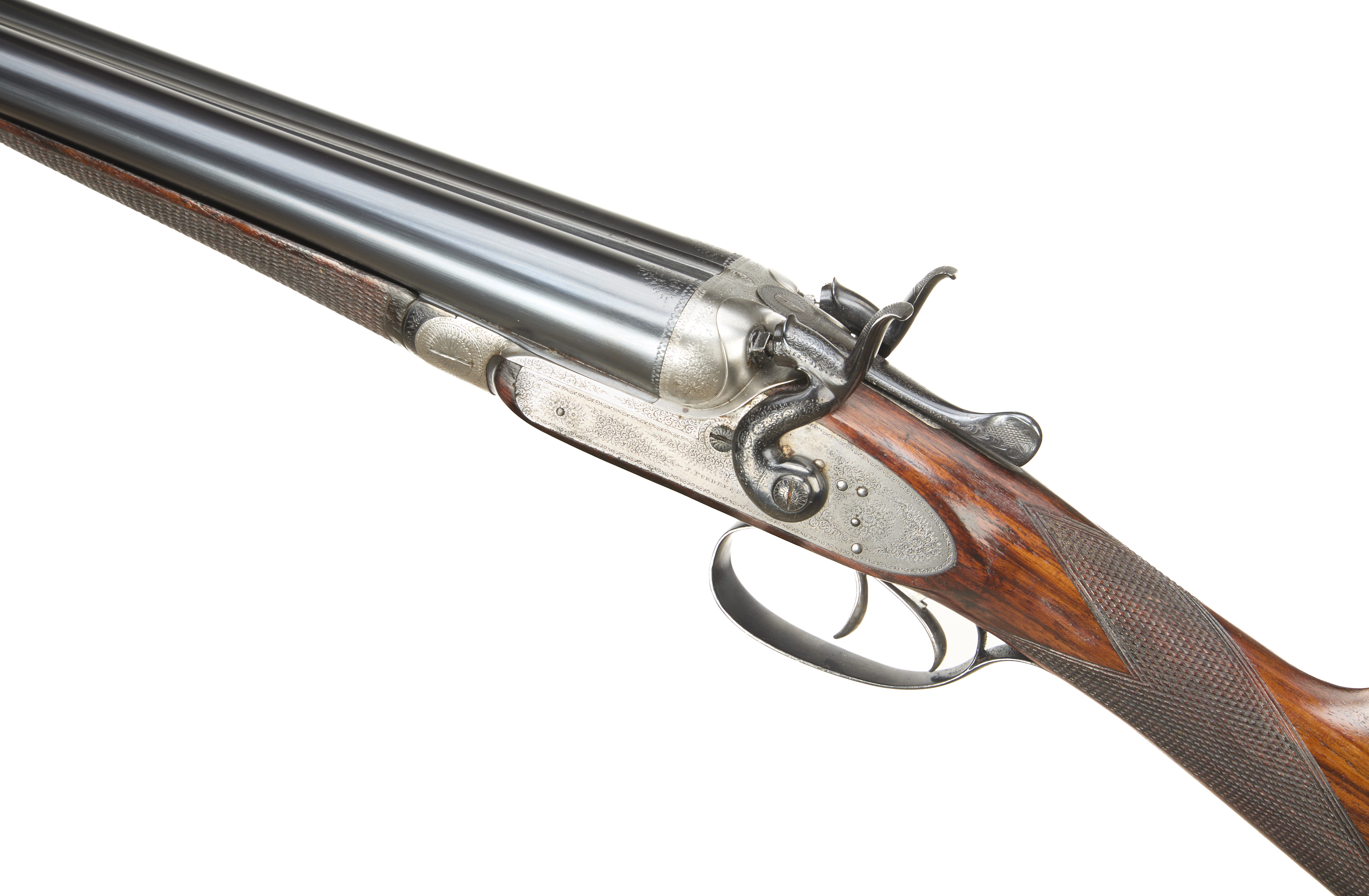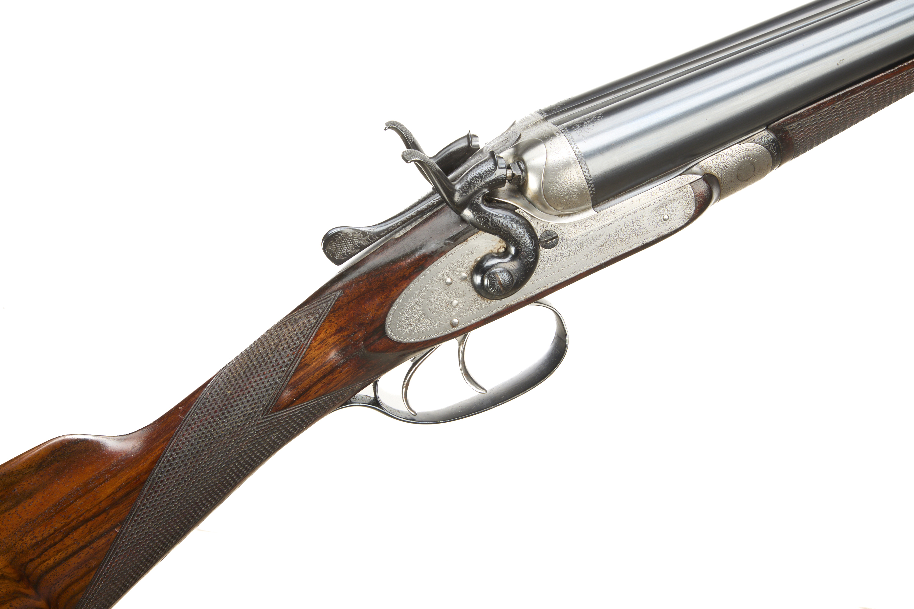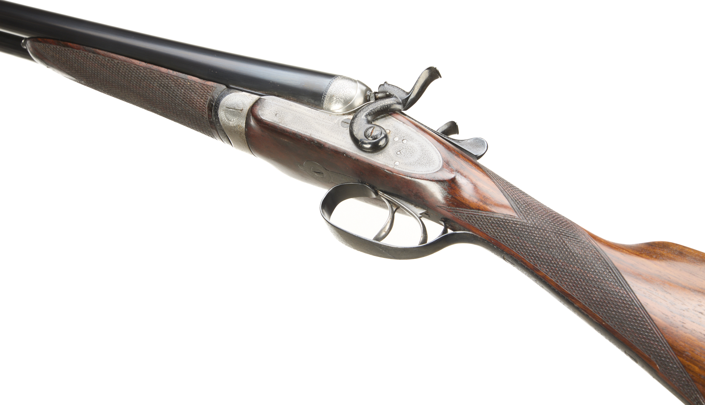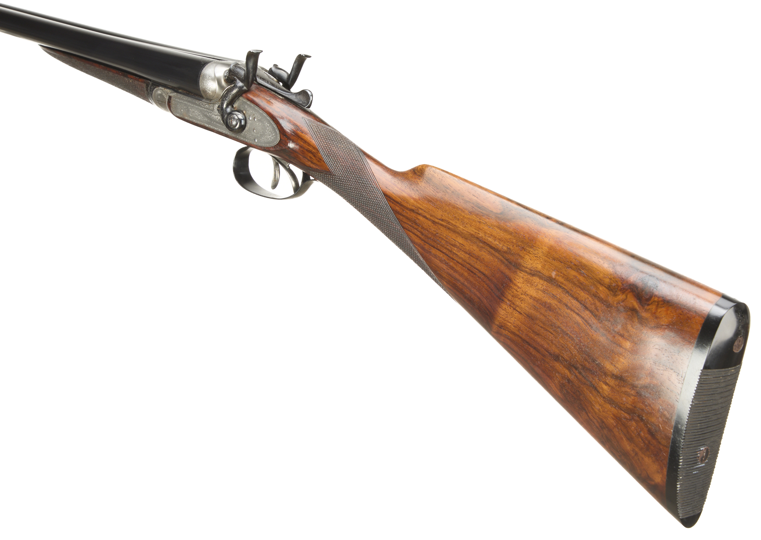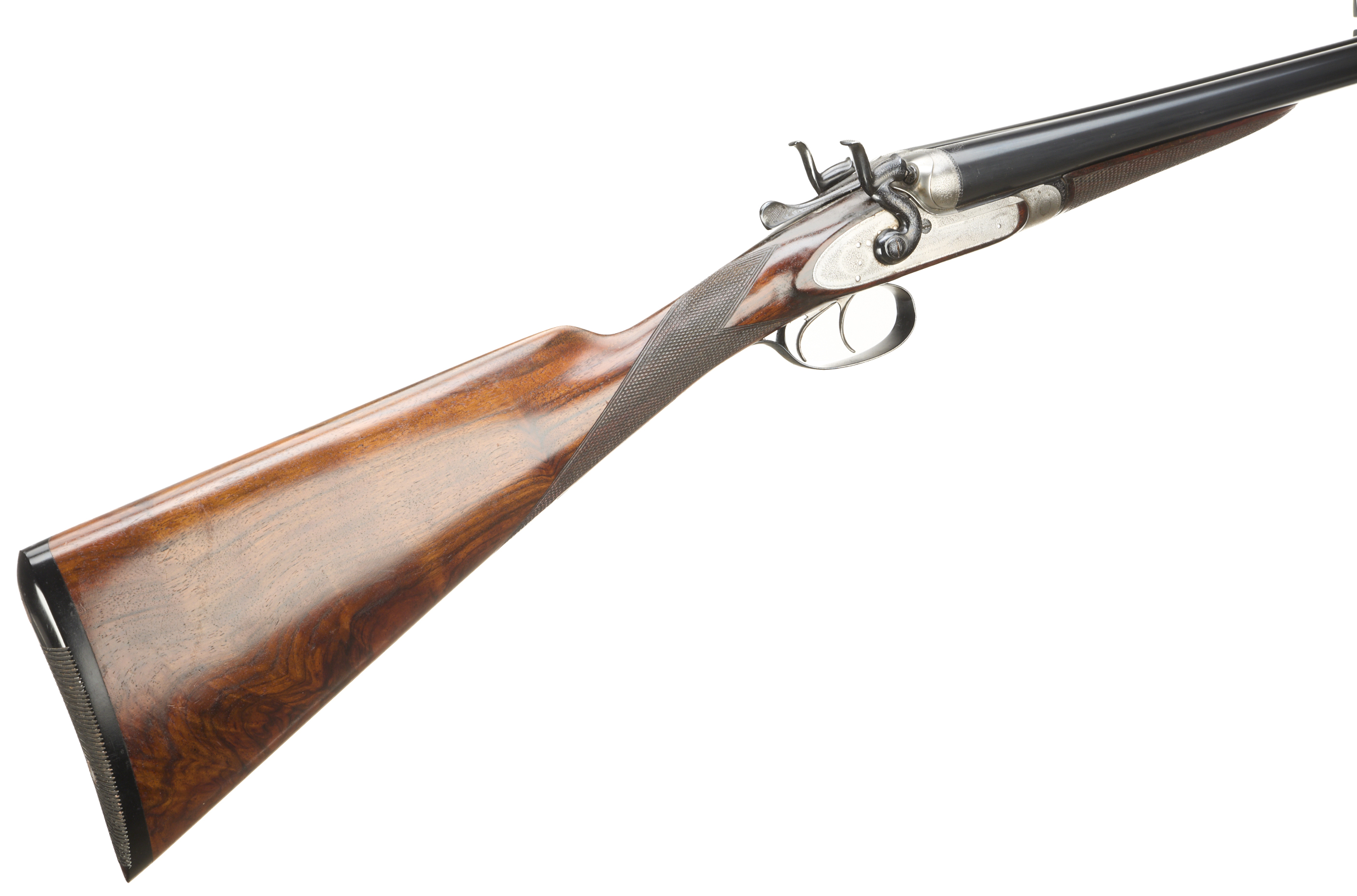 Ribbed, ebonite butt pad, chequered straight grip and forend. Cast off approx 3/8". The rib engraved ‘3’ with floral embellishments to the breech ends. Treble-grip action, lightly carved percussion fences, rebounding hares ears hammers, top lever. Fine border and acanthus scroll engraving with floral bouquets. Sleeved 1978. For 1883.