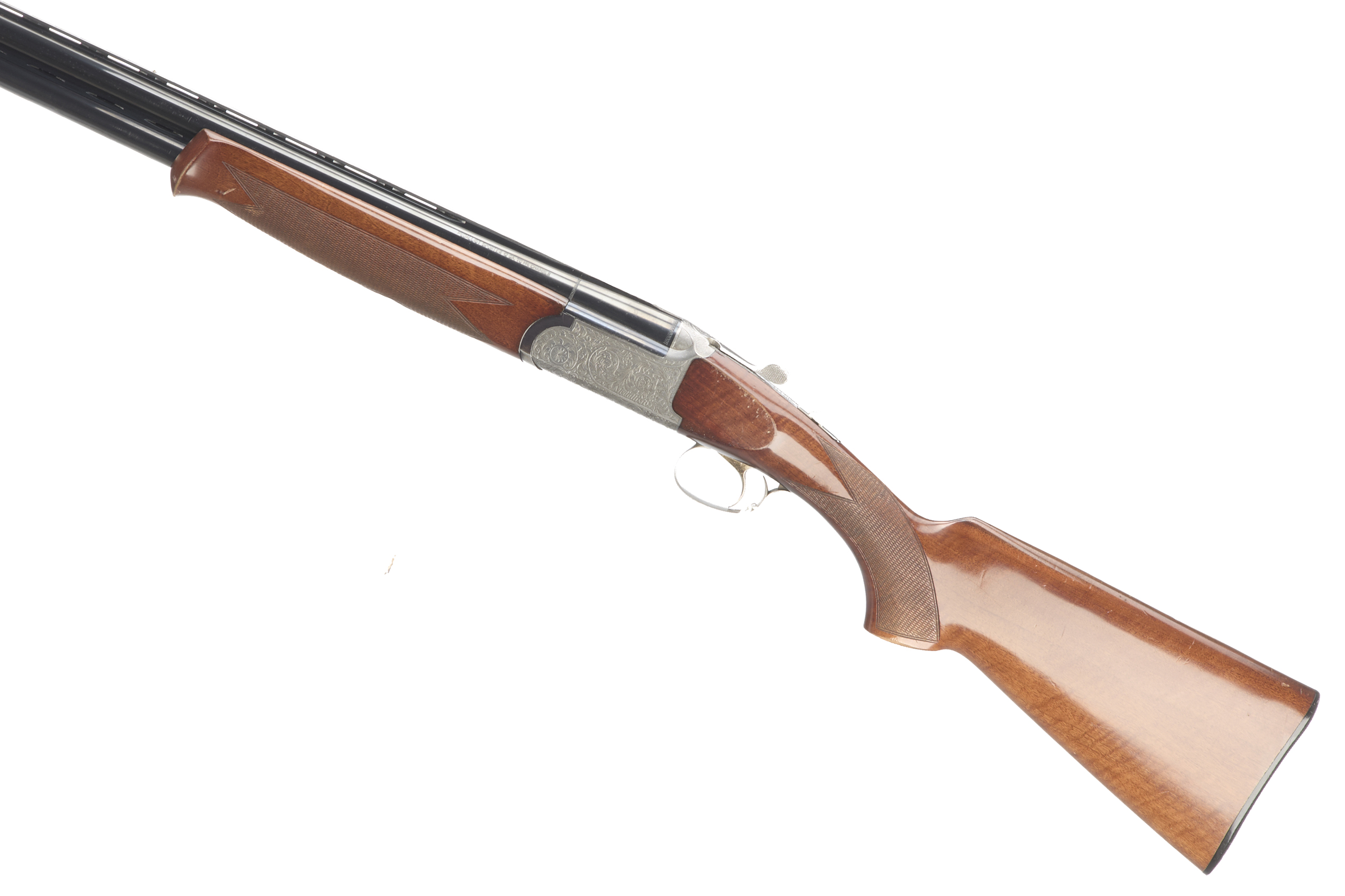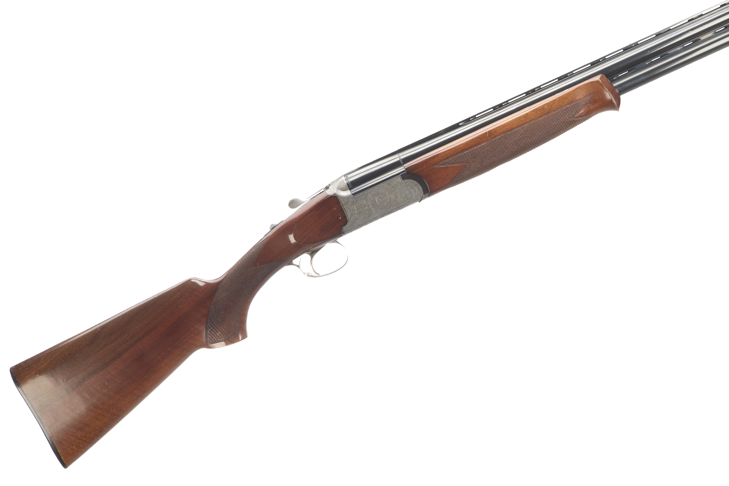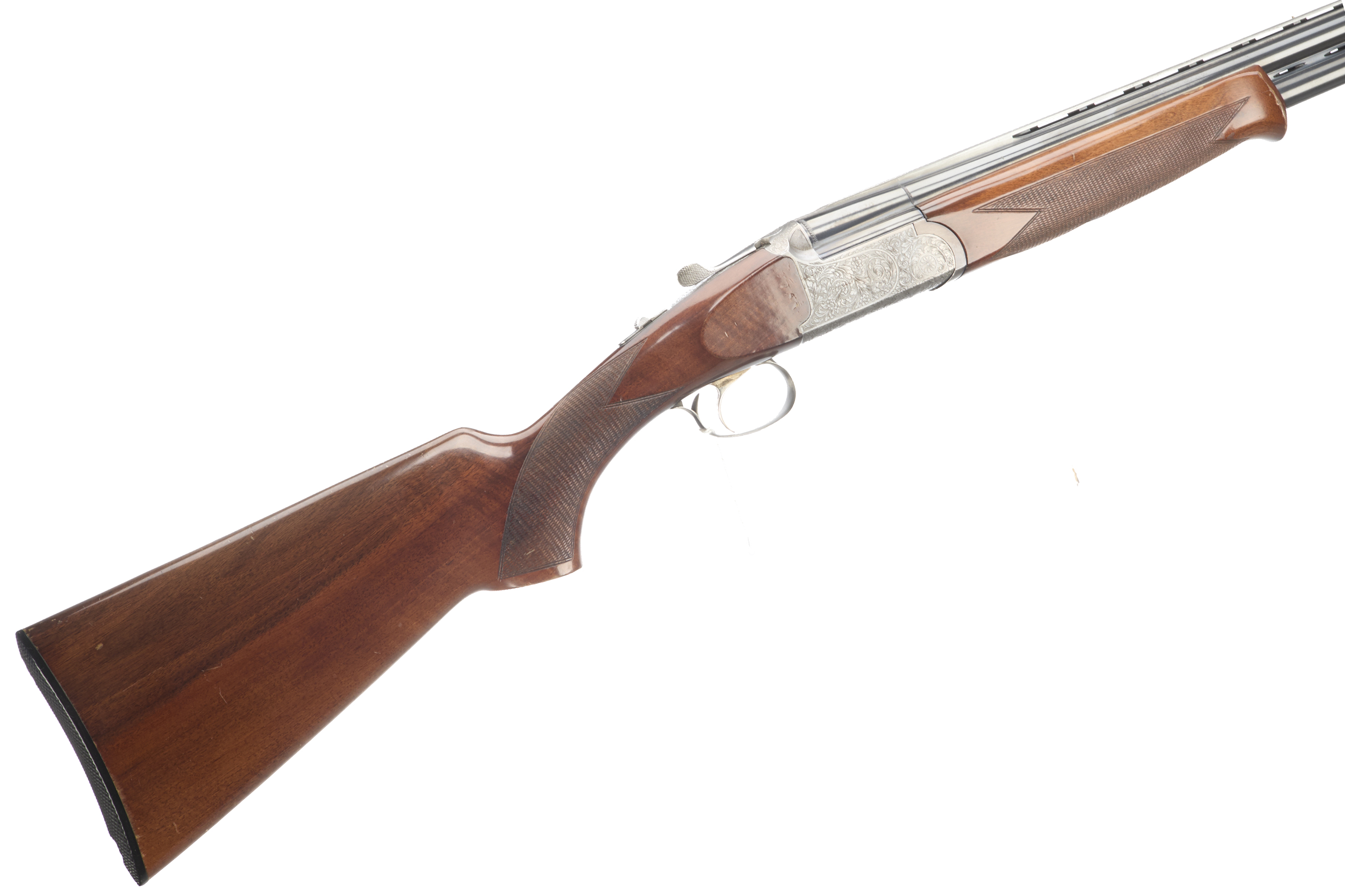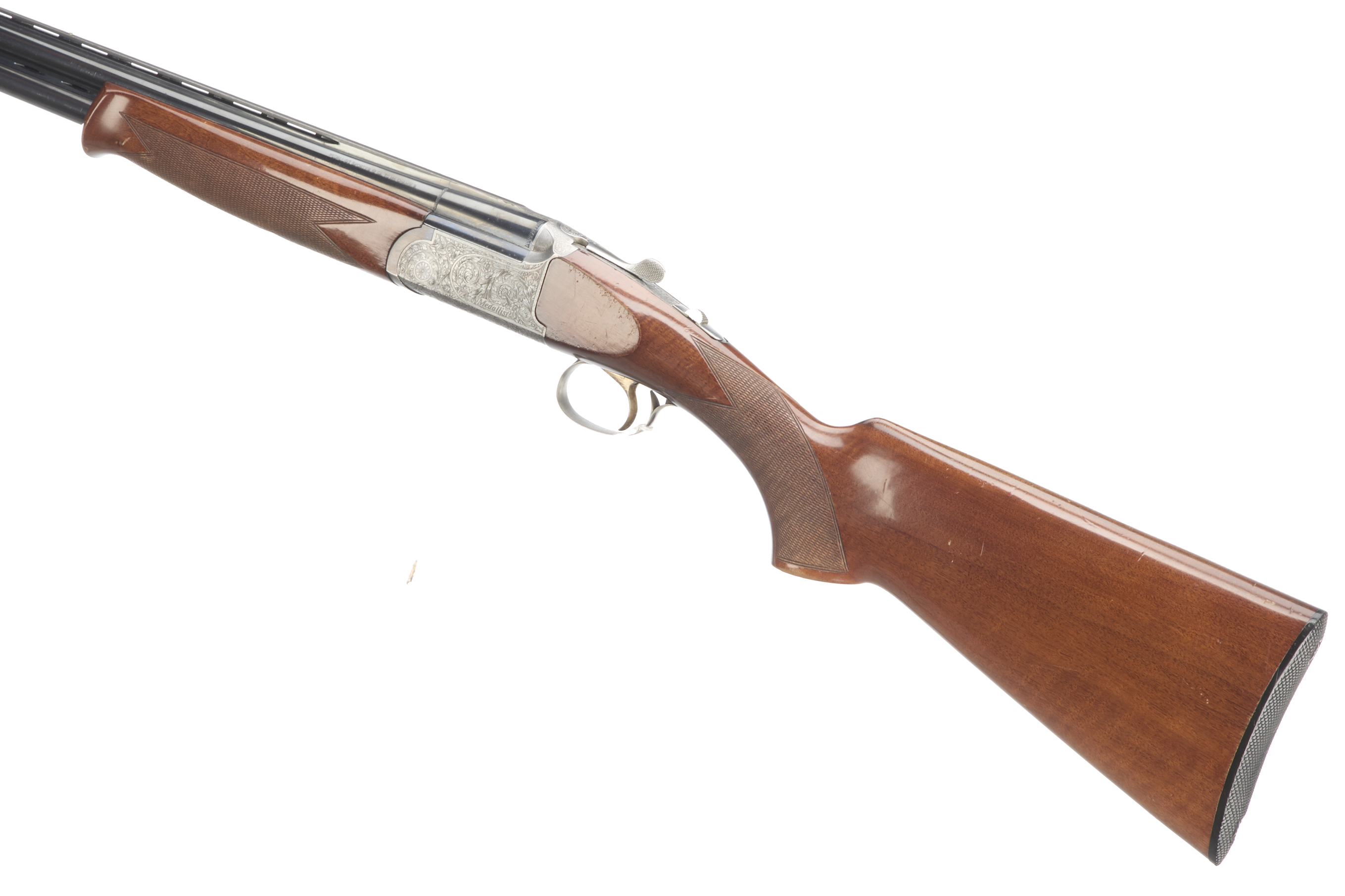 Ebonite butt pad, chequered semi-pistol grip and forend, ventilated top and mid rib. Acanthus scrolls to action with ‘MEDALLIST’ engraved. Gold wash trigger, integrated barrel selector (selective single trigger) and safety.