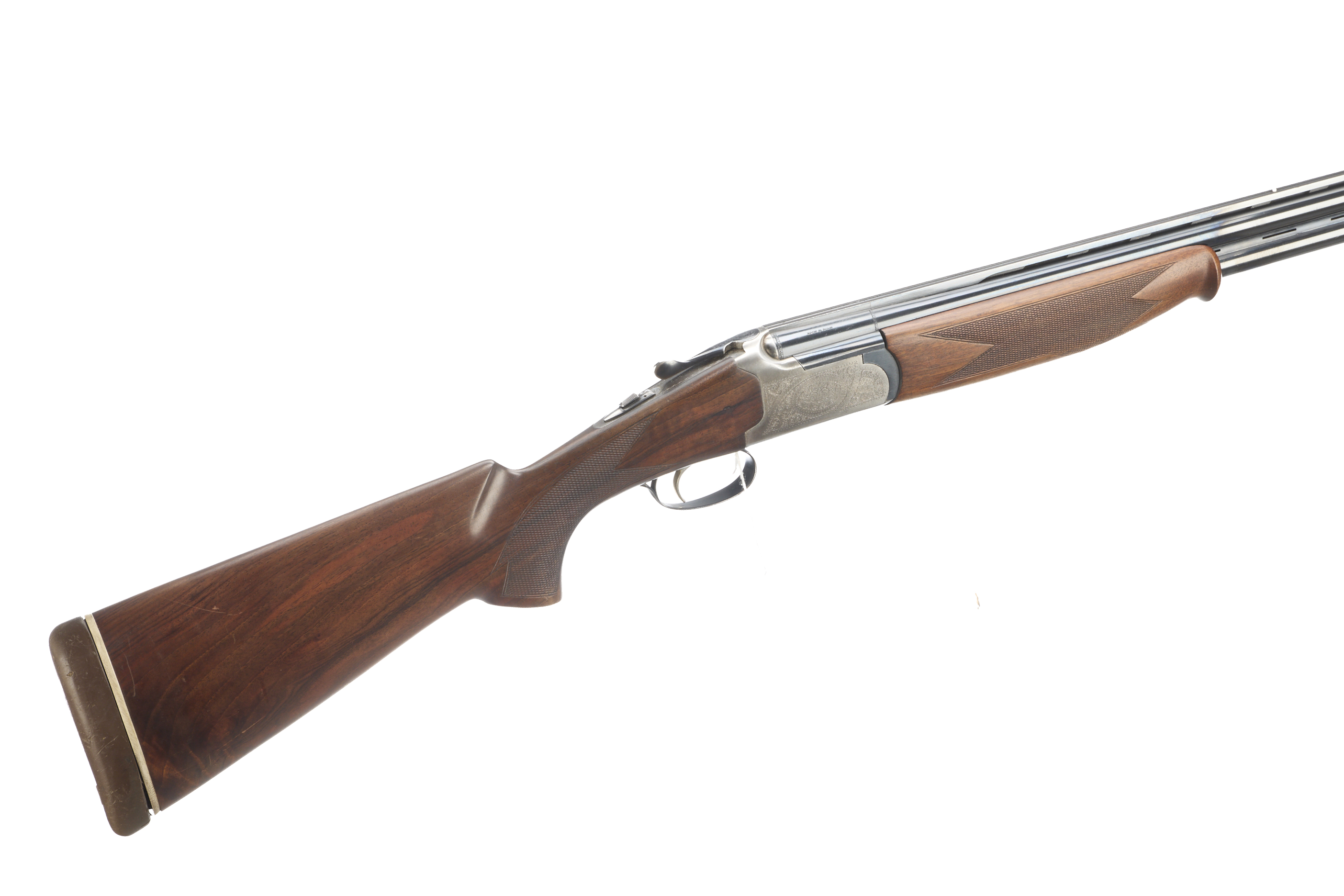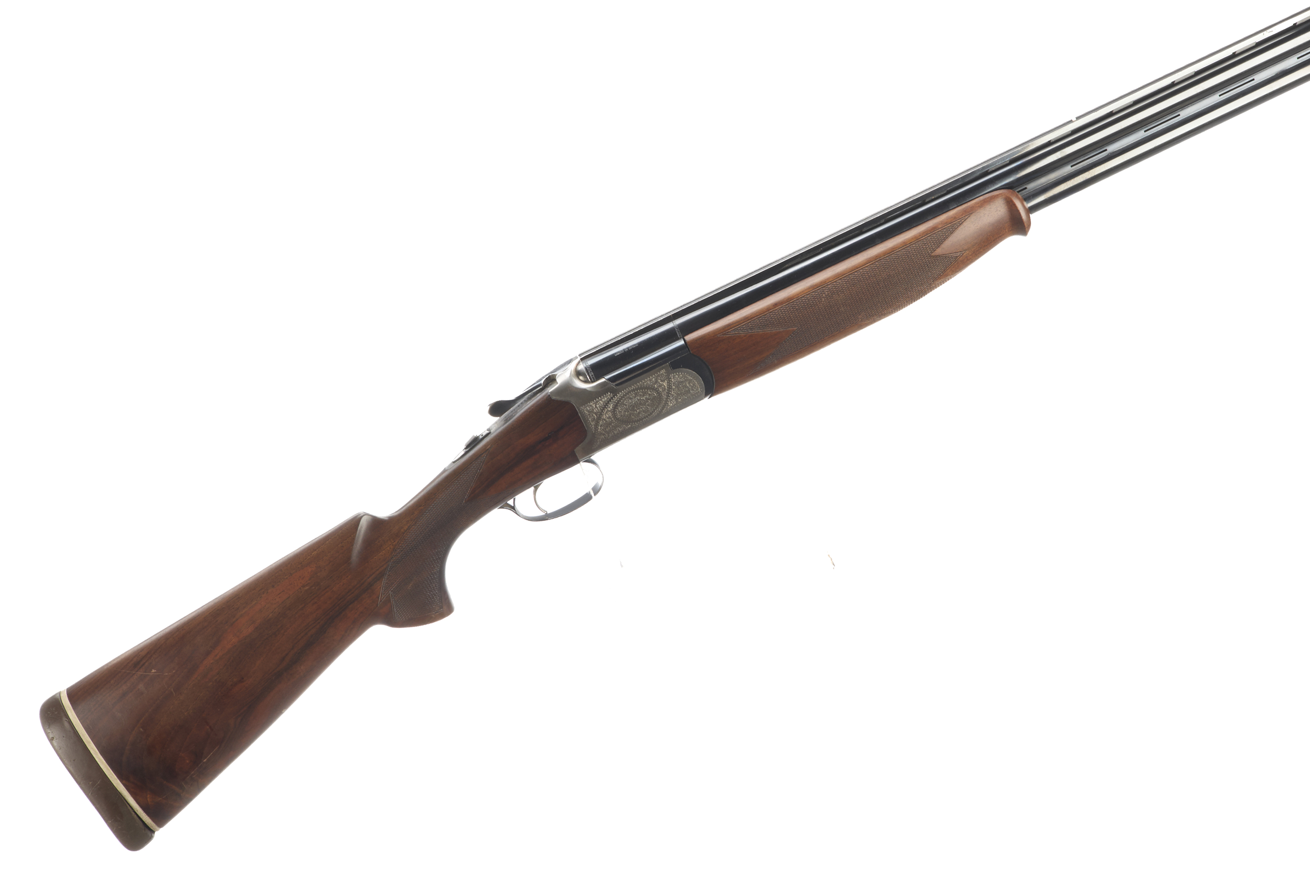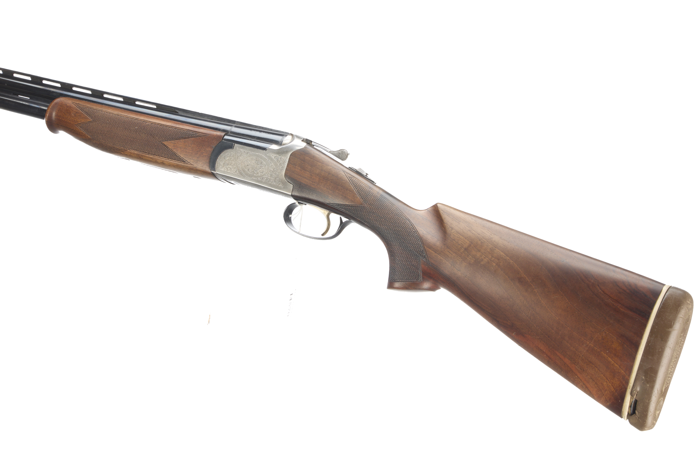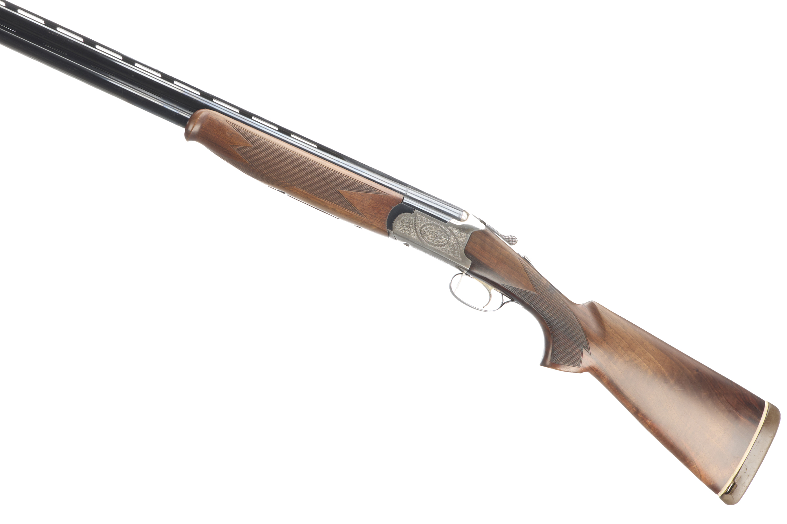 Cushioned butt pad, chequered semi-pistol grip and forend, ventilated top and mid rib. Acanthus scrolls to action. Gold wash trigger, integrated barrel selector (selective single trigger) and safety.