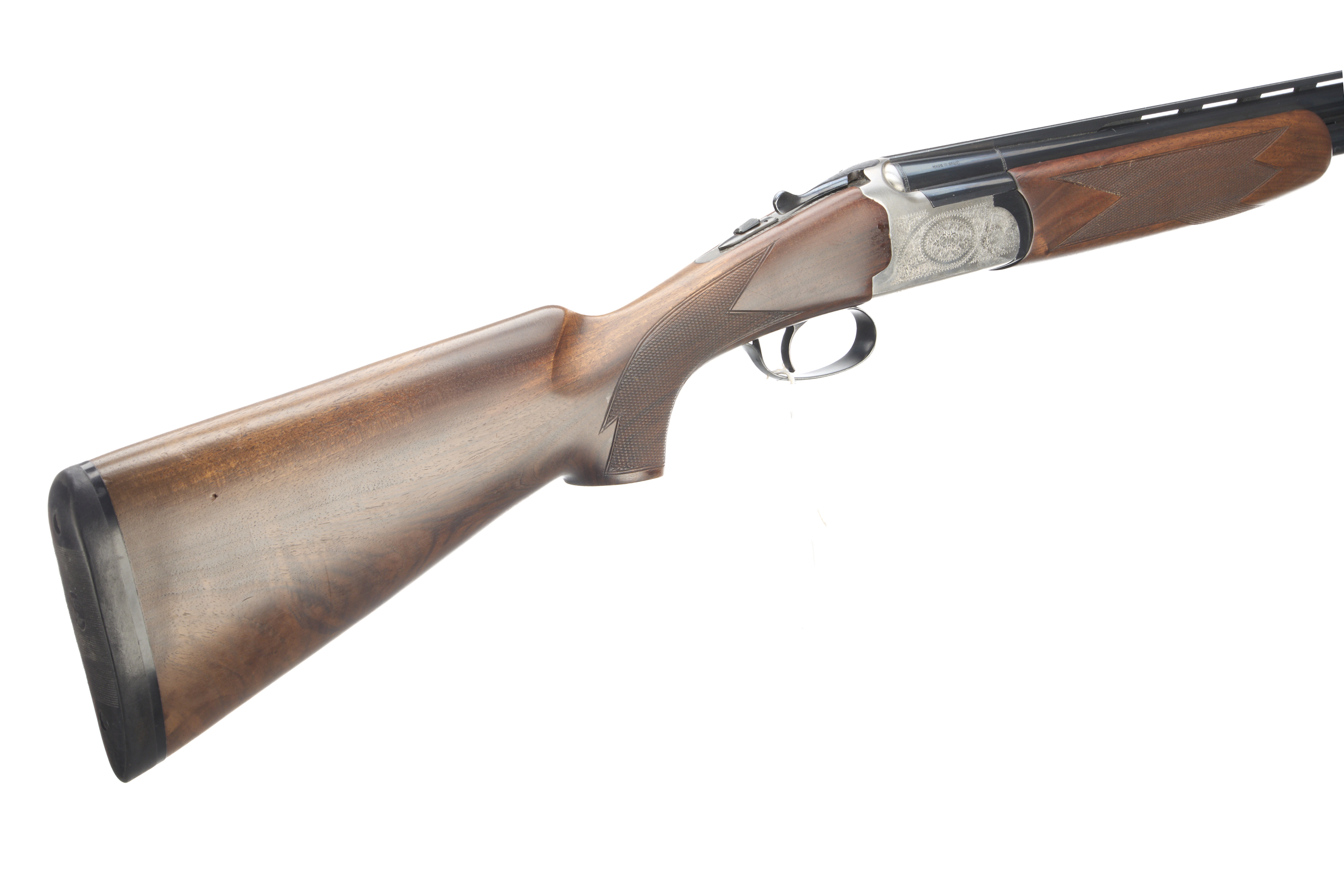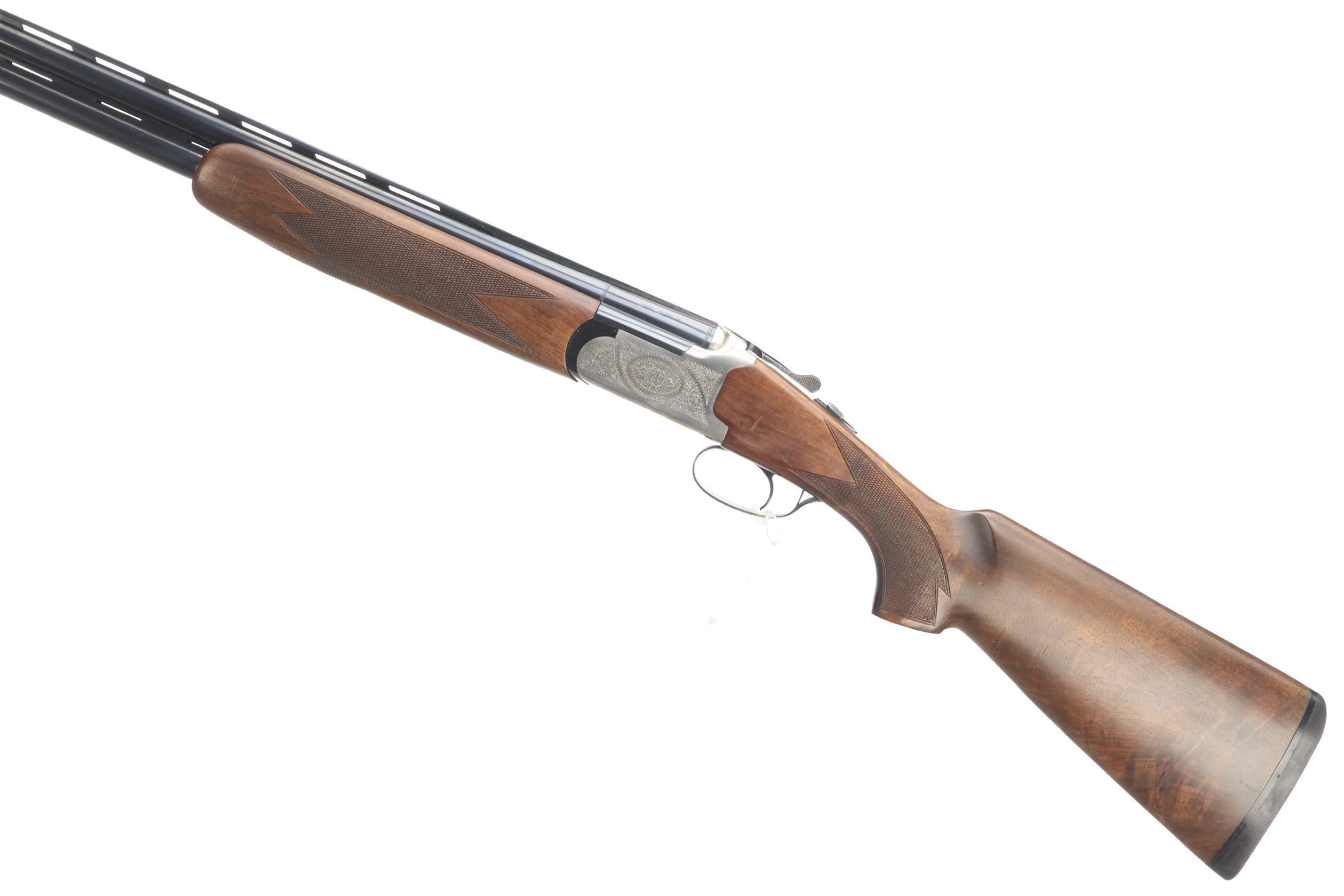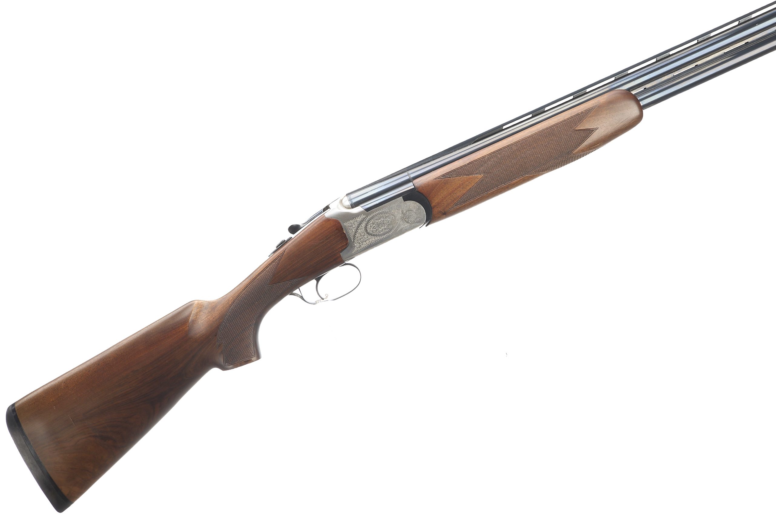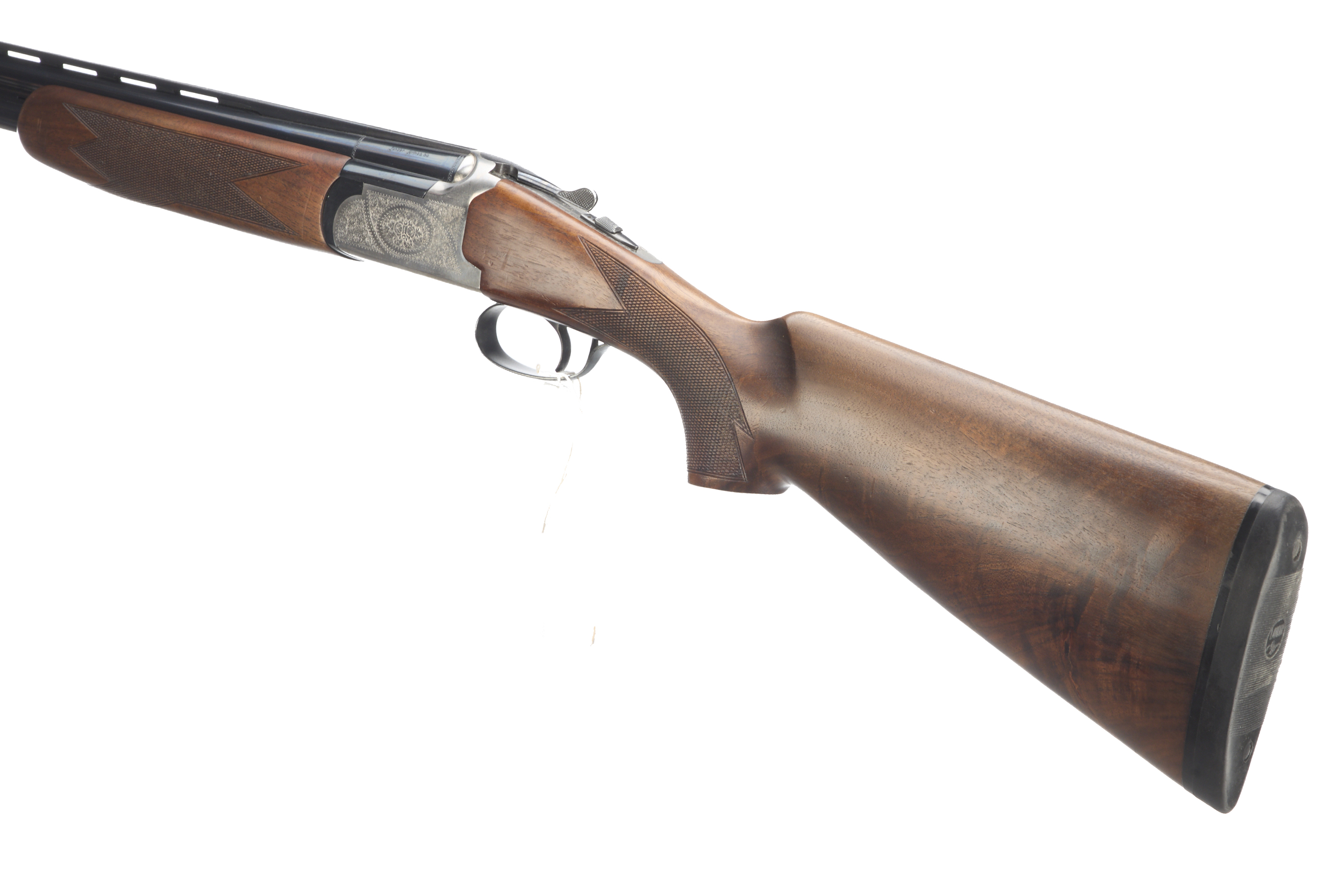 Cushioned butt pad, chequered semi-pistol grip and forend, ventilated top and mid rib. Acanthus scrolls to action. Integrated barrel selector (selective single trigger) and safety.