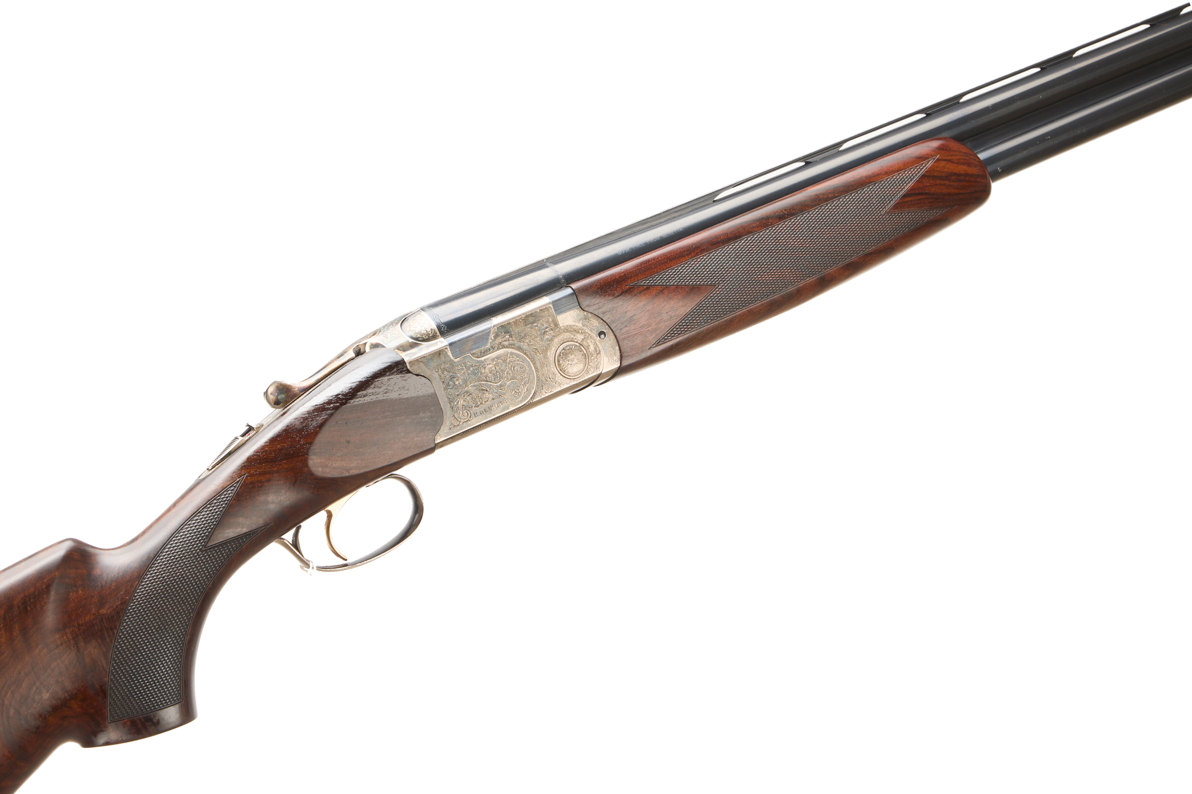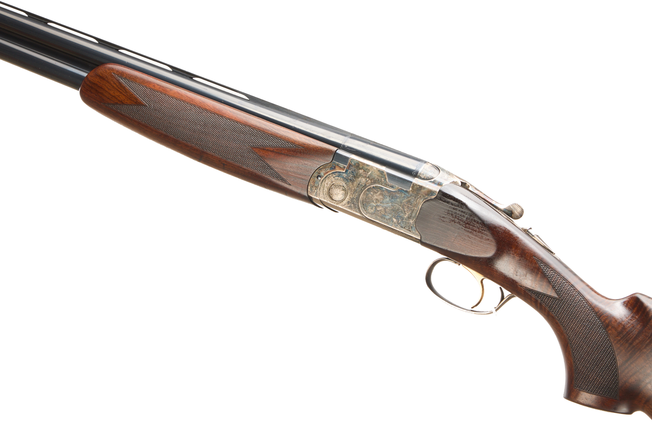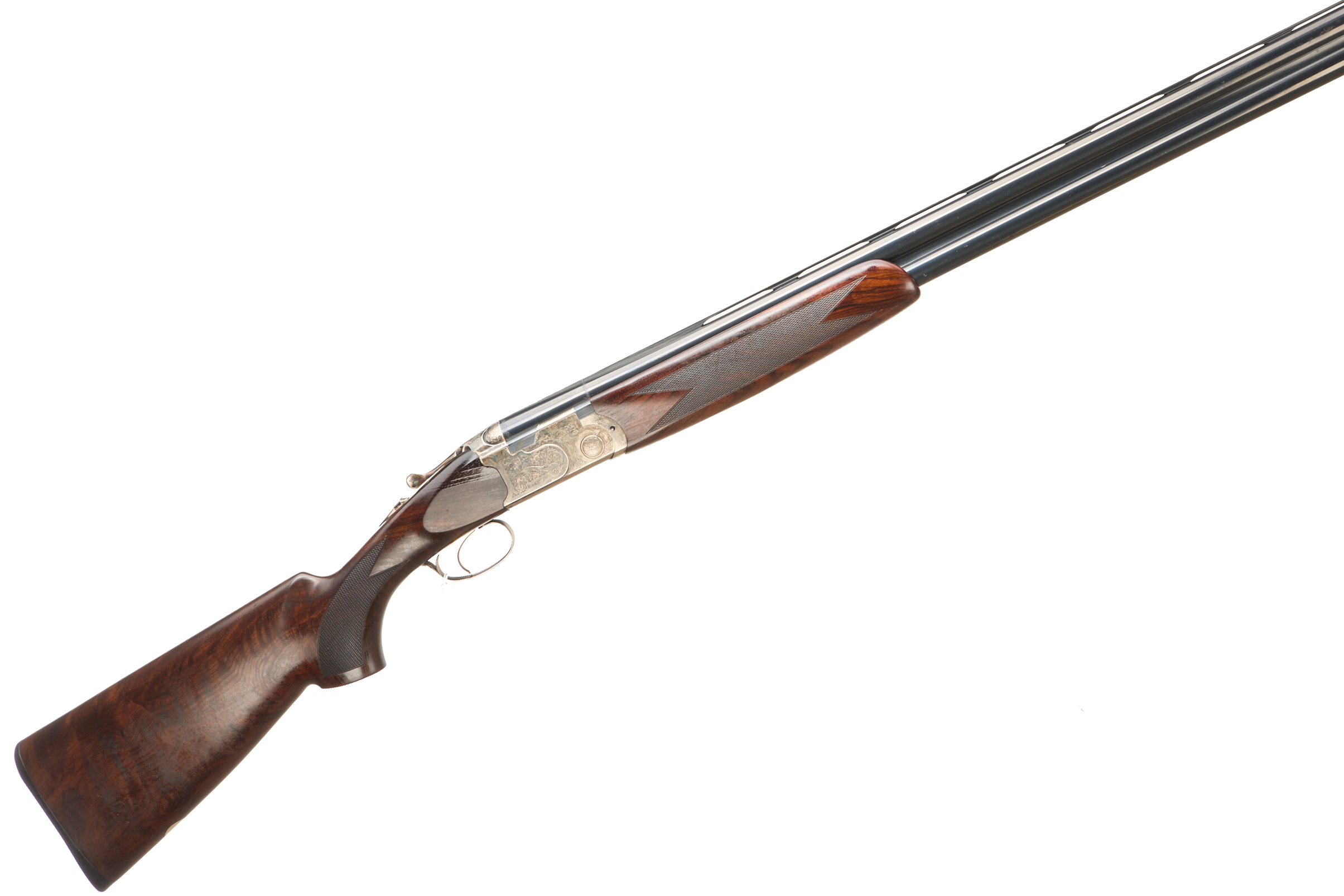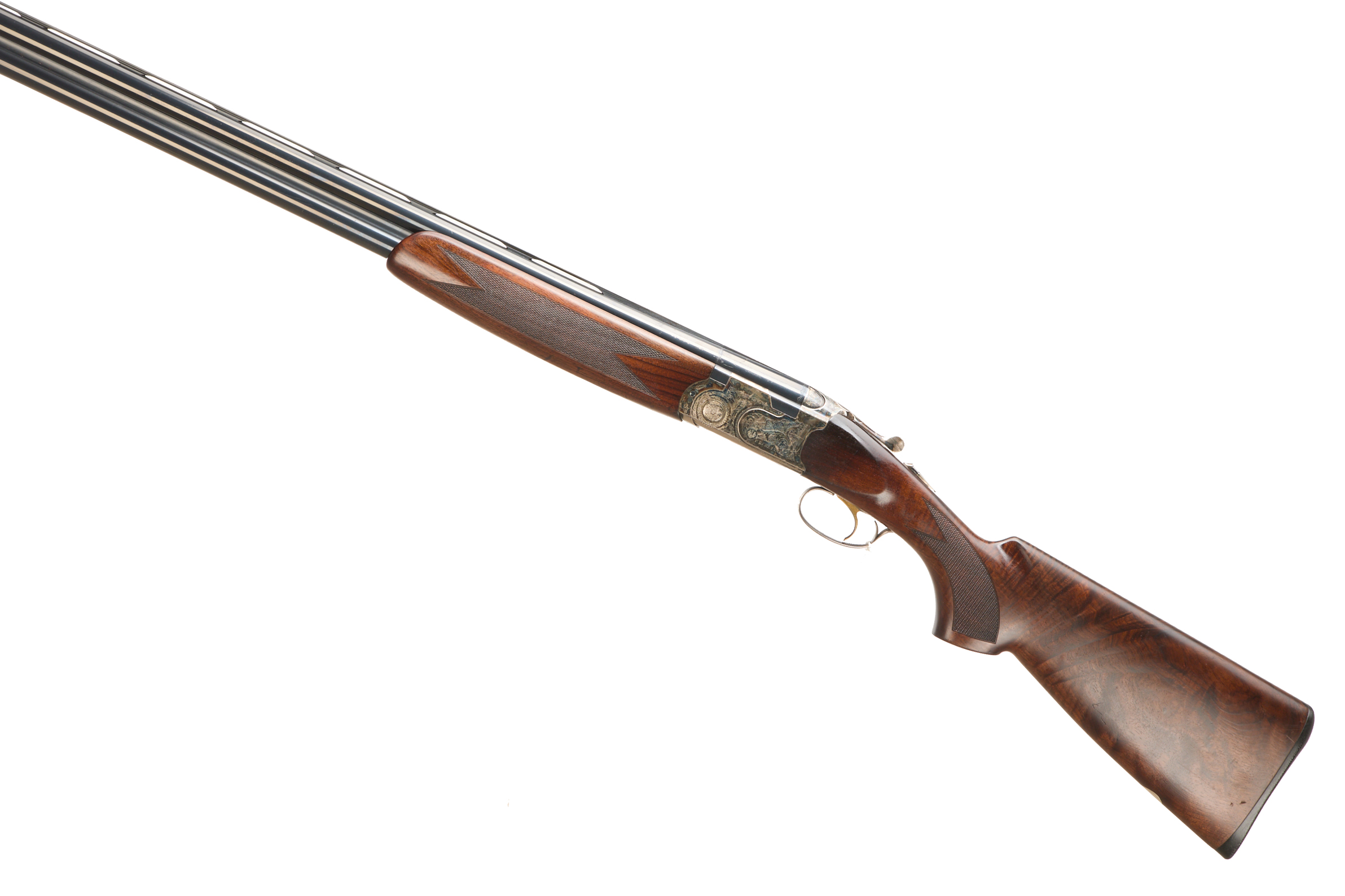 Hard, embossed, butt pad, richly figured stock, chequered semi-pistol grip and forend, ventilated top rib. Acanthus scrolling to action and fences. Gold wash trigger, integrated barrel selector and safety. Retaining much original colour. For 2005