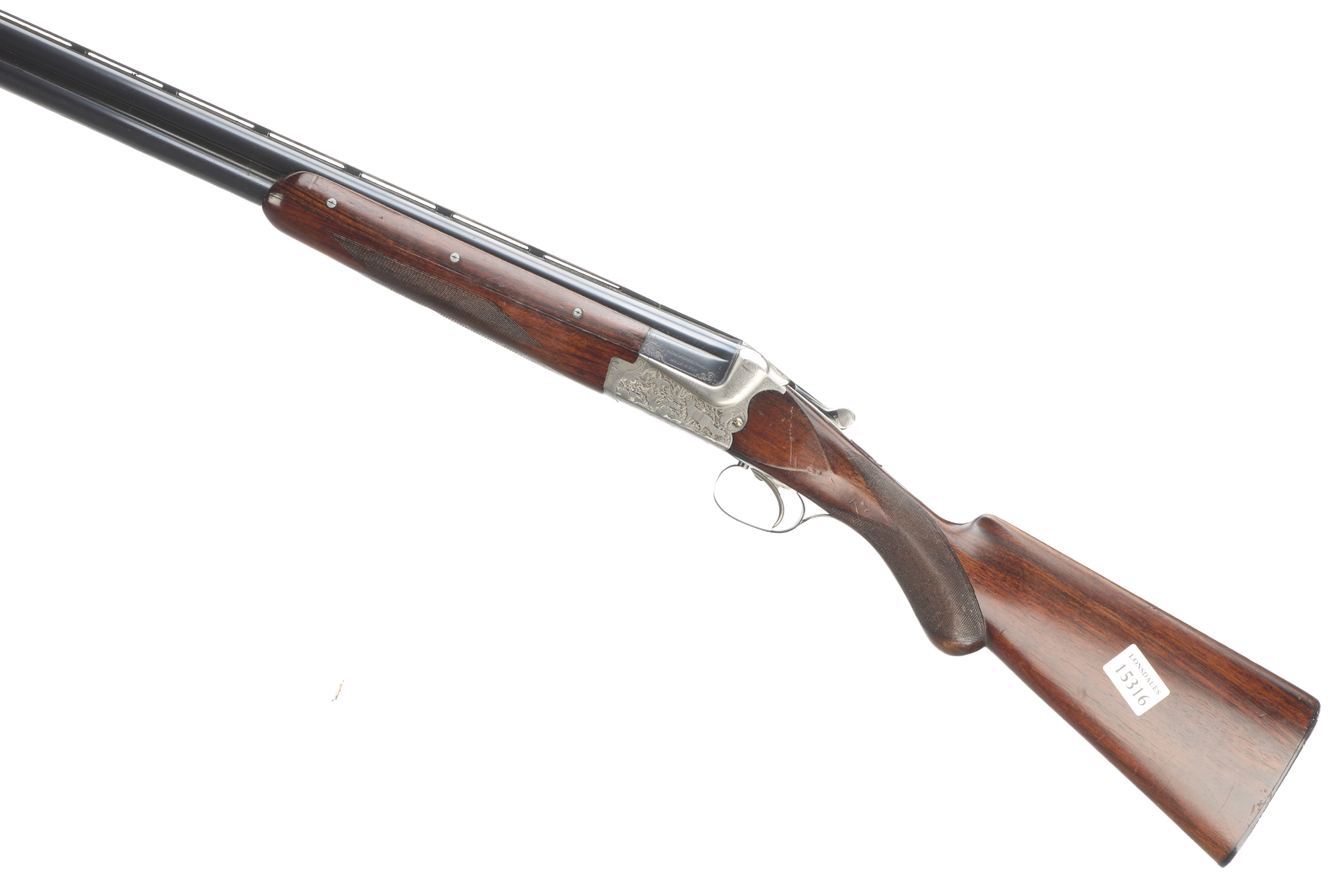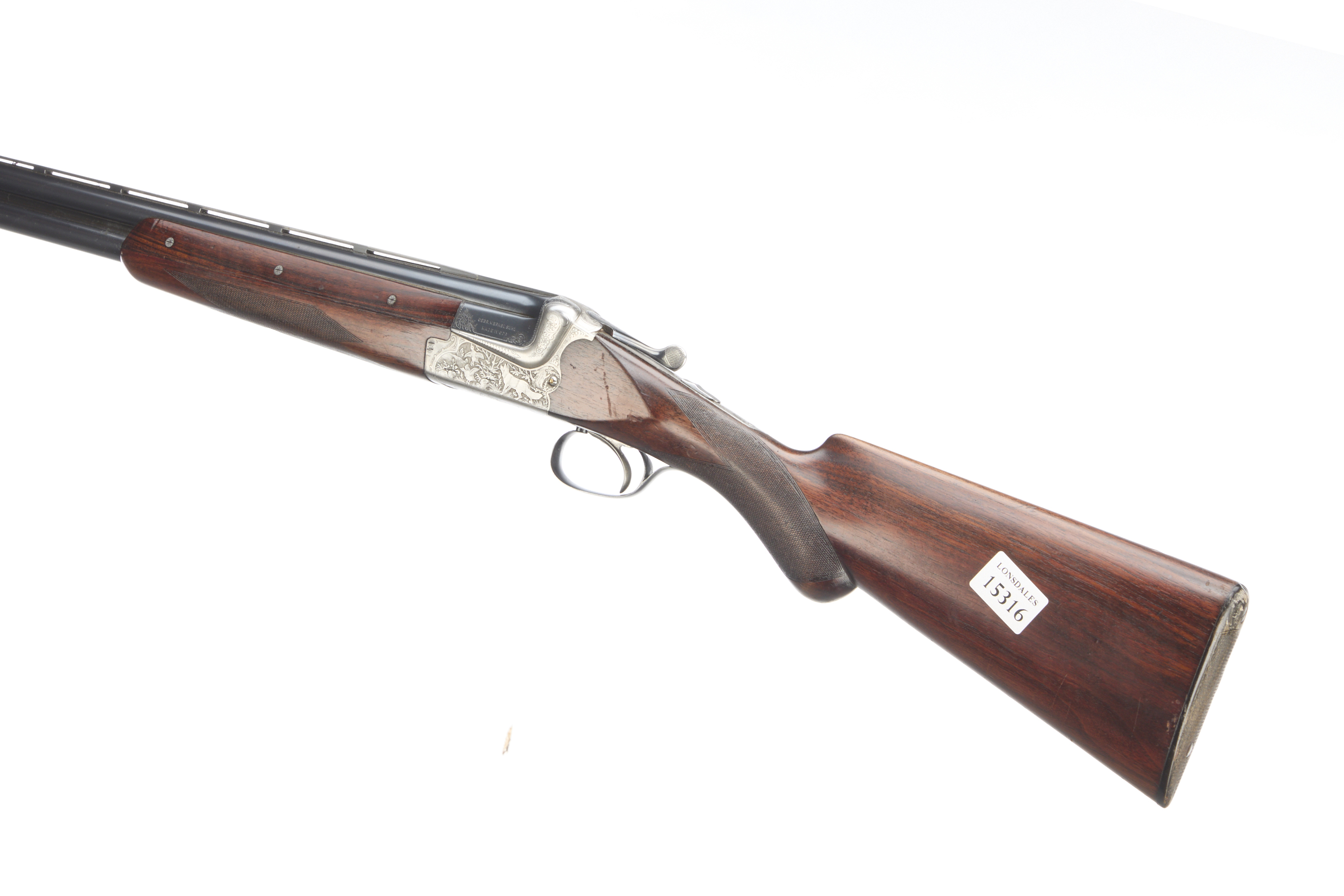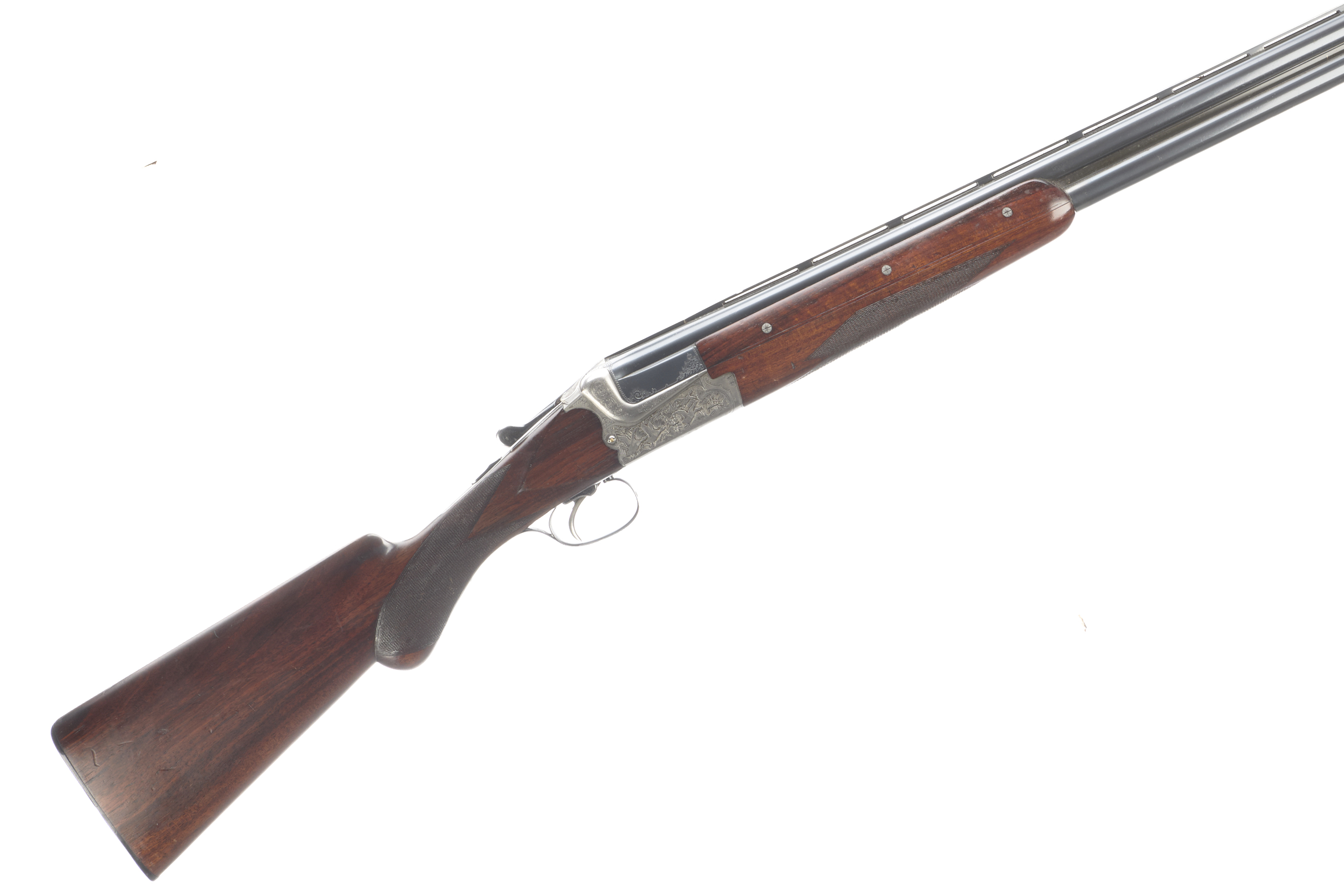 Horn butt pad, chequered rounded semi-pistol grip and forend, ventilated top rib. Scroll back action with side bolsters, gold-washed cocking indicators. Bold engraved game scene to action.