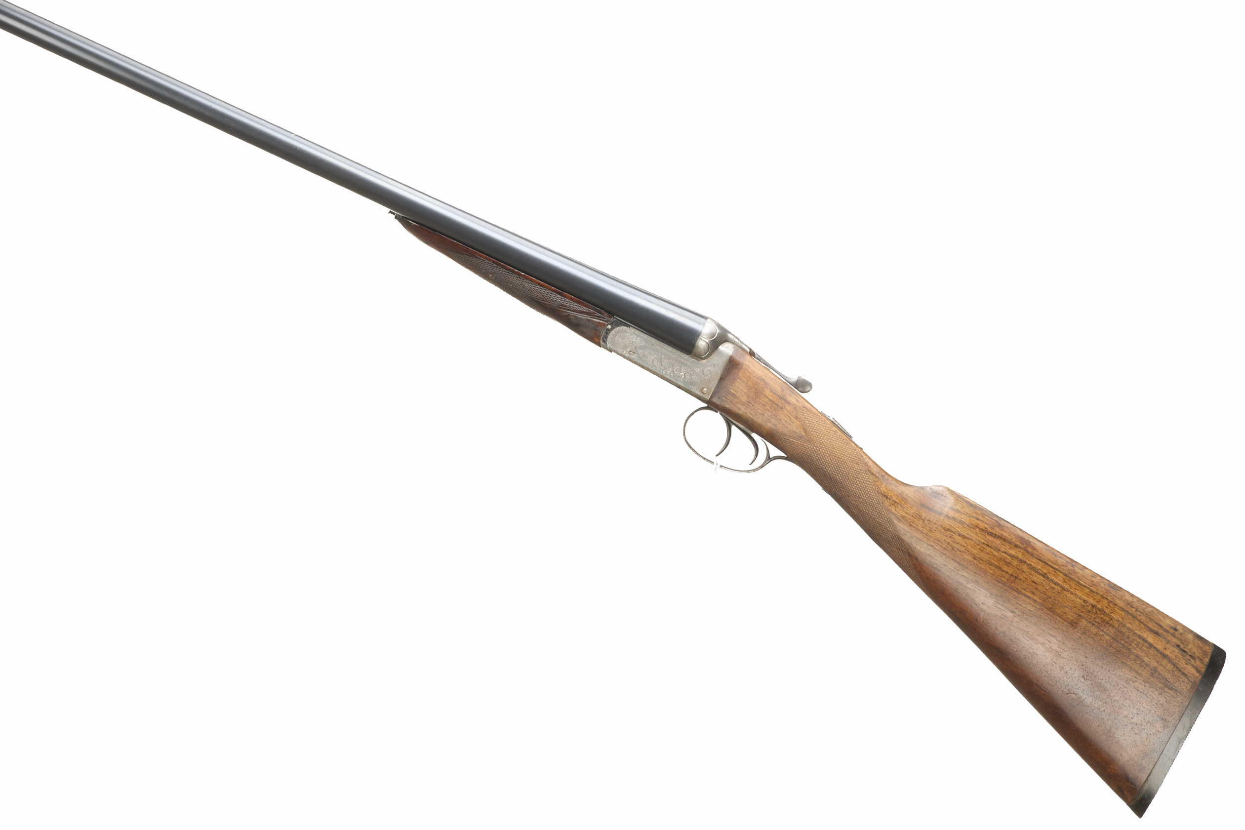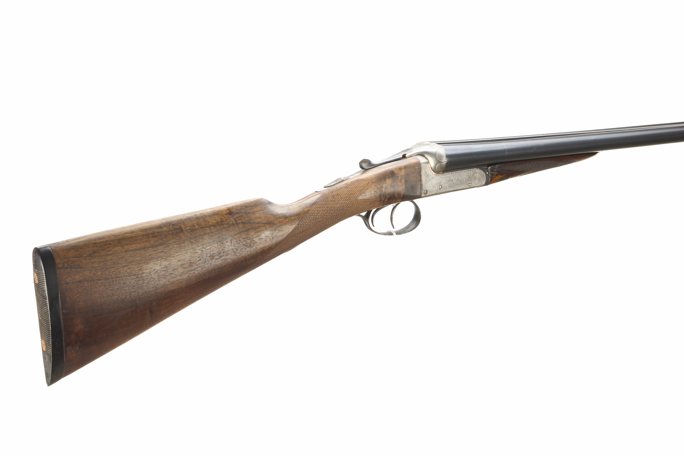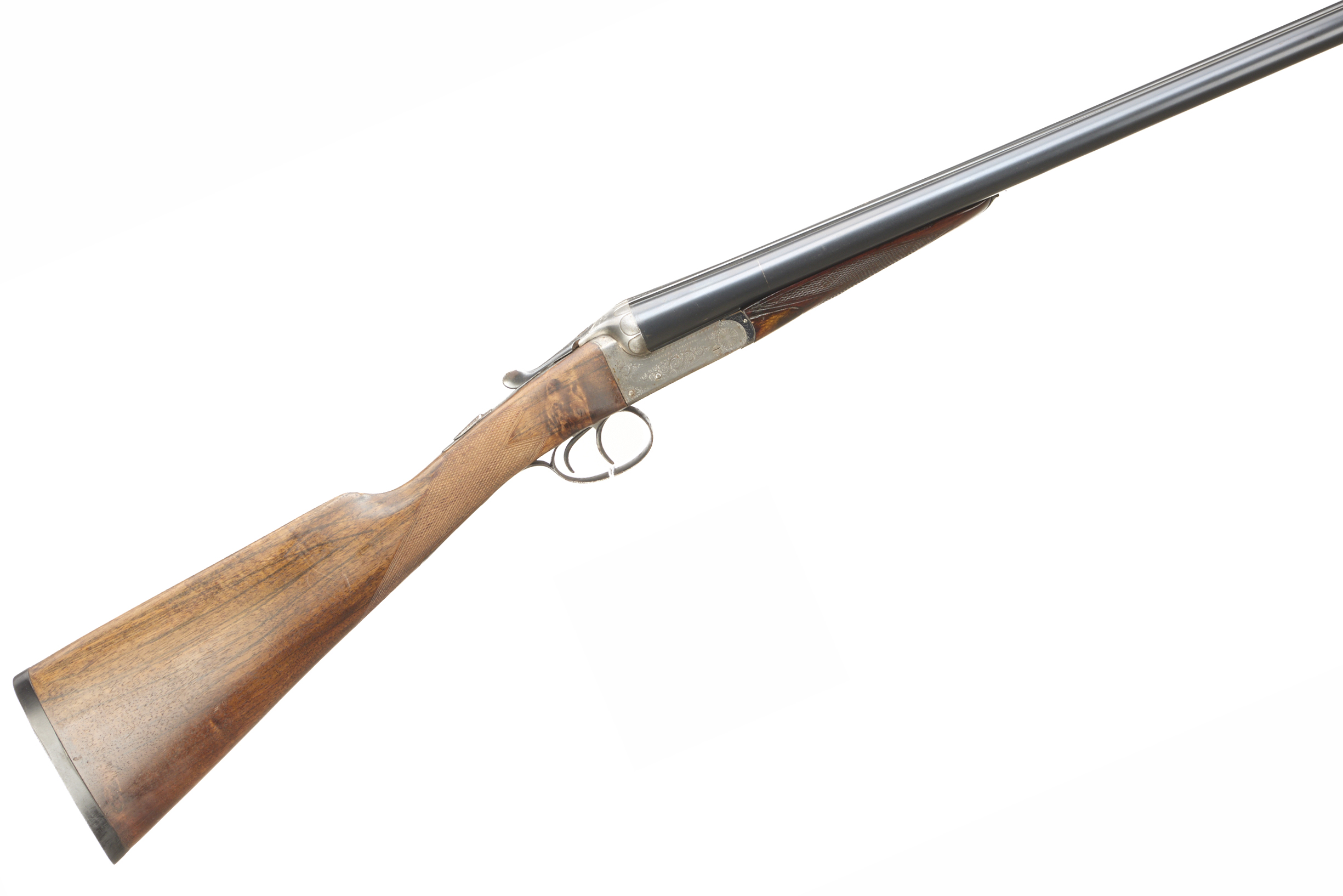 Ebonite butt, chequered straight grip and forend. Lightly tapered rib engraved ‘CHARLES INGRAM etc ‘ worn. Light castellated fences with stippling, top lever, automatic safety with ‘SAFE’ engraved. The action engraved with bouquets and acanthus scrolling. Sleeved.