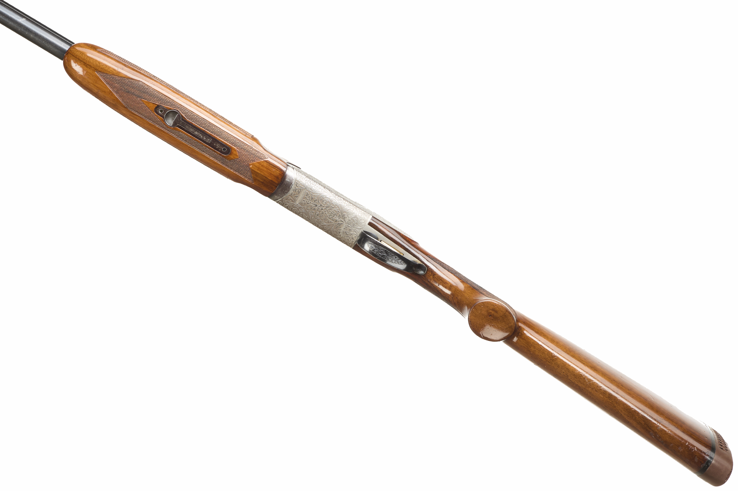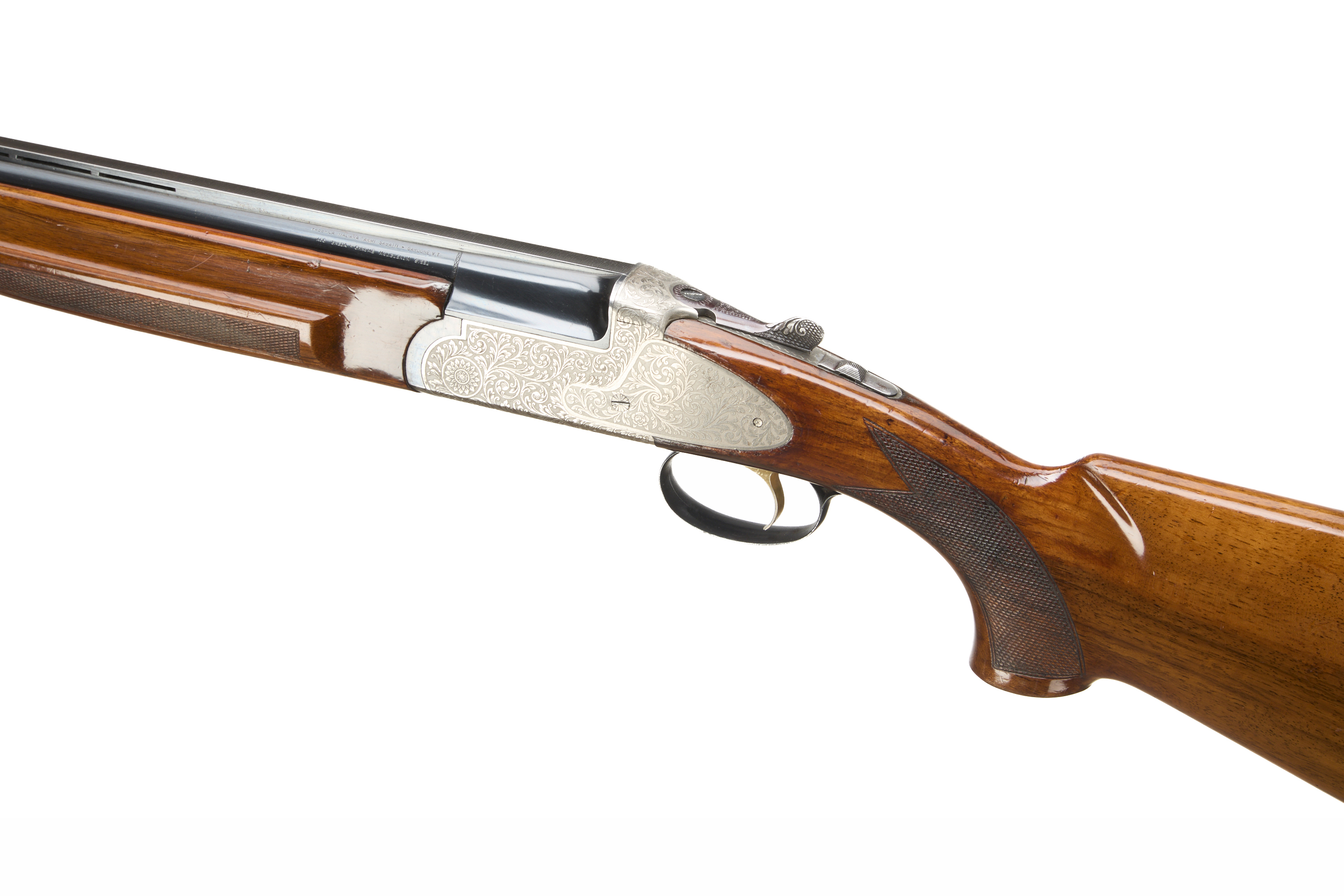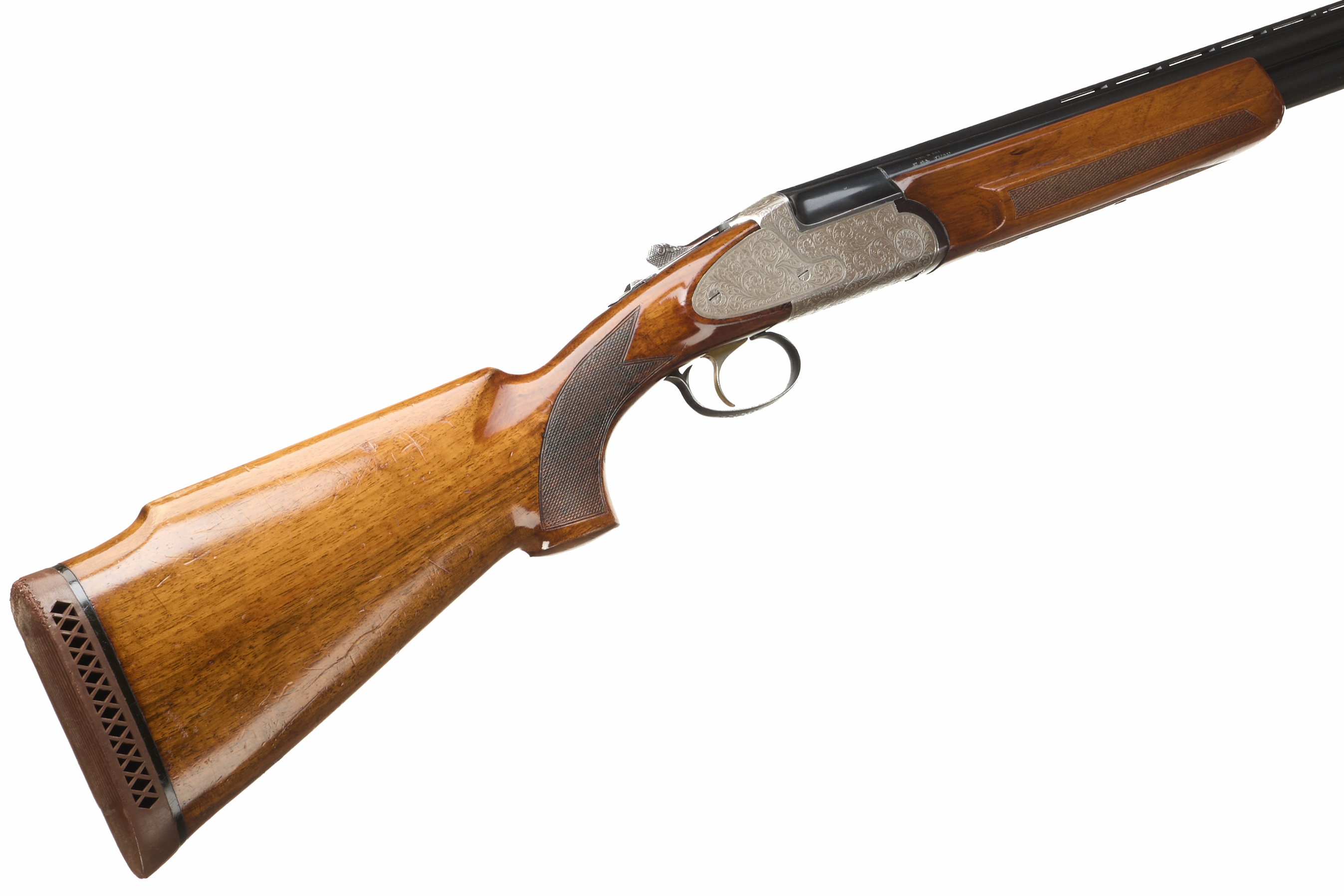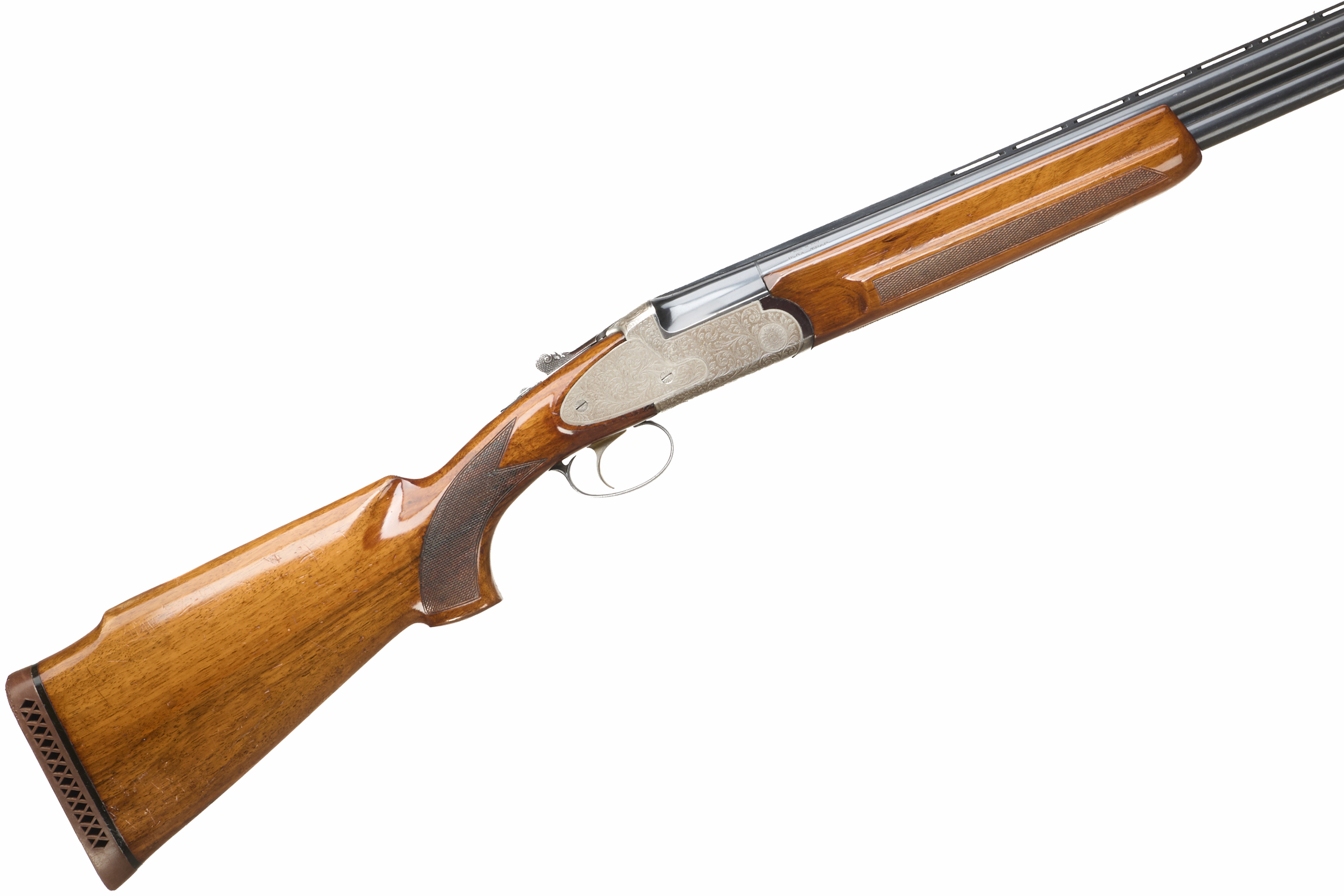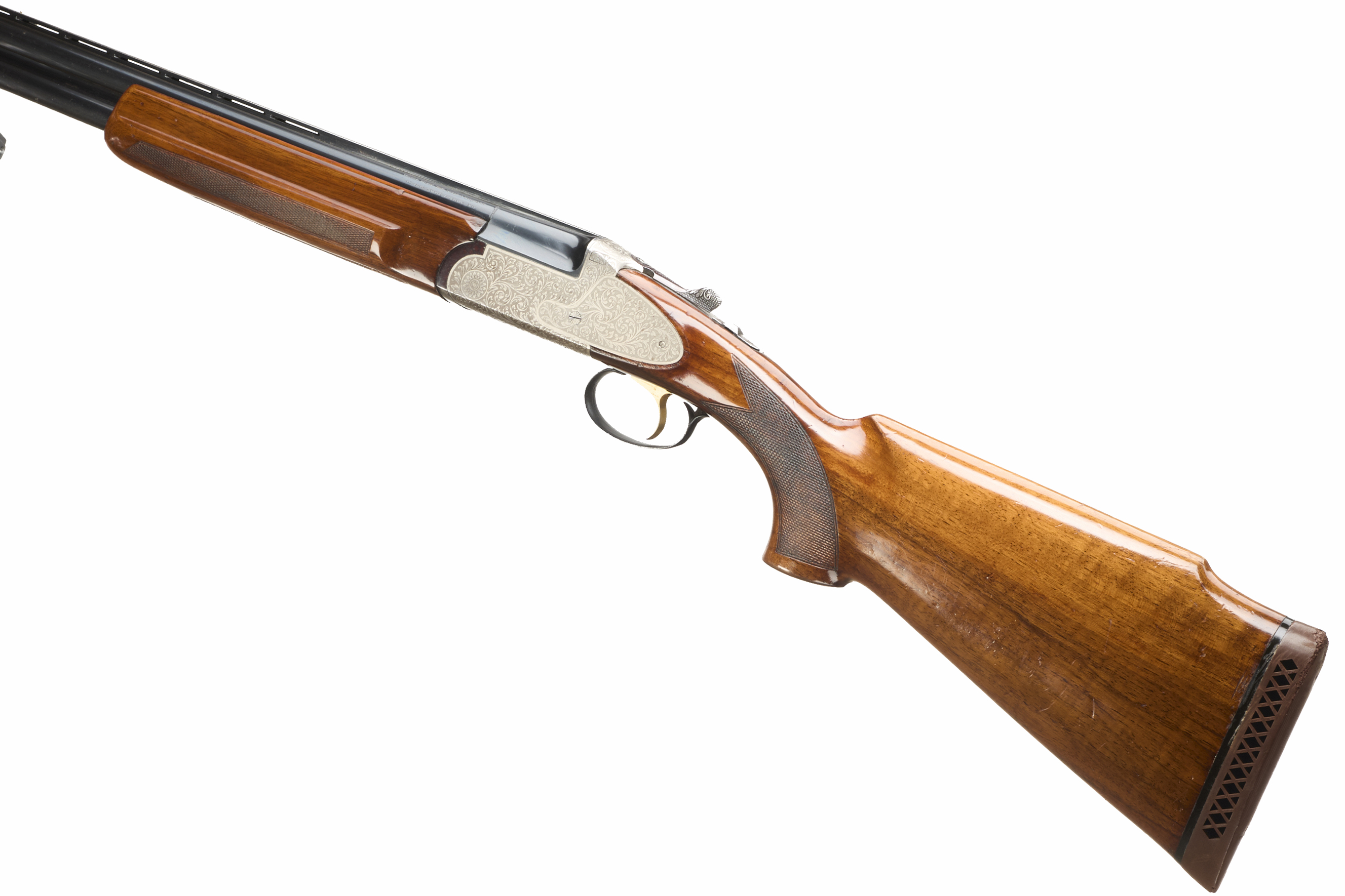 Ventilated cushioned butt pad, chequered semi-pistol grip and forend, ventilated top rib. Acanthus scrolls to action. Gold wash trigger, integrated barrel selector (selective single trigger) and safety.