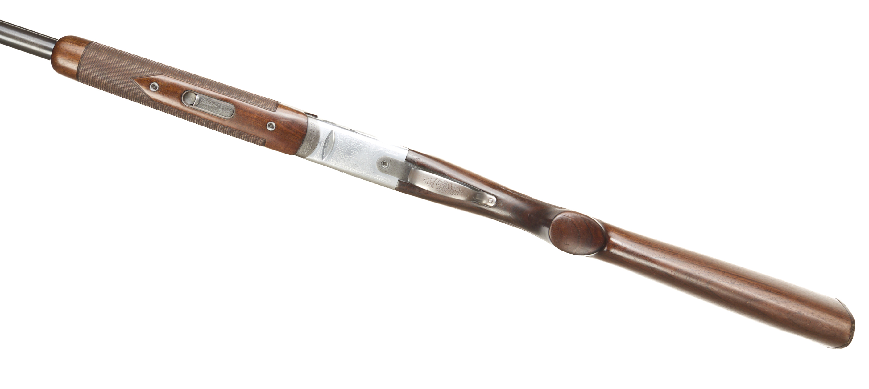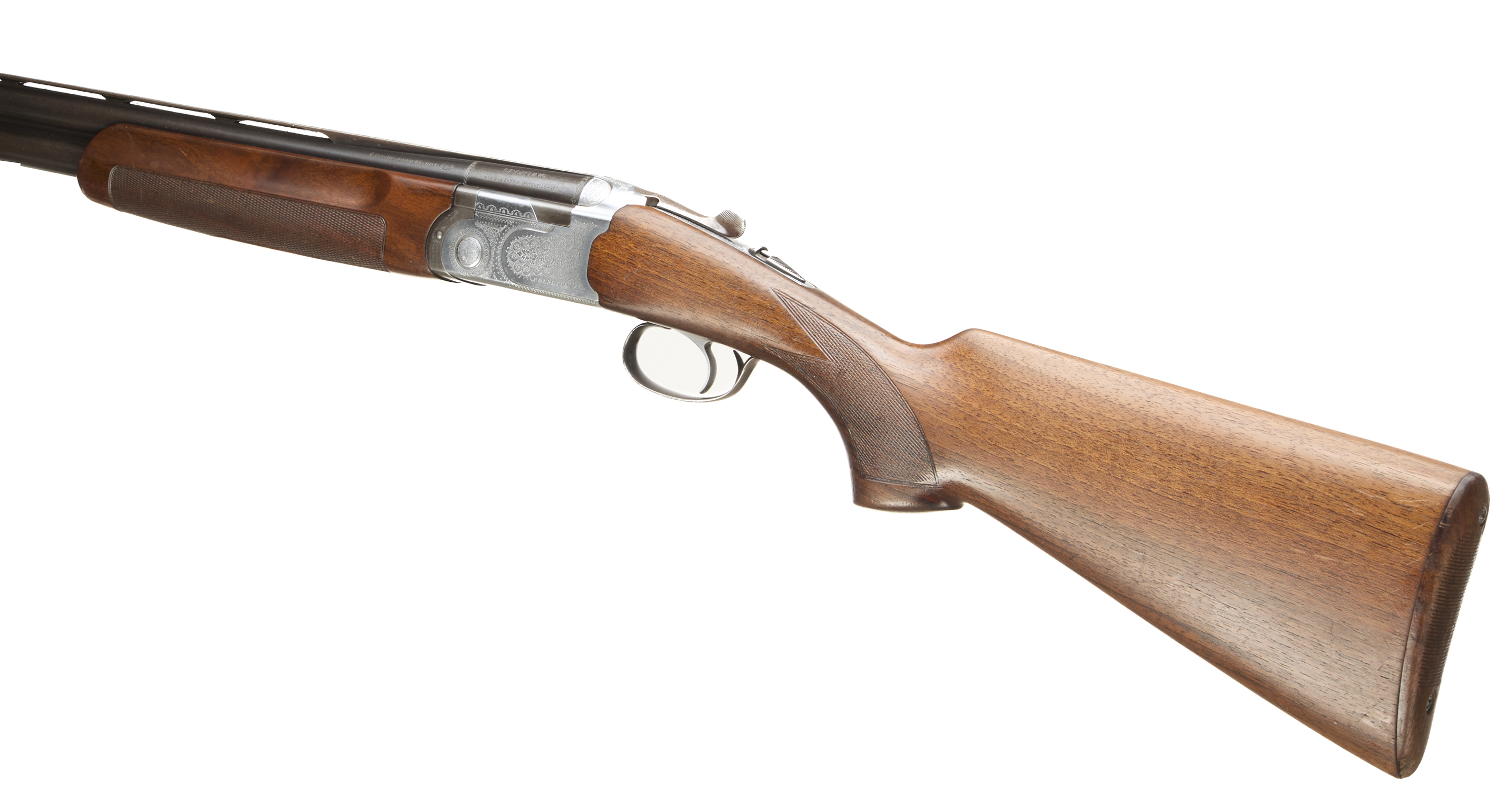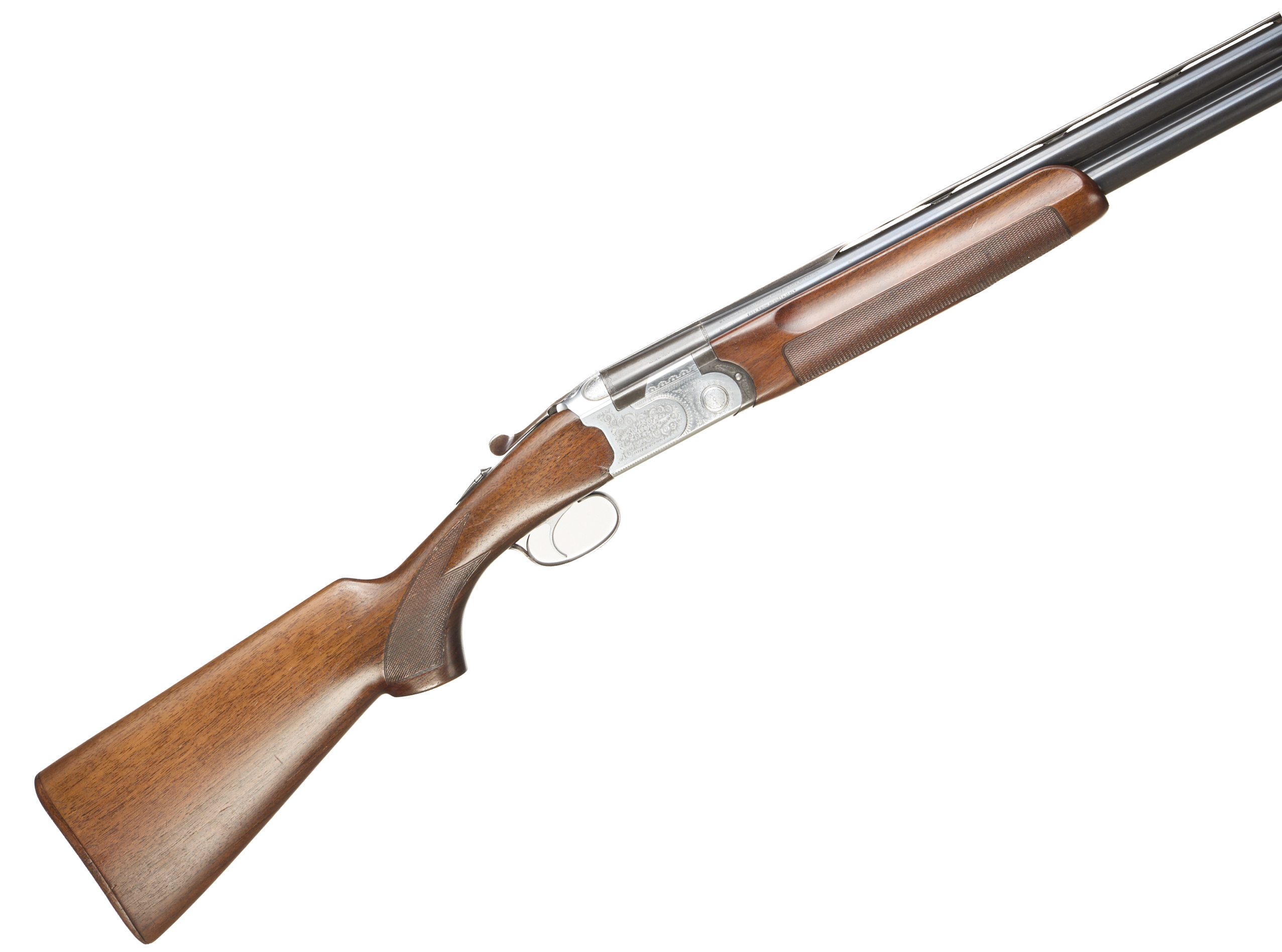 Wooden butt pad, chequered semi-pistol grip and forend, ventilated top rib. Acanthus scrolls to action. Integrated barrel selector (selective single trigger) and safety.