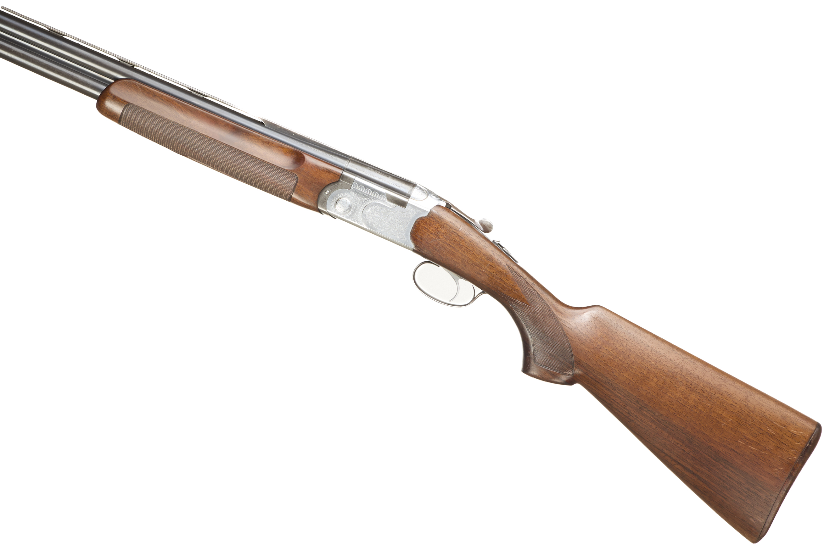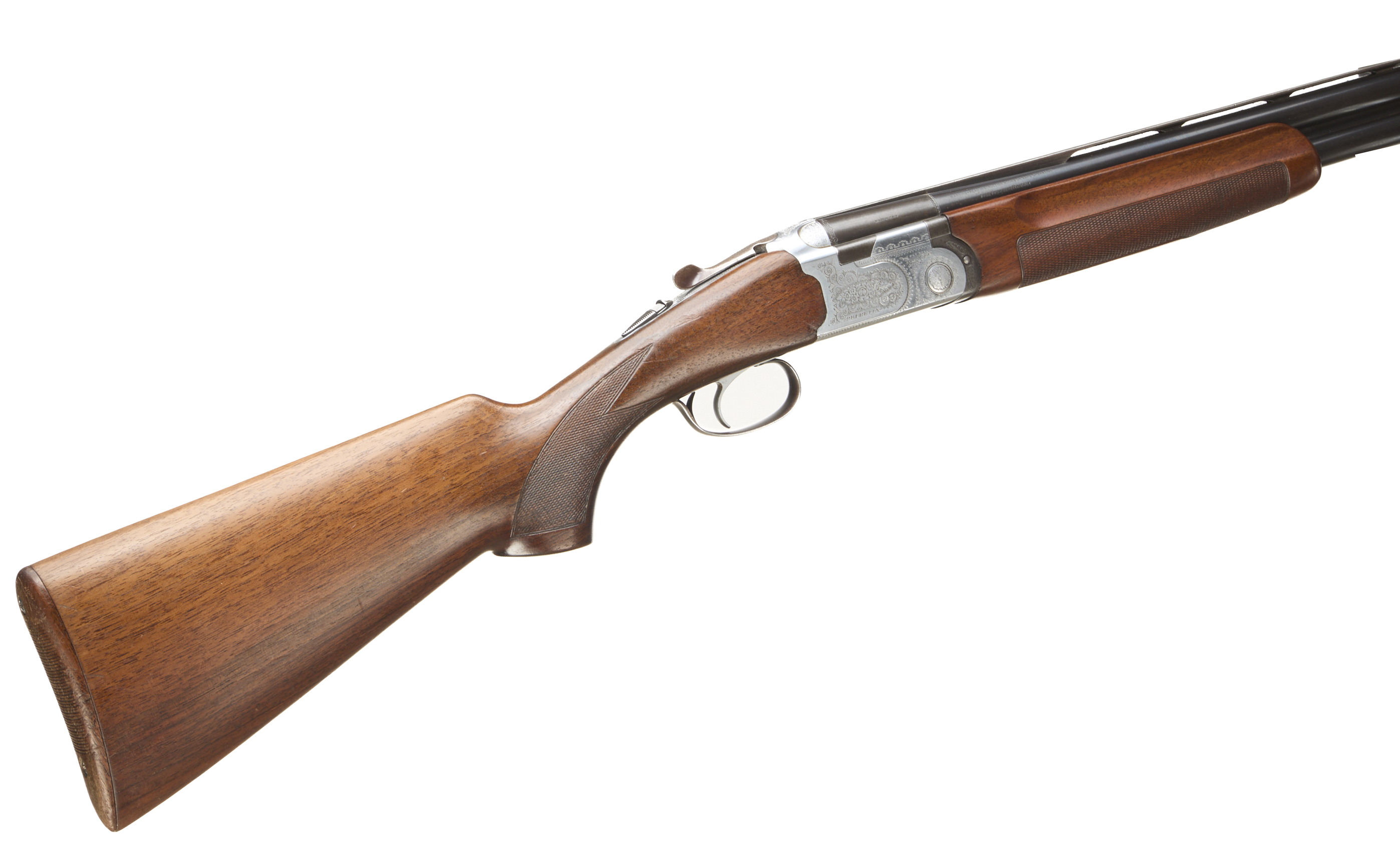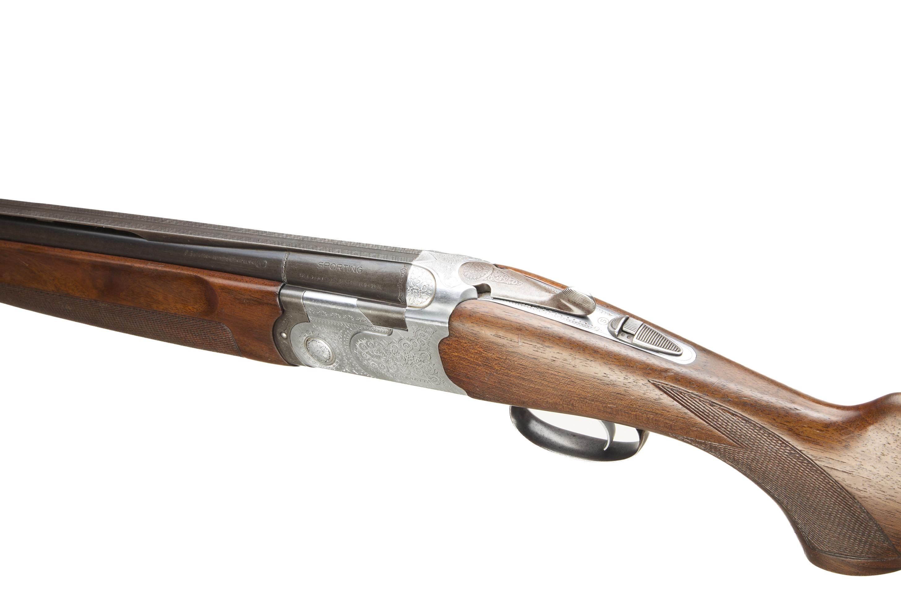 Wooden butt pad, chequered semi-pistol grip and forend, ventilated top rib. Acanthus scrolls to action. Integrated barrel selector (selective single trigger) and safety.