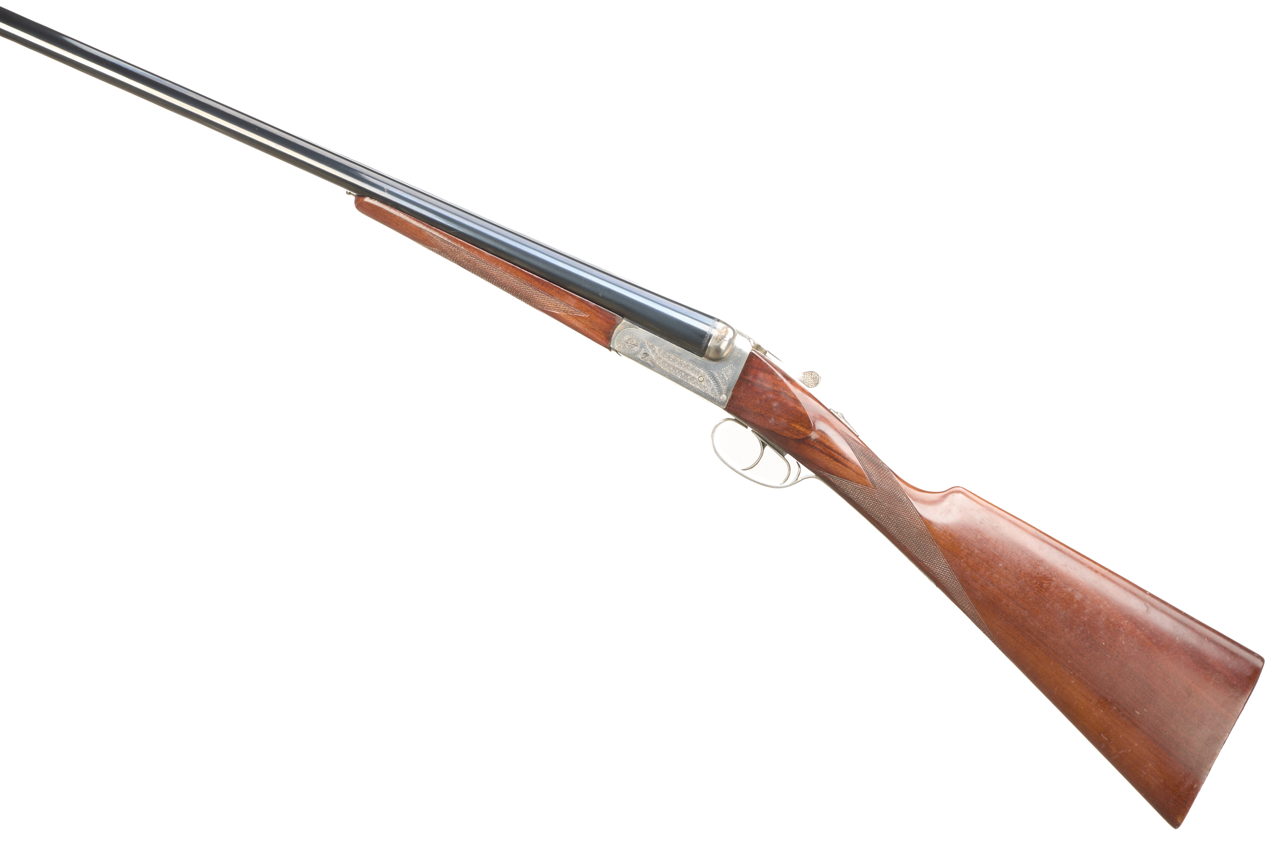 Wooden chequered butt, chequered straight grip and forend. Tapered rib. Treble grip action, top lever, automatic safety with ‘S’. The action engraved with bouquets and extensive acanthus scrolling.