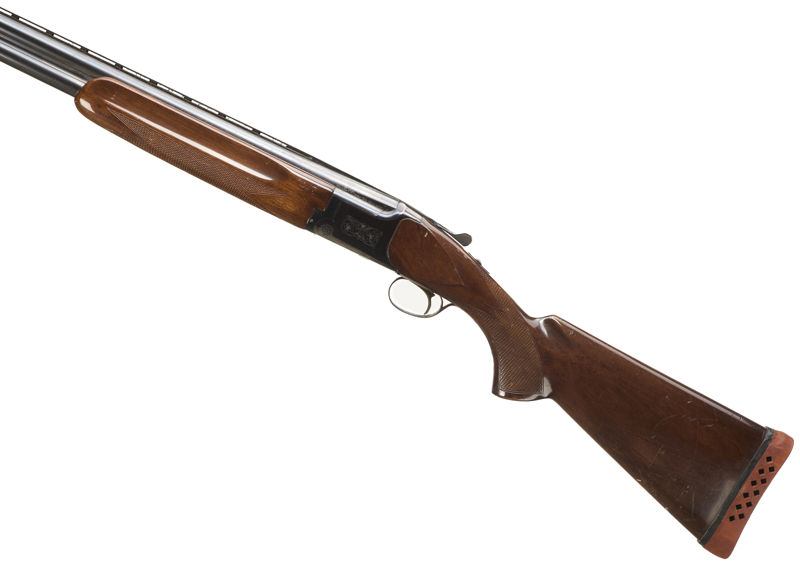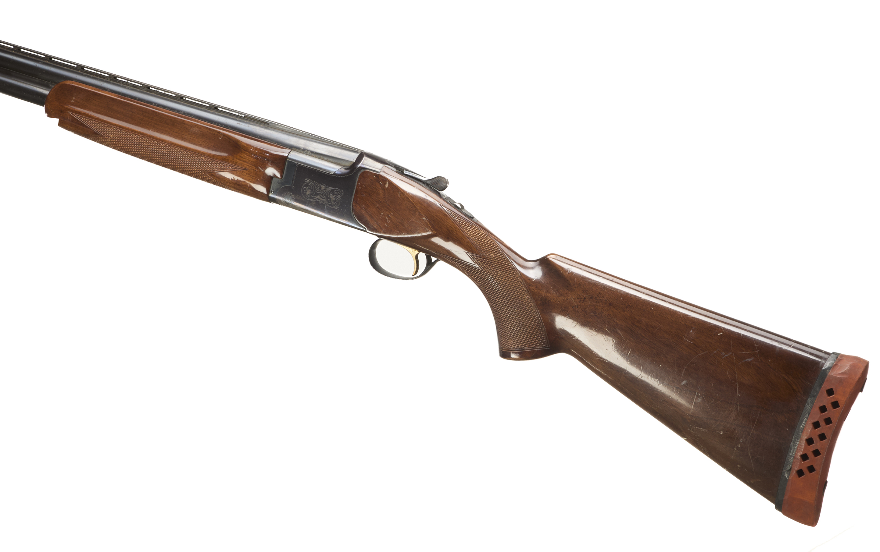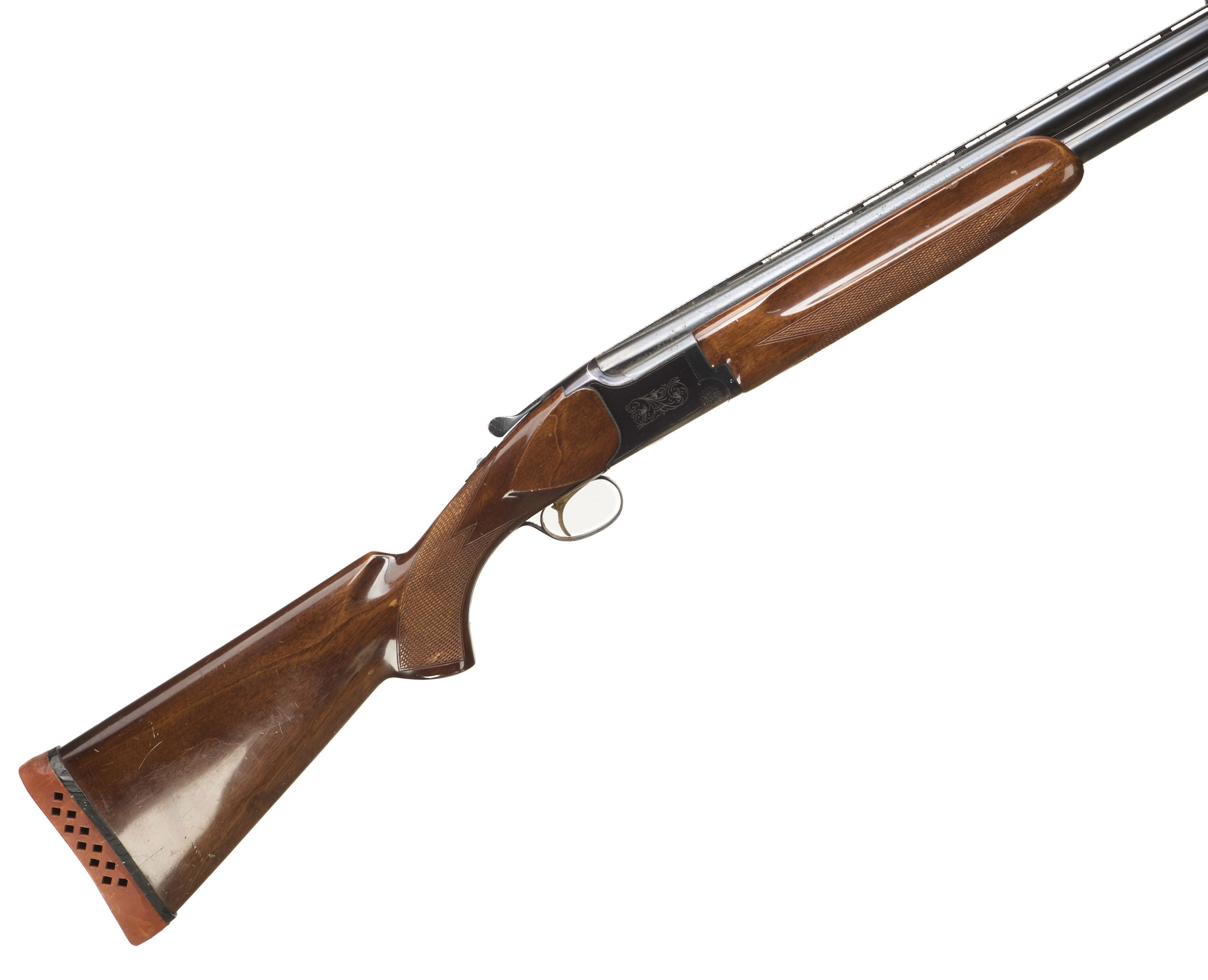 Cushioned butt pad, chequered semi-pistol grip and forend, ventilated top and mid rib. Acanthus scrolls to action. Gold wash trigger, integrated barrel selector (selective single trigger) and safety.