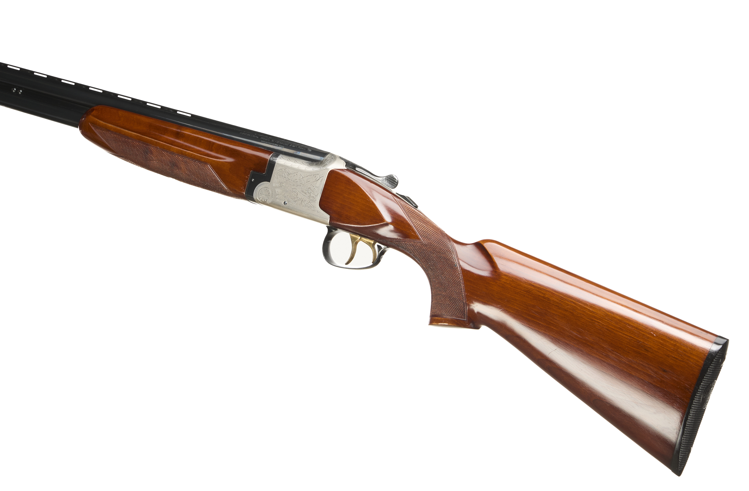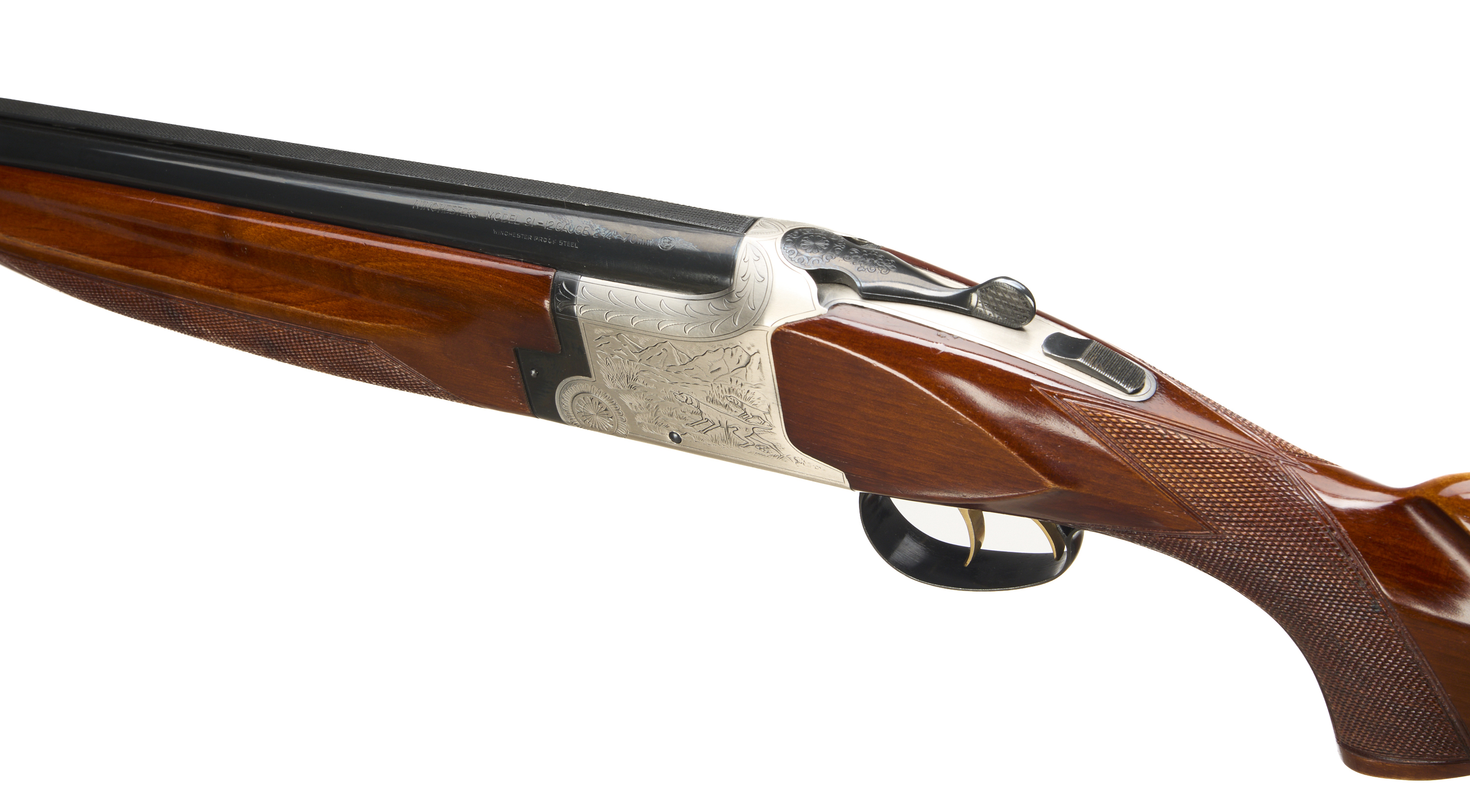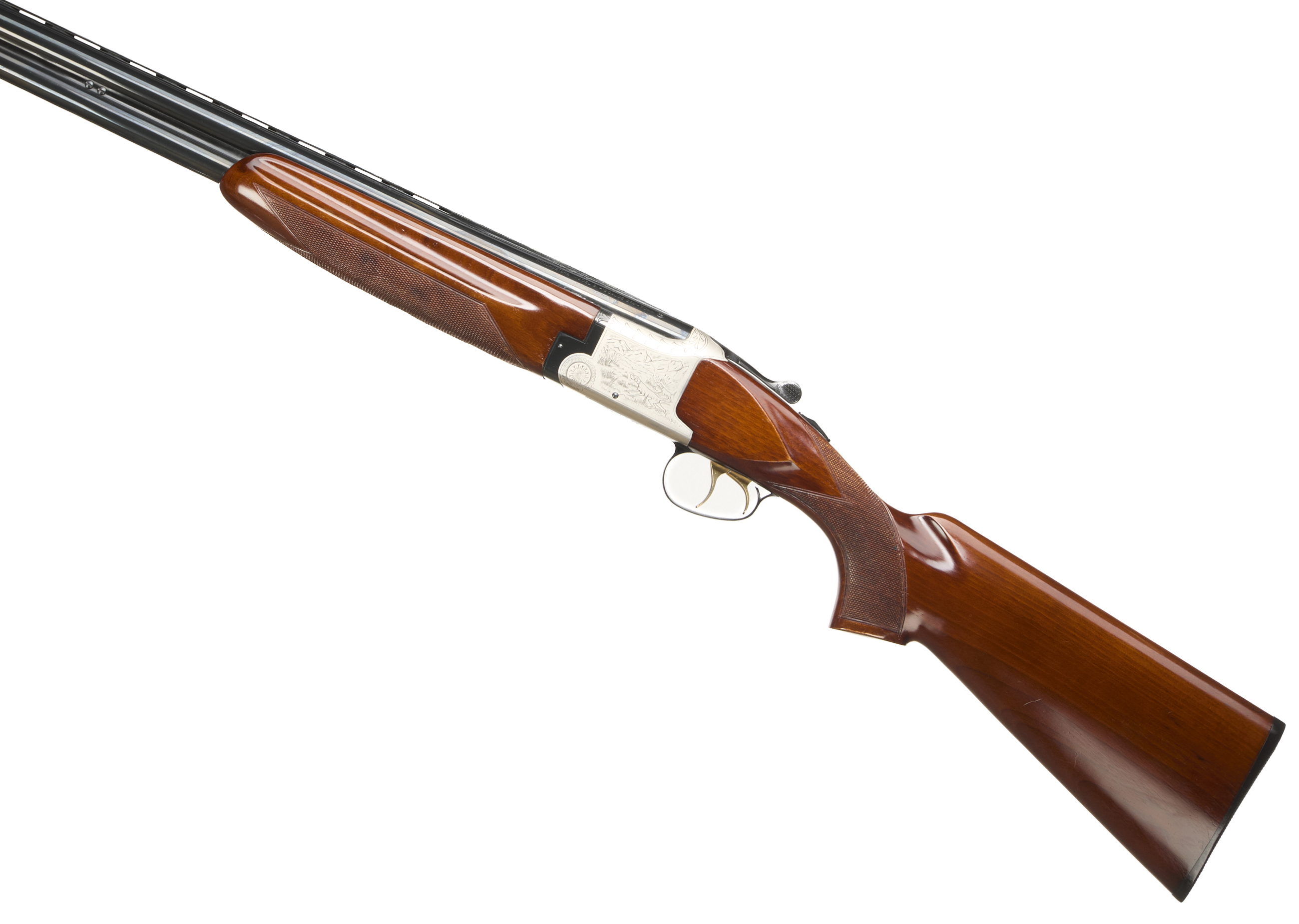 Ebonite butt pad, pistol grip and forend, ventilated top rib. Simple hunting scenes to action. Gold wash triggers, safety.