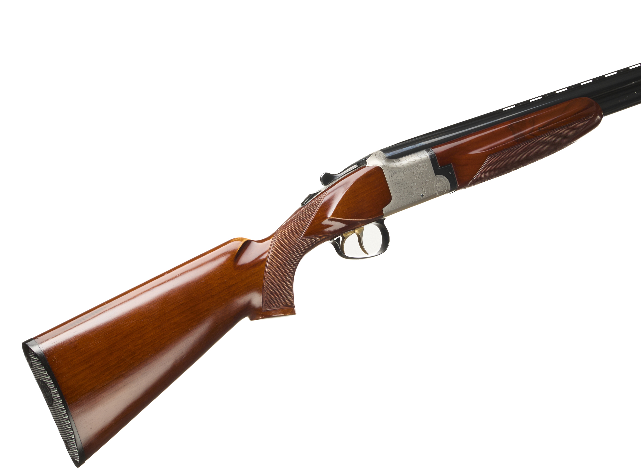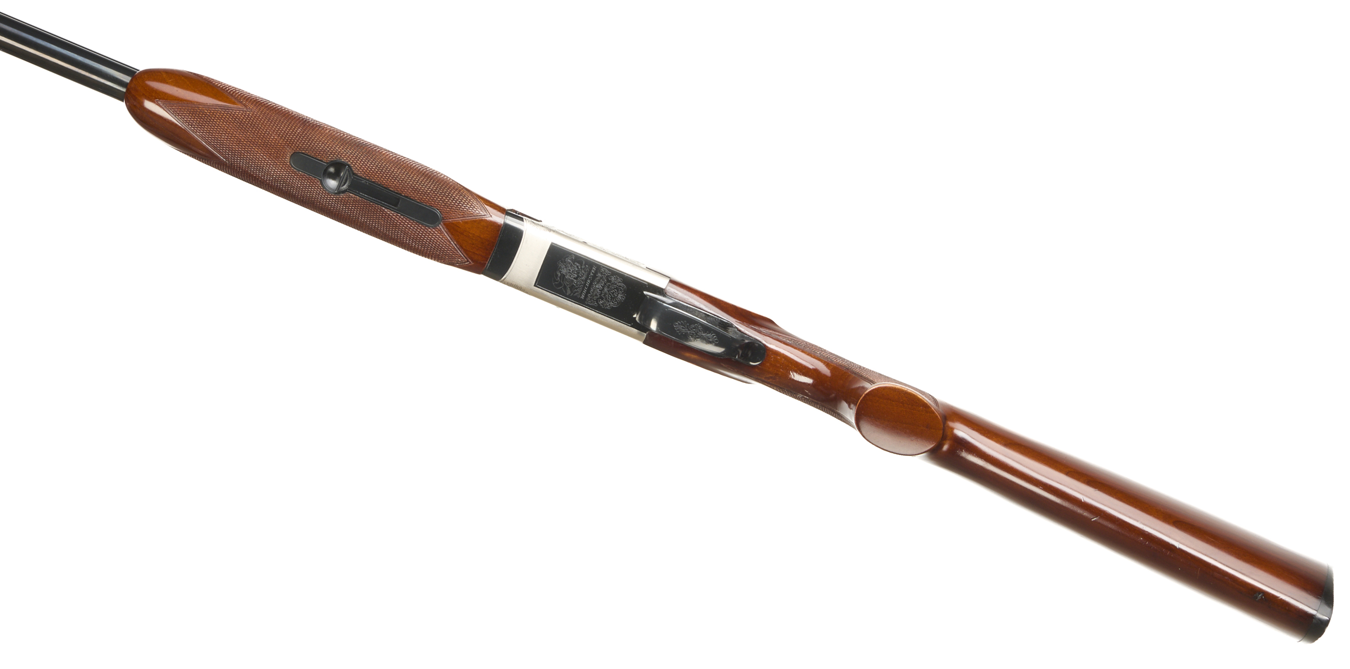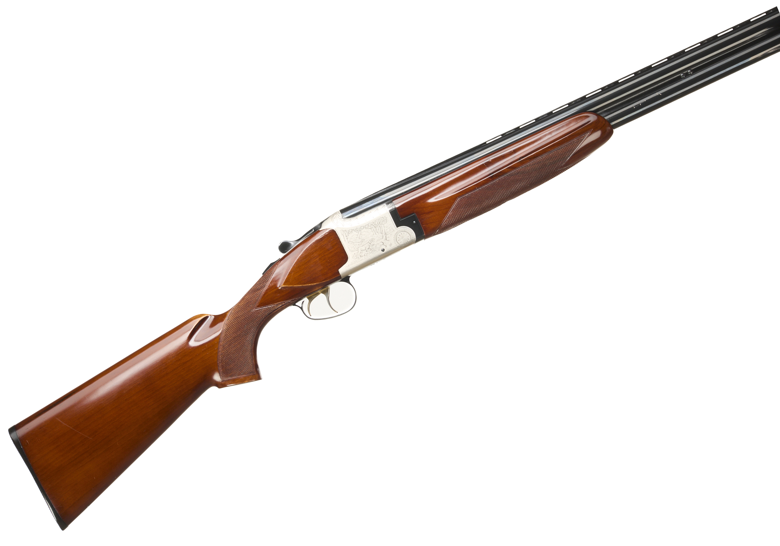 Ebonite butt pad, pistol grip and forend, ventilated top rib. Simple hunting scenes to action. Gold wash triggers, safety.