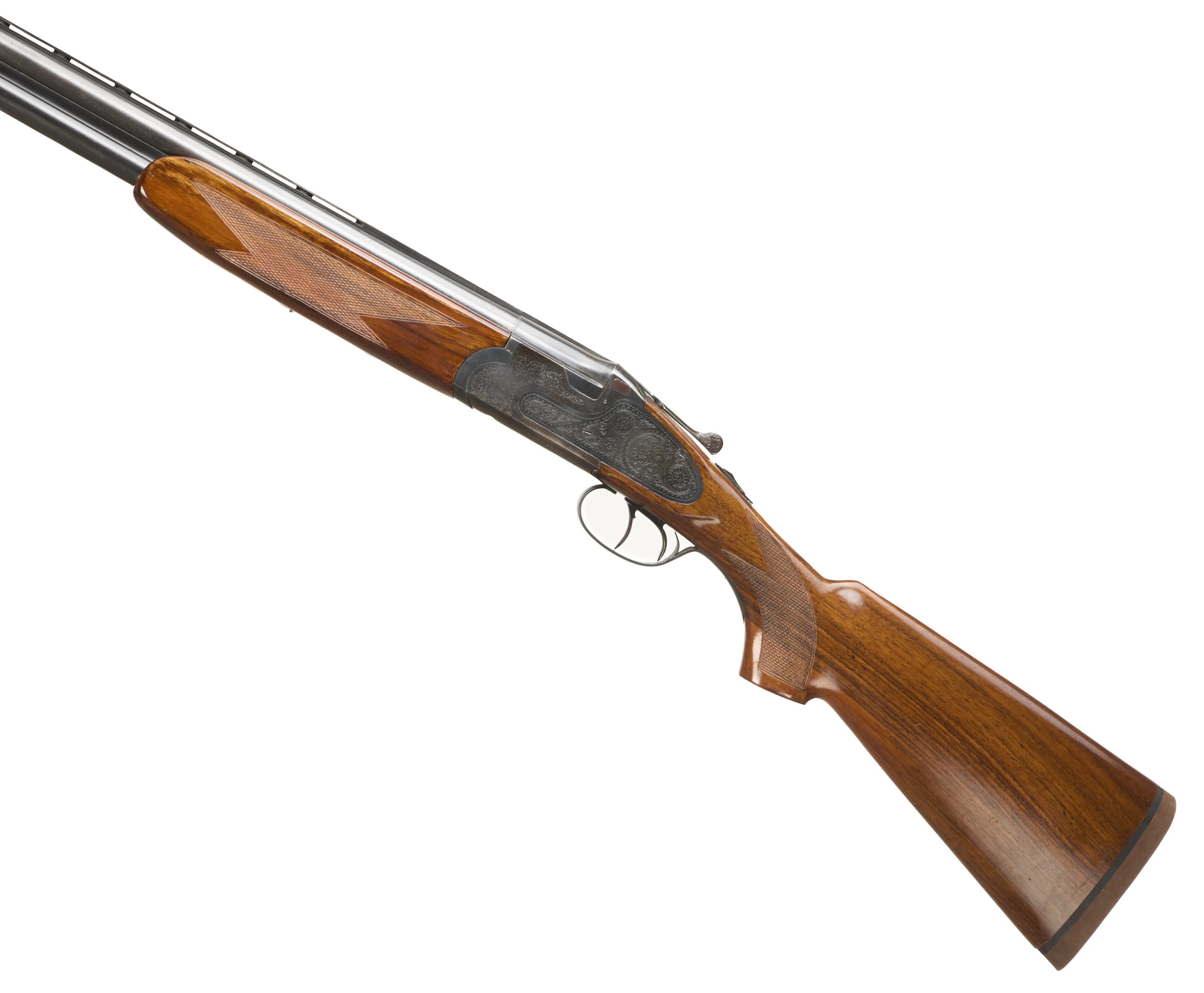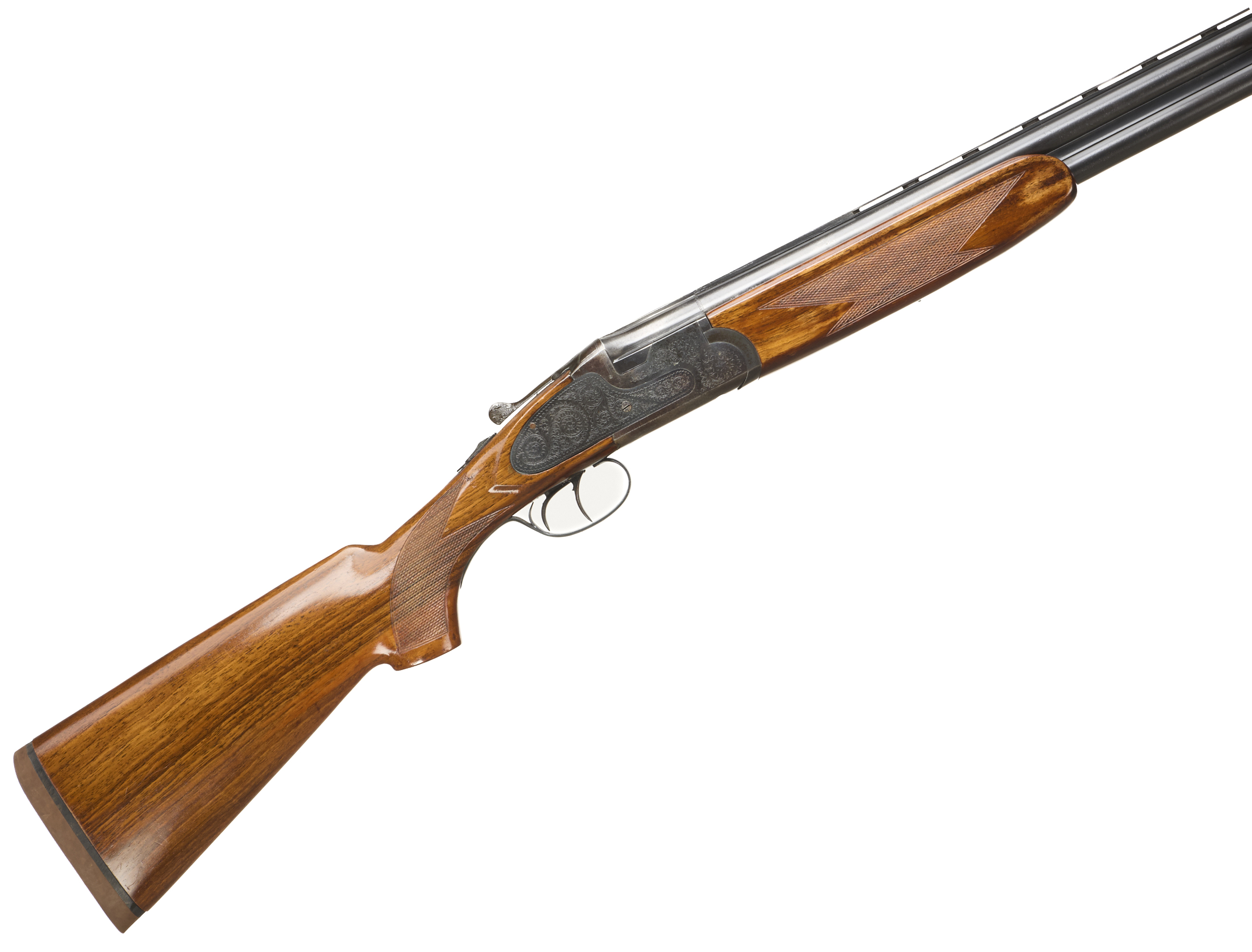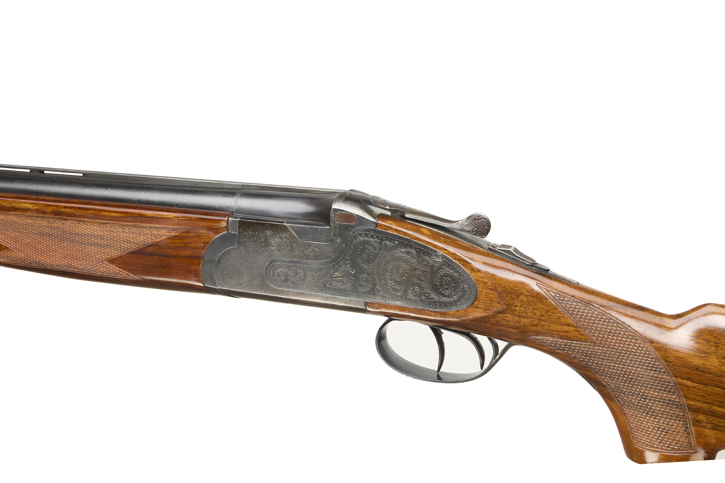 Cushioned butt pad, chequered semi-pistol grip and forend, ventilated top rib. Acanthus scrolls to action. Double trigger and safety.