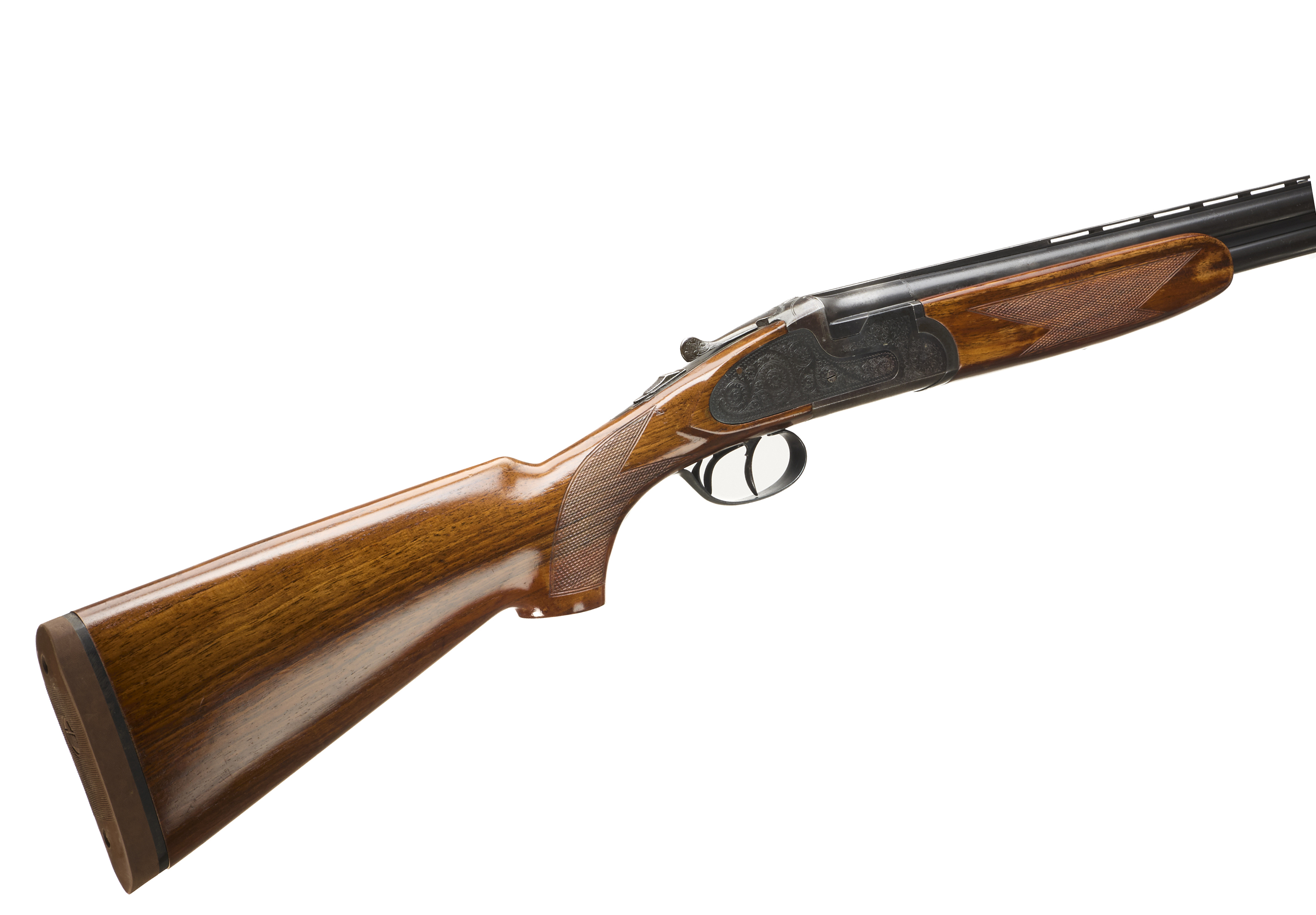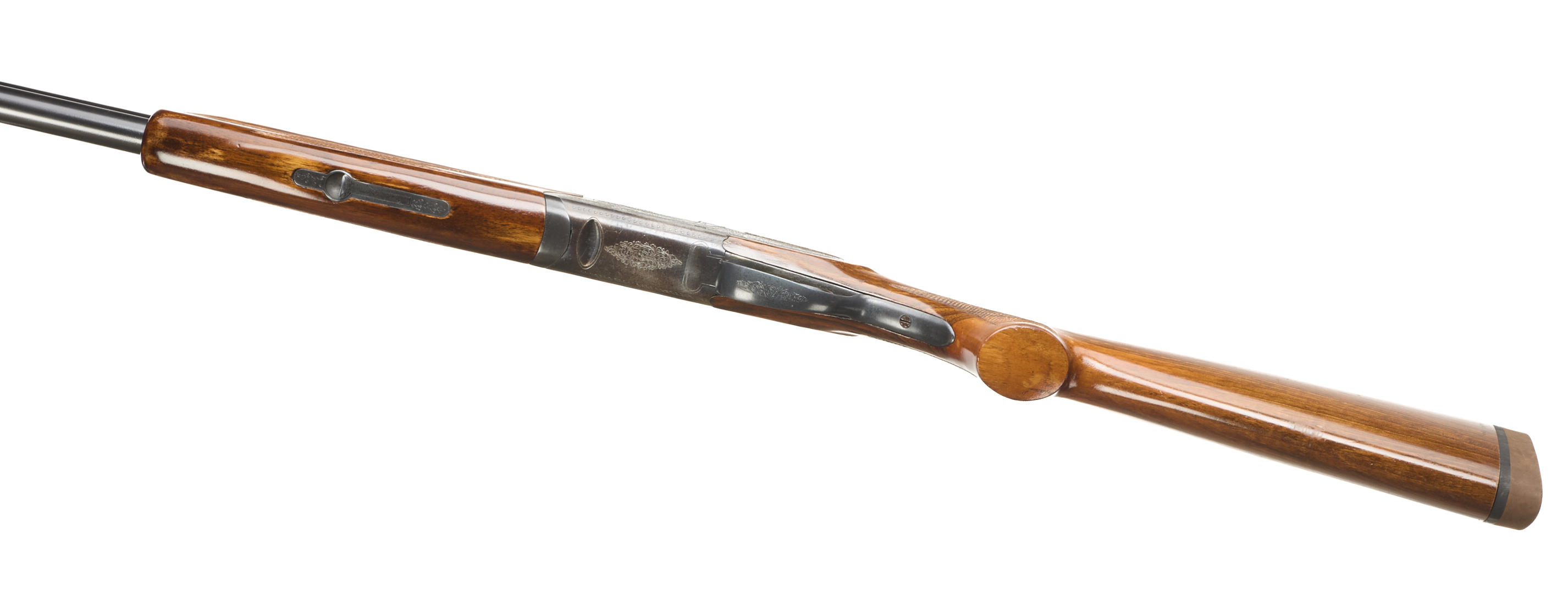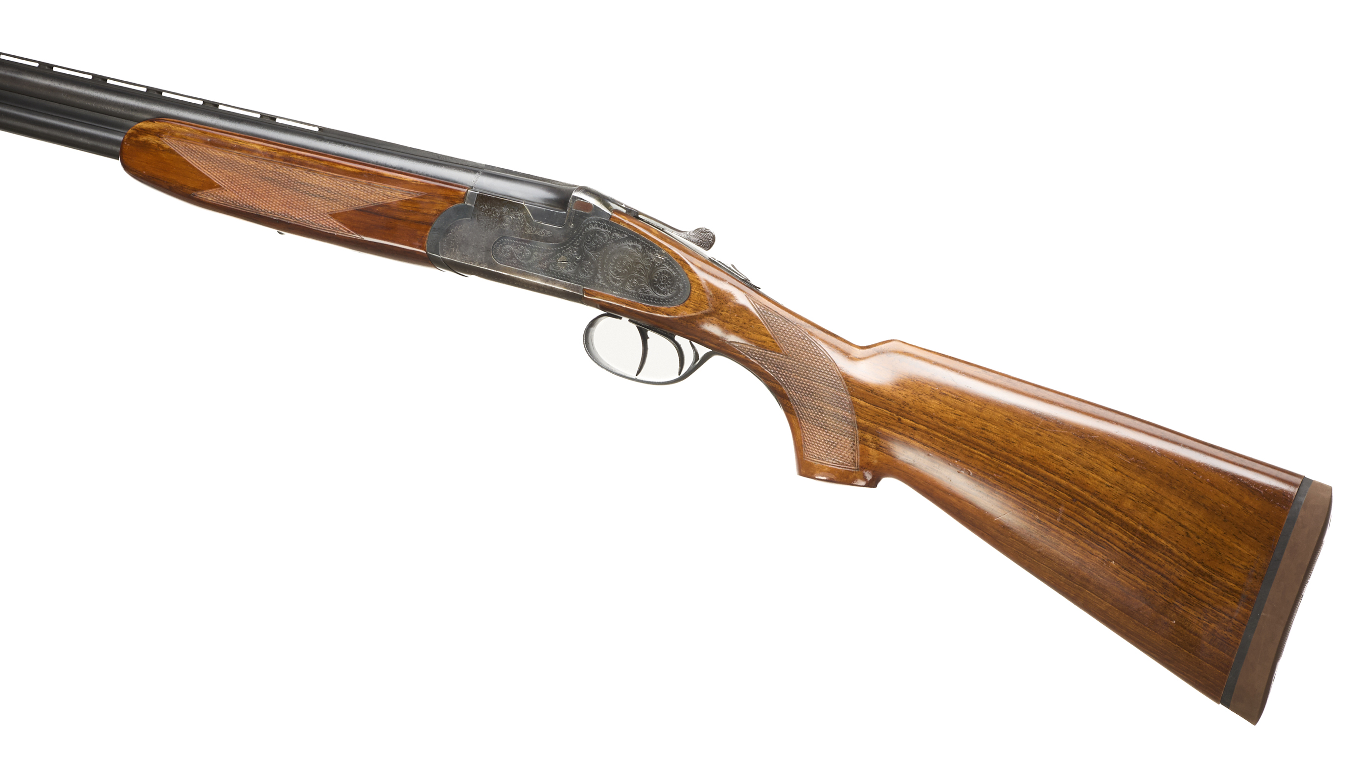 Cushioned butt pad, chequered semi-pistol grip and forend, ventilated top rib. Acanthus scrolls to action. Double trigger and safety.