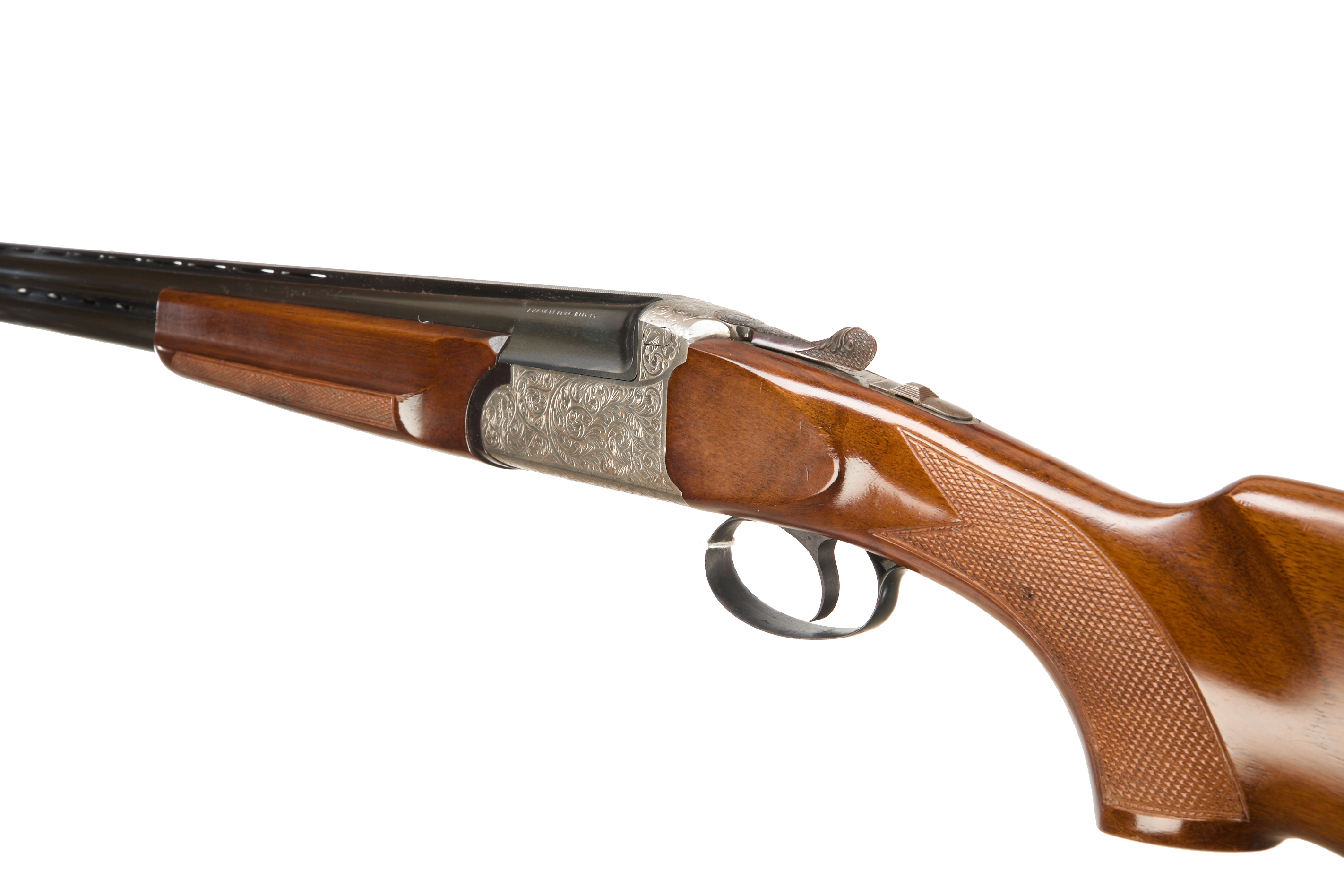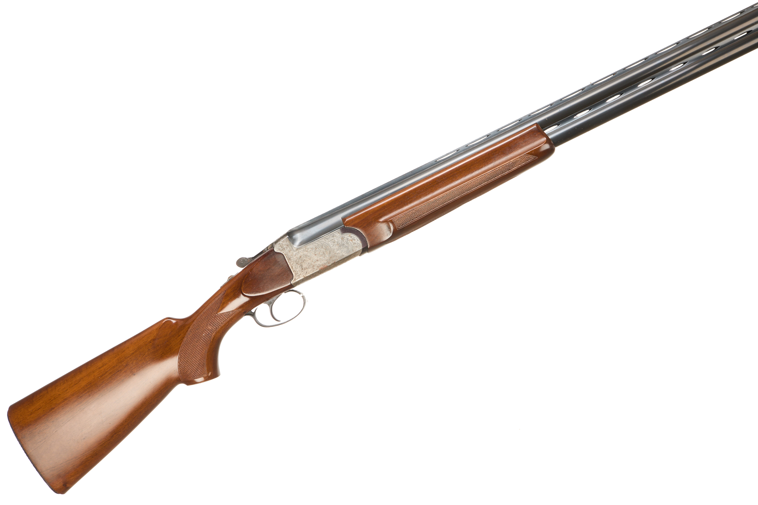 Hard plastic butt pad, chequered full-pistol grip and easy grip forend, ventilated top and mid rib. Acanthus scrolls to action and carved acanthus action release. Integrated barrel selector (selective single trigger) and safety. Spare barrel.