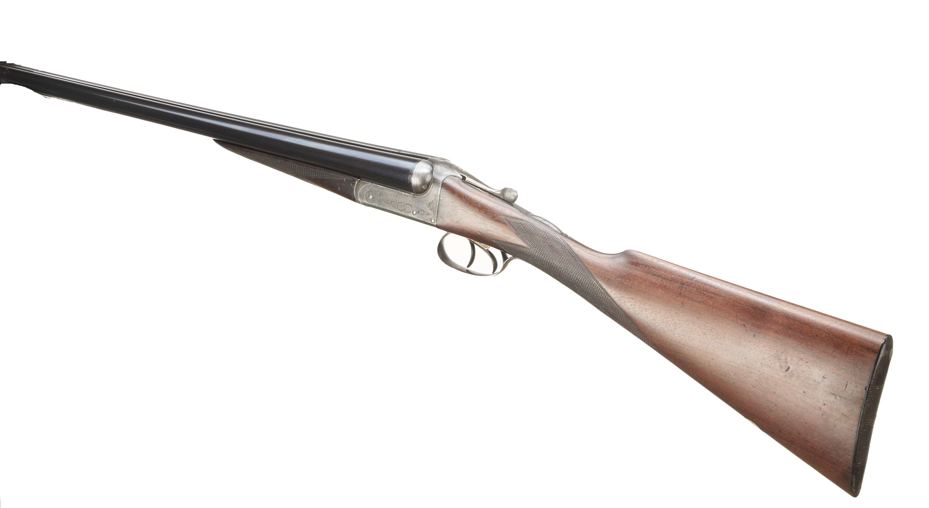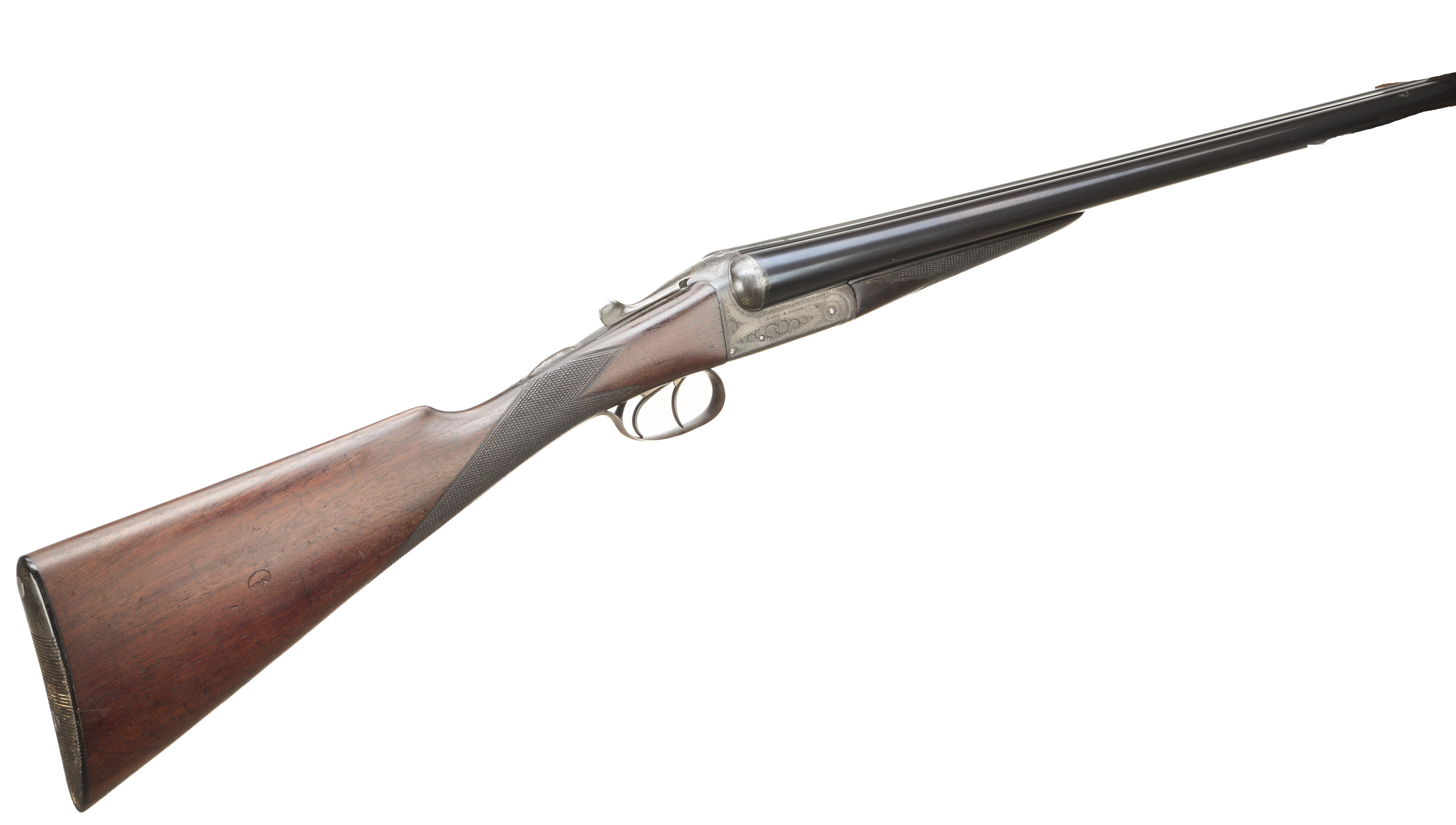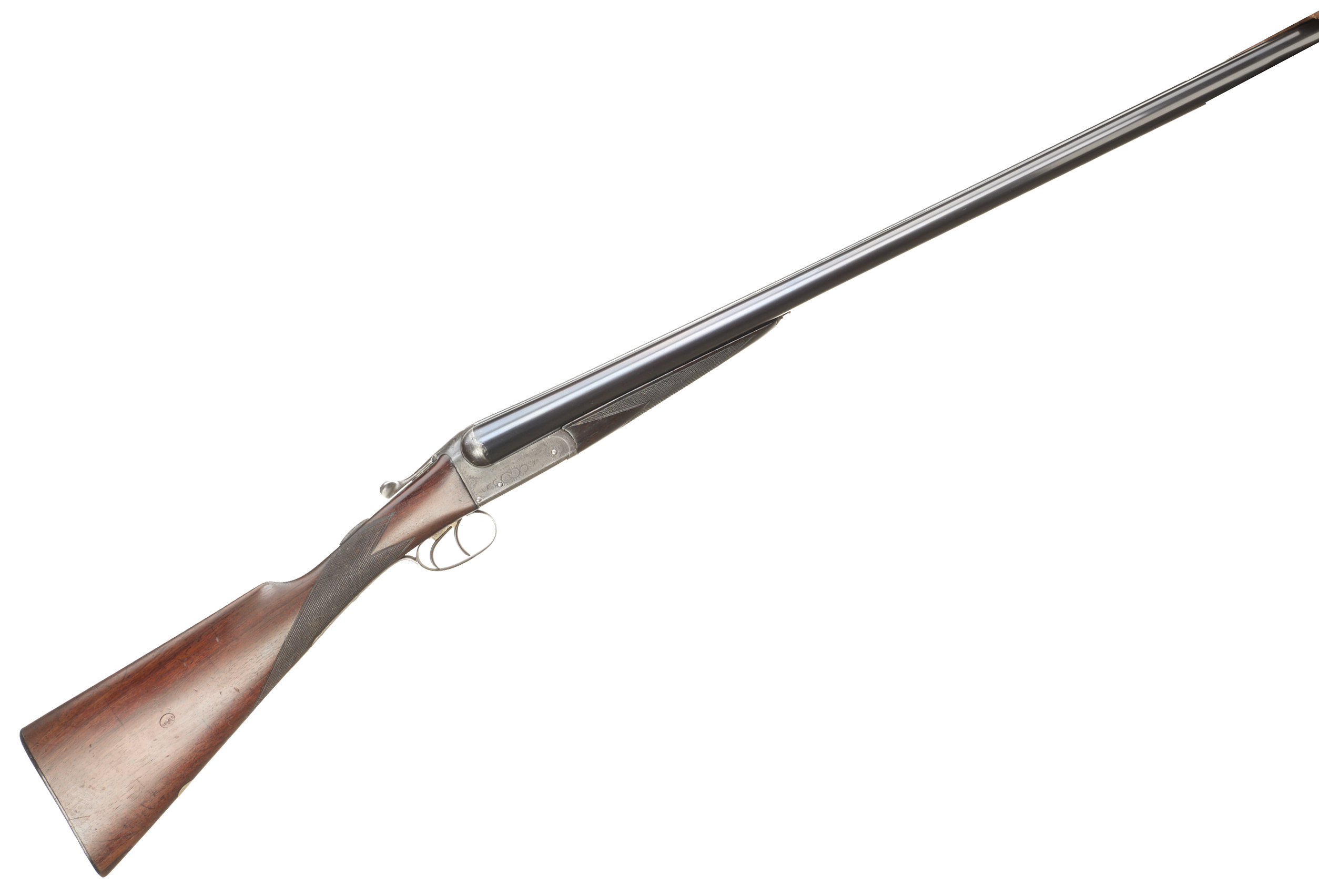 Horn butt, chequered straight grip and forend, the stock stamped ‘CYPRUS’ with broadarrow. Tapered rib engraved ‘LAWN & ALDER LONDON’. Dolls head extension, top lever, automatic safety with ‘SAFE’ inlaid. The action engraved with acanthus scrolling. Reproofed 1997.