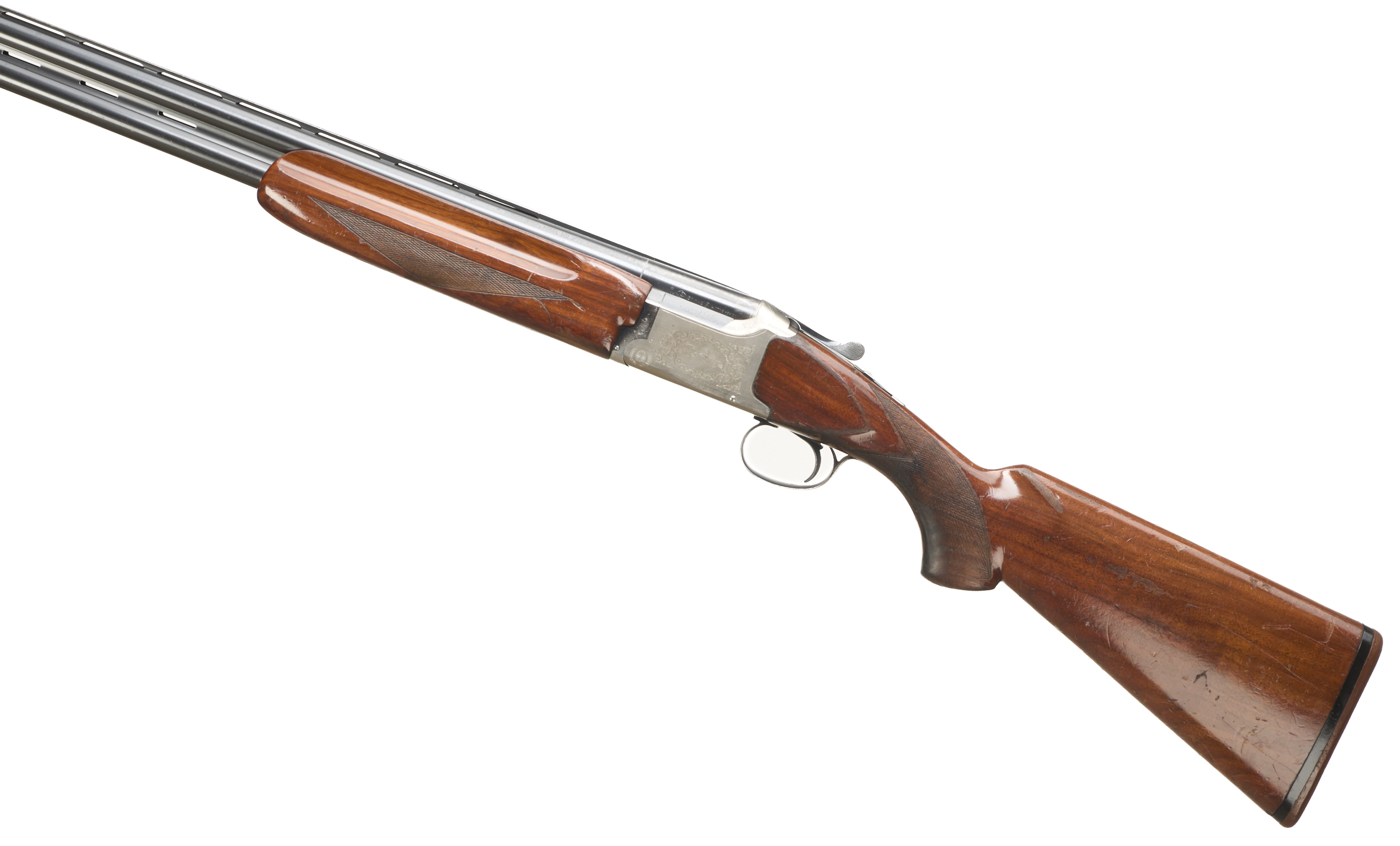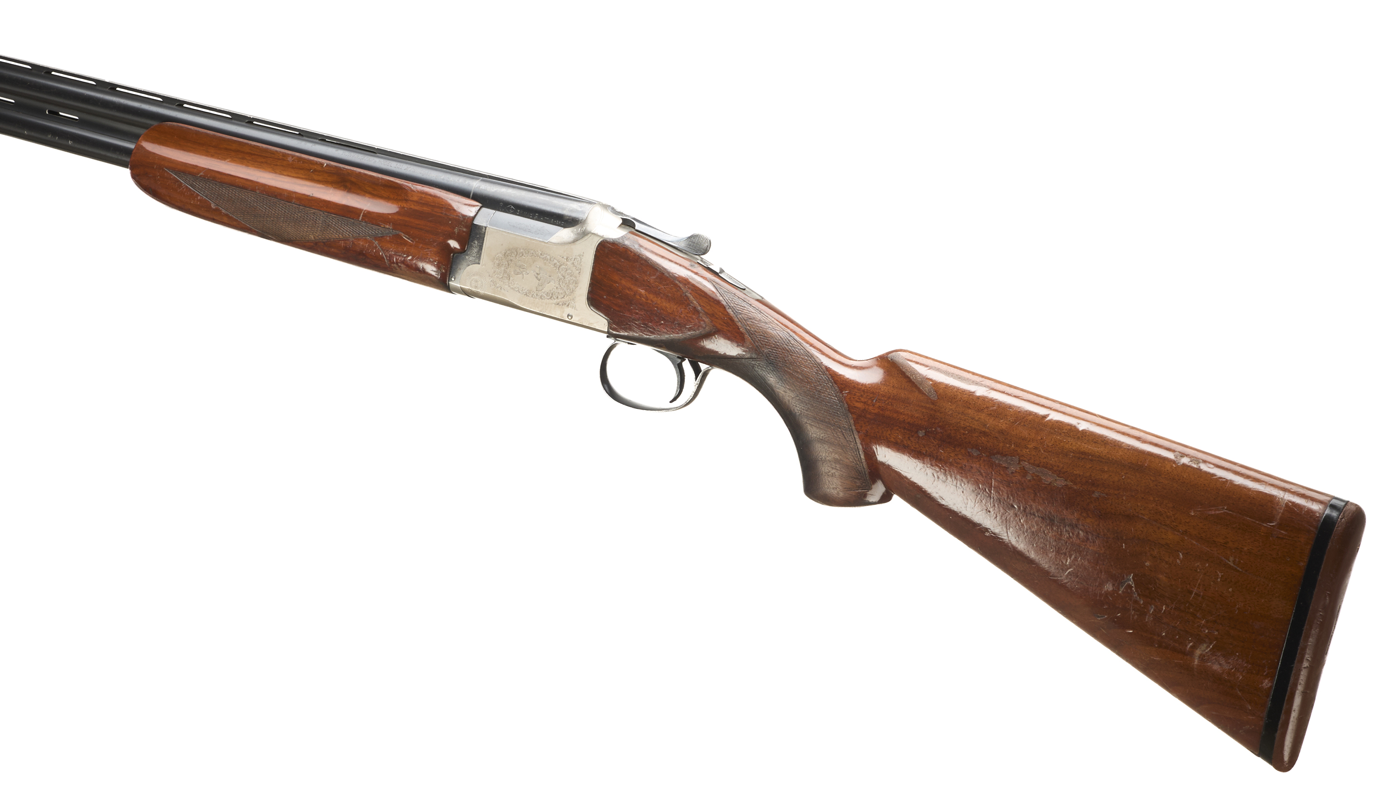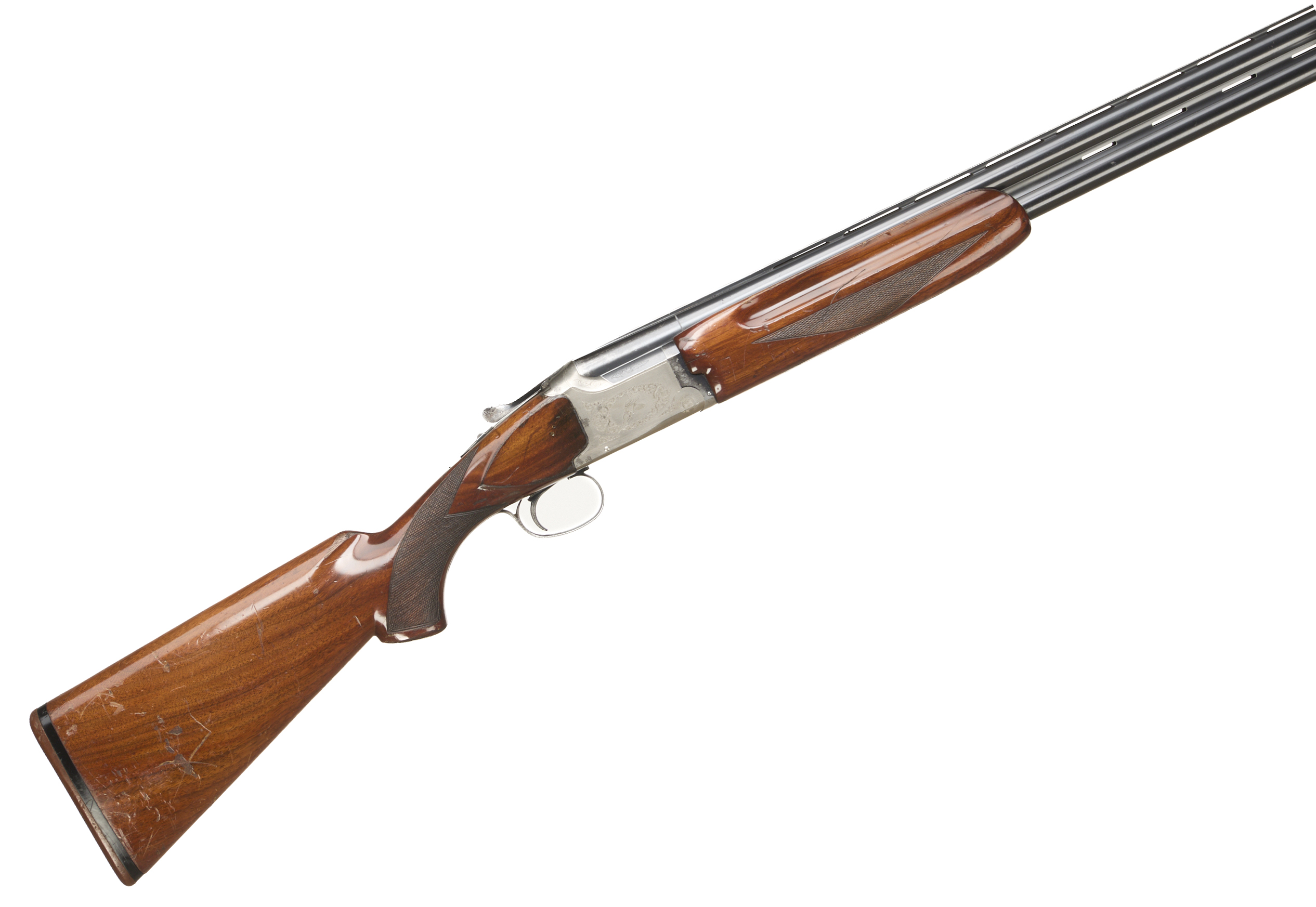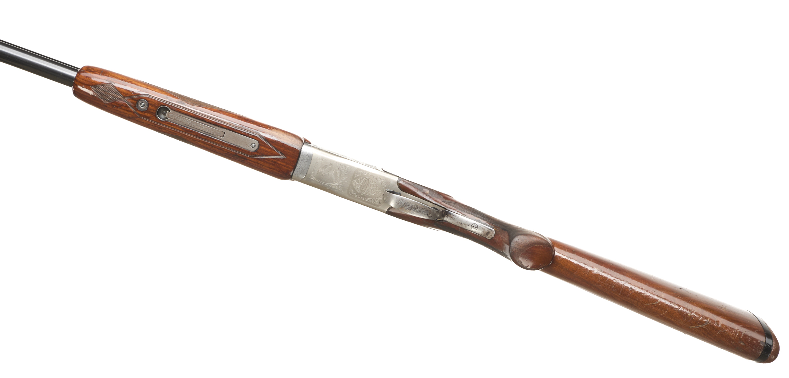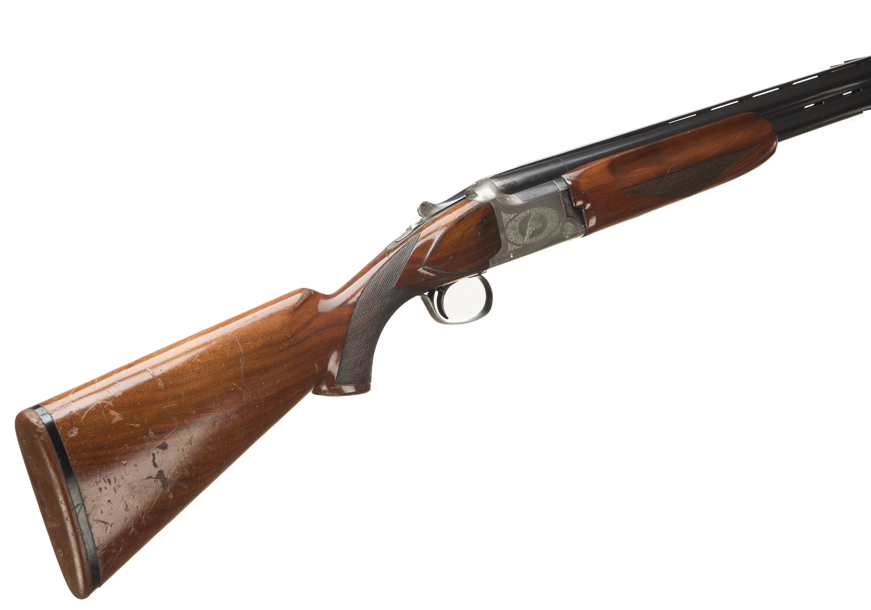 Brown rubber butt pad, chequered pistol grip and forend, ventilated top and mid rib. The action with game birds surrounded by acanthus scrolls. Integrated barrel selector (selective single trigger) and safety.
