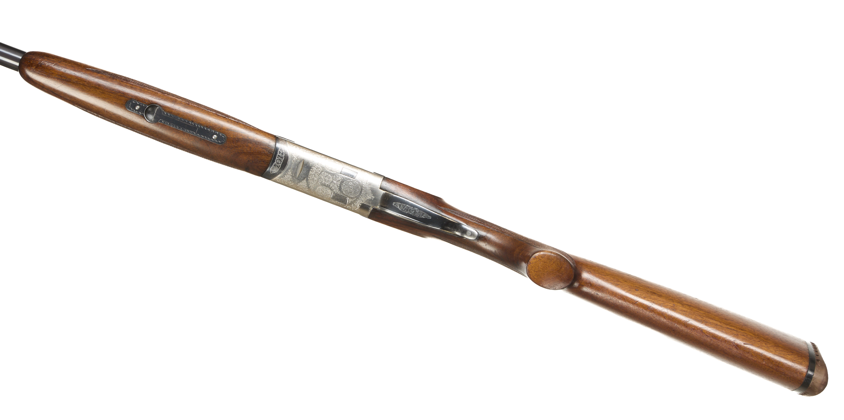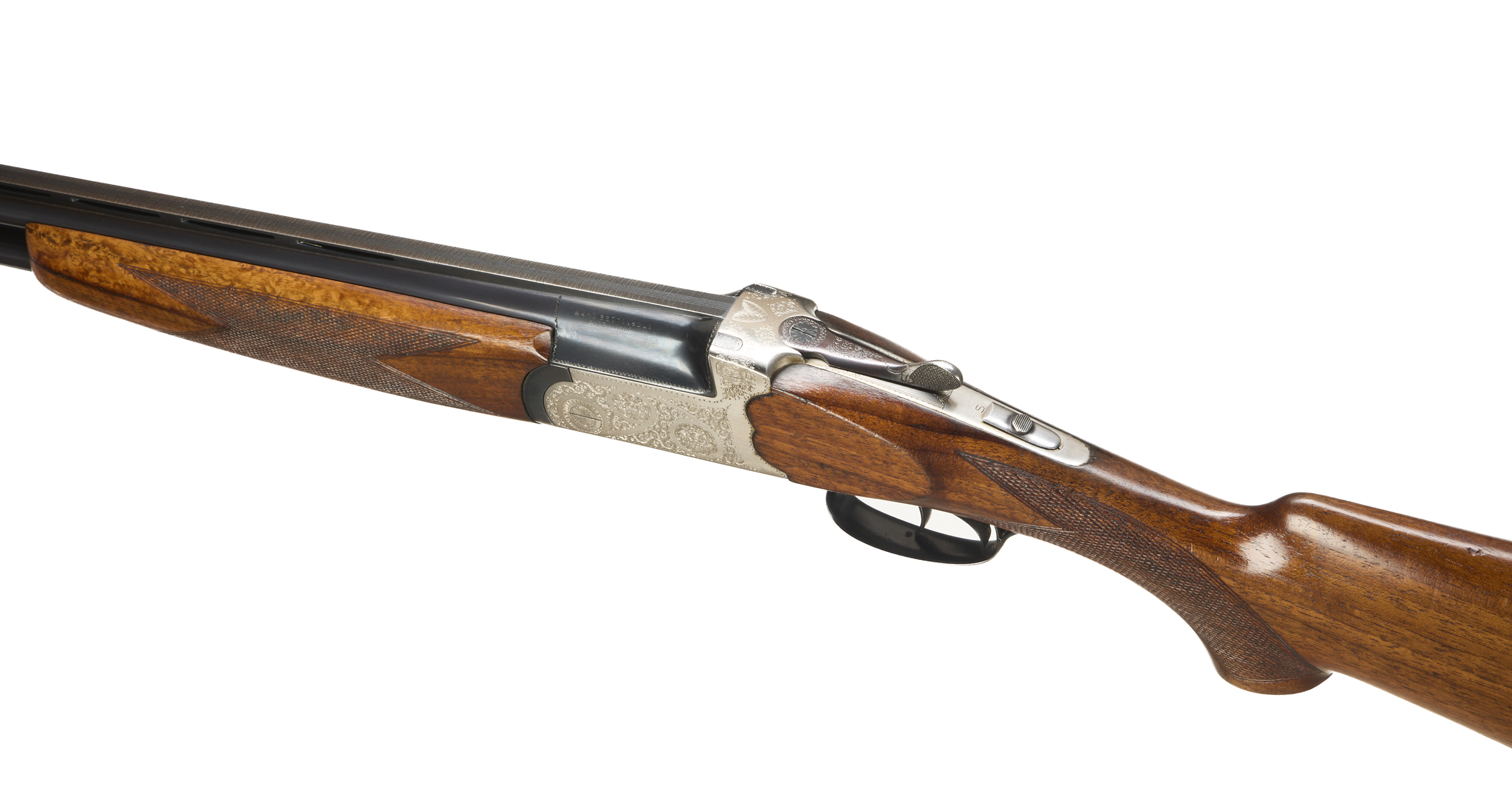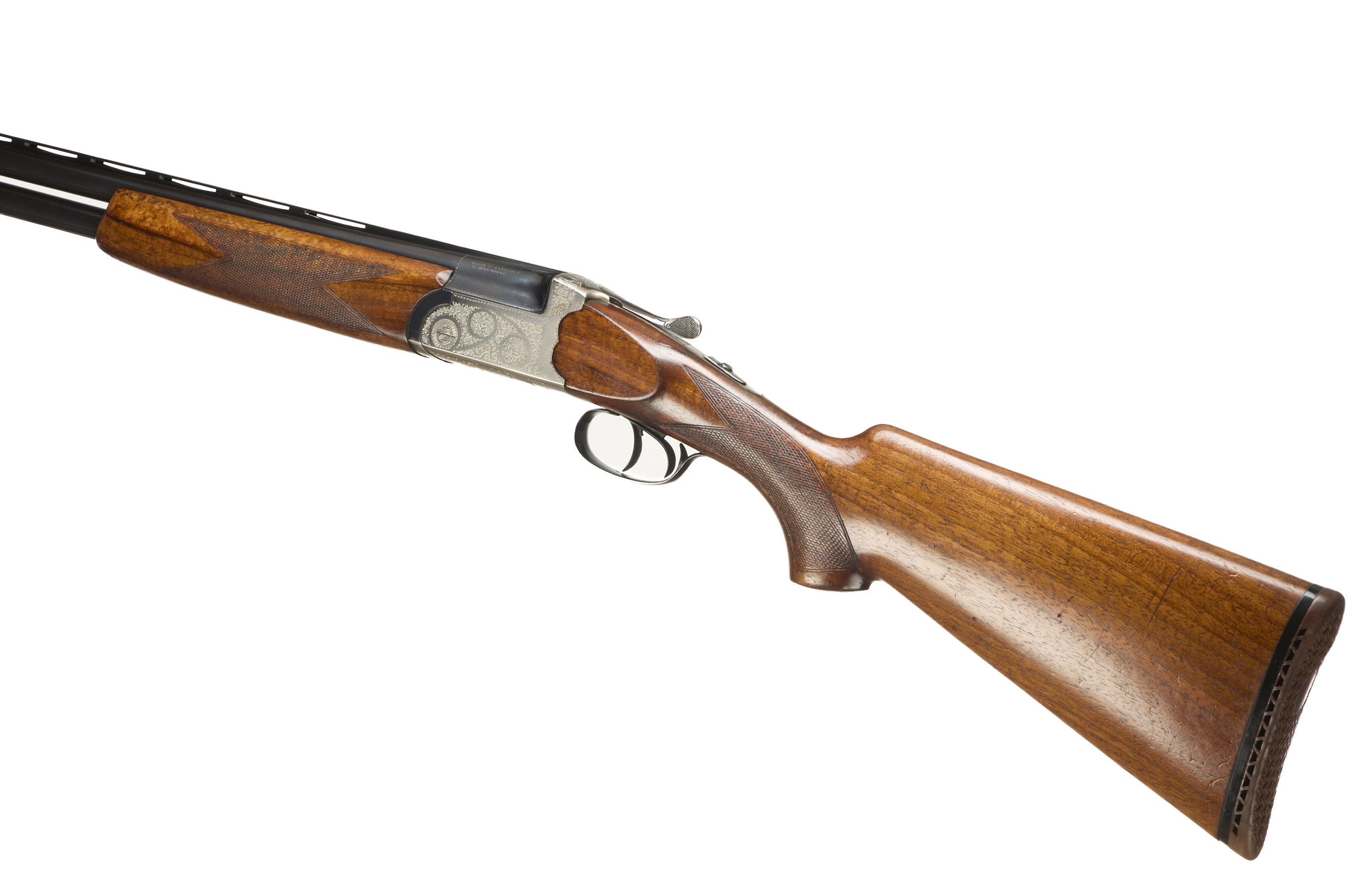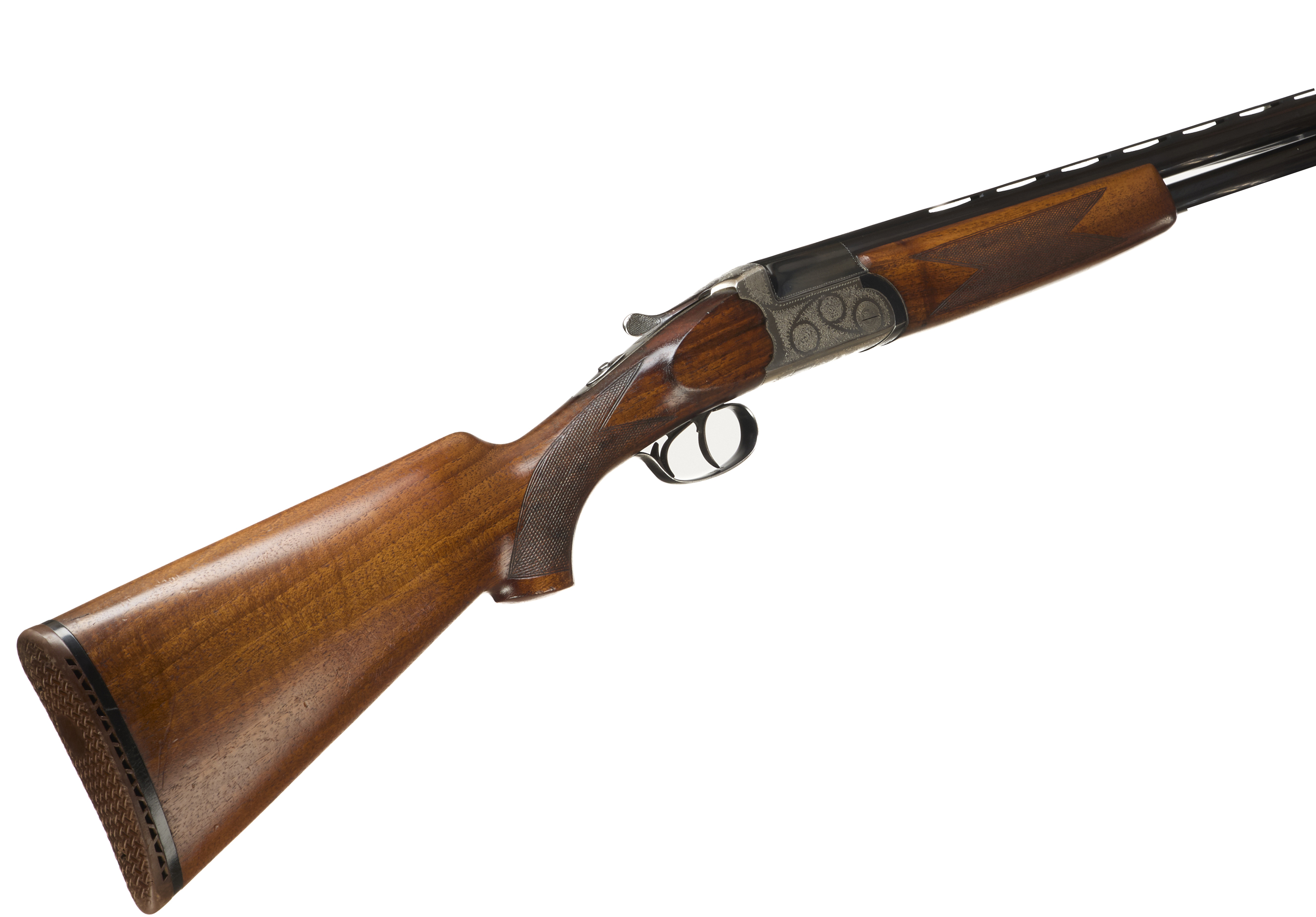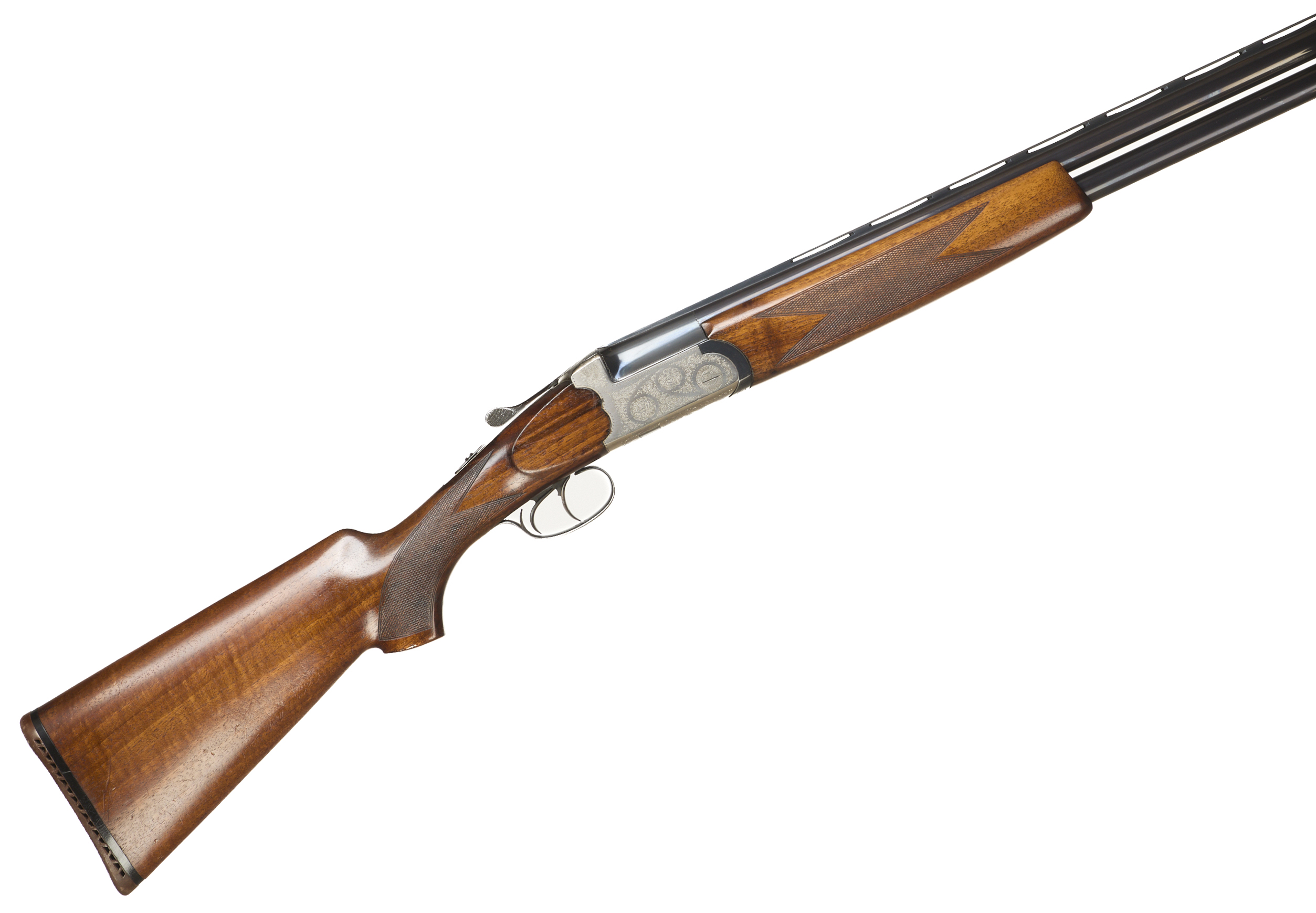 Ventilated butt pad, chequered semi-pistol grip and forend, ventilated top and mid rib. Acanthus scrolls to action. Double trigger and safety. Spare chokes.